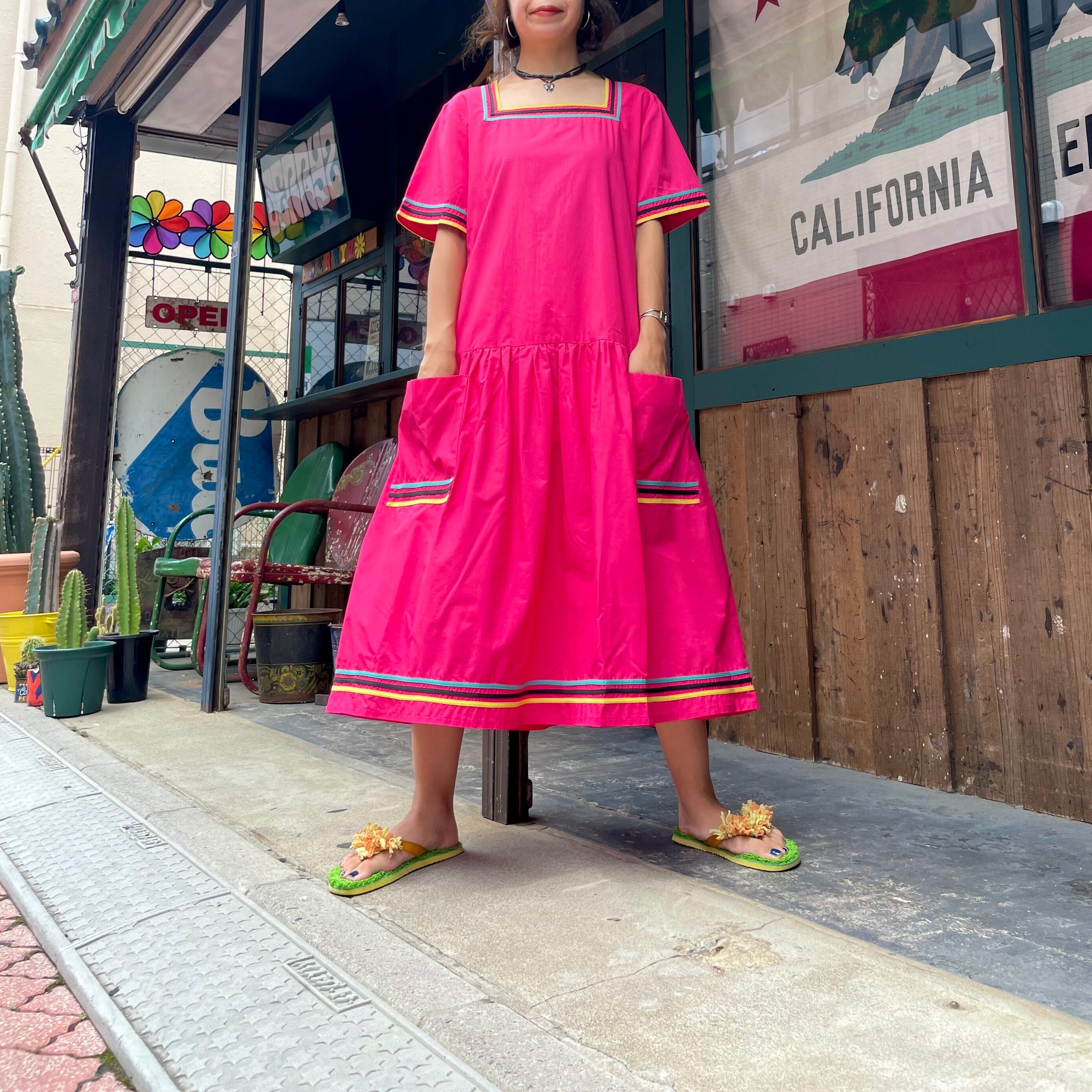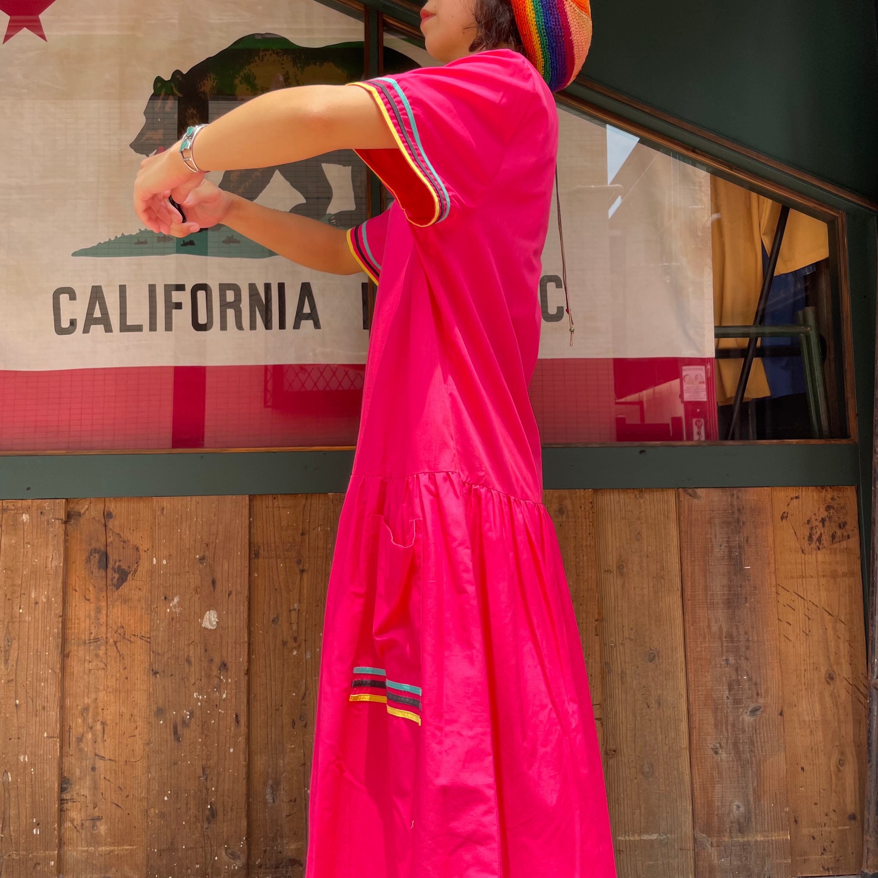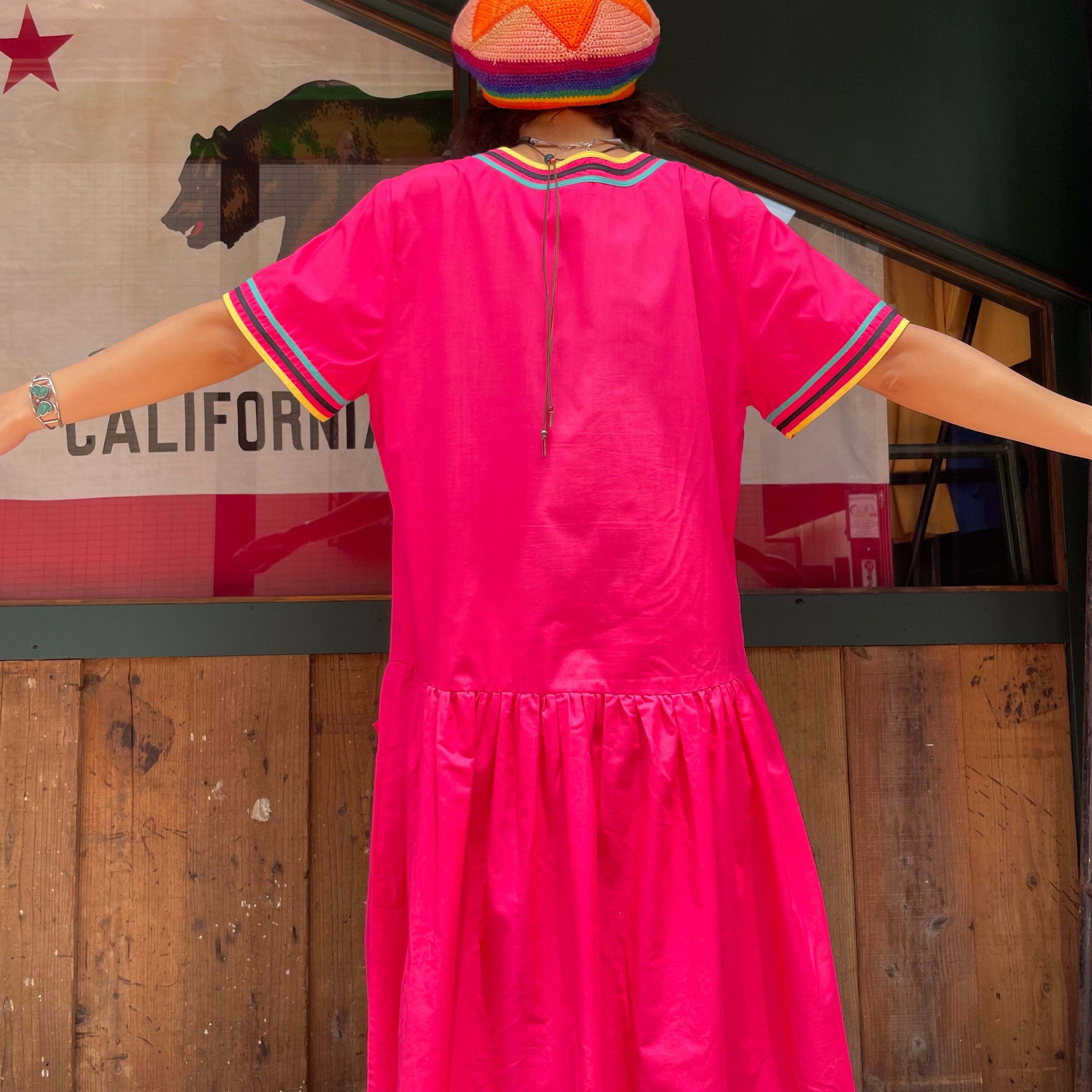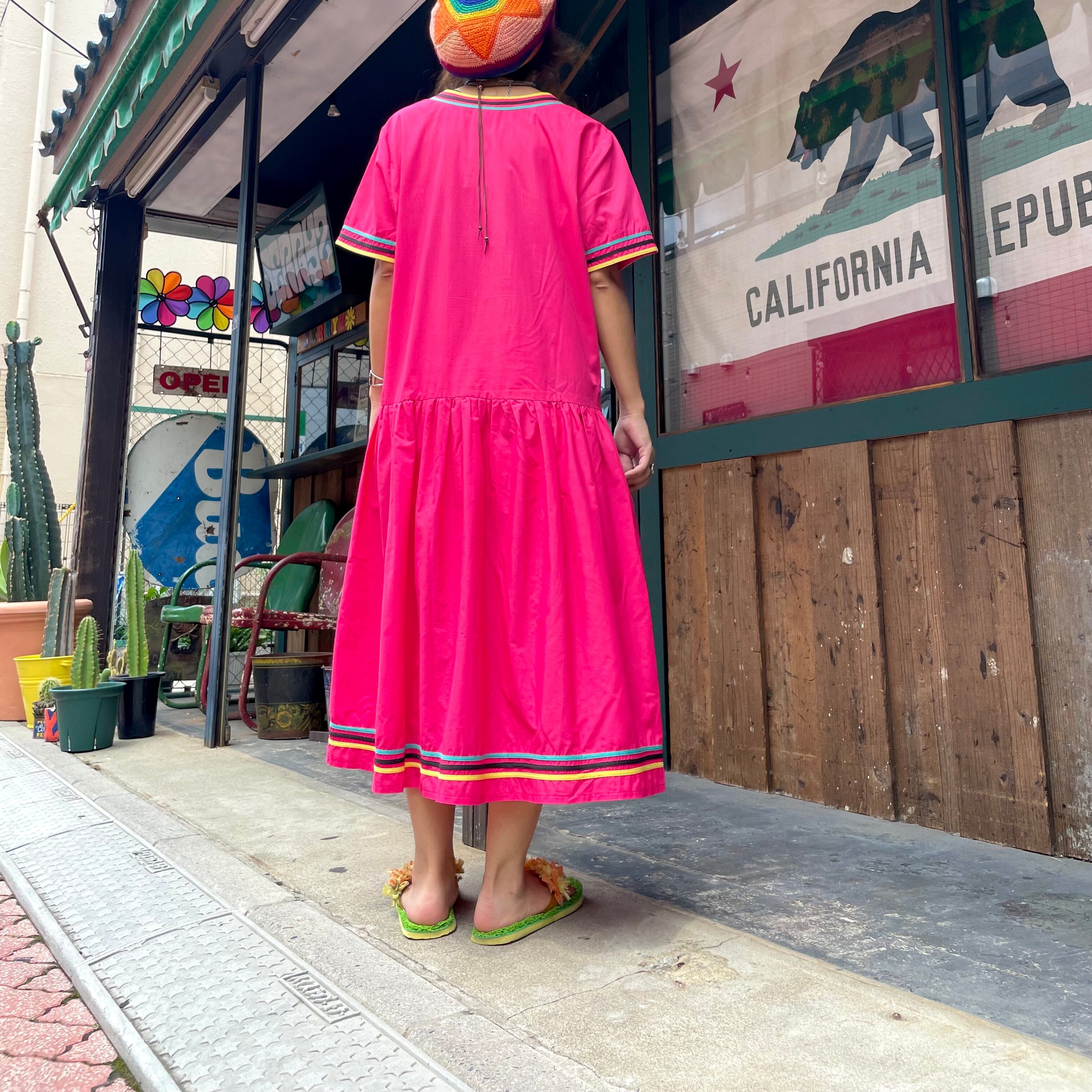 ピンク地に緑、黒、黄色のテープがかわいい無地のワンピースです。