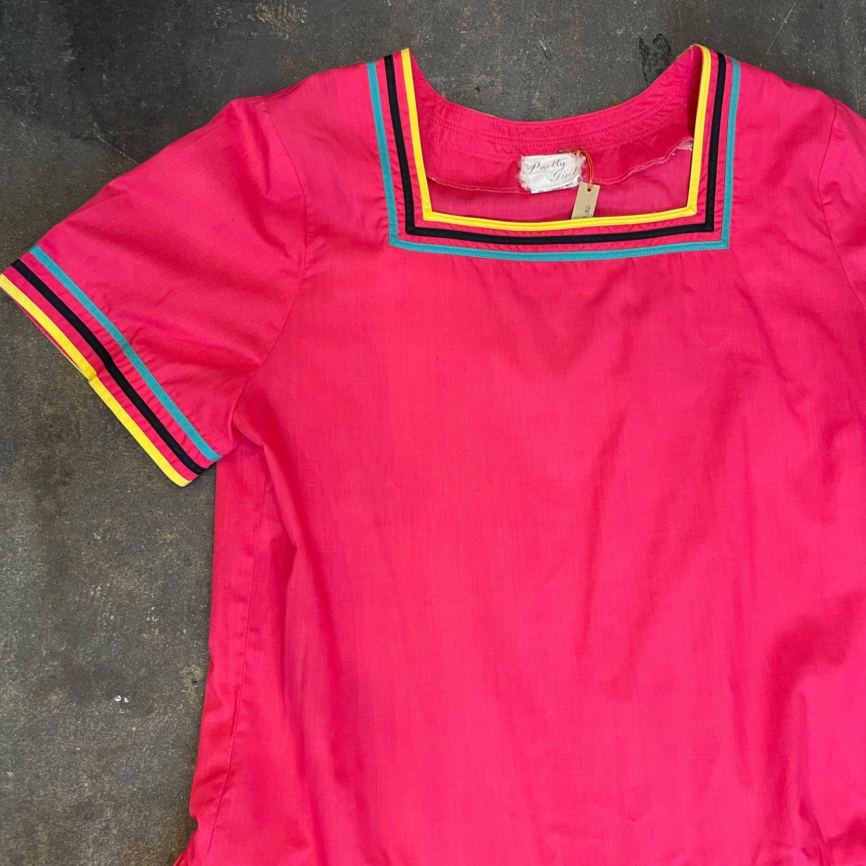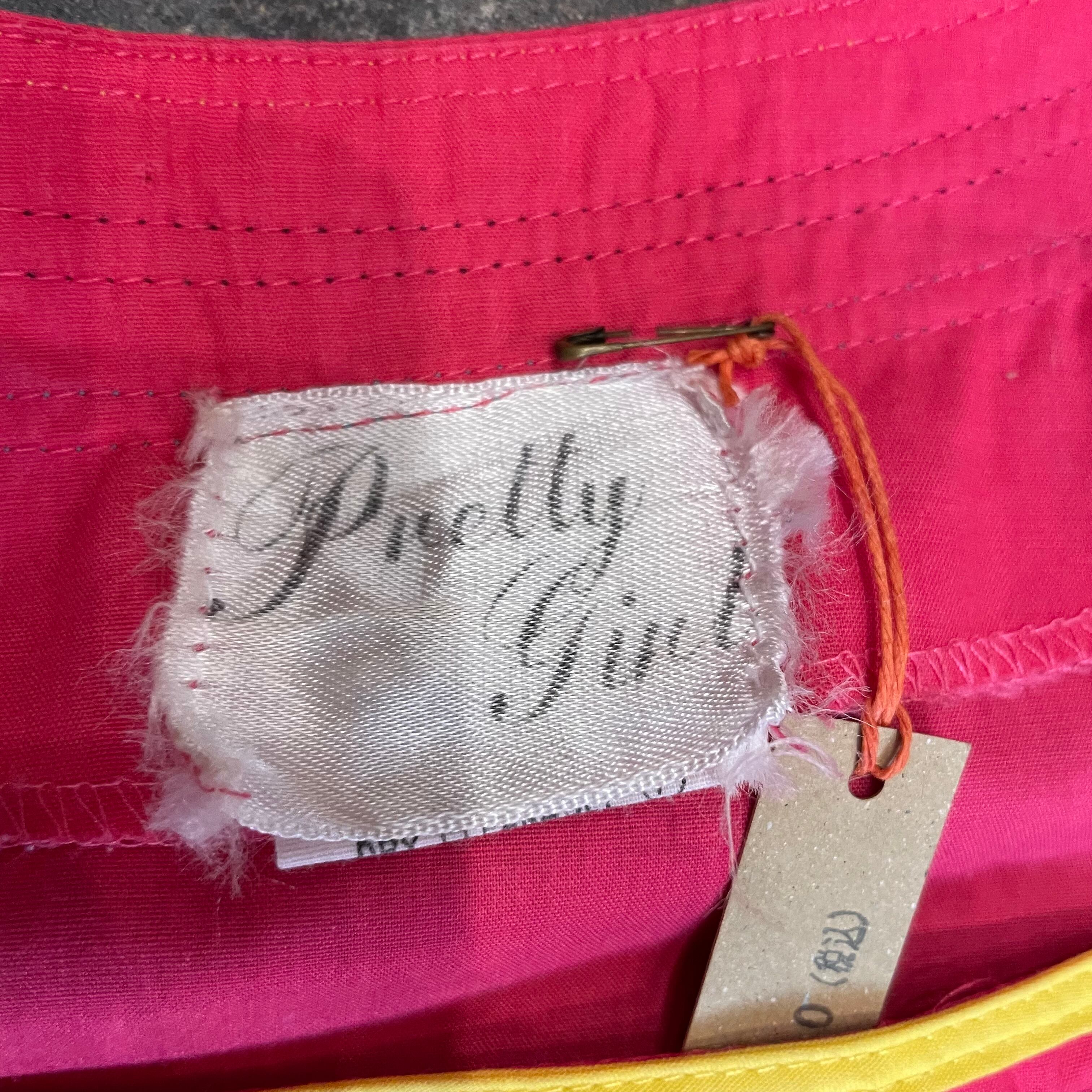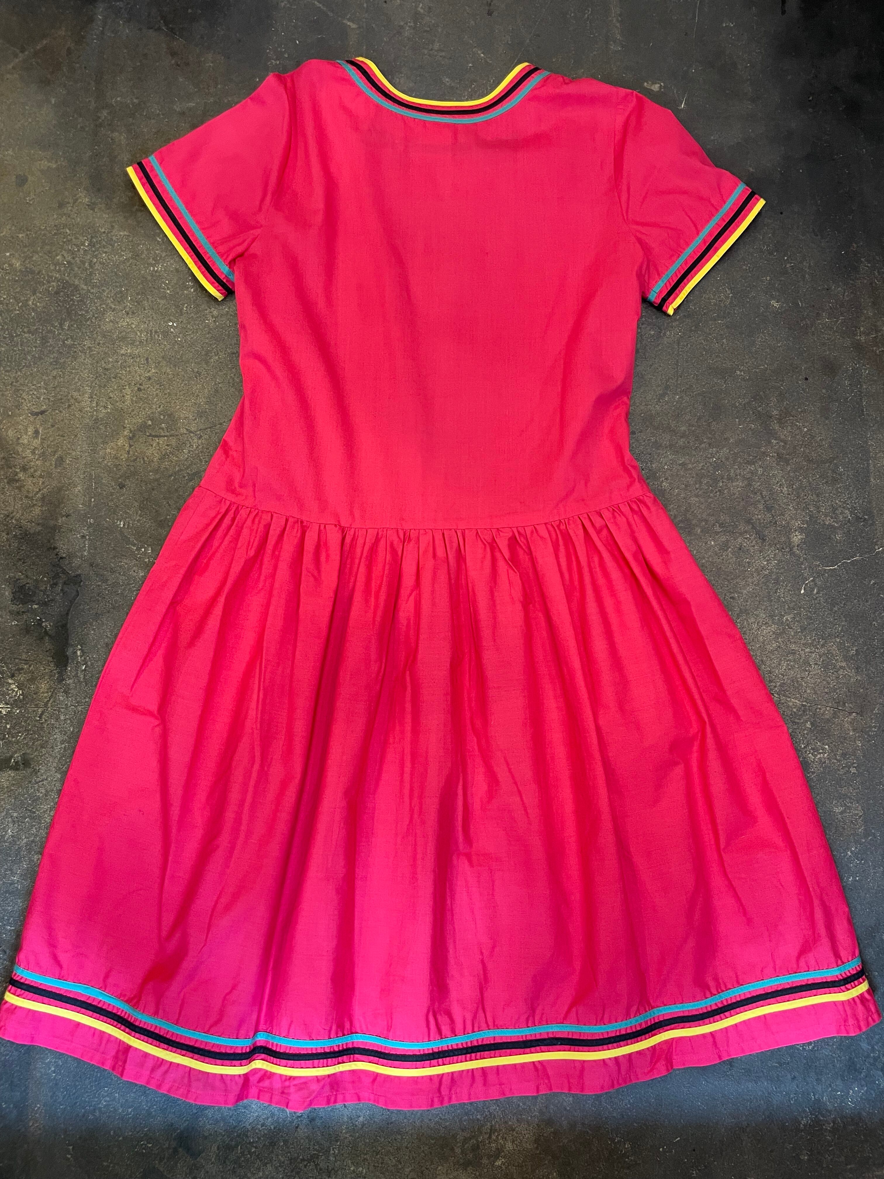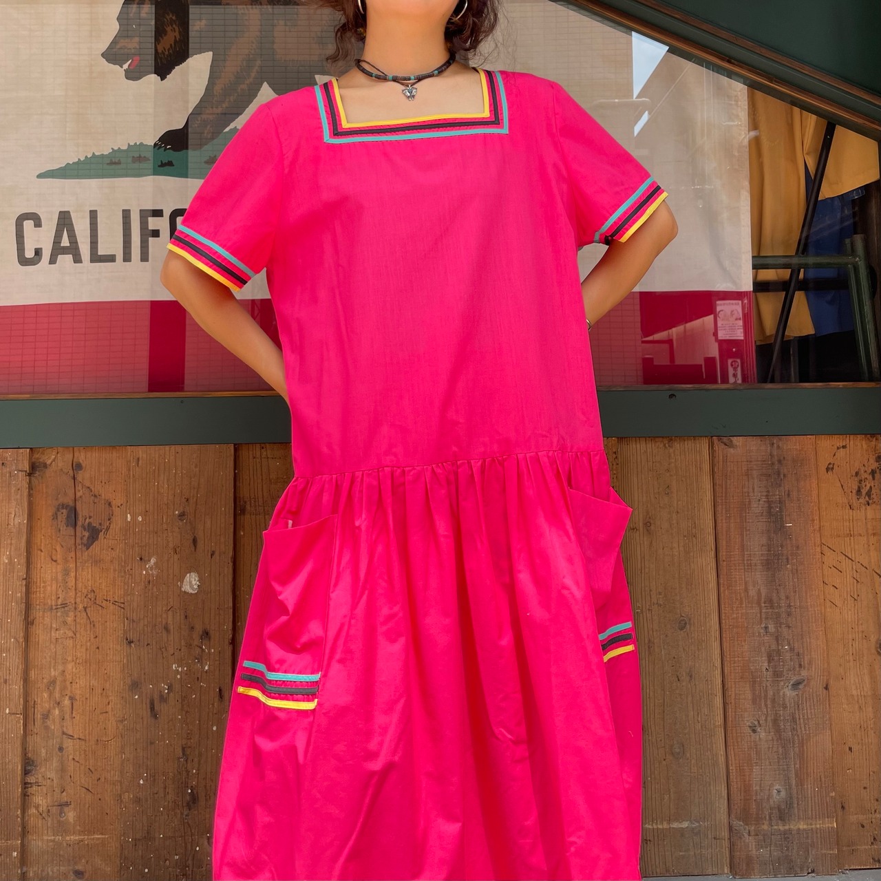 ピンク地に緑、黒、黄色のテープがかわいい無地のワンピースです。