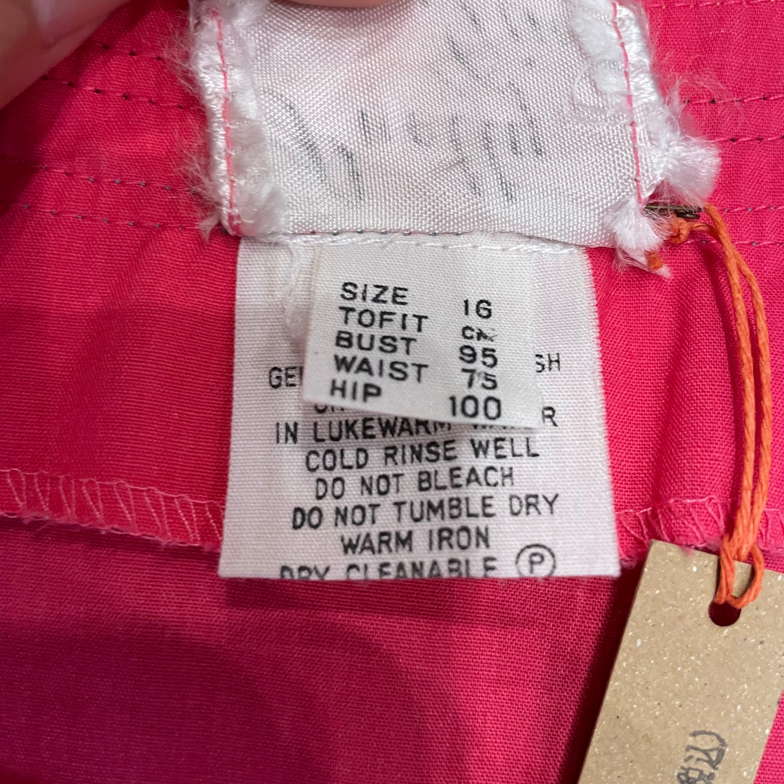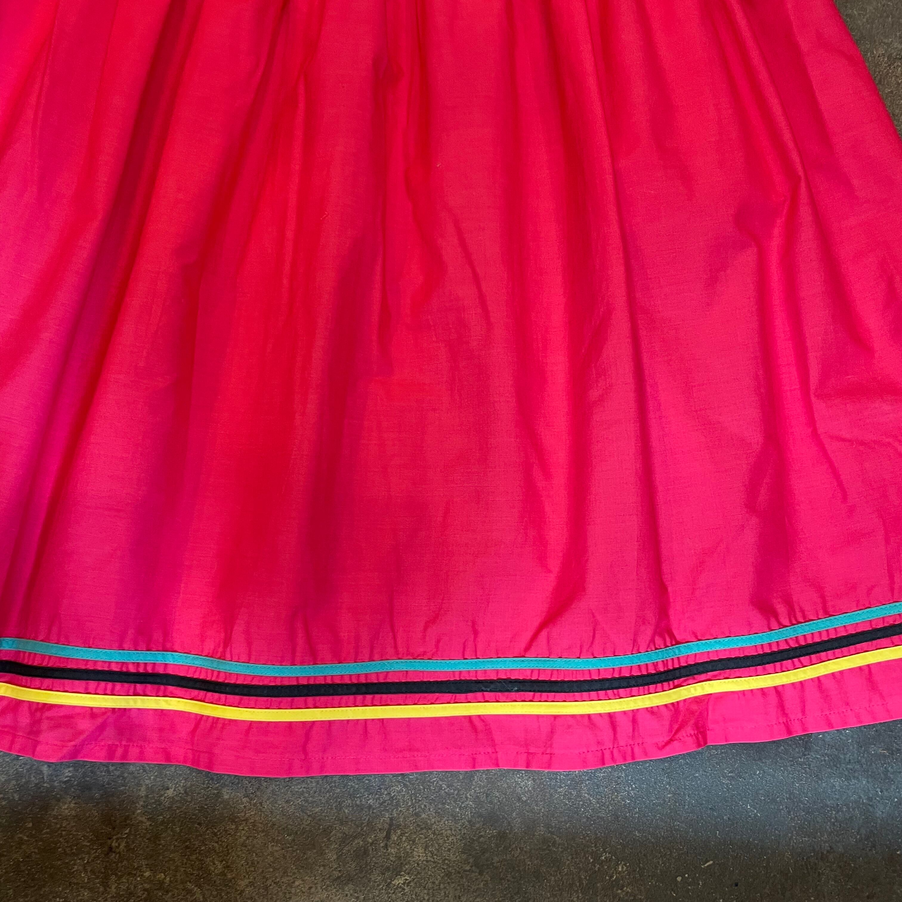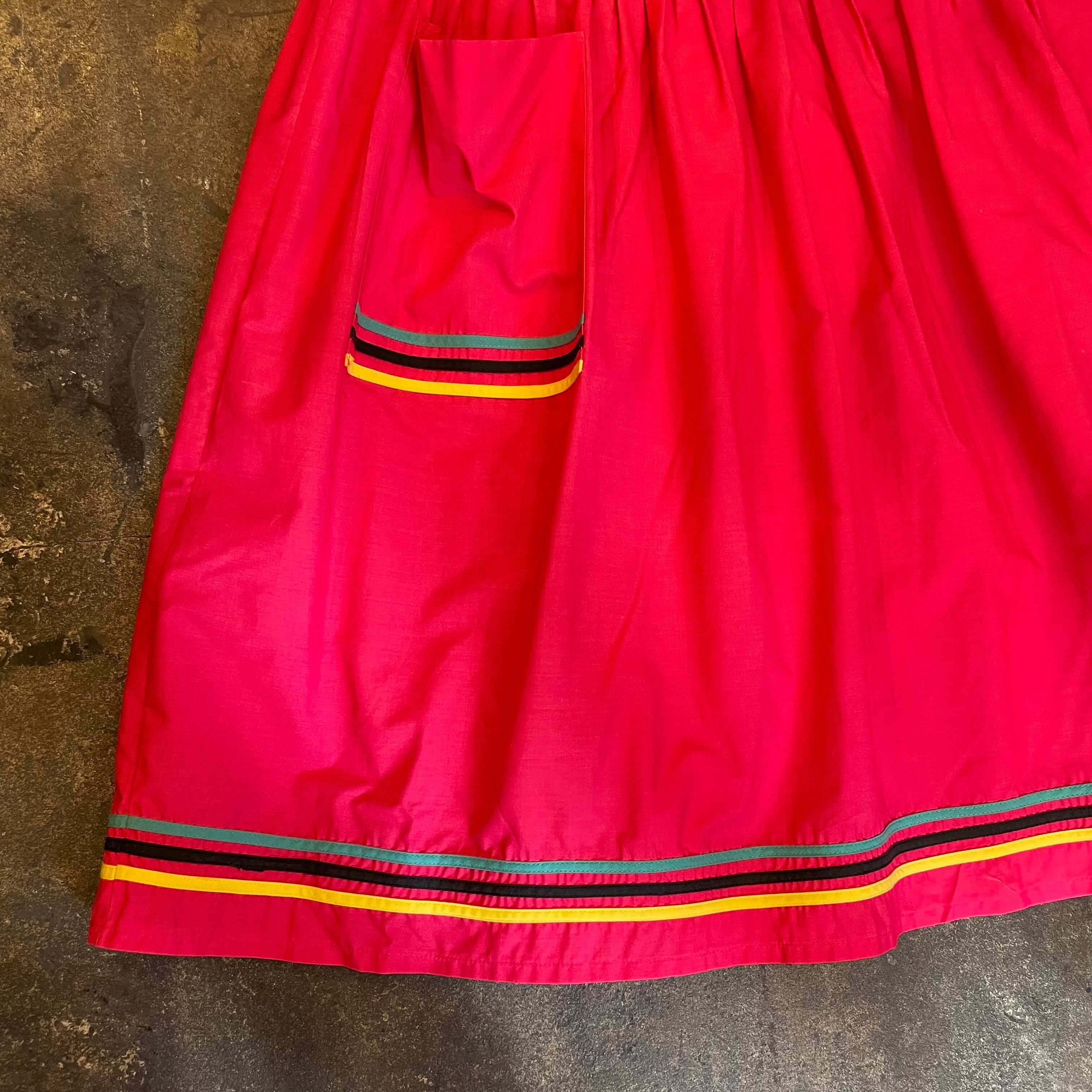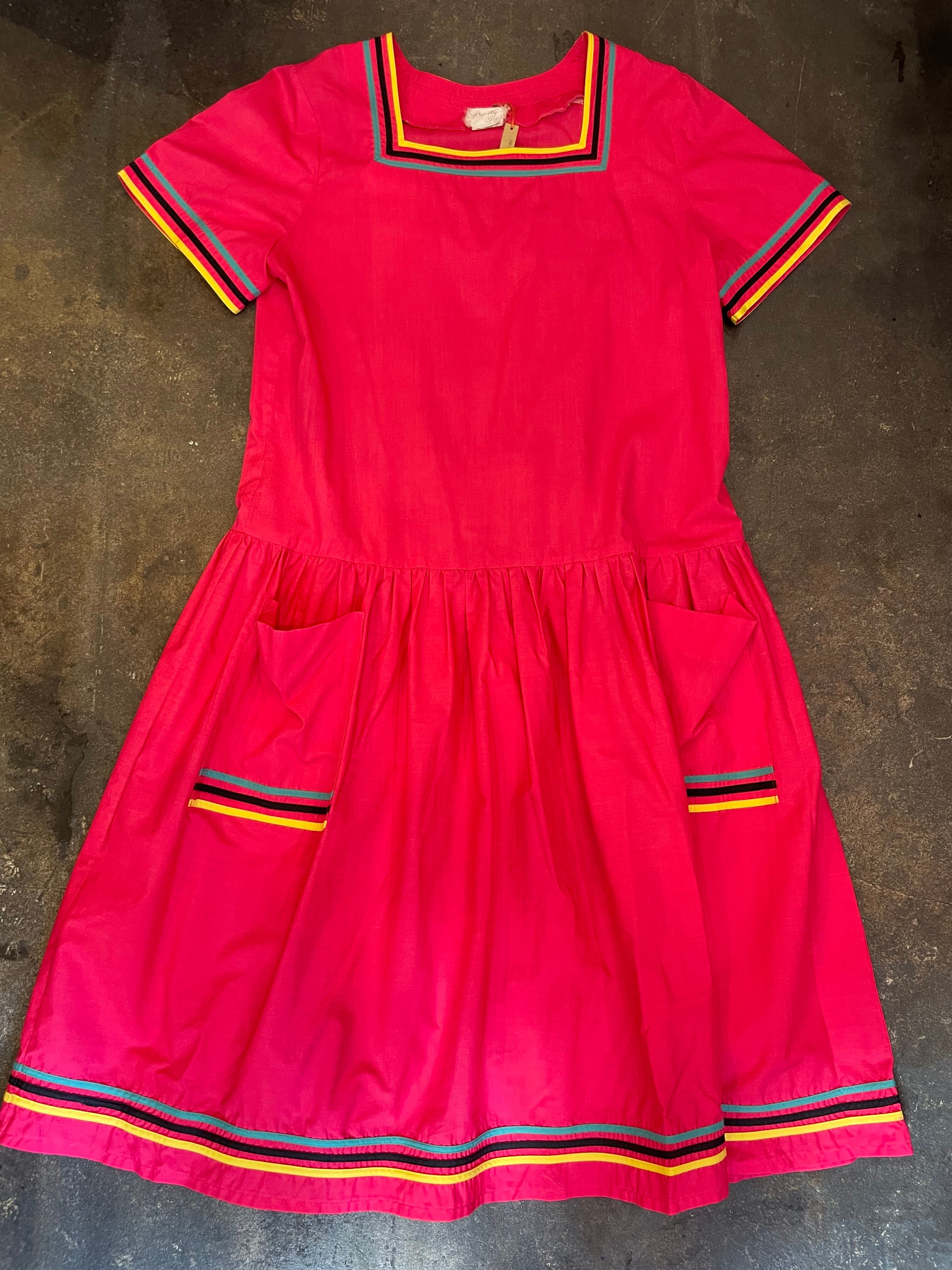 ピンク地に緑、黒、黄色のテープがかわいい無地のワンピースです。