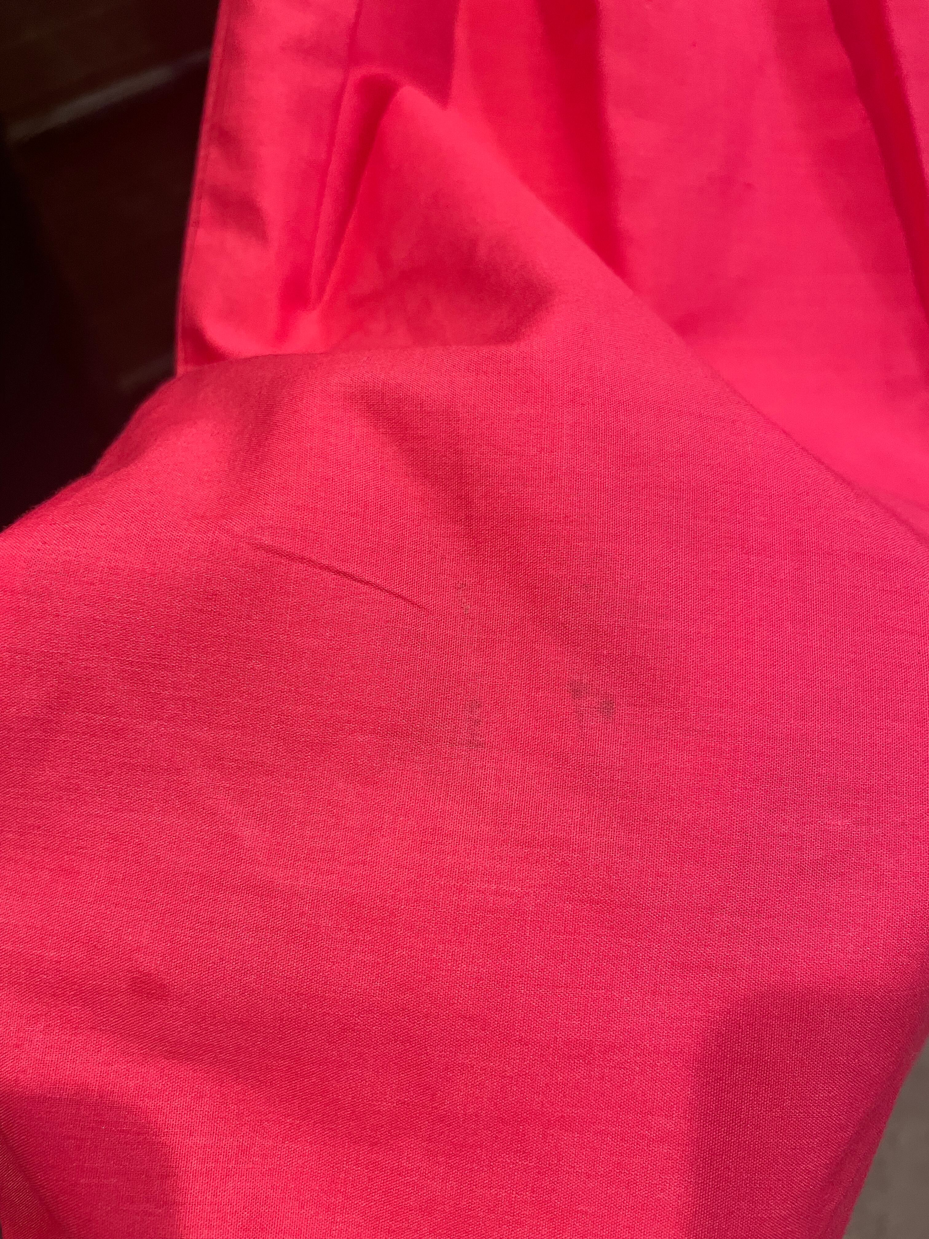目の覚めるピンクが明るくて華やかで目を惹きますね。スクエアネックで首元スッキリですし、ローウエストでゆるい雰囲気が良いバランスだと思います。