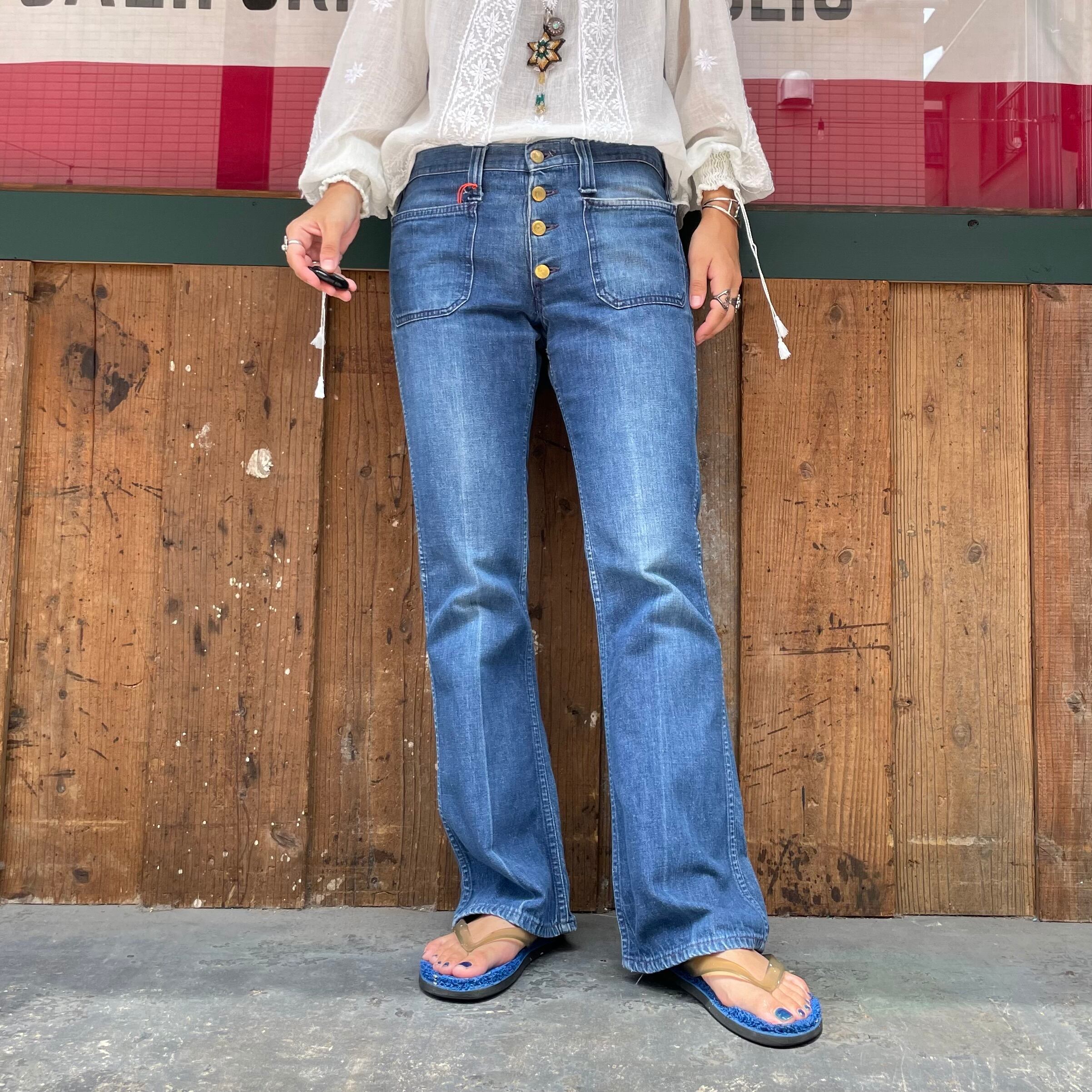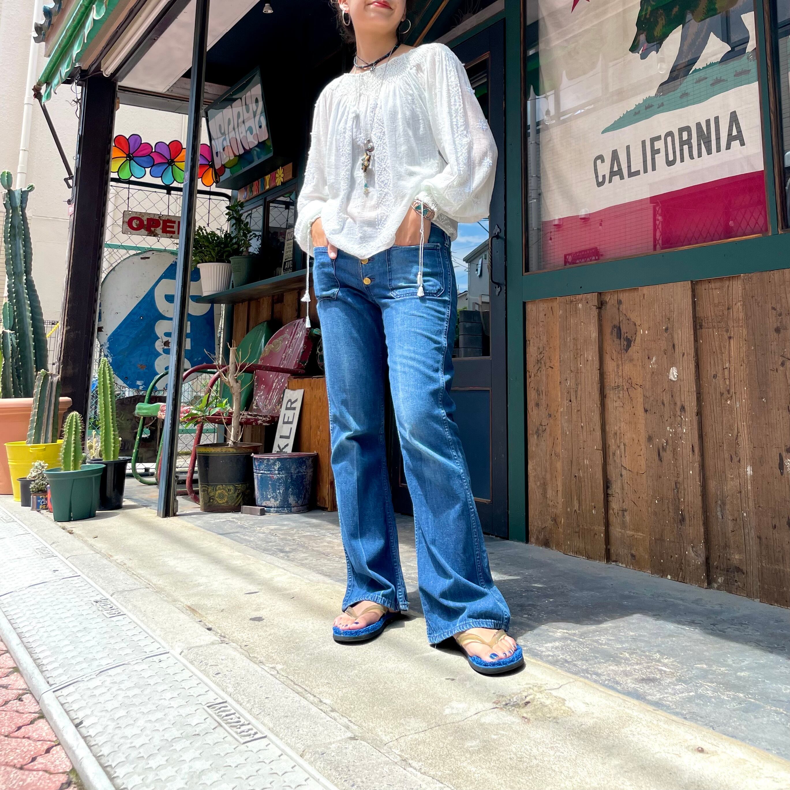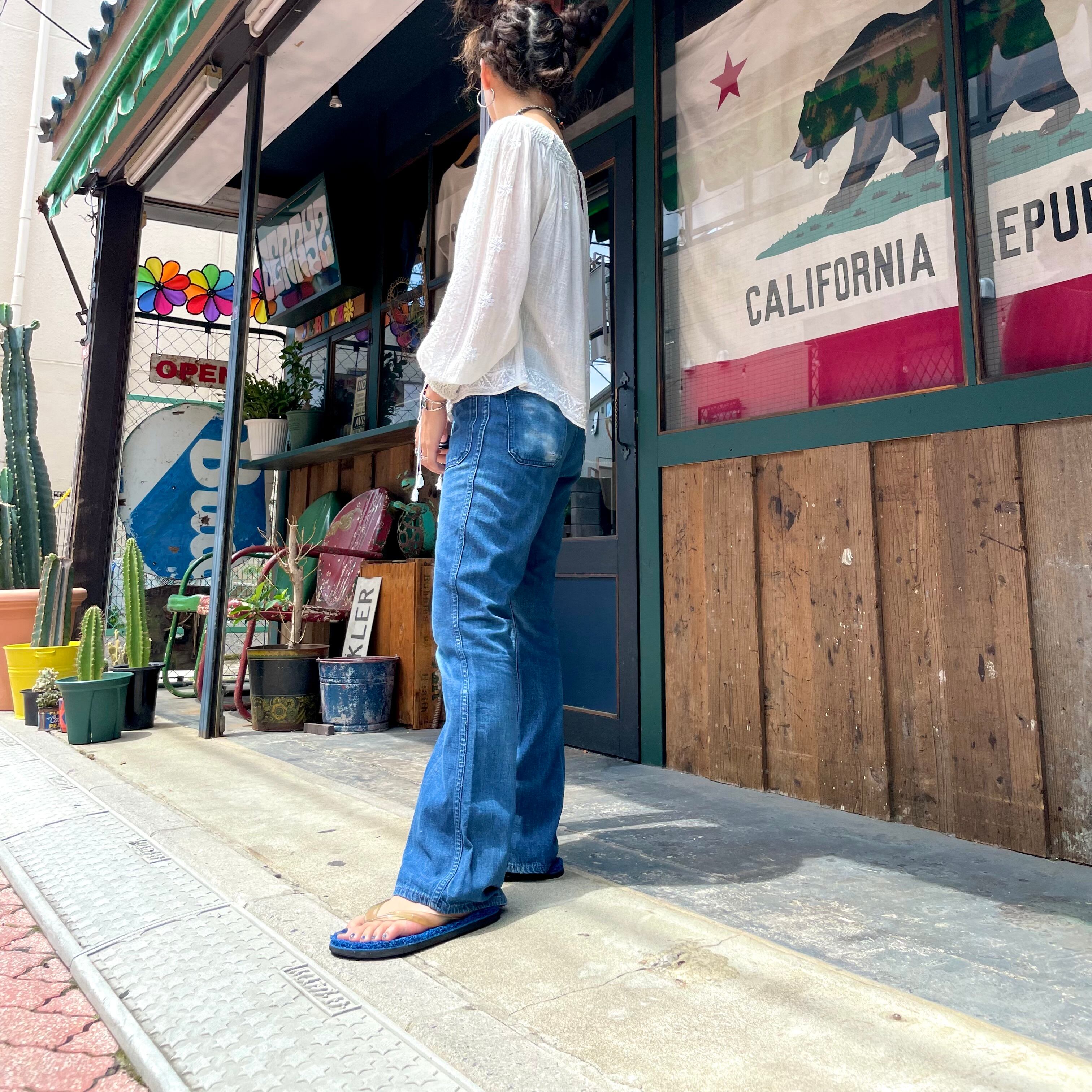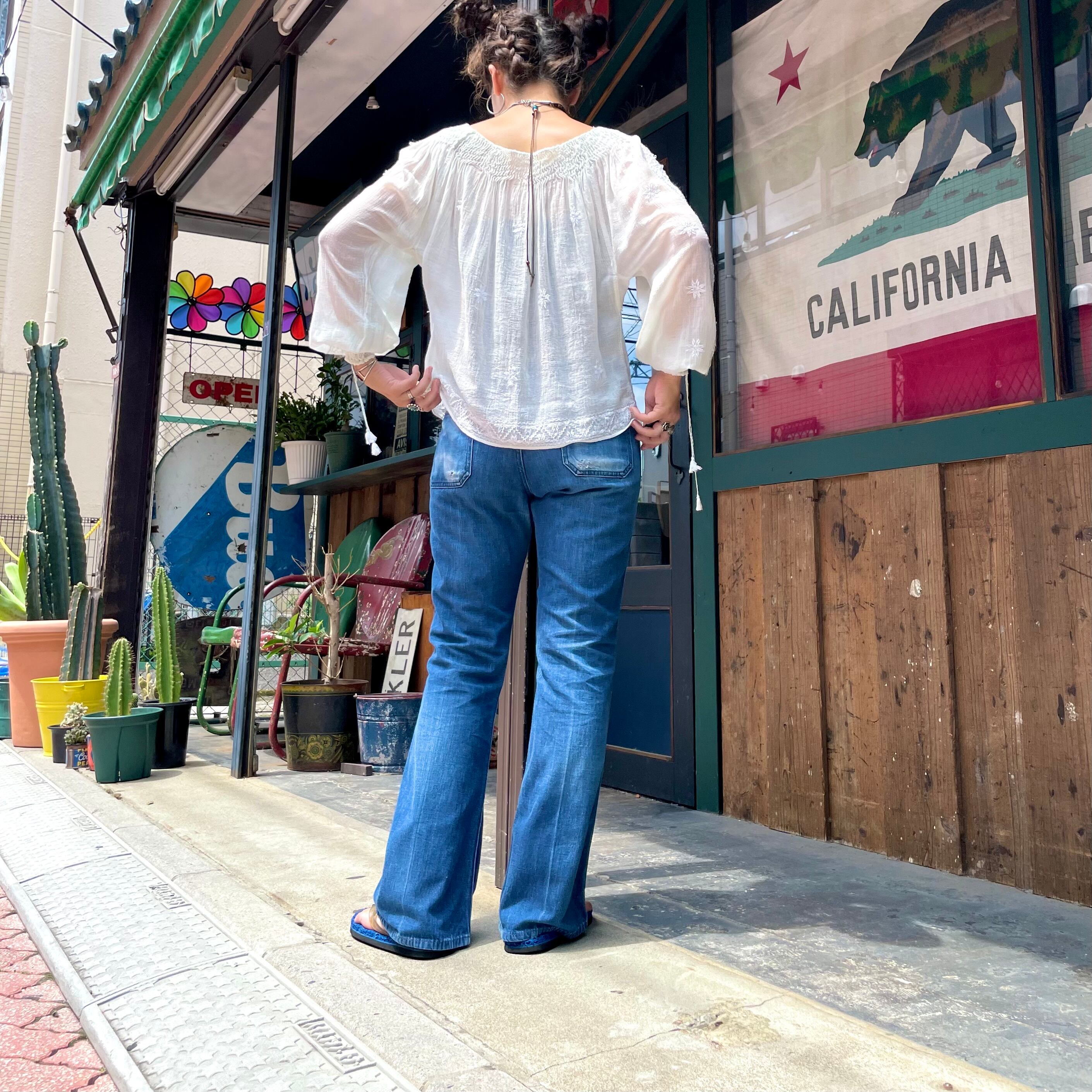 ややローライズで、ブーツカットくらいのフレア具合ですので履きやすいシルエットだと思います。