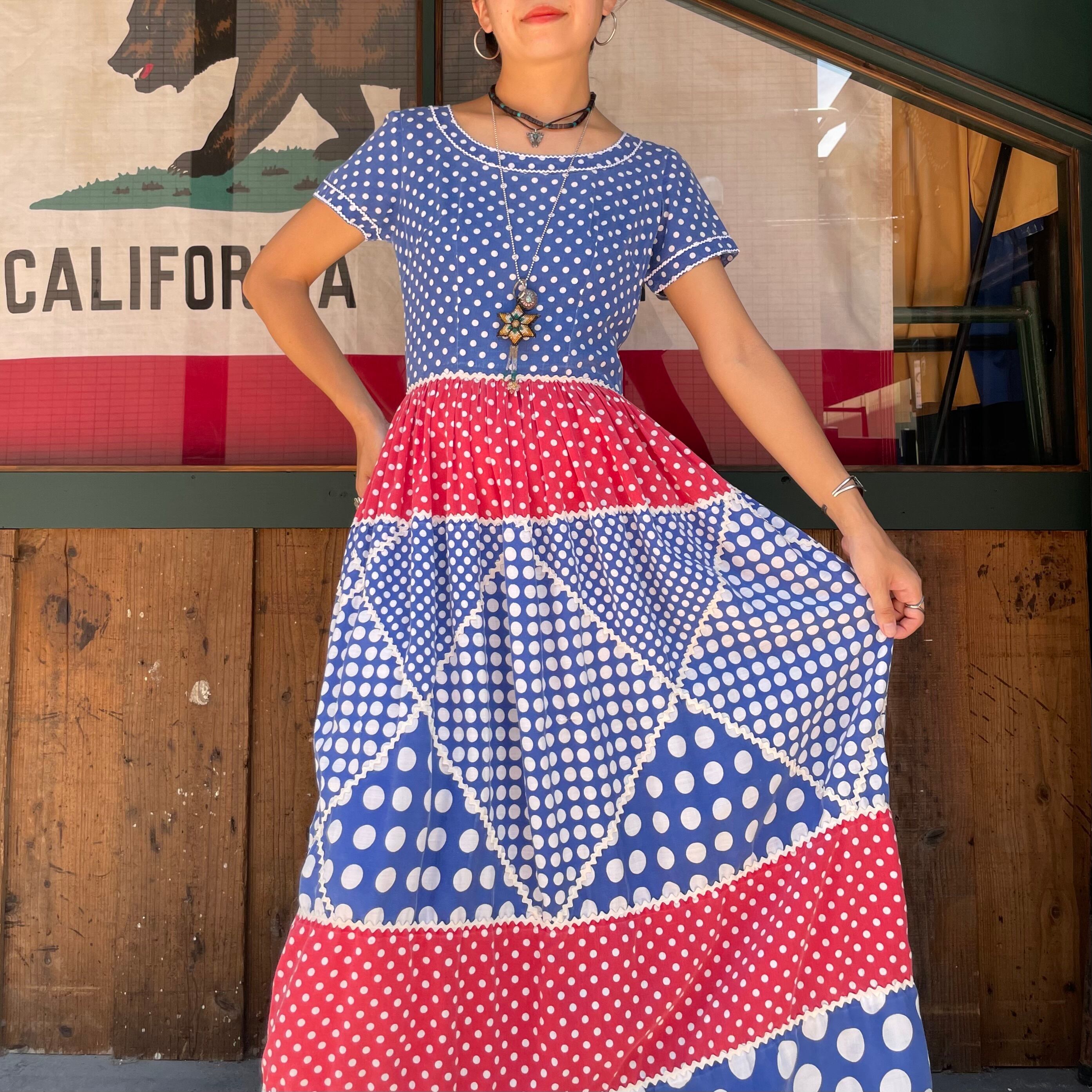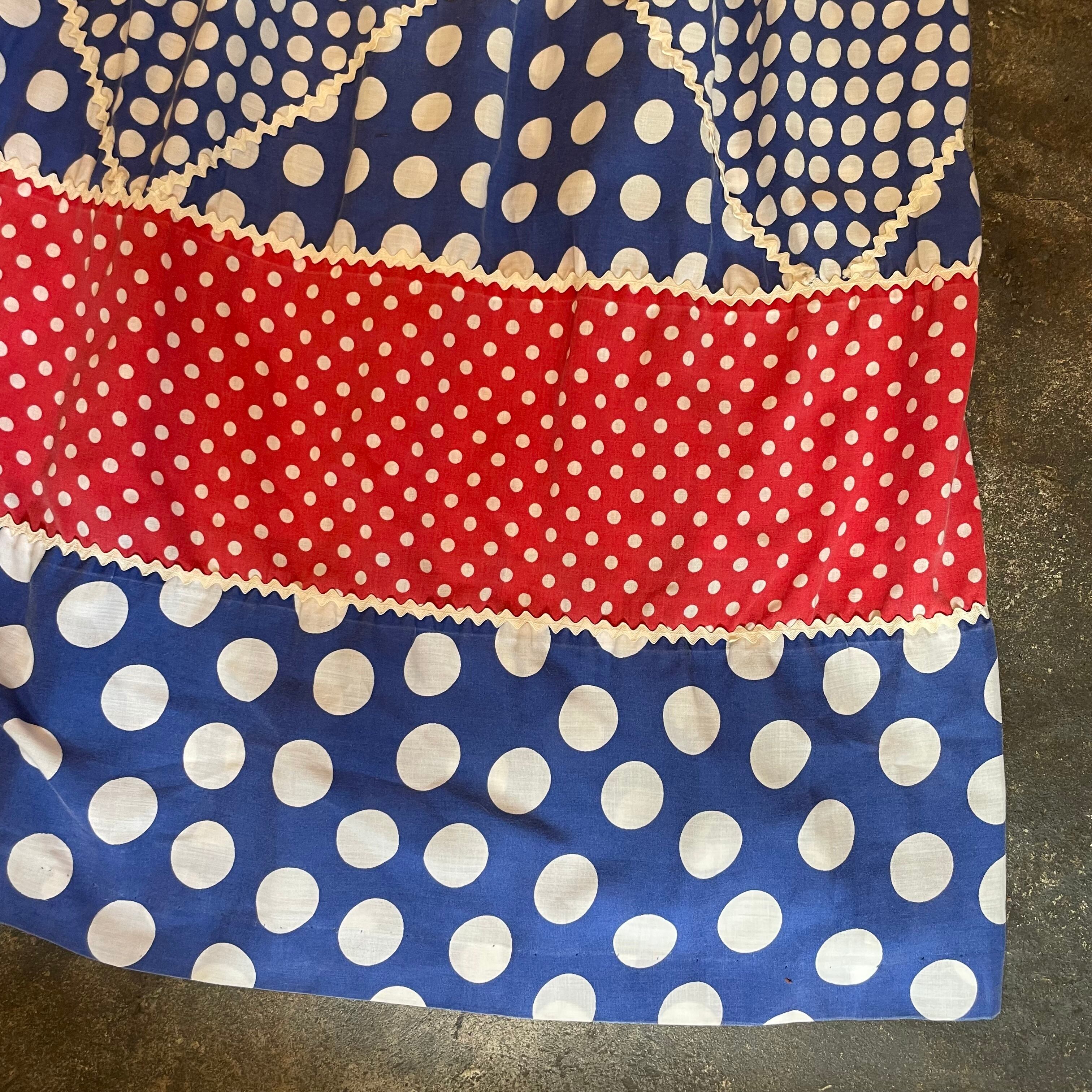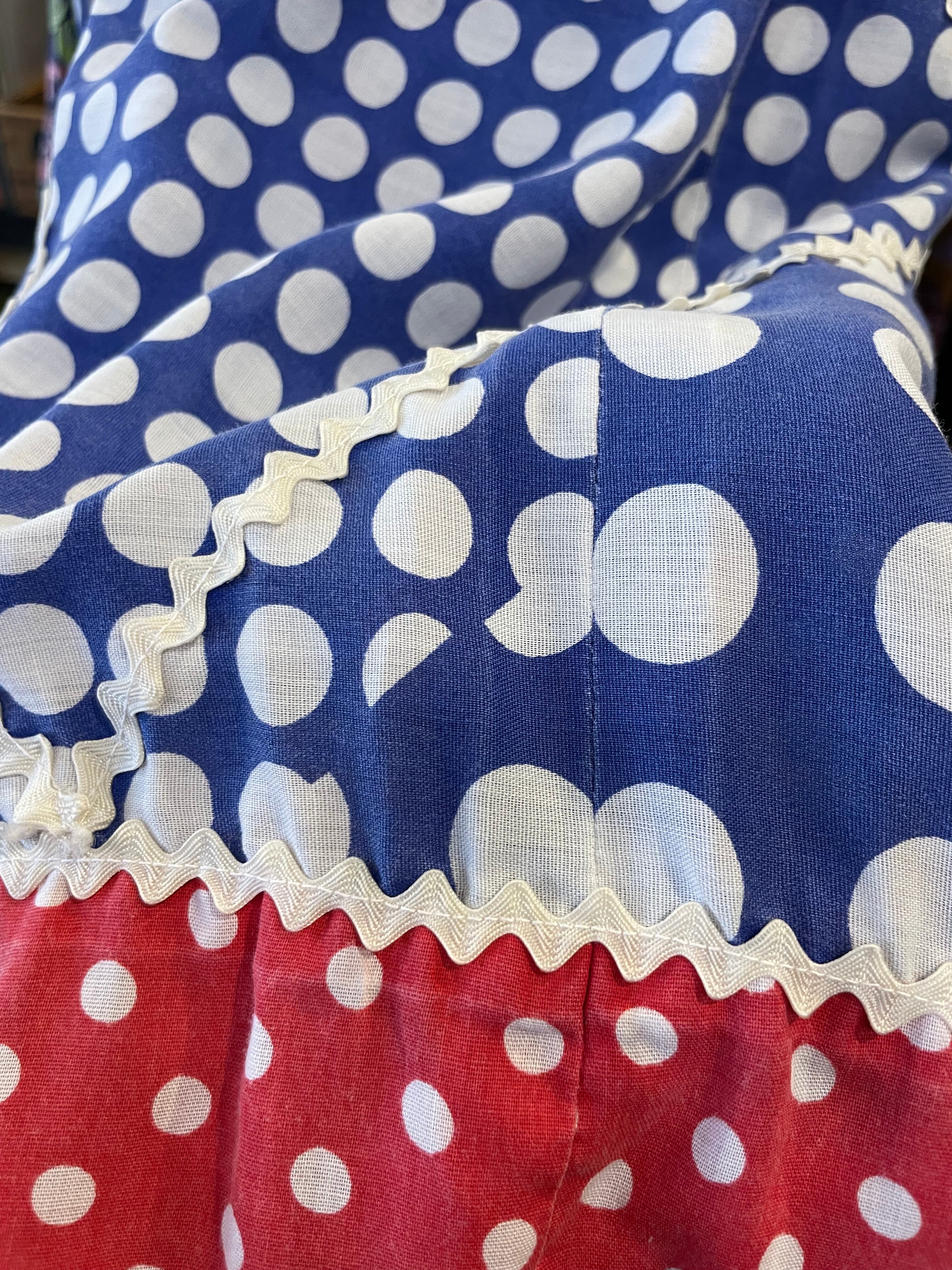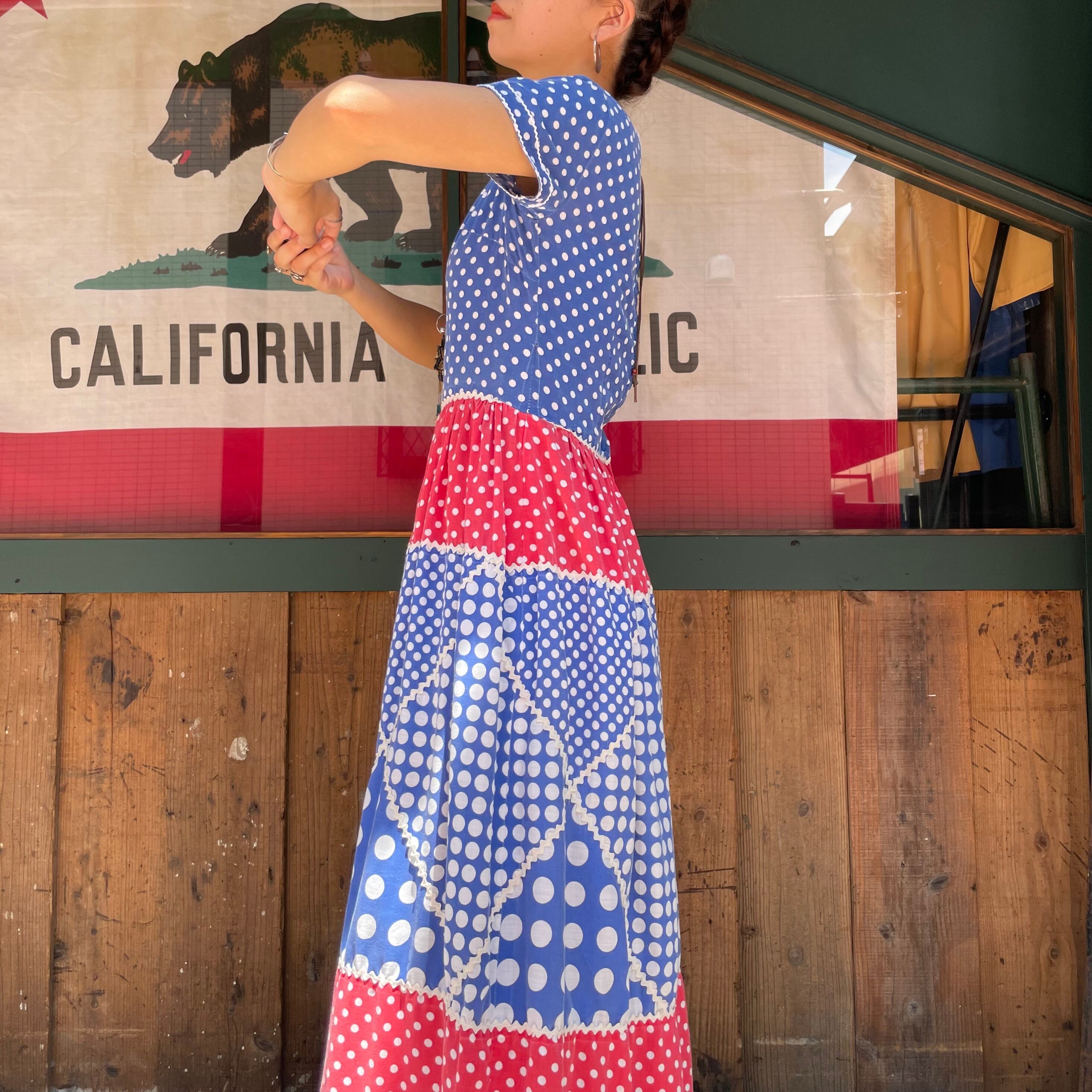 大小様々なドットの模様のパッチワークと山道テープがかわいいワンピースです。