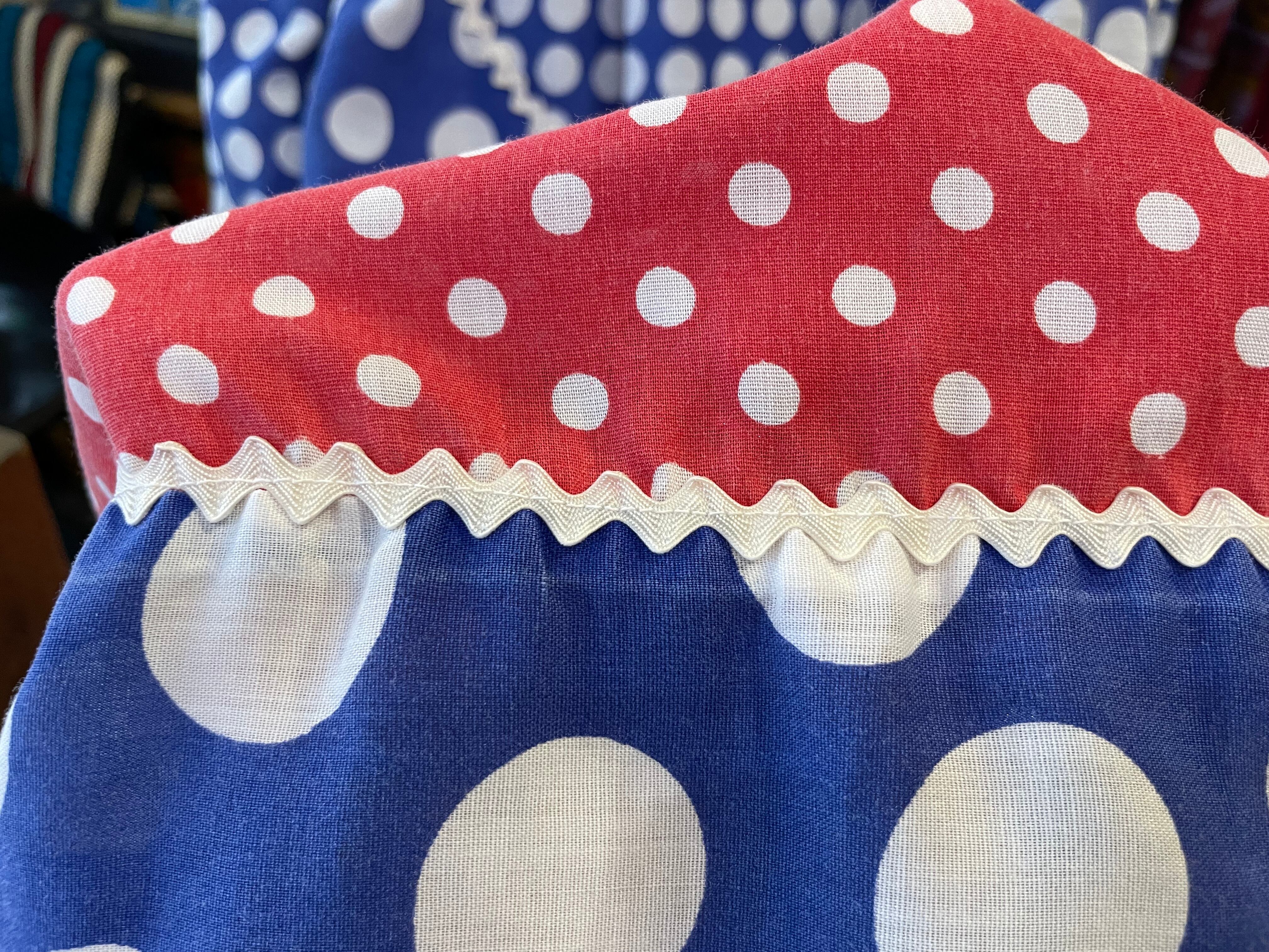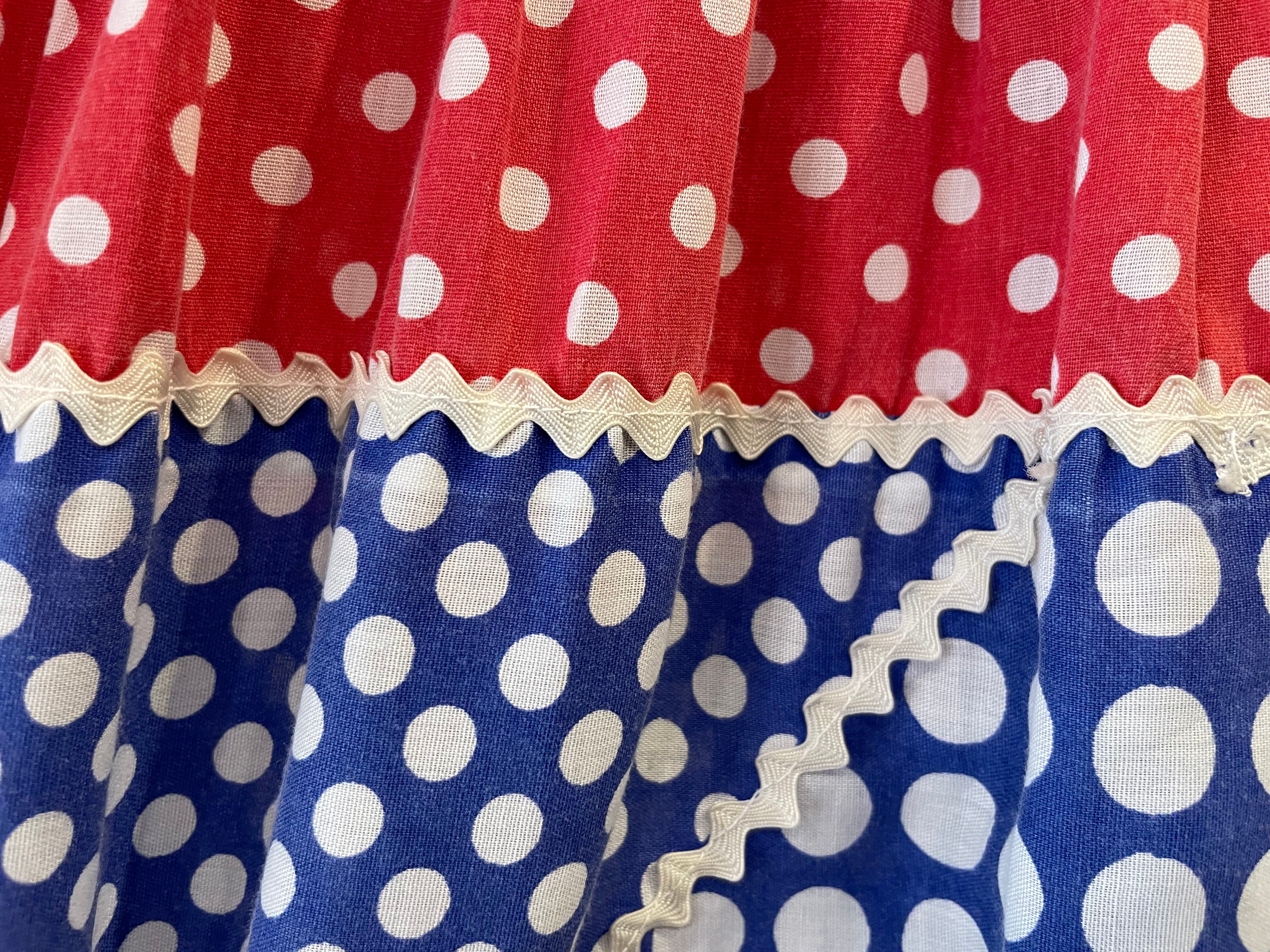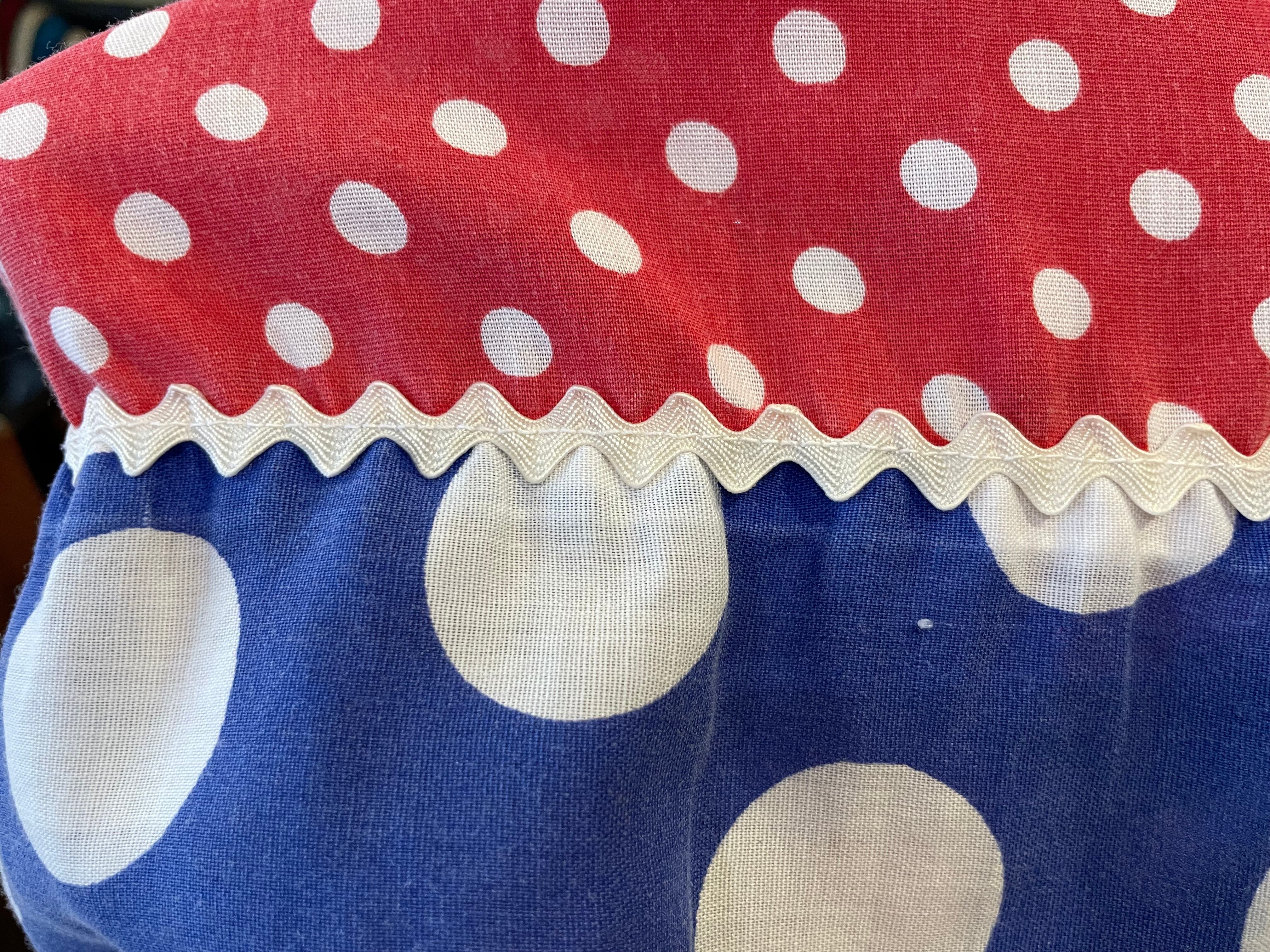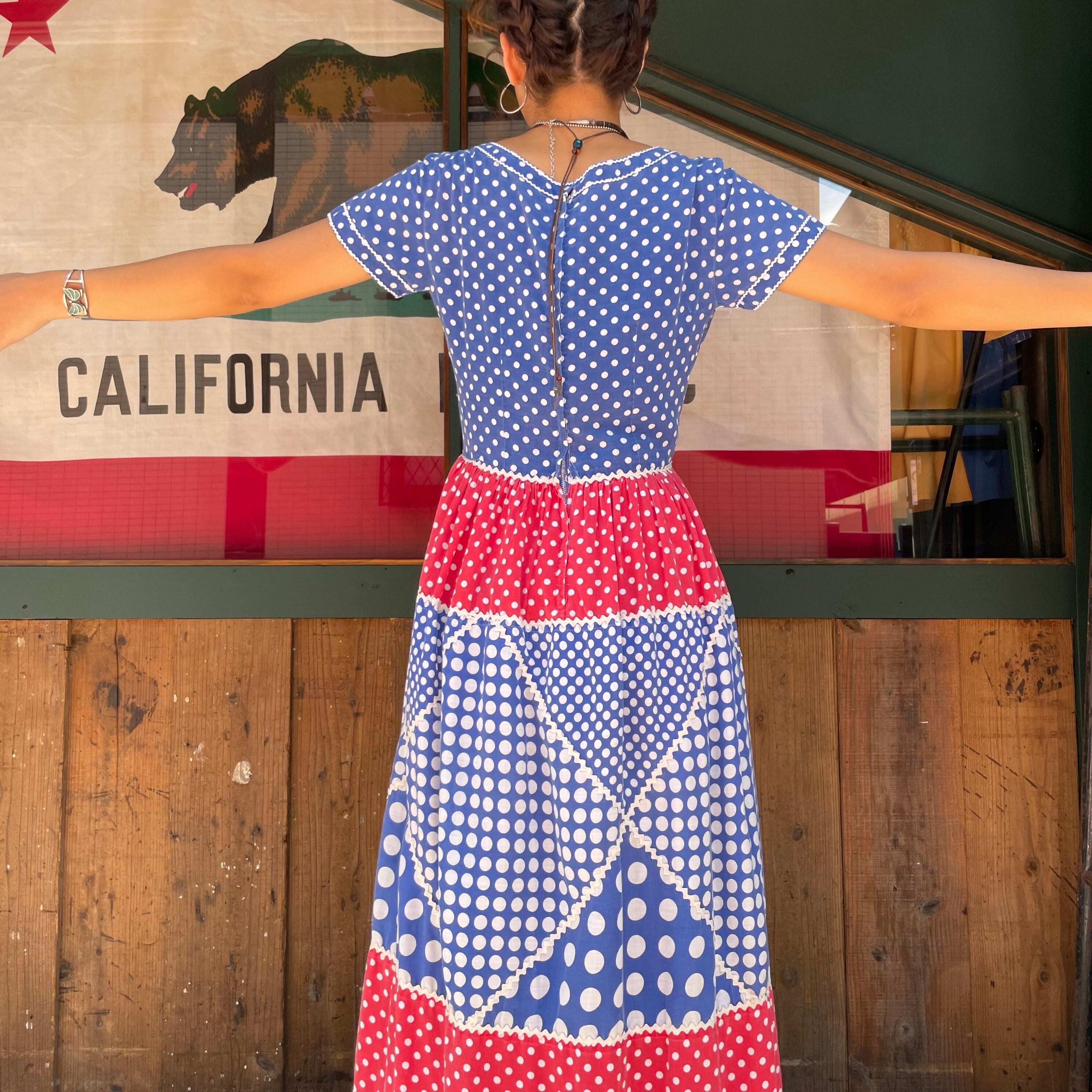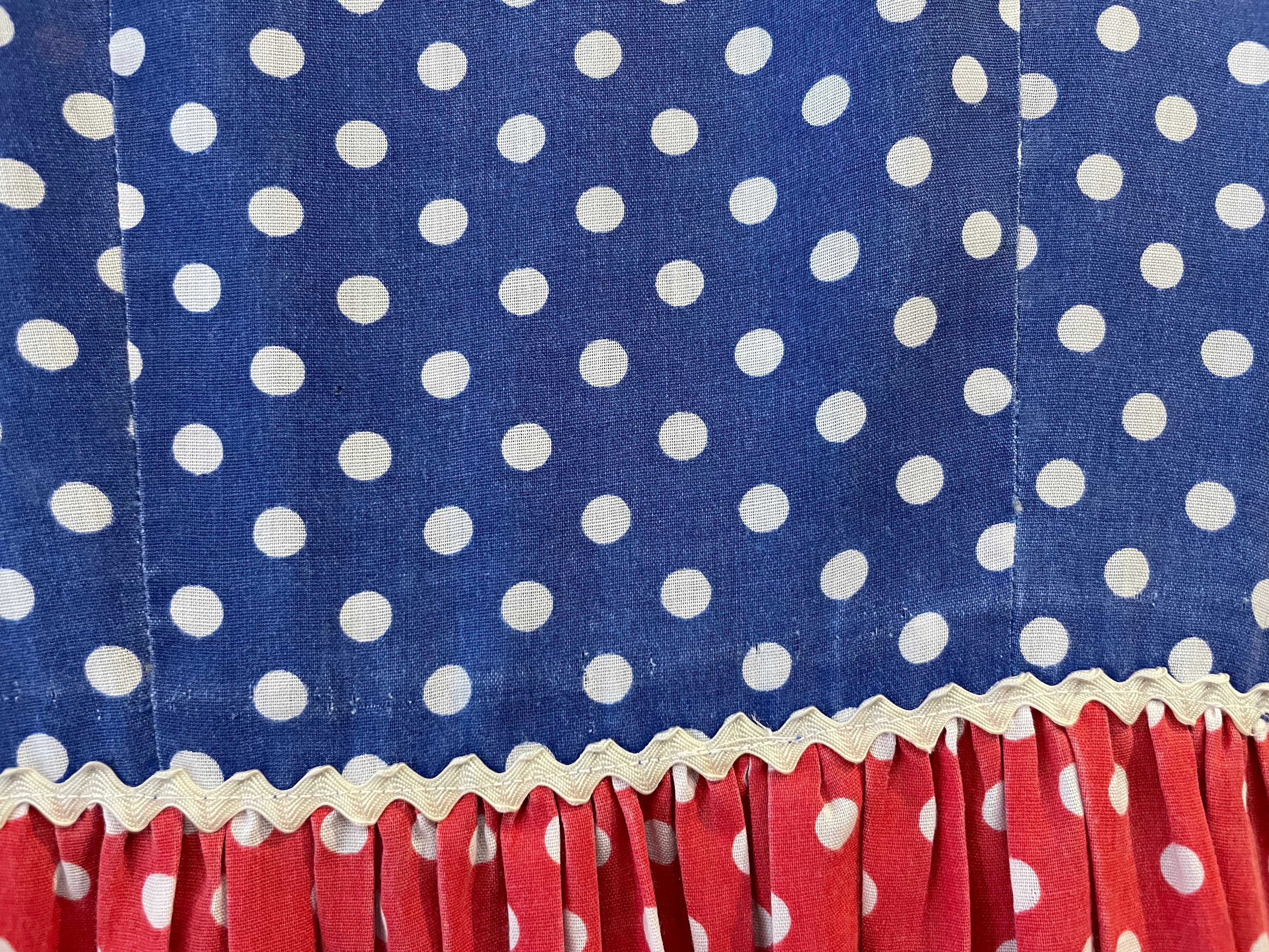 大小様々なドットの模様のパッチワークと山道テープがかわいいワンピースです。