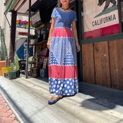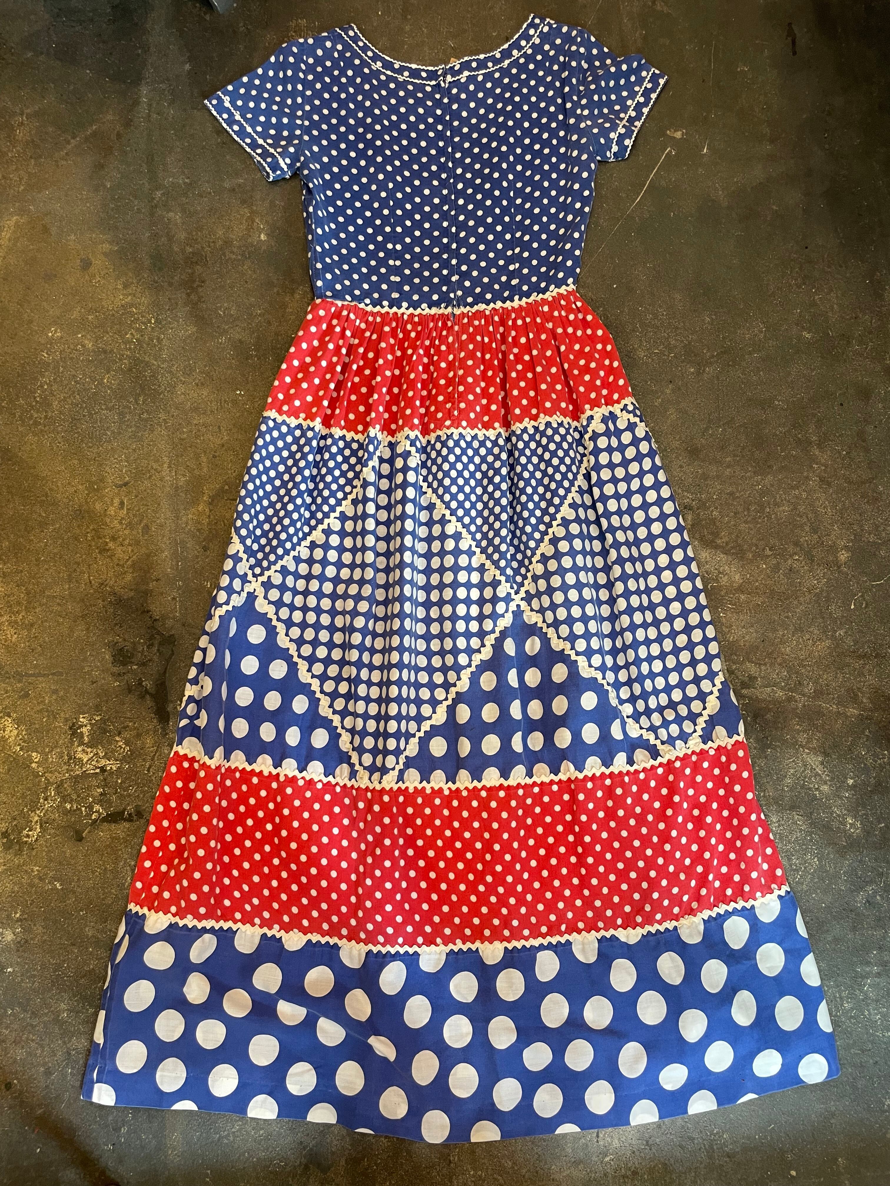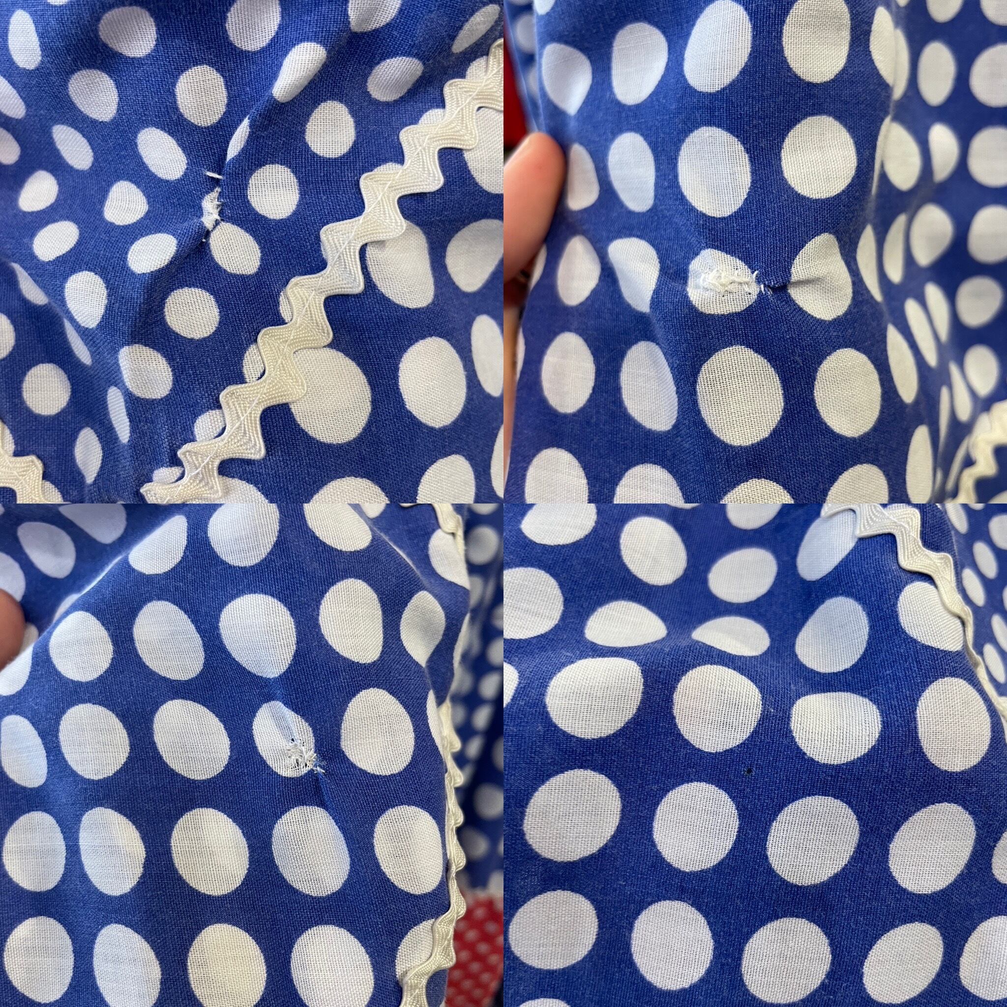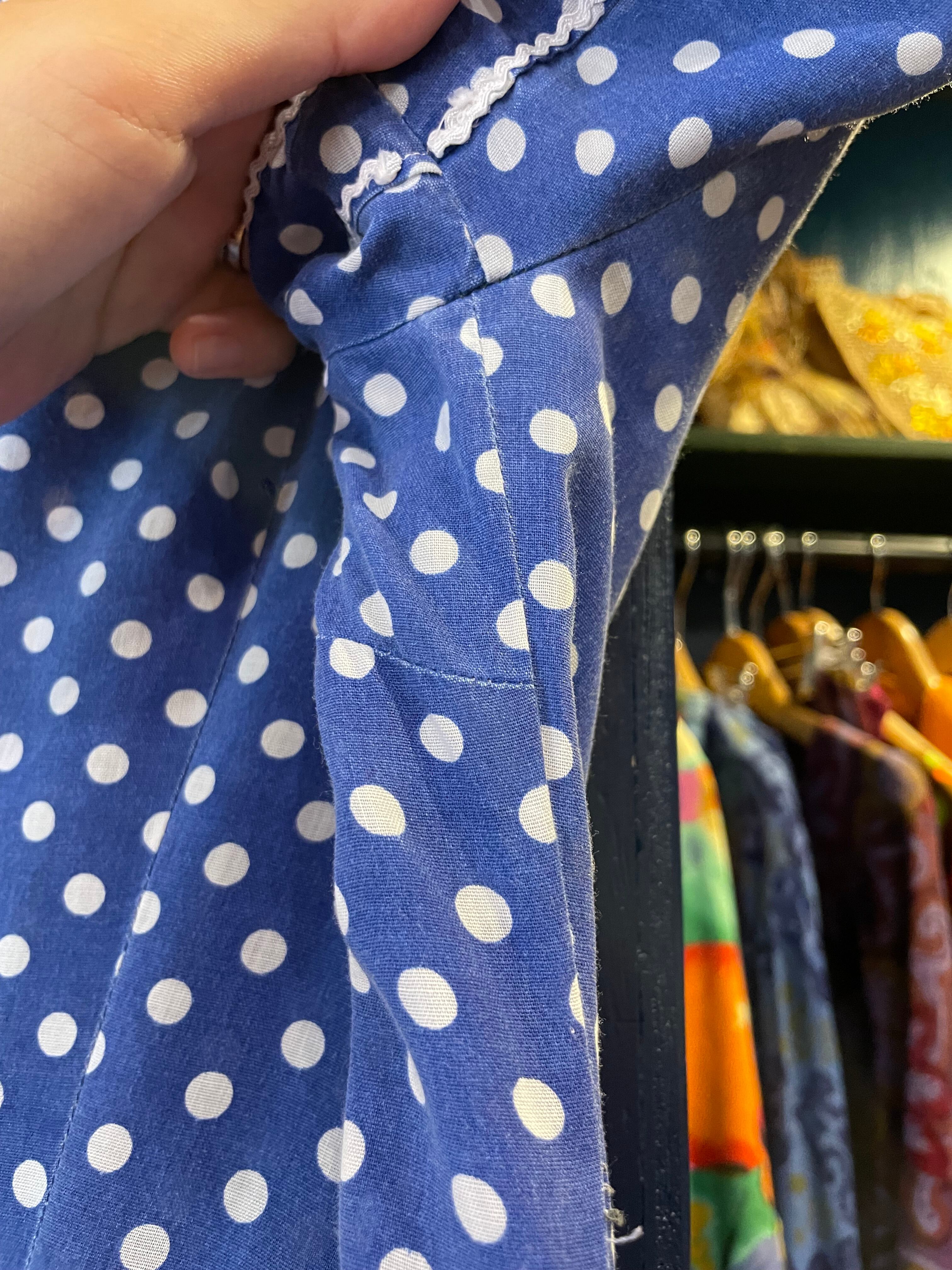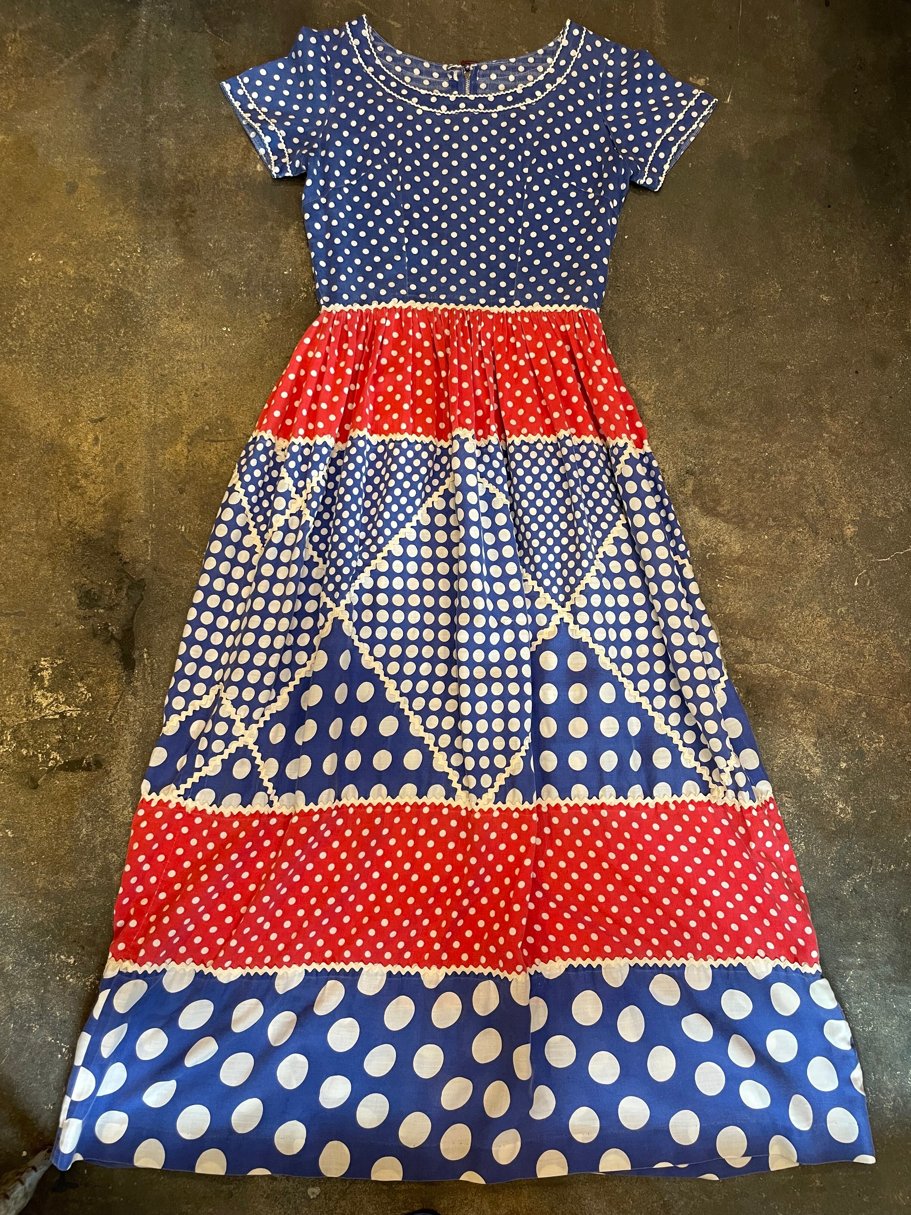 大小様々なドットの模様のパッチワークと山道テープがかわいいワンピースです。