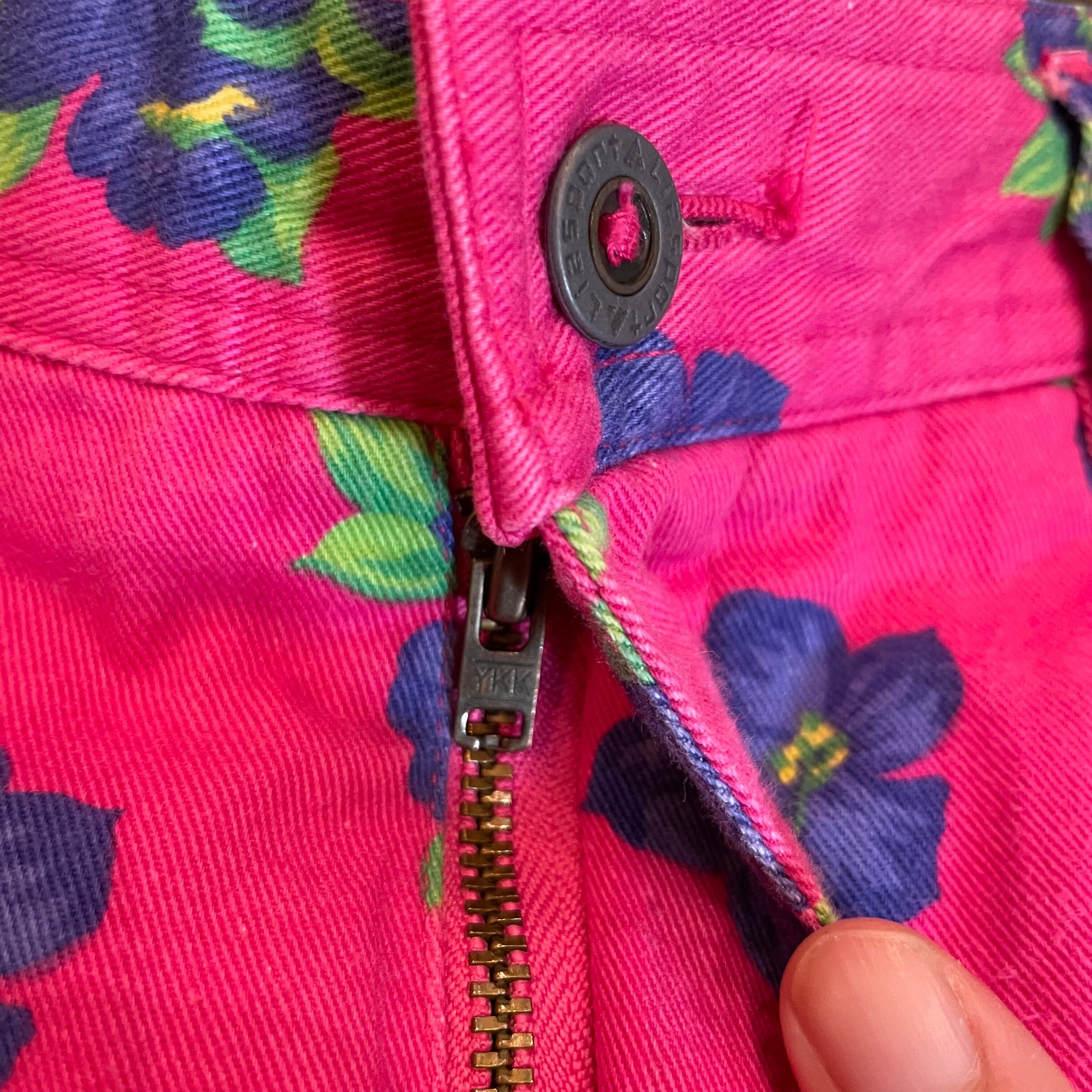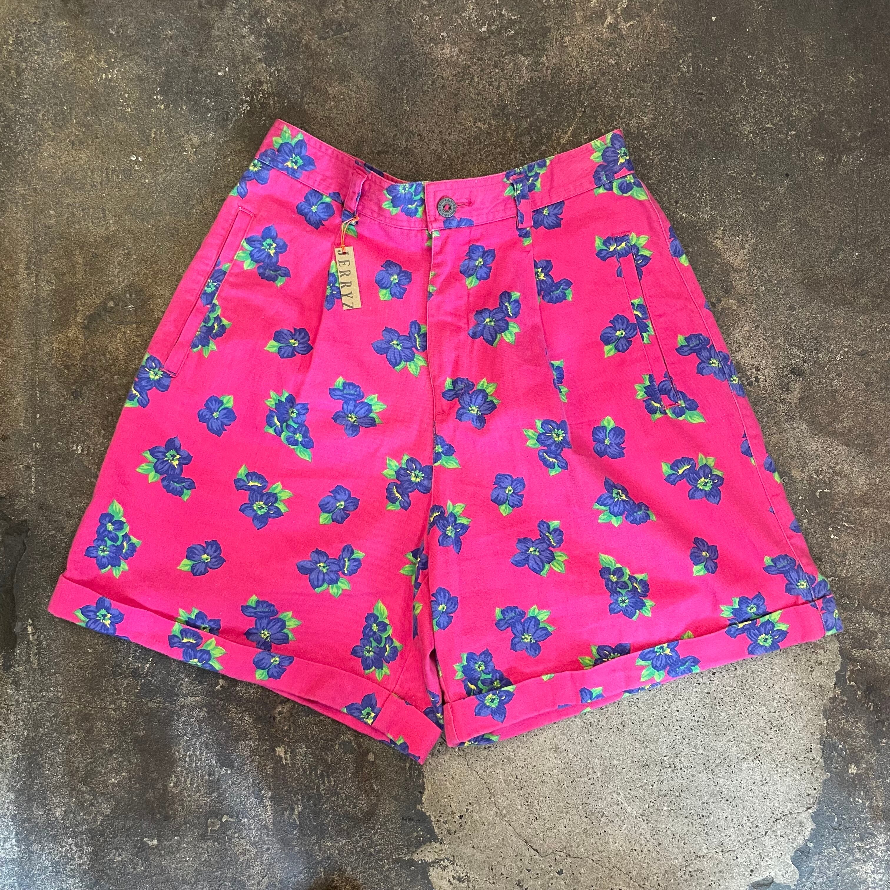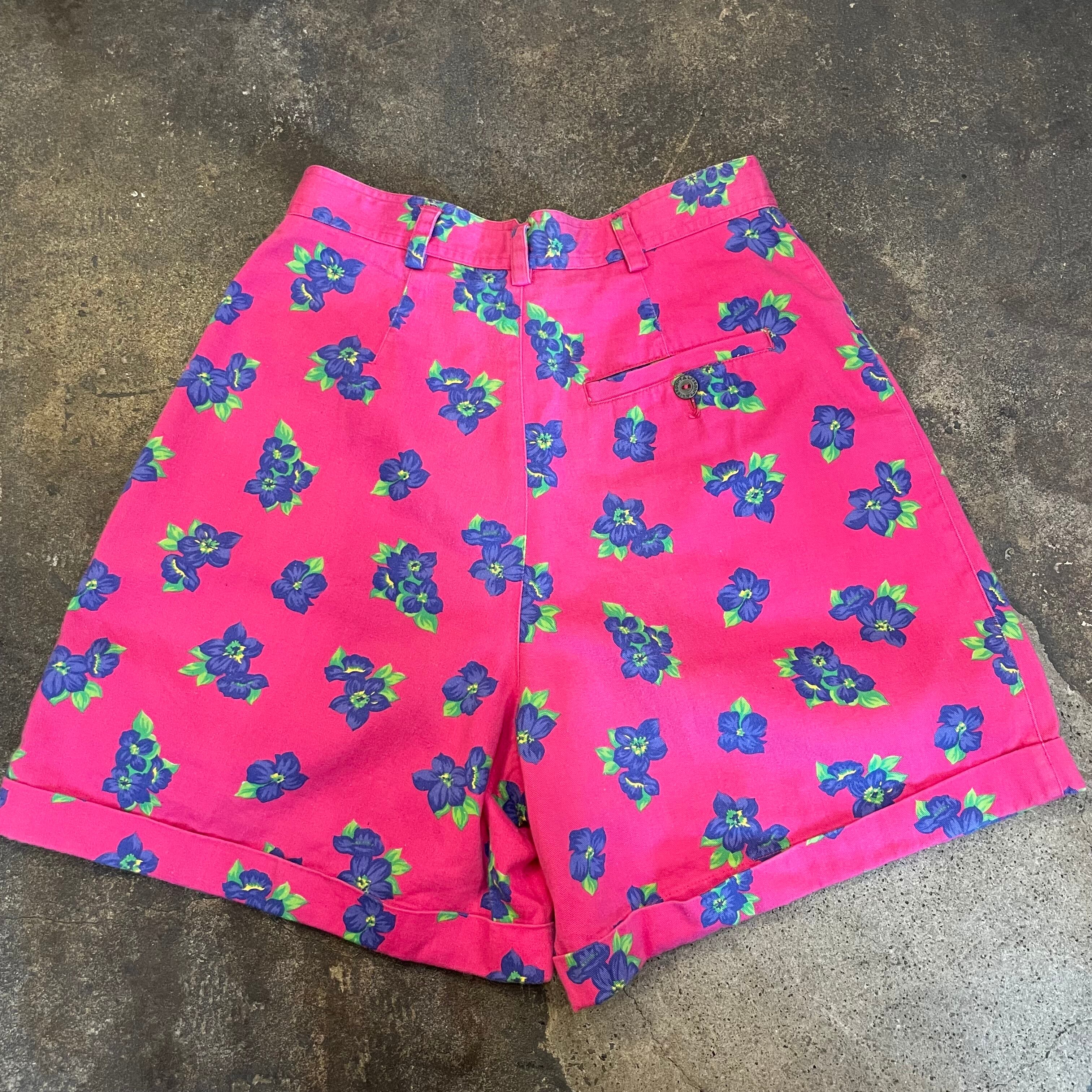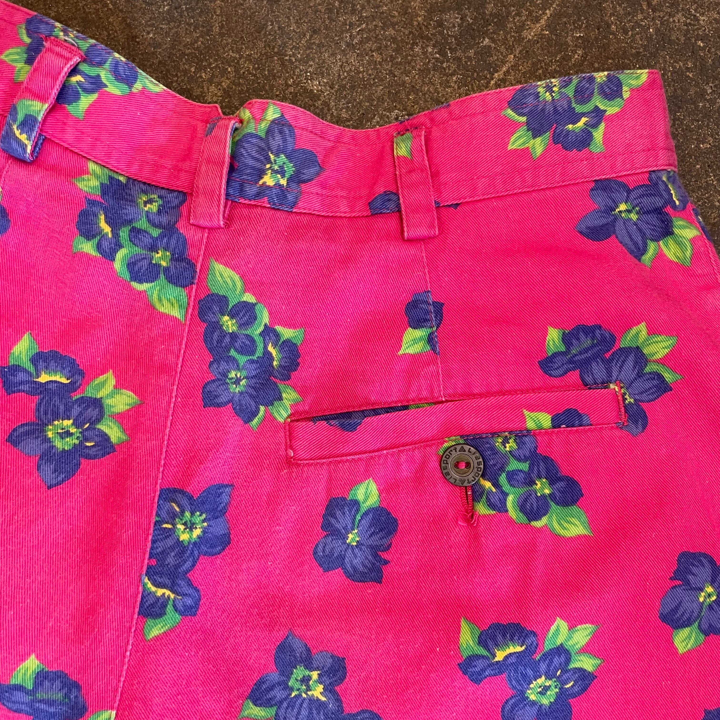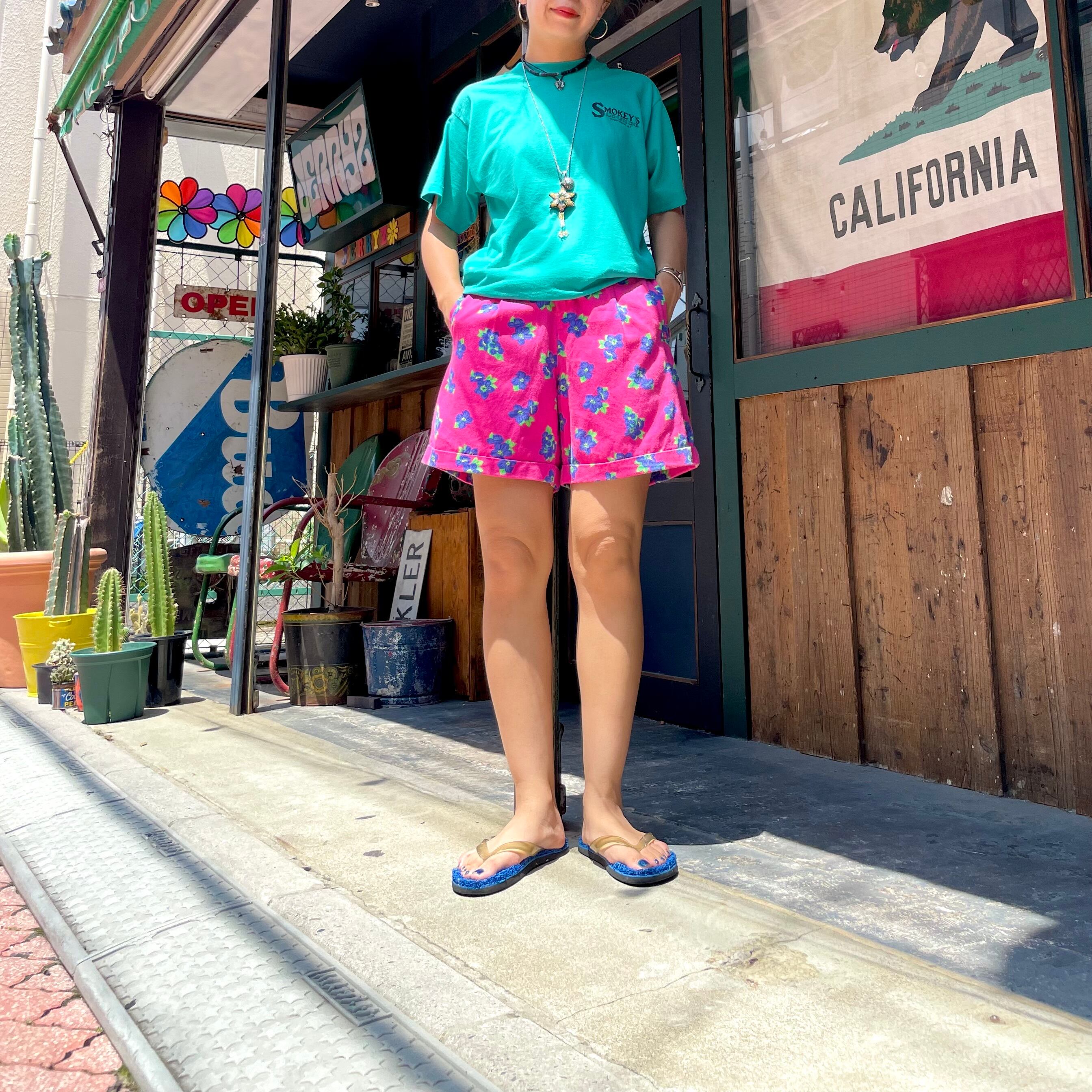 ピンク地に青の花柄がかわいいショートパンツです。ポップで元気なカラーが夏にぴったり、テンションの上がる一枚です。