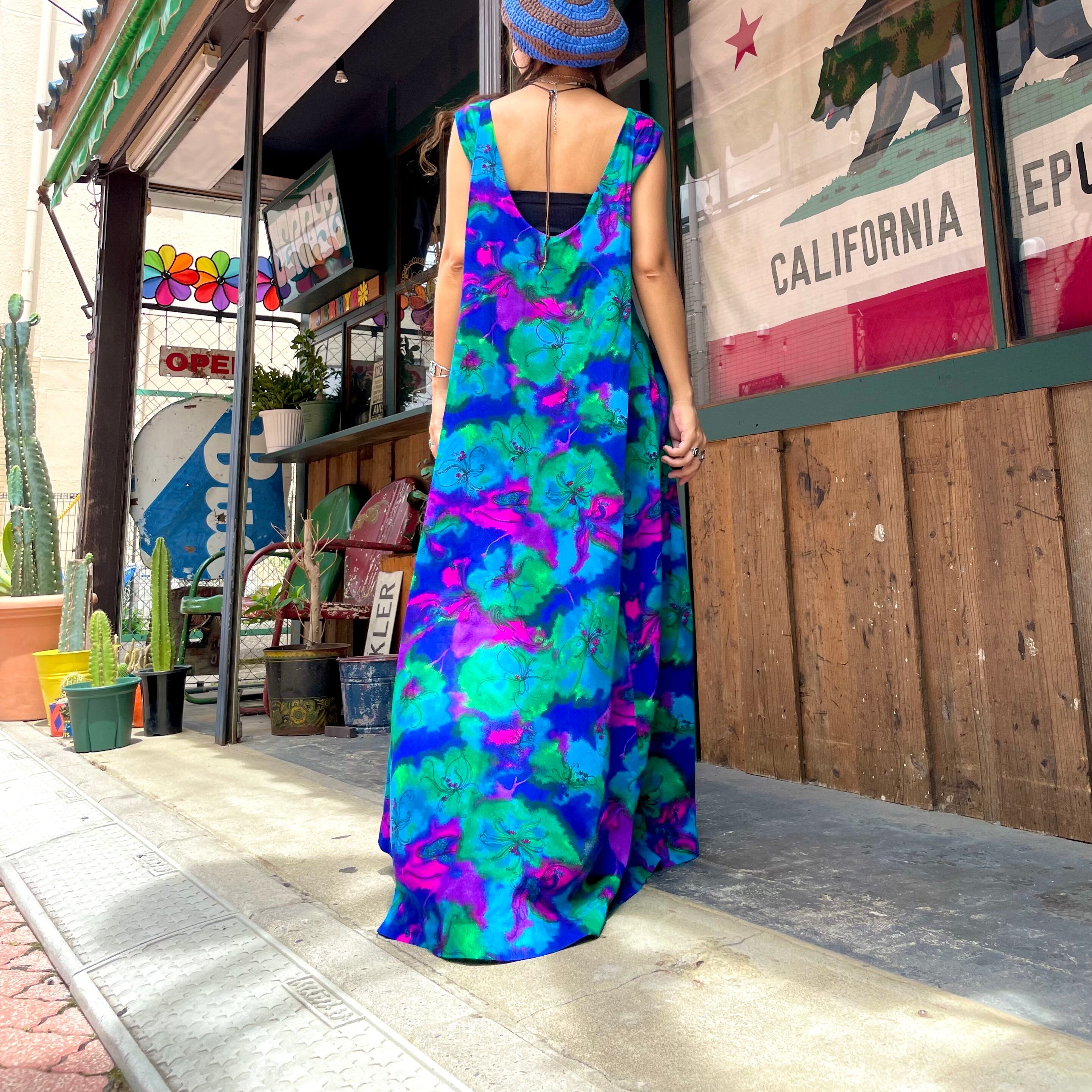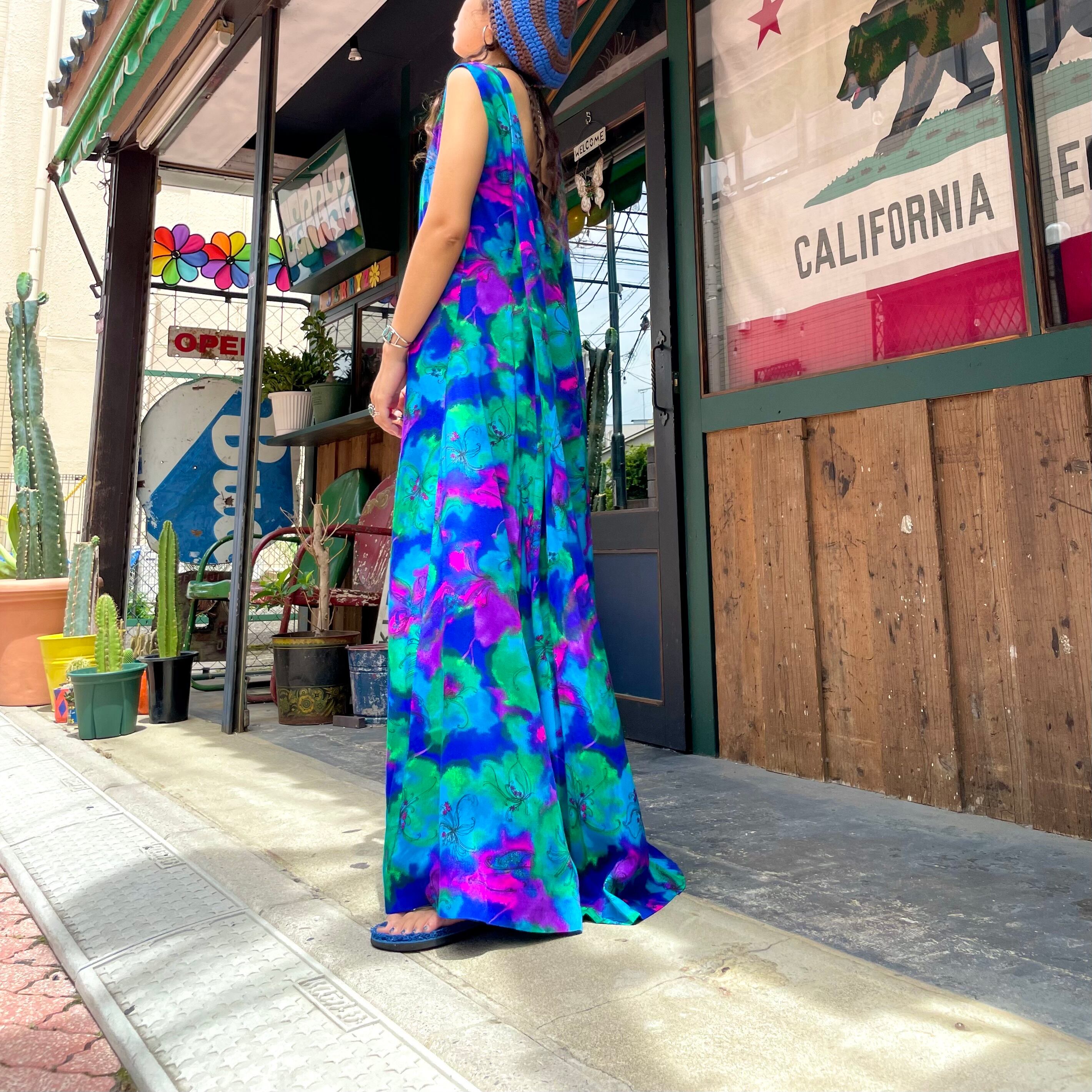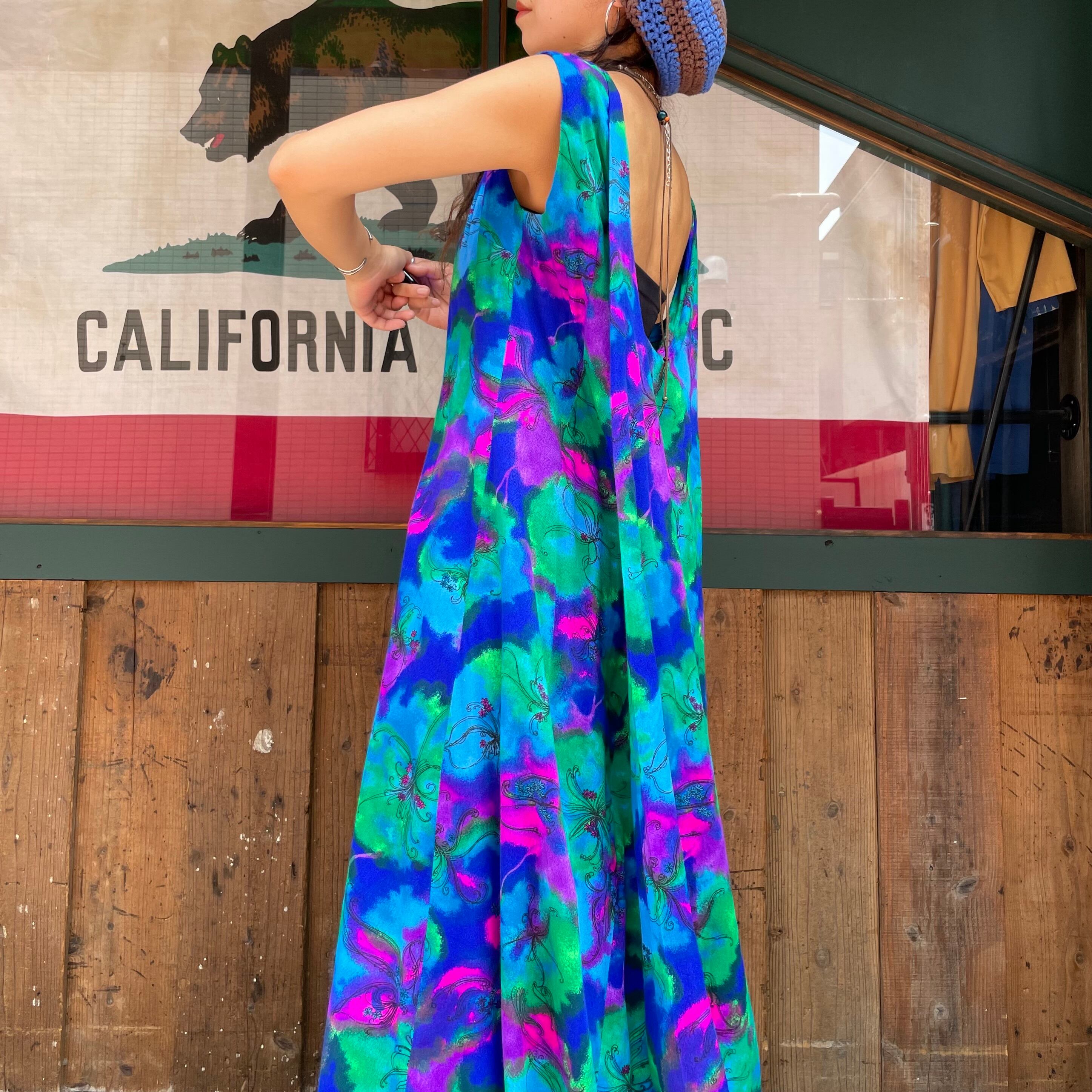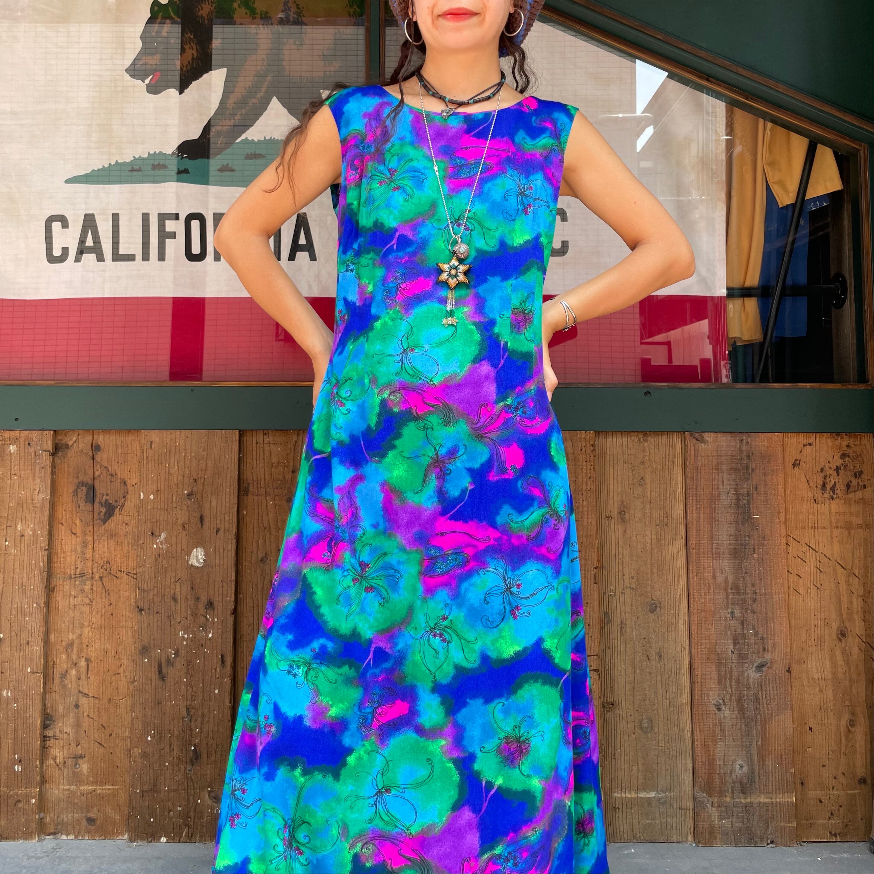 涼しげなカラーに紫がちらちら幻想的でサイケデリックな雰囲気の柄で素敵なワンピースです。