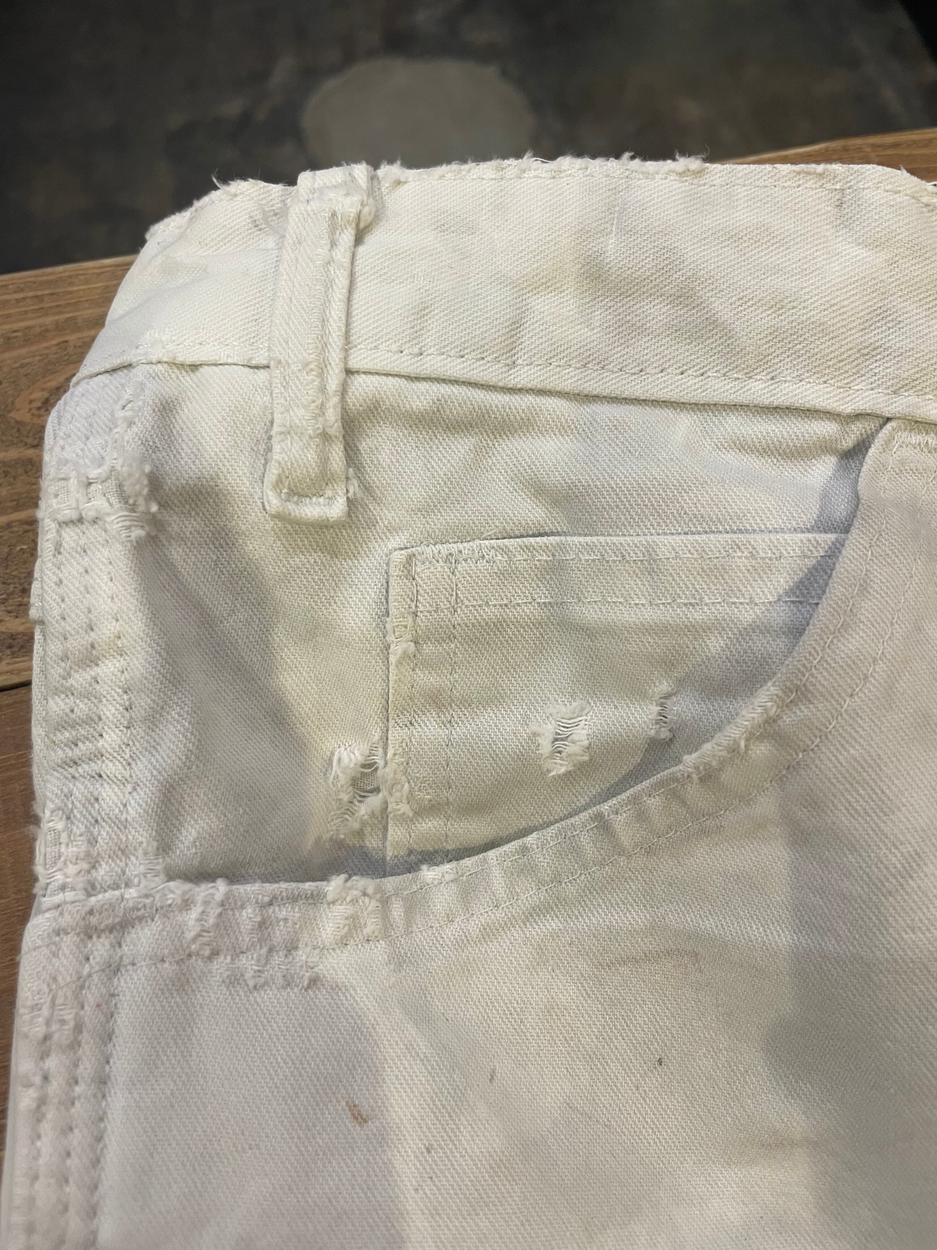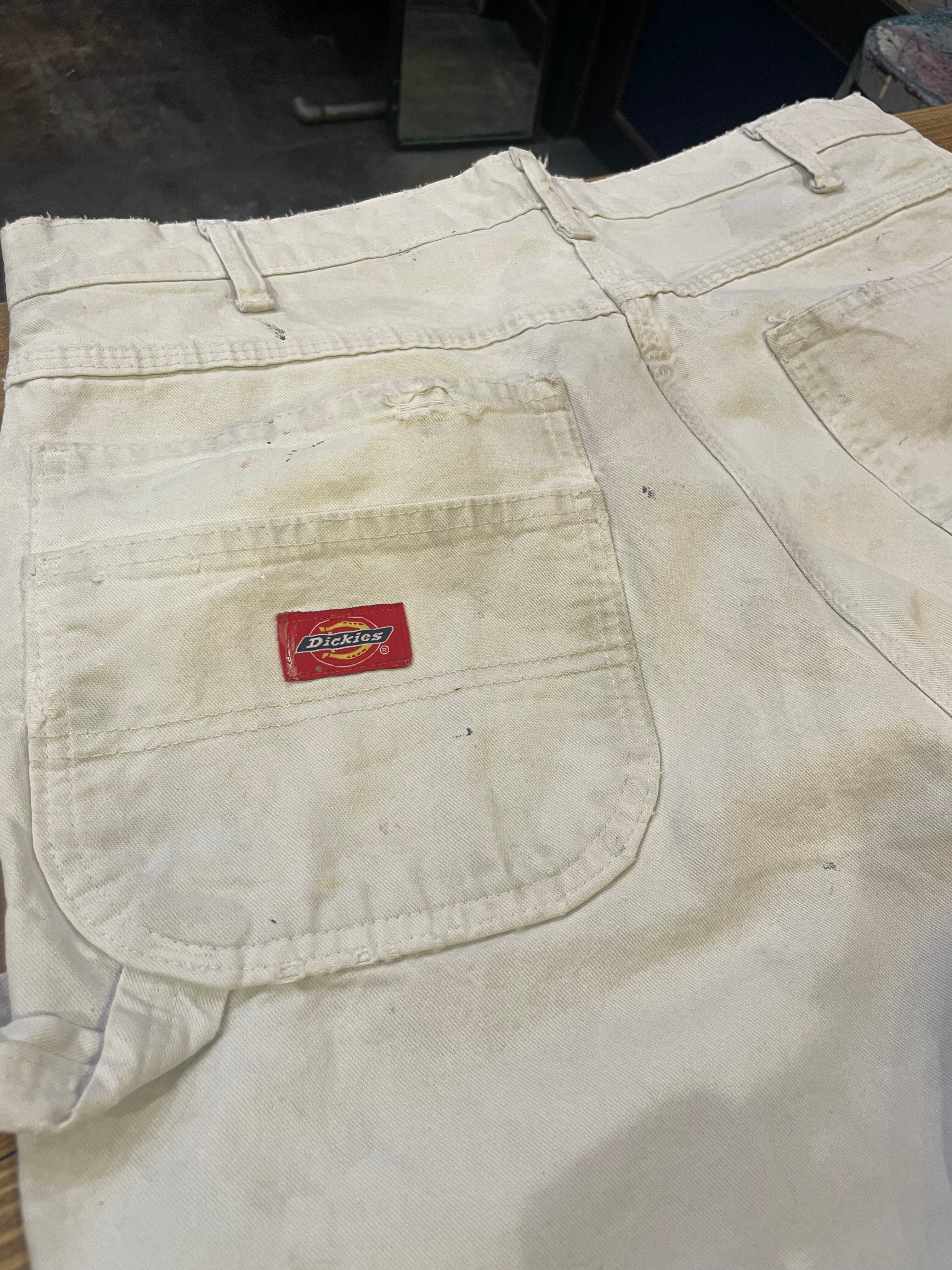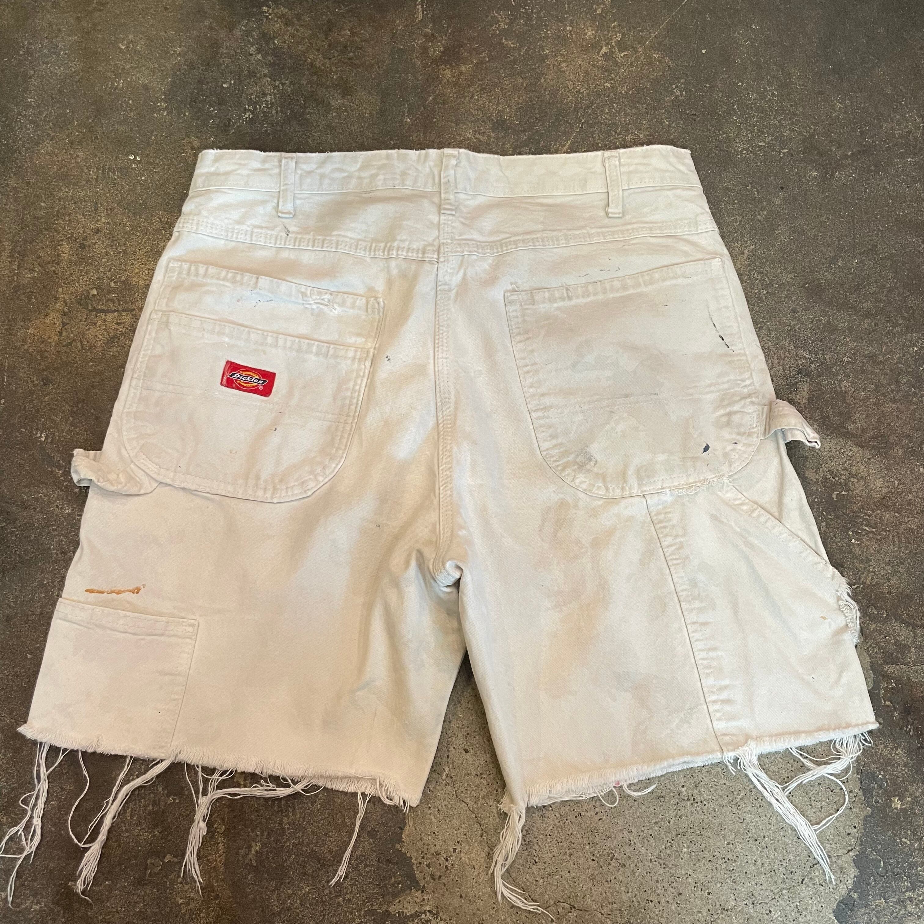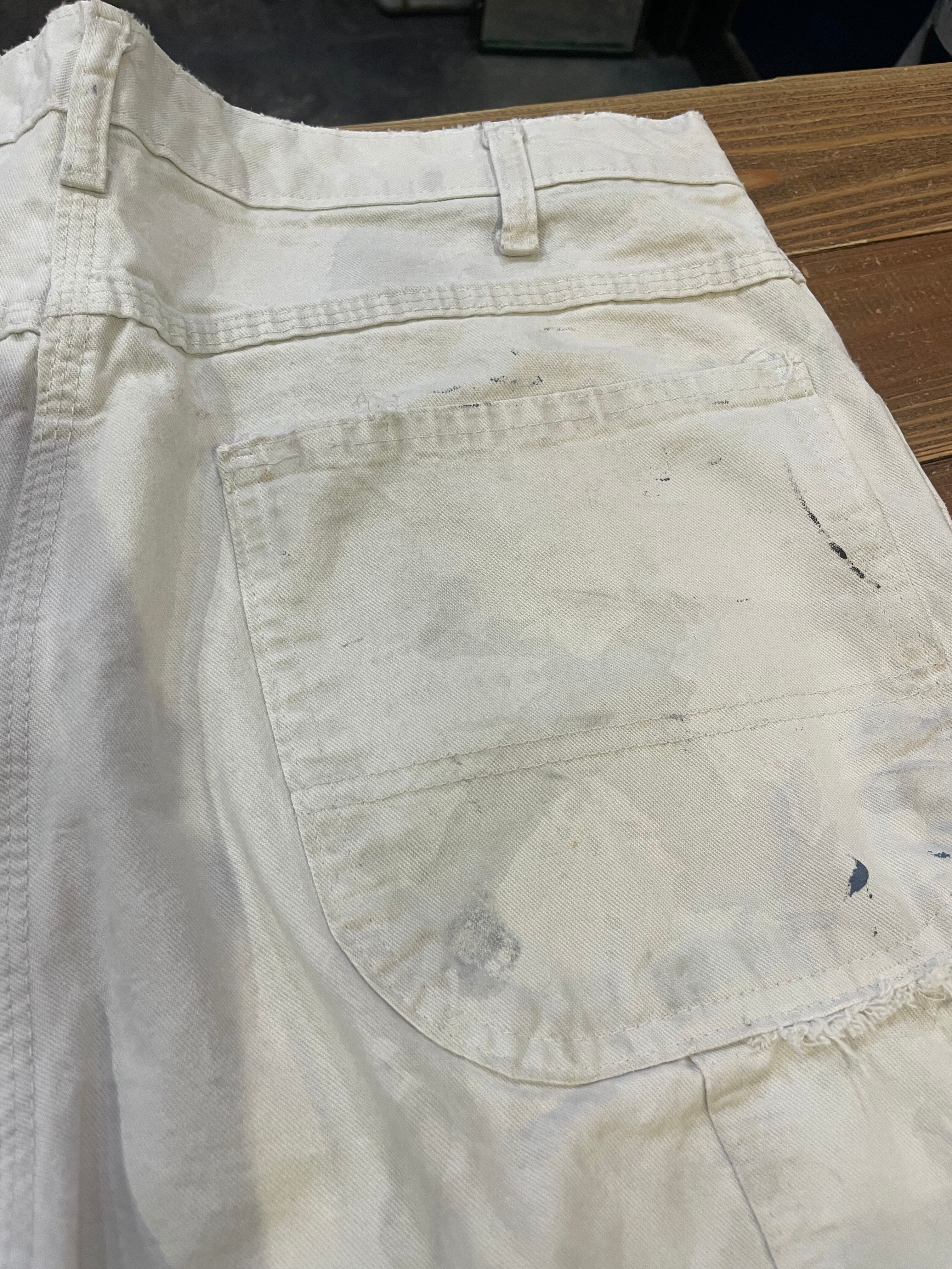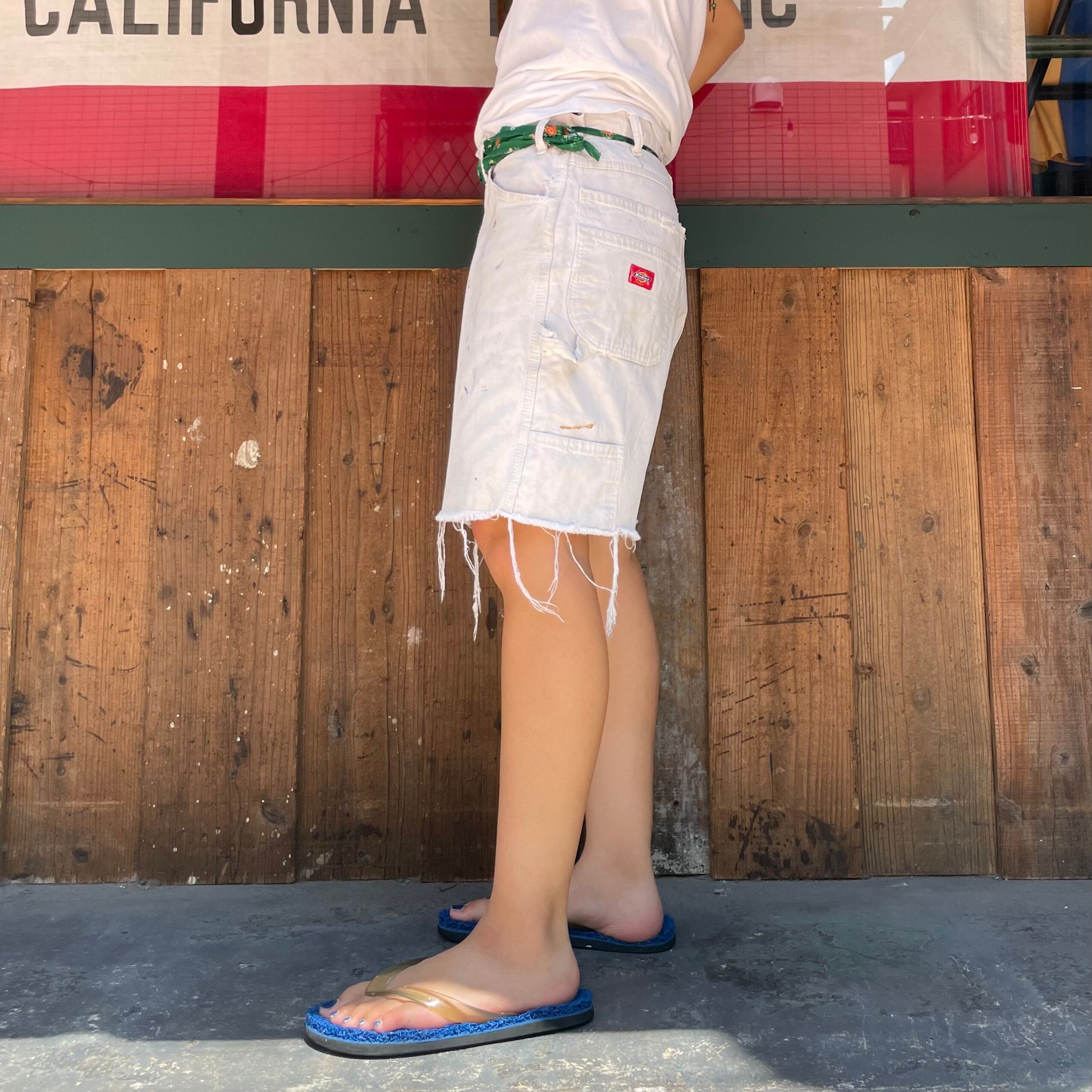 Dickiesの白のペインターパンツをカットオフされているハーフパンツです。