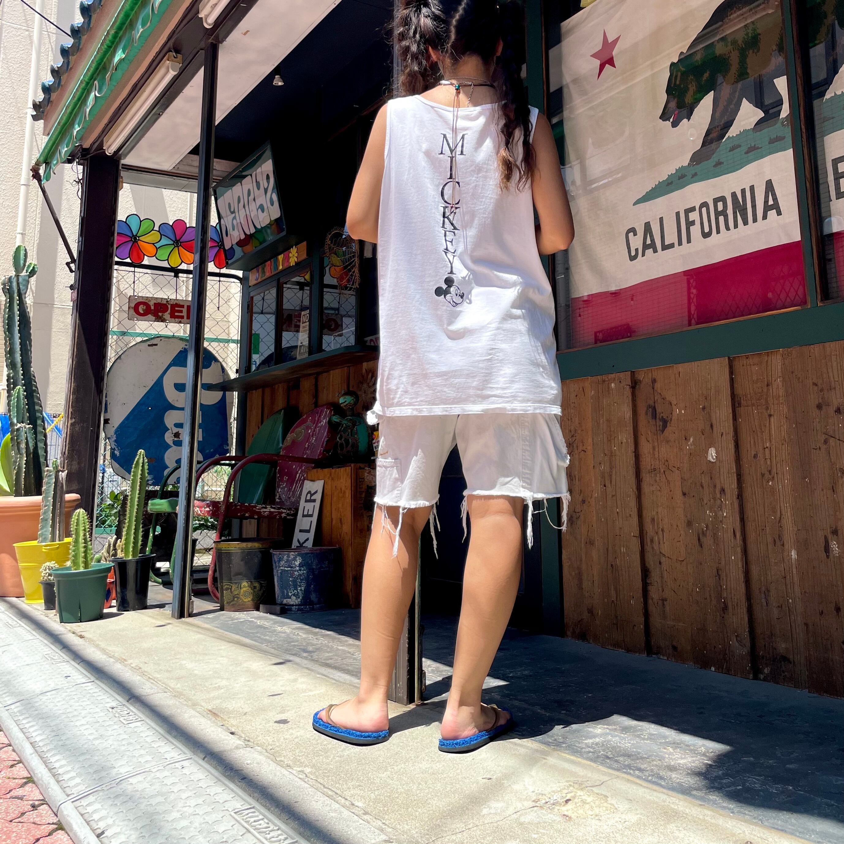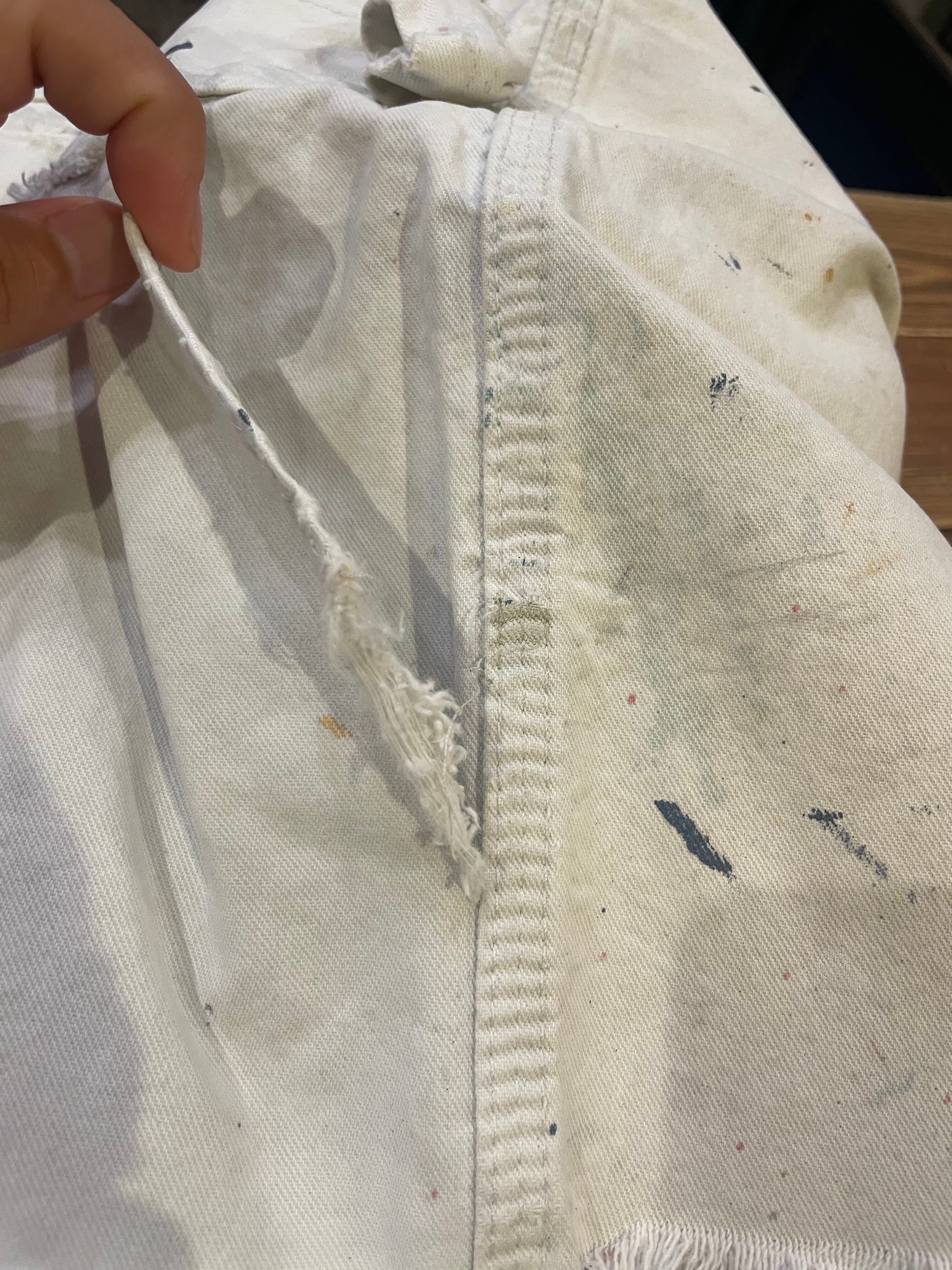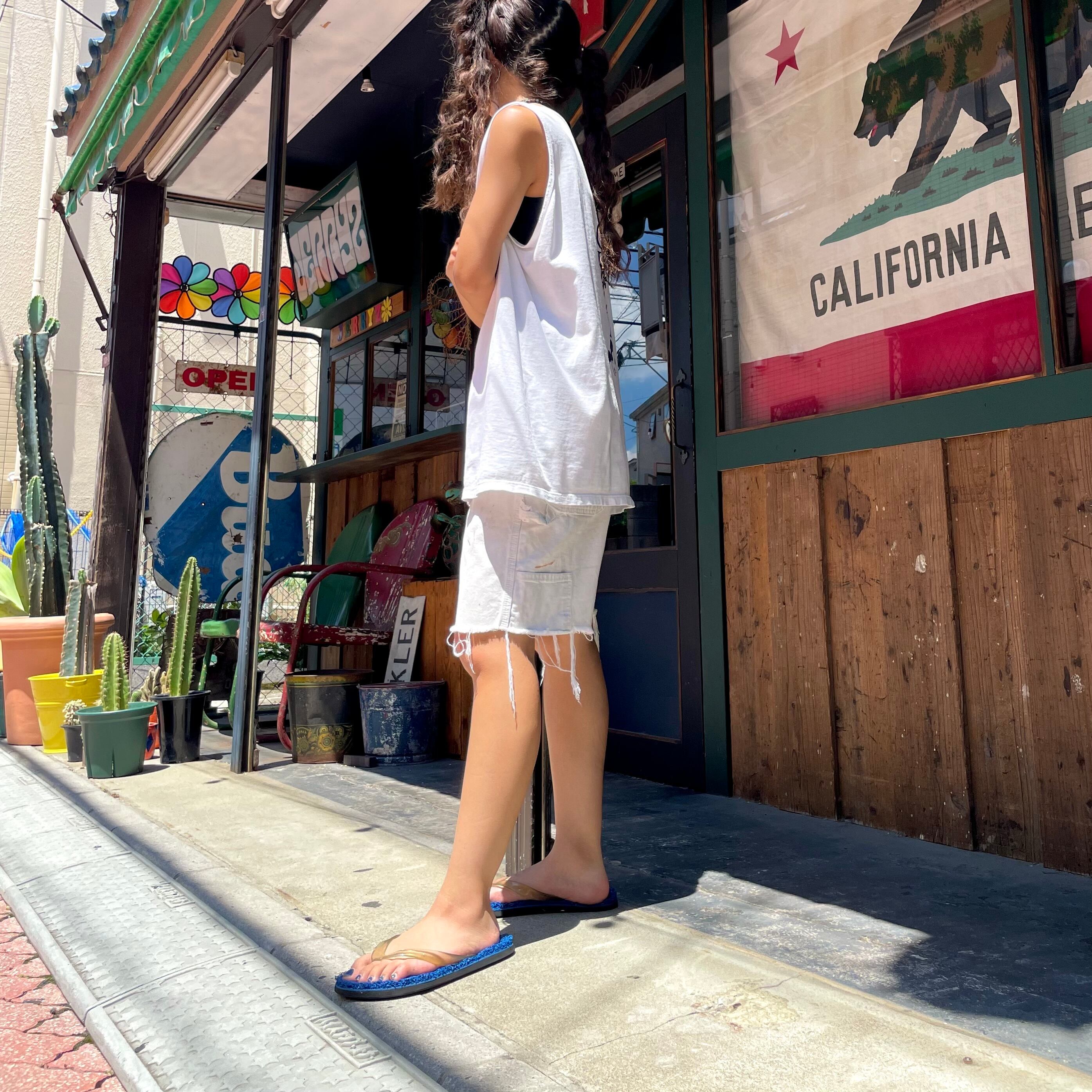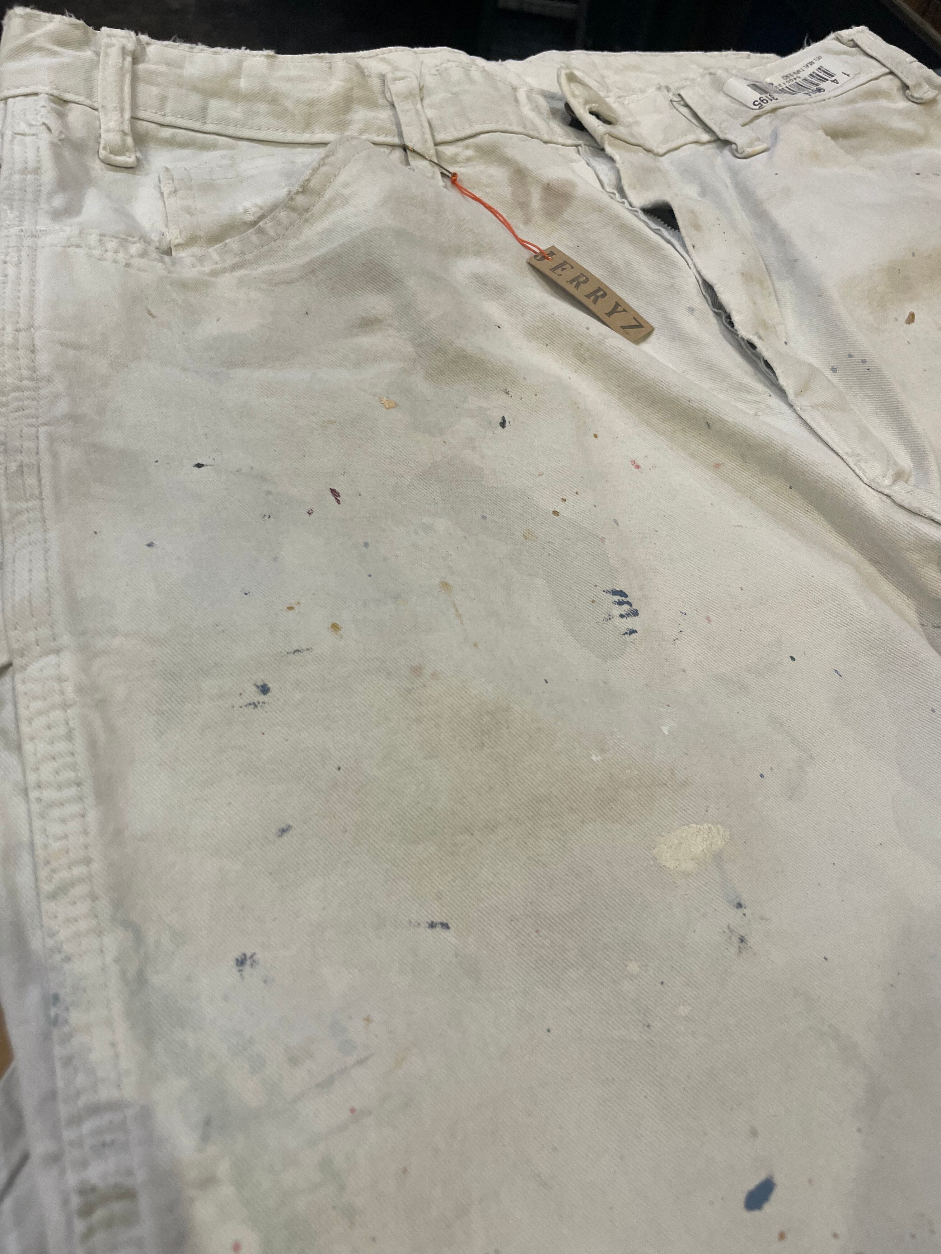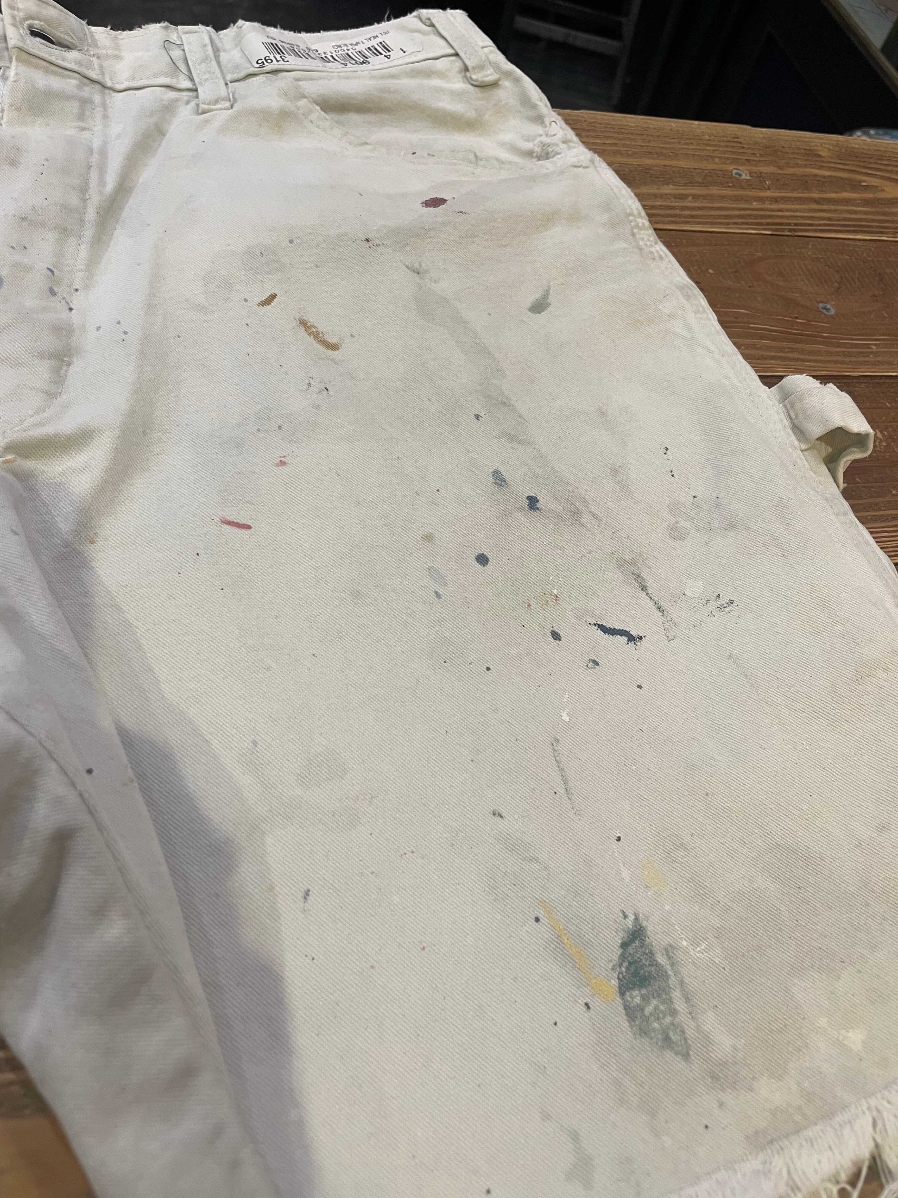 Dickiesの白のペインターパンツをカットオフされているハーフパンツです。