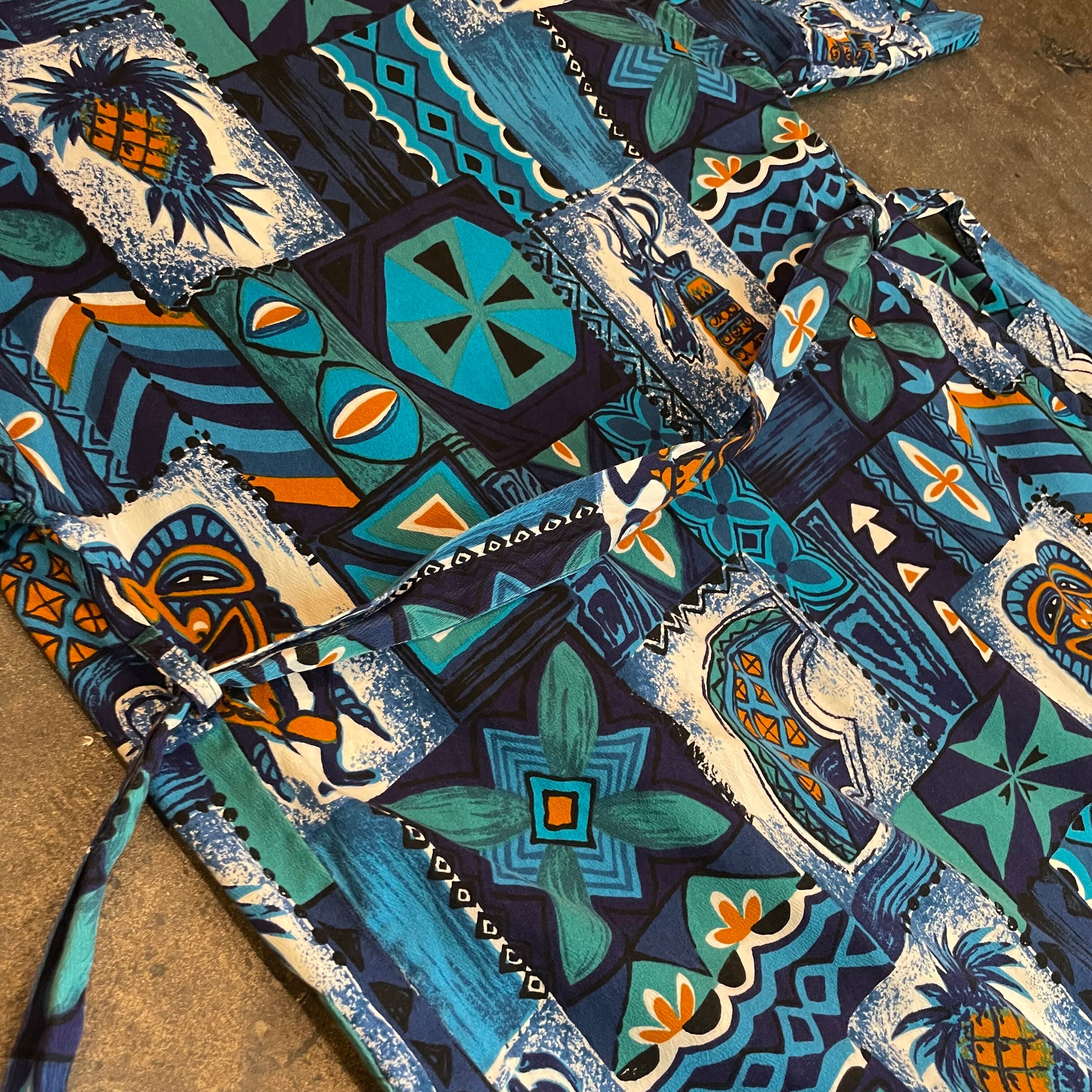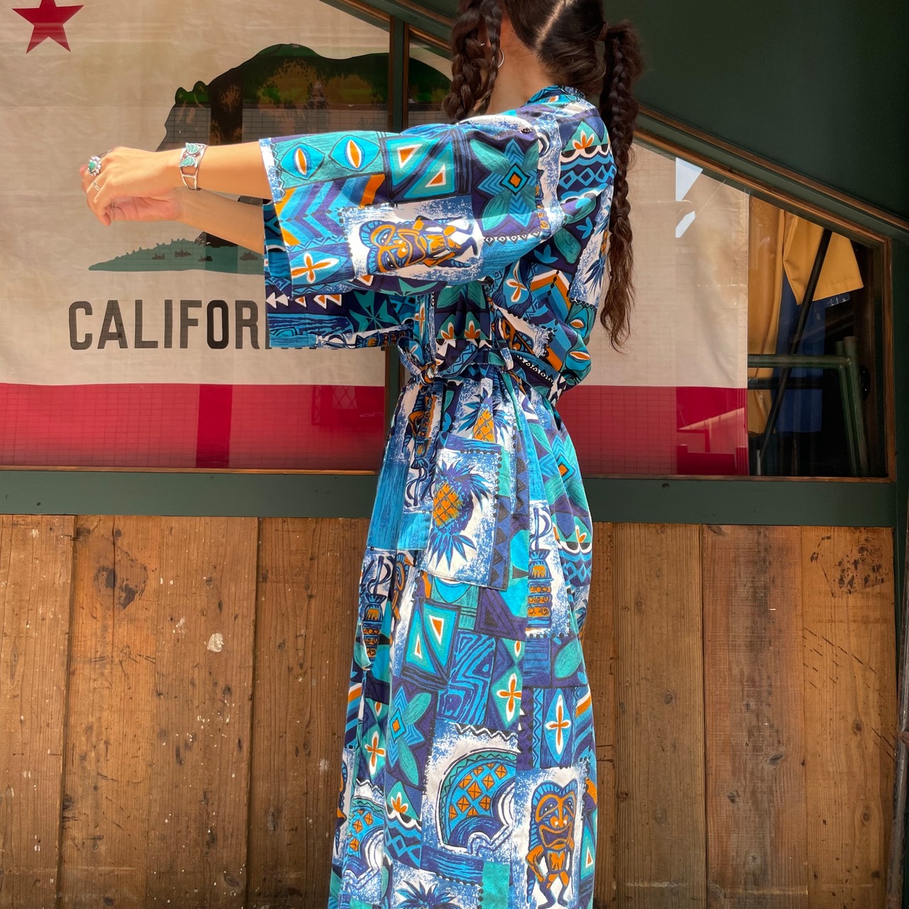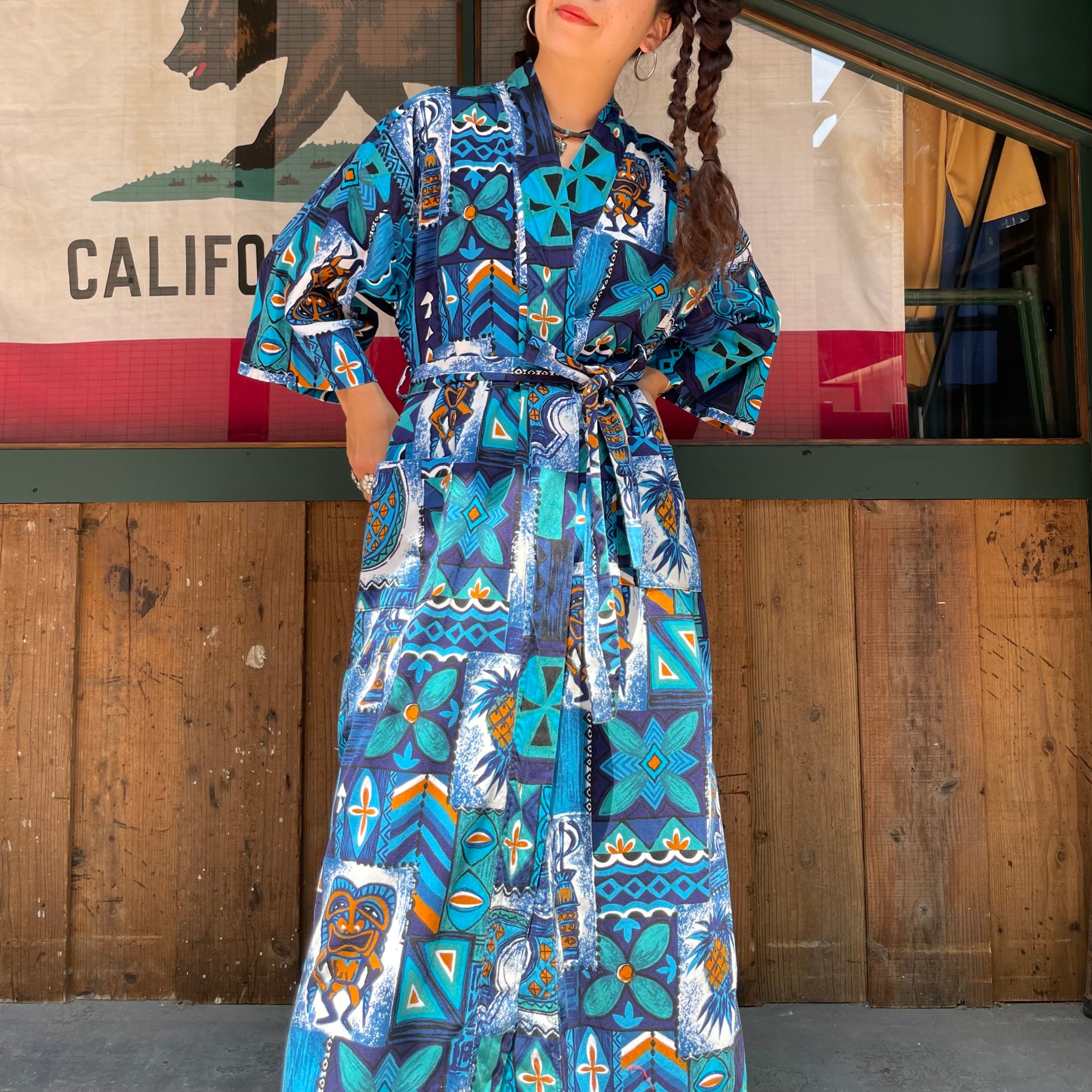 青ベースでt tikiな柄がとても素敵なロングガウンです。パイナップルや植物、神様っぽいモチーフが夏らしくて楽しい一着です。