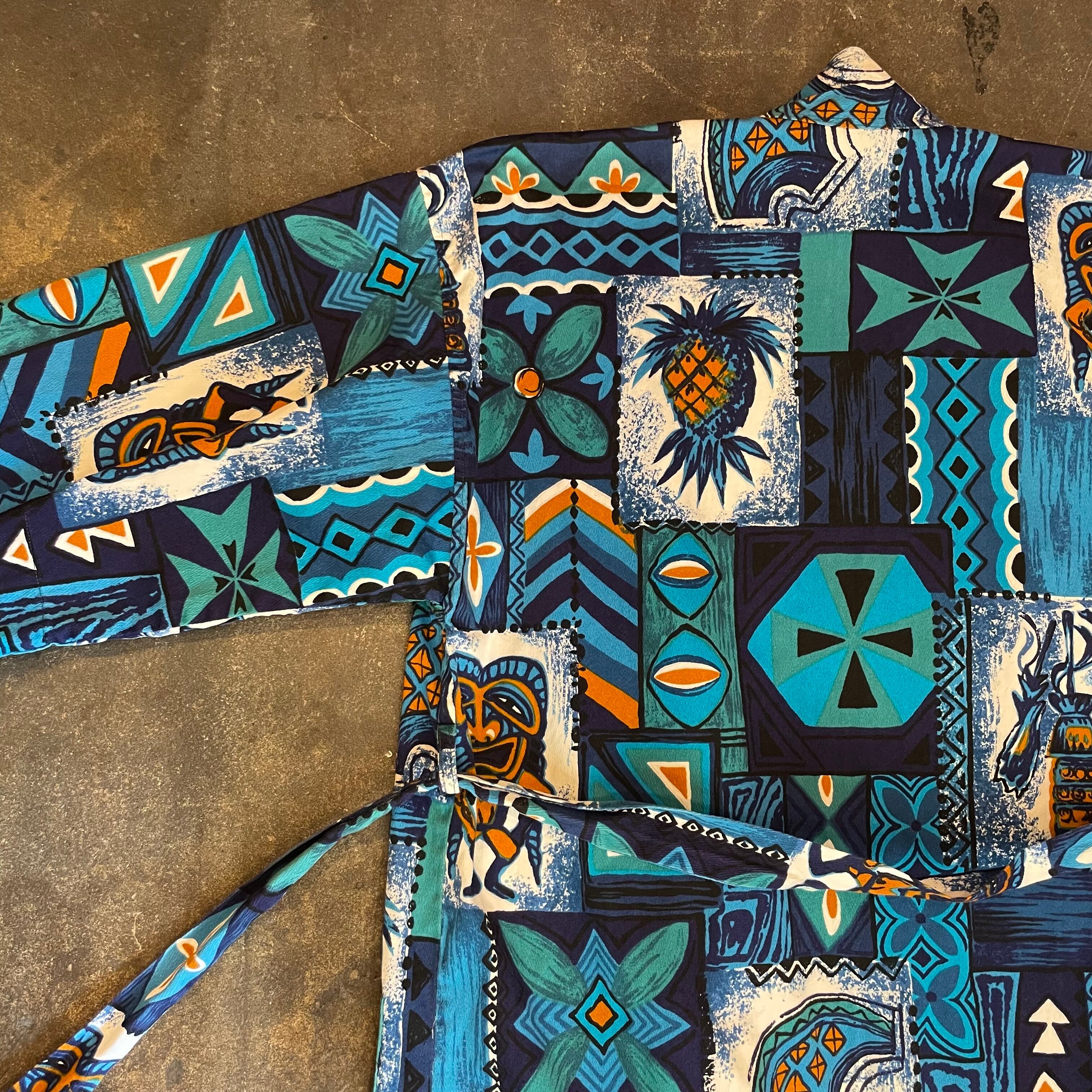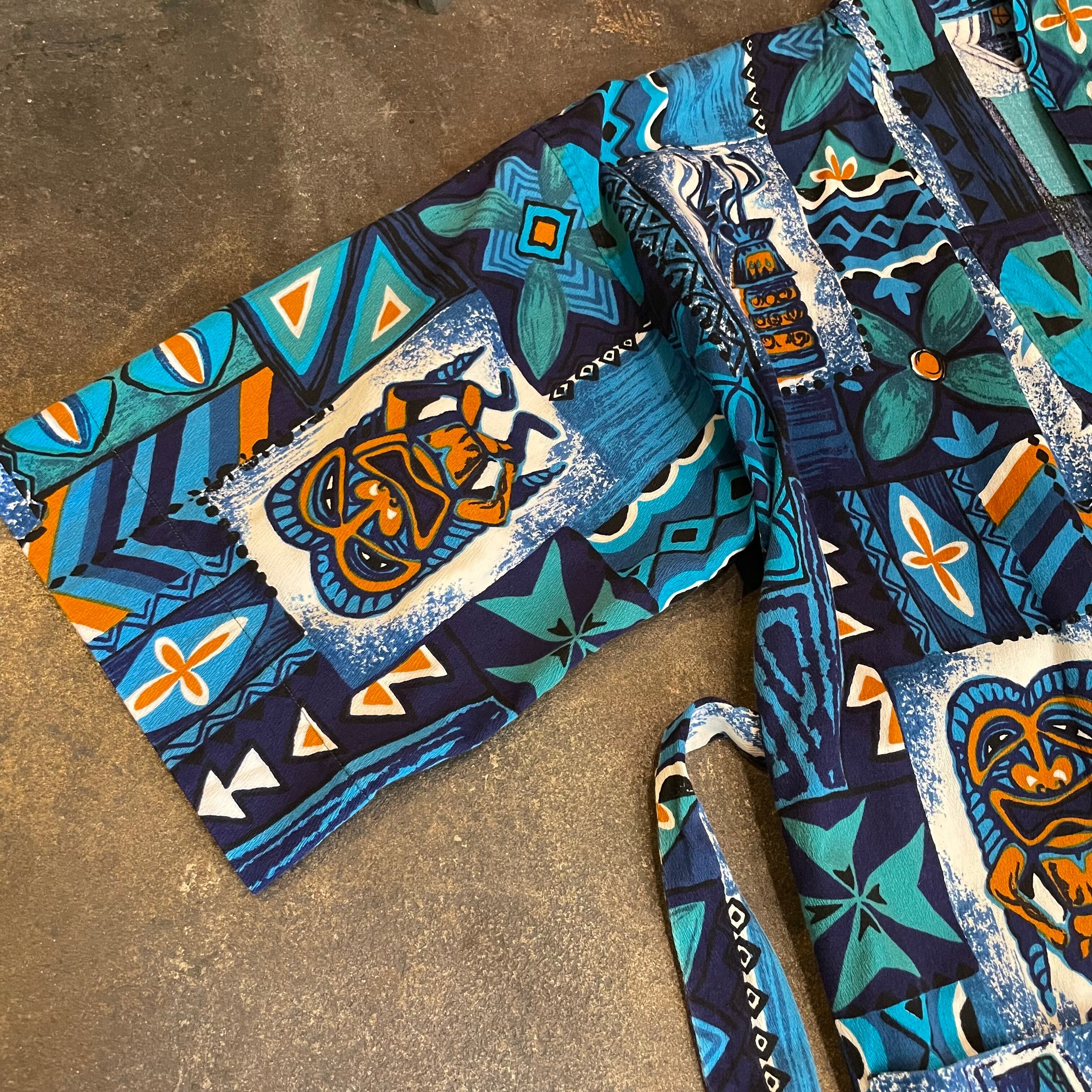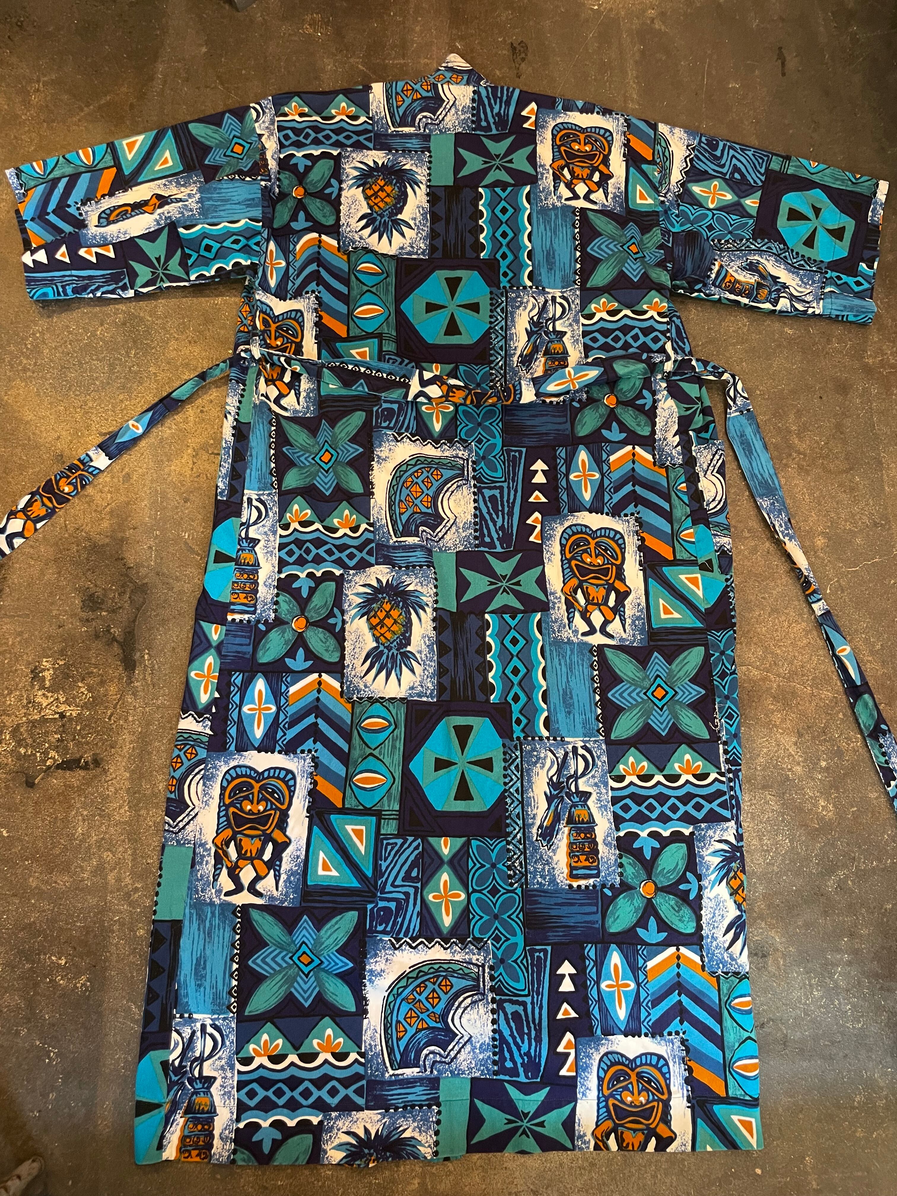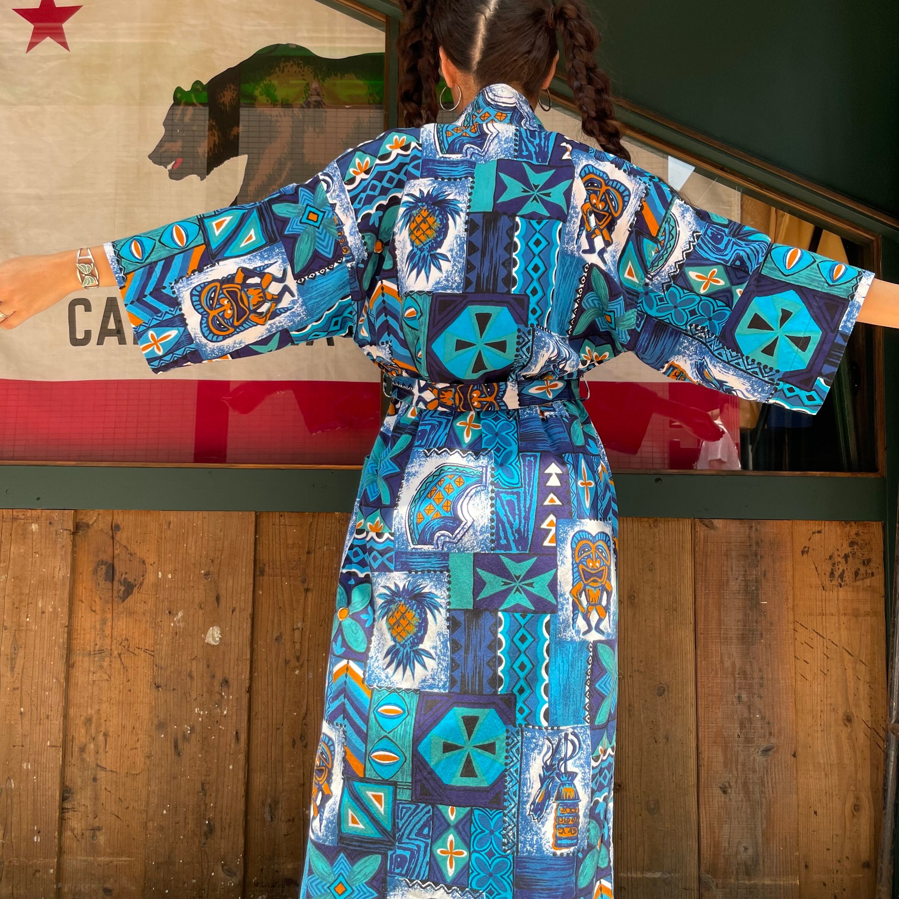 青ベースでt tikiな柄がとても素敵なロングガウンです。パイナップルや植物、神様っぽいモチーフが夏らしくて楽しい一着です。