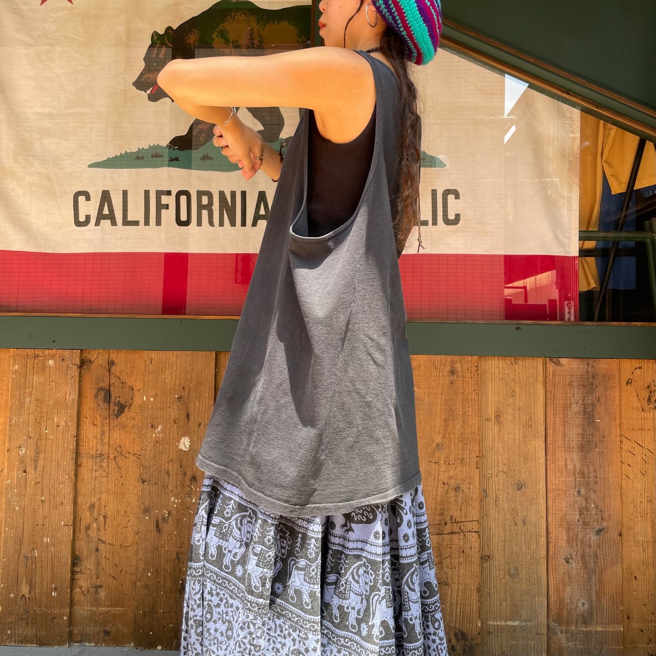 黒のフェードした雰囲気がとても良い感じですし、ゆったり大きいサイズ感が楽ちんで合わせやすくておすすめです。