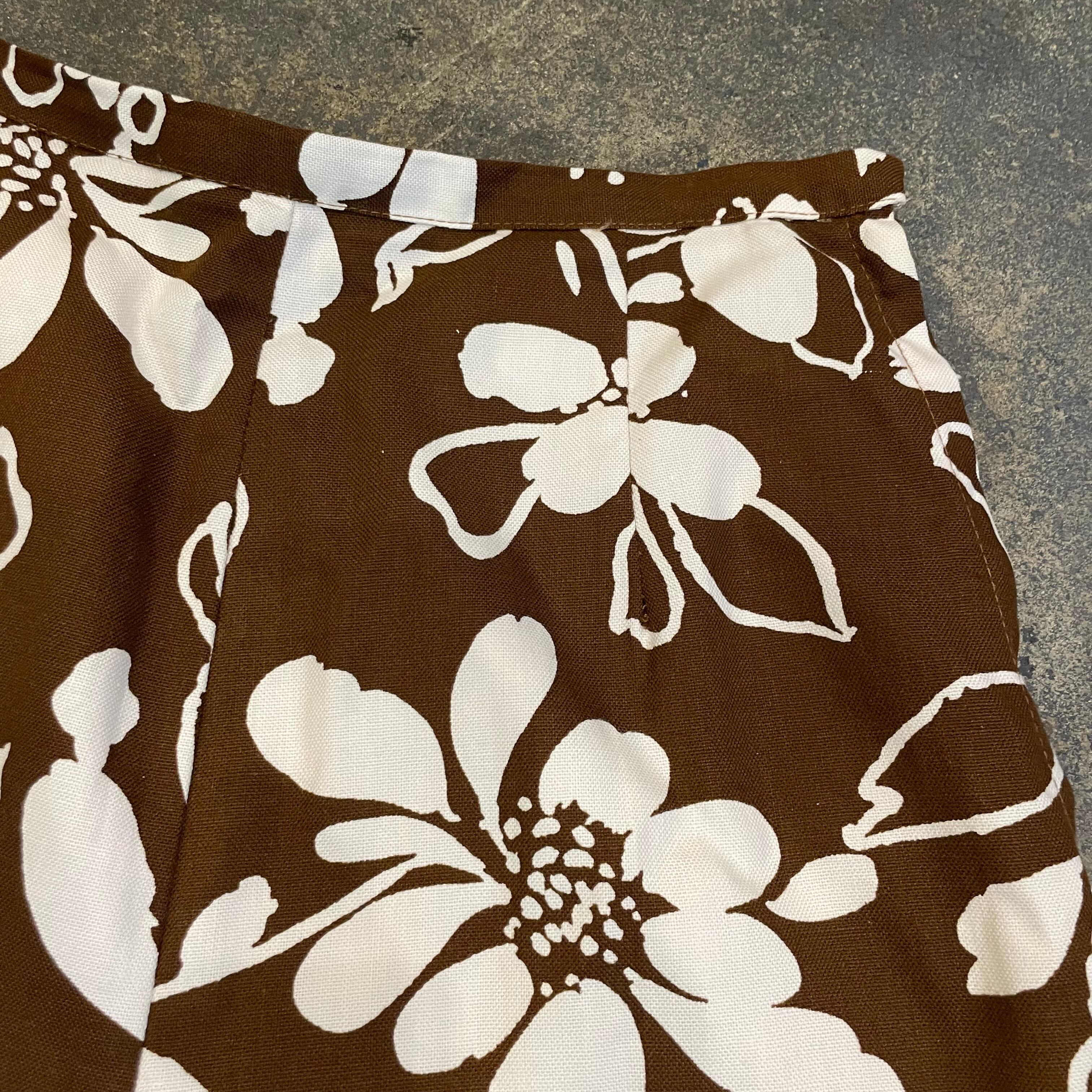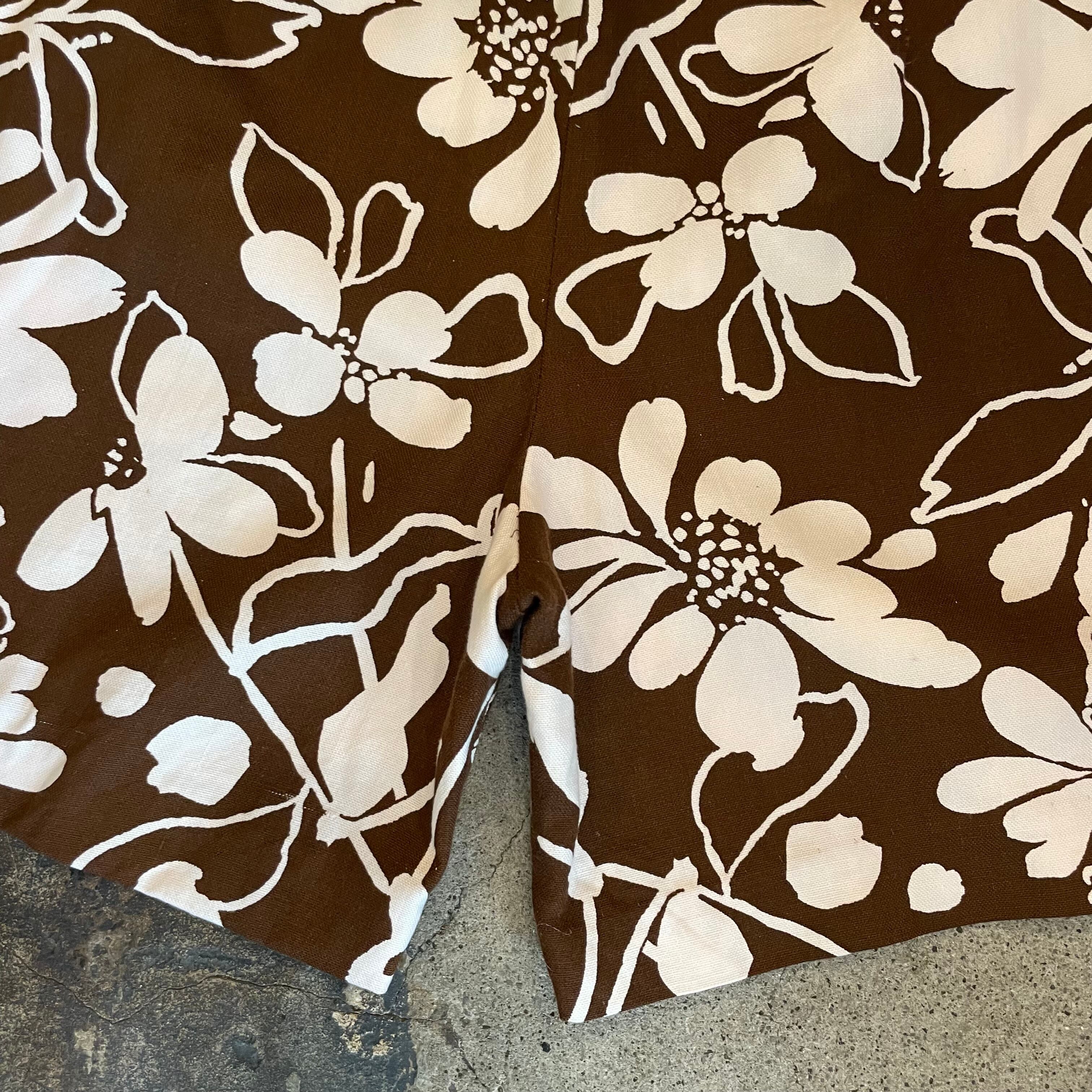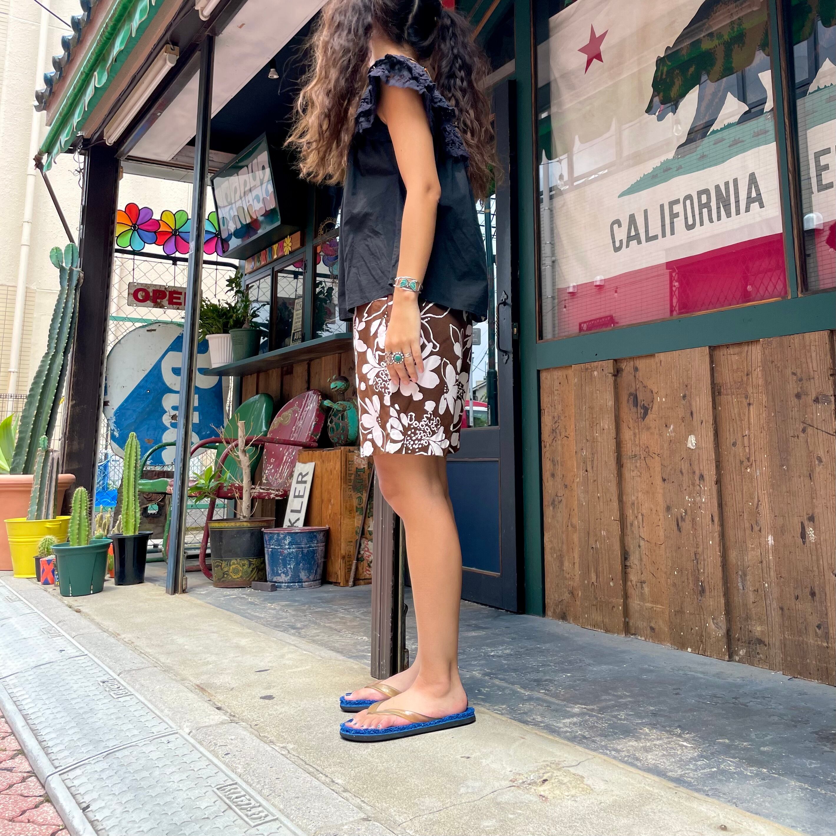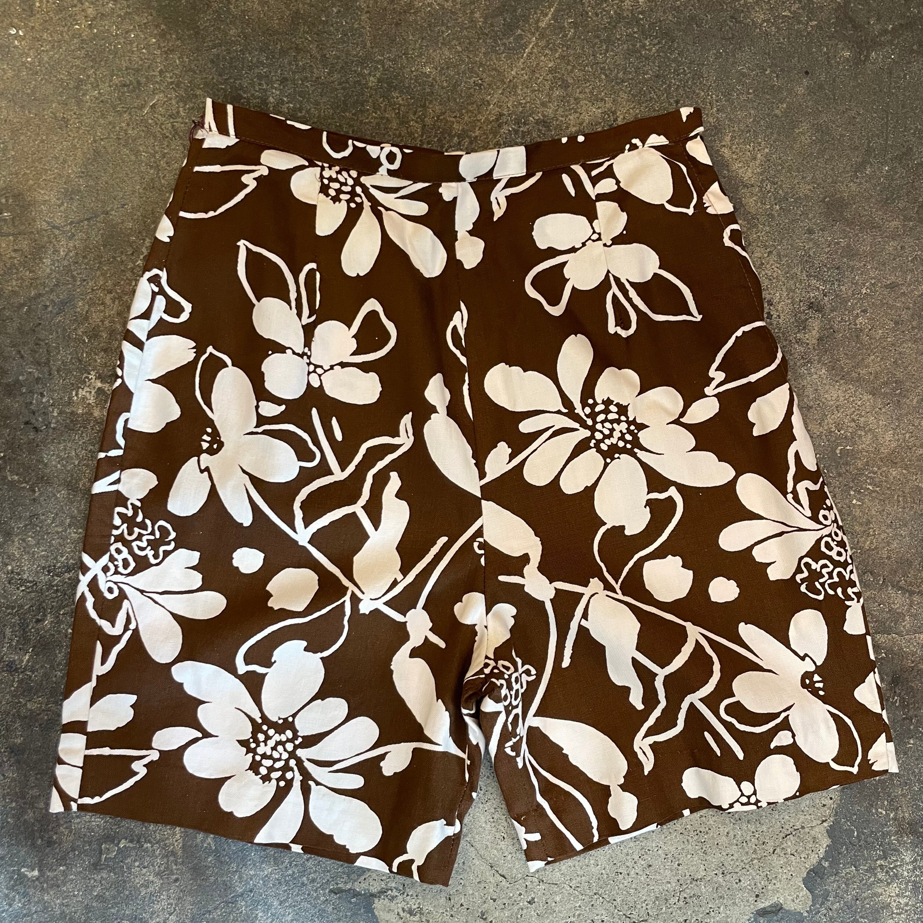 茶色ベースに白の花柄でロコな雰囲気が夏らしくてかわいい60〜70年代頃のハーフパンツです。