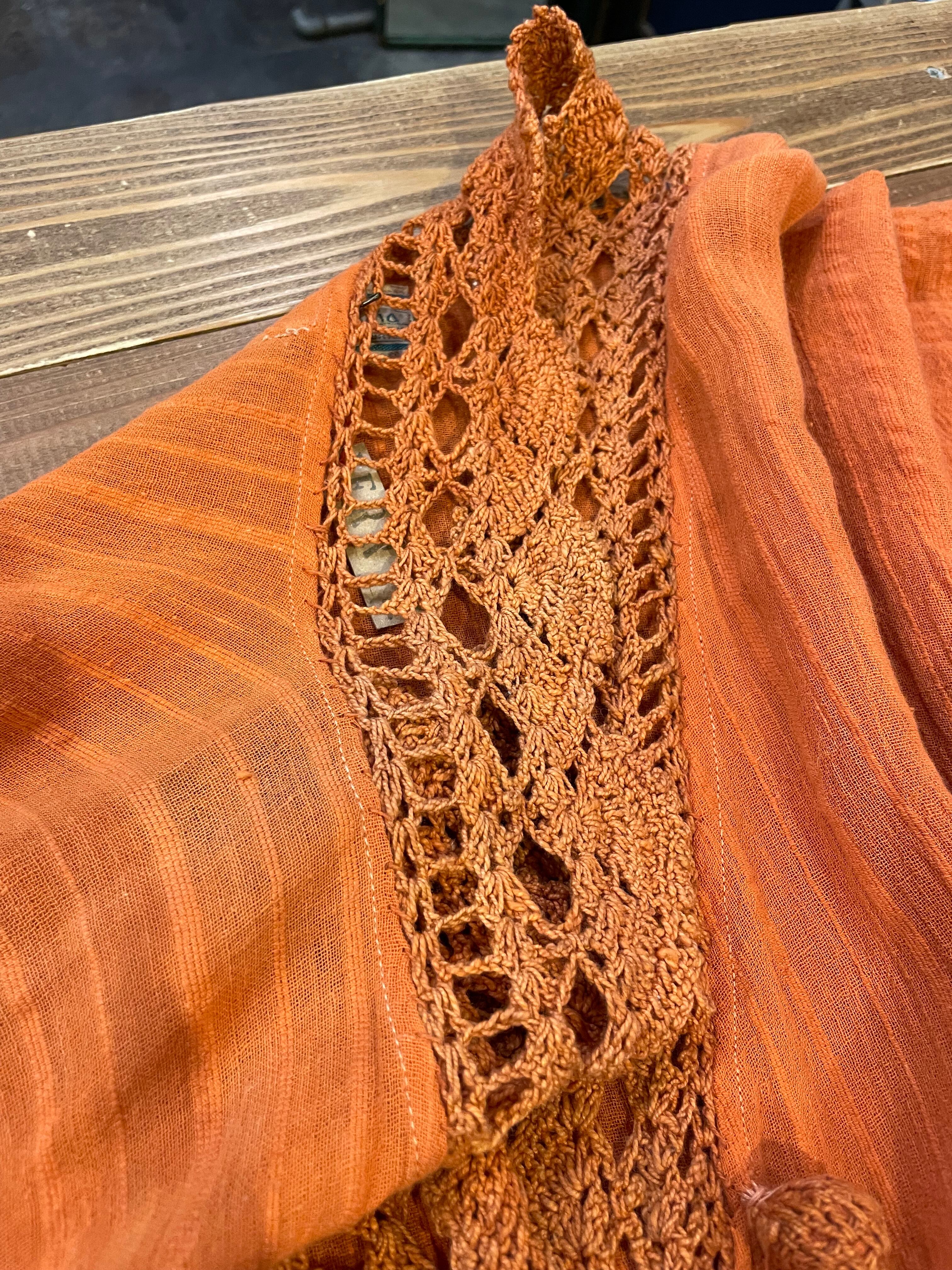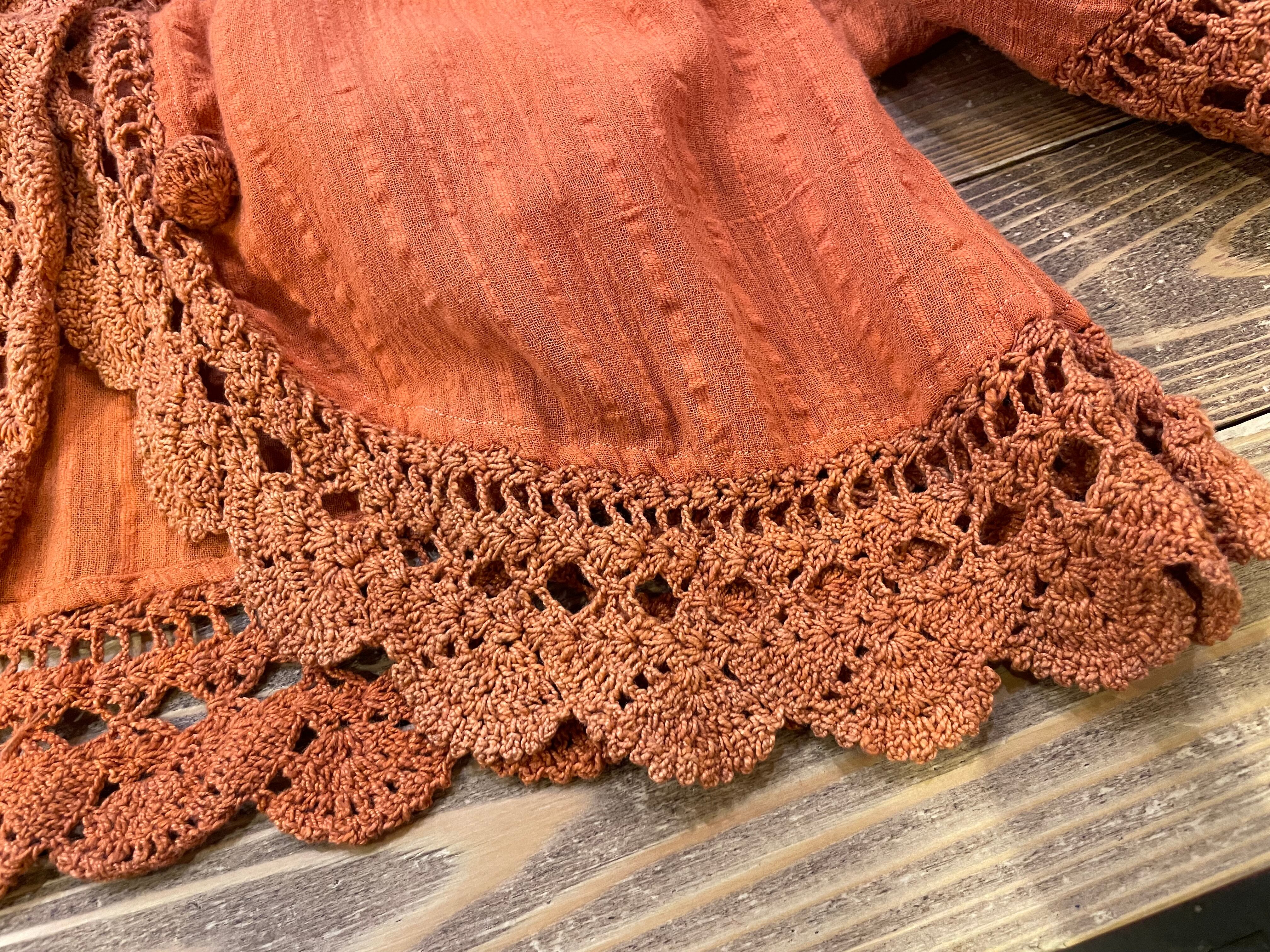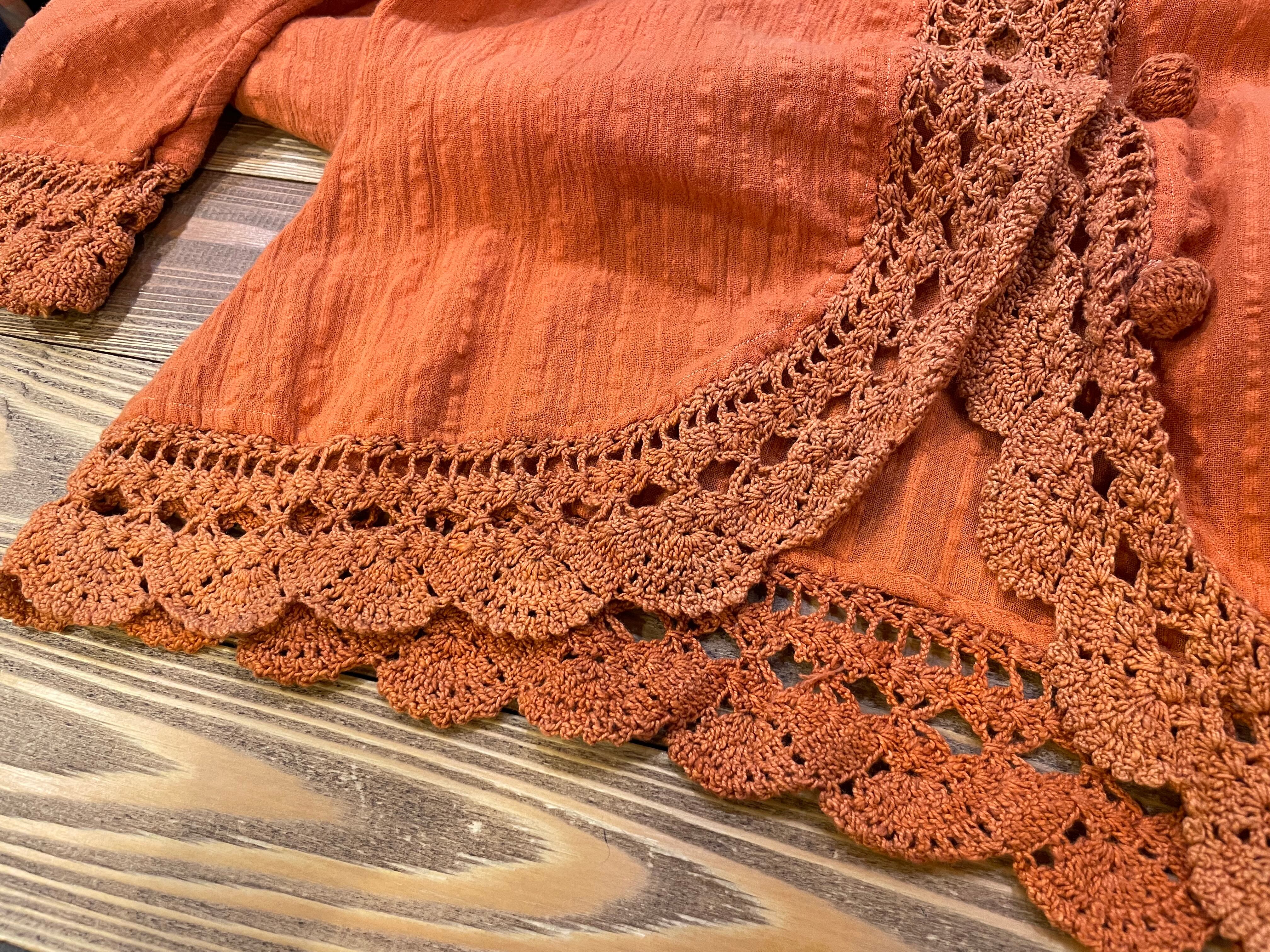 七部丈のフレアスリーブ、手編みのコットンレース、生地の部分のざらっと気持ち良い肌触りですし、とても素敵な一着です。夏の羽織りにとても使えると思います!