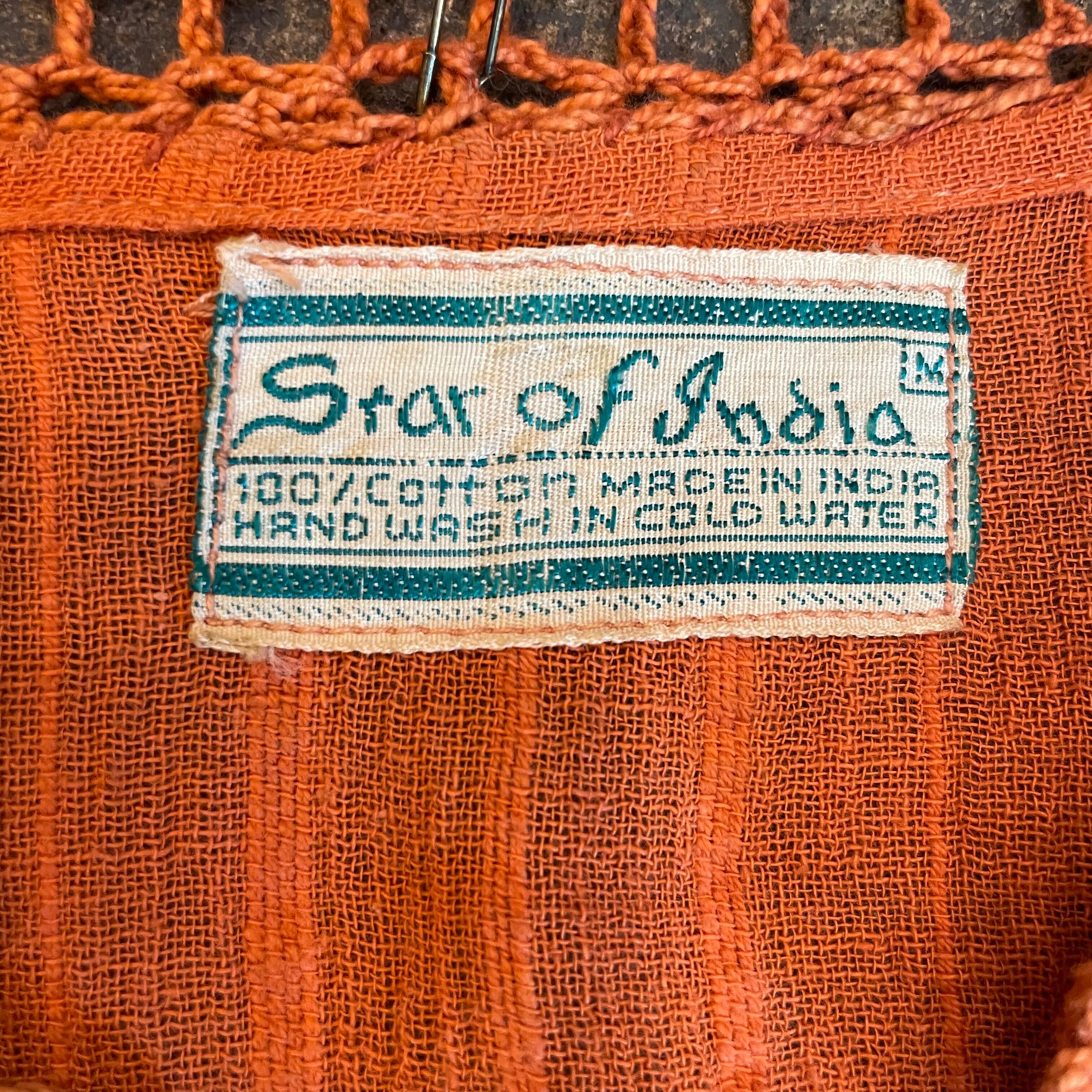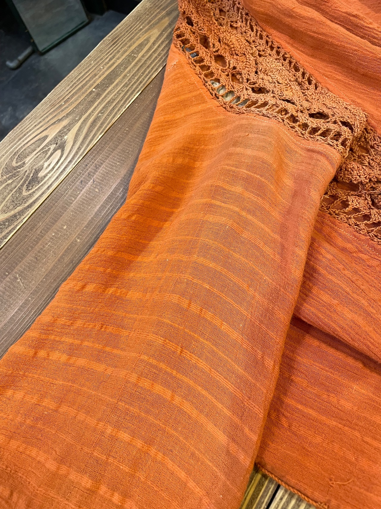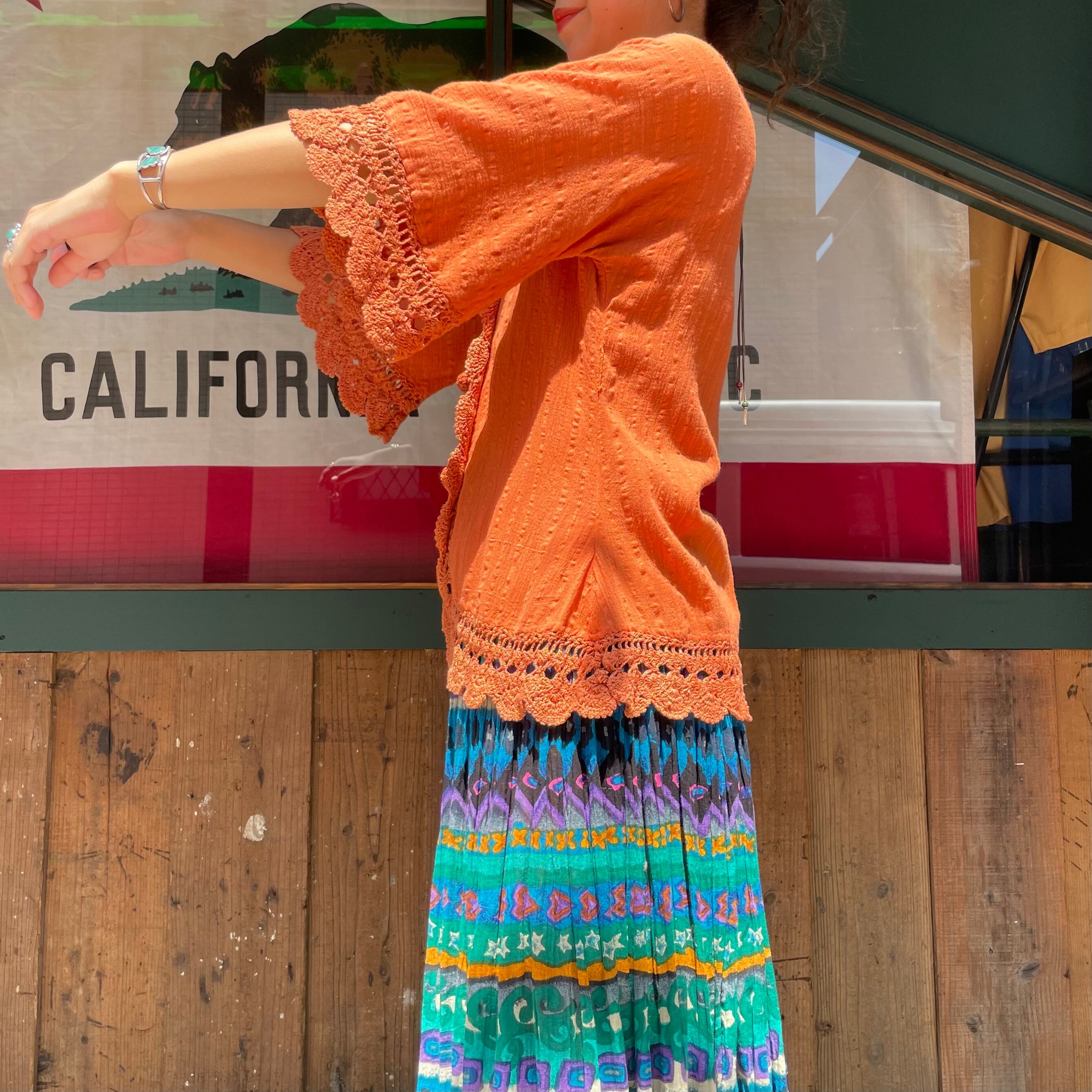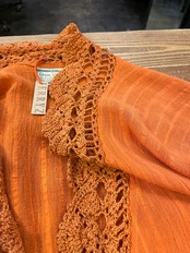 七部丈のフレアスリーブ、手編みのコットンレース、生地の部分のざらっと気持ち良い肌触りですし、とても素敵な一着です。夏の羽織りにとても使えると思います!