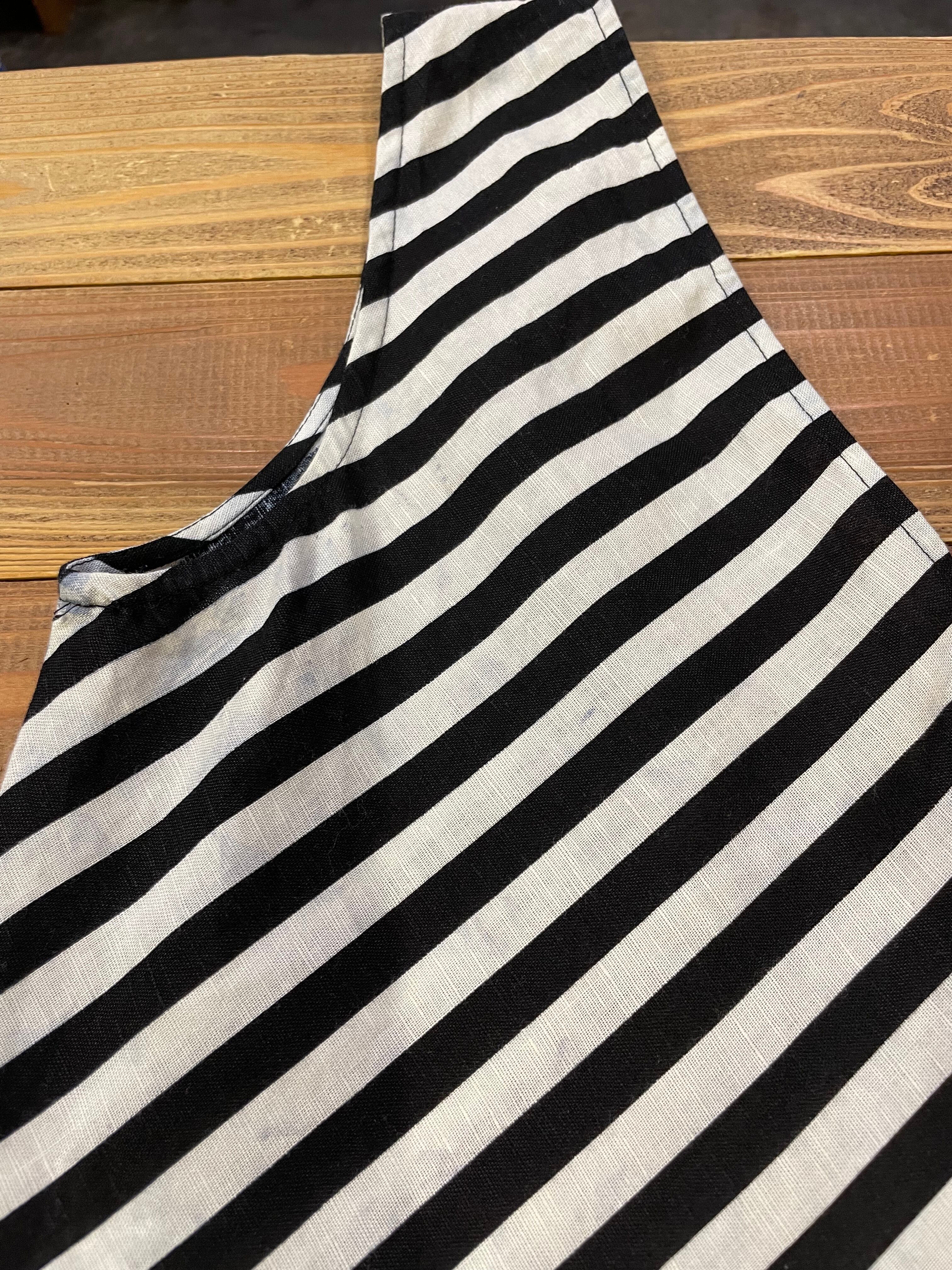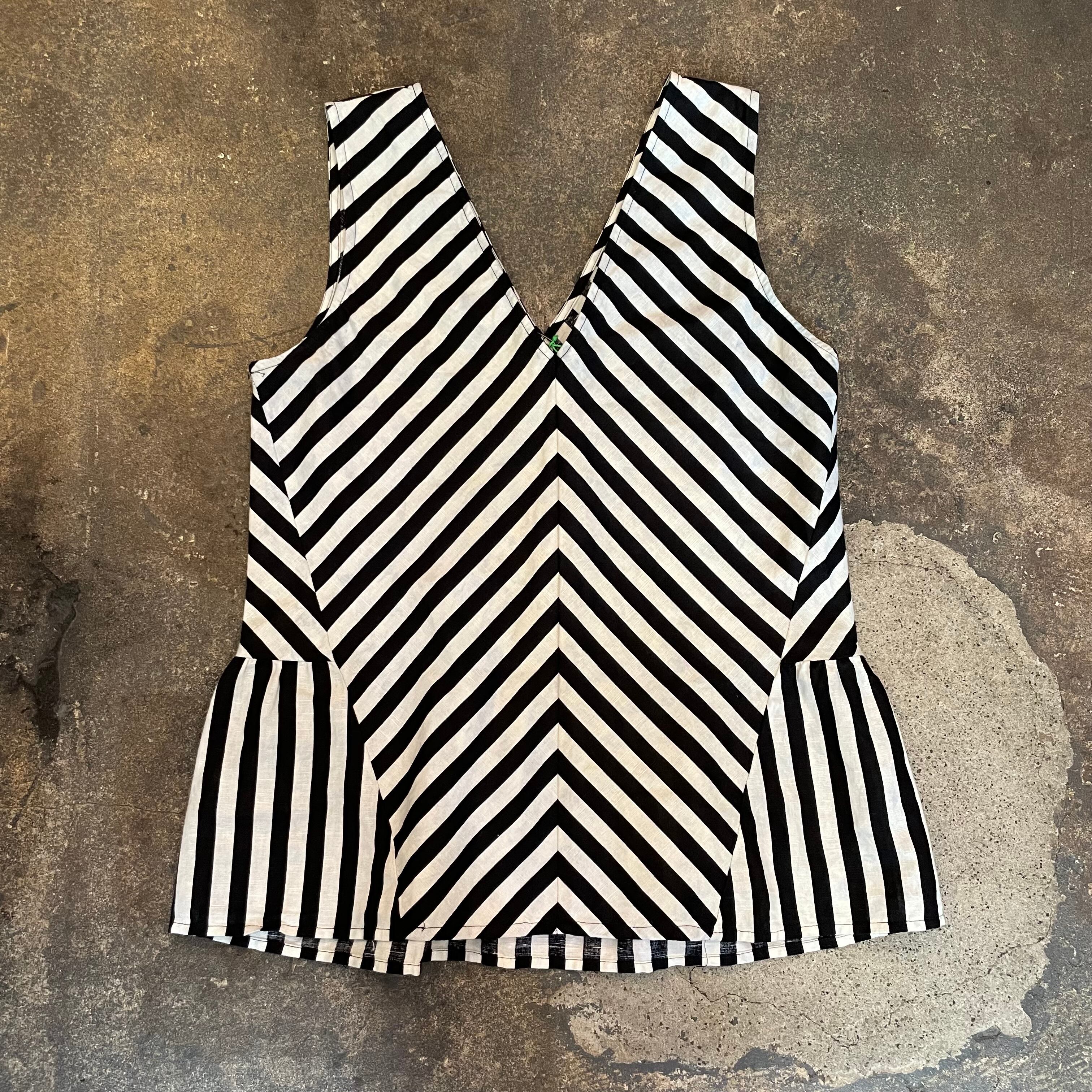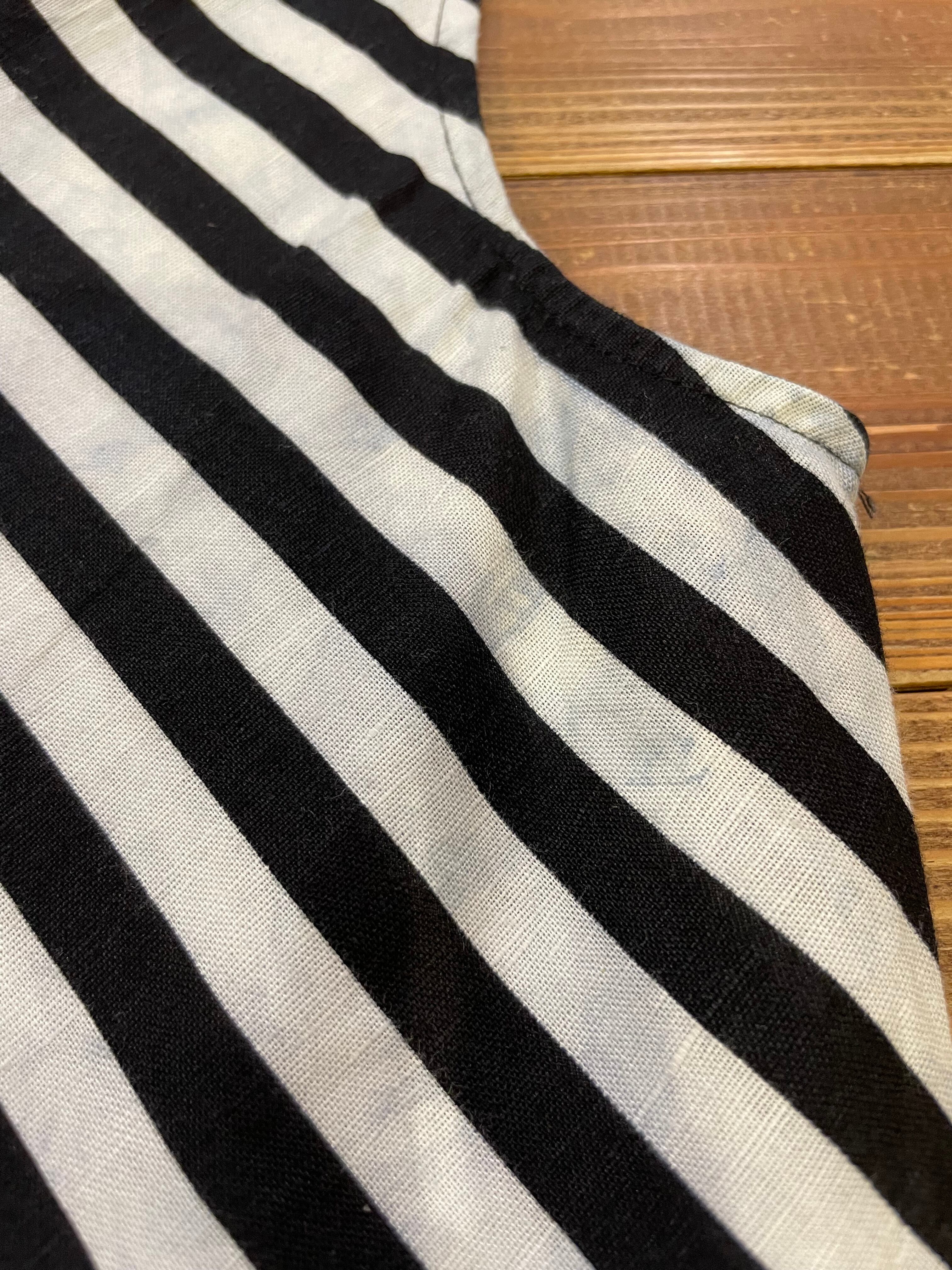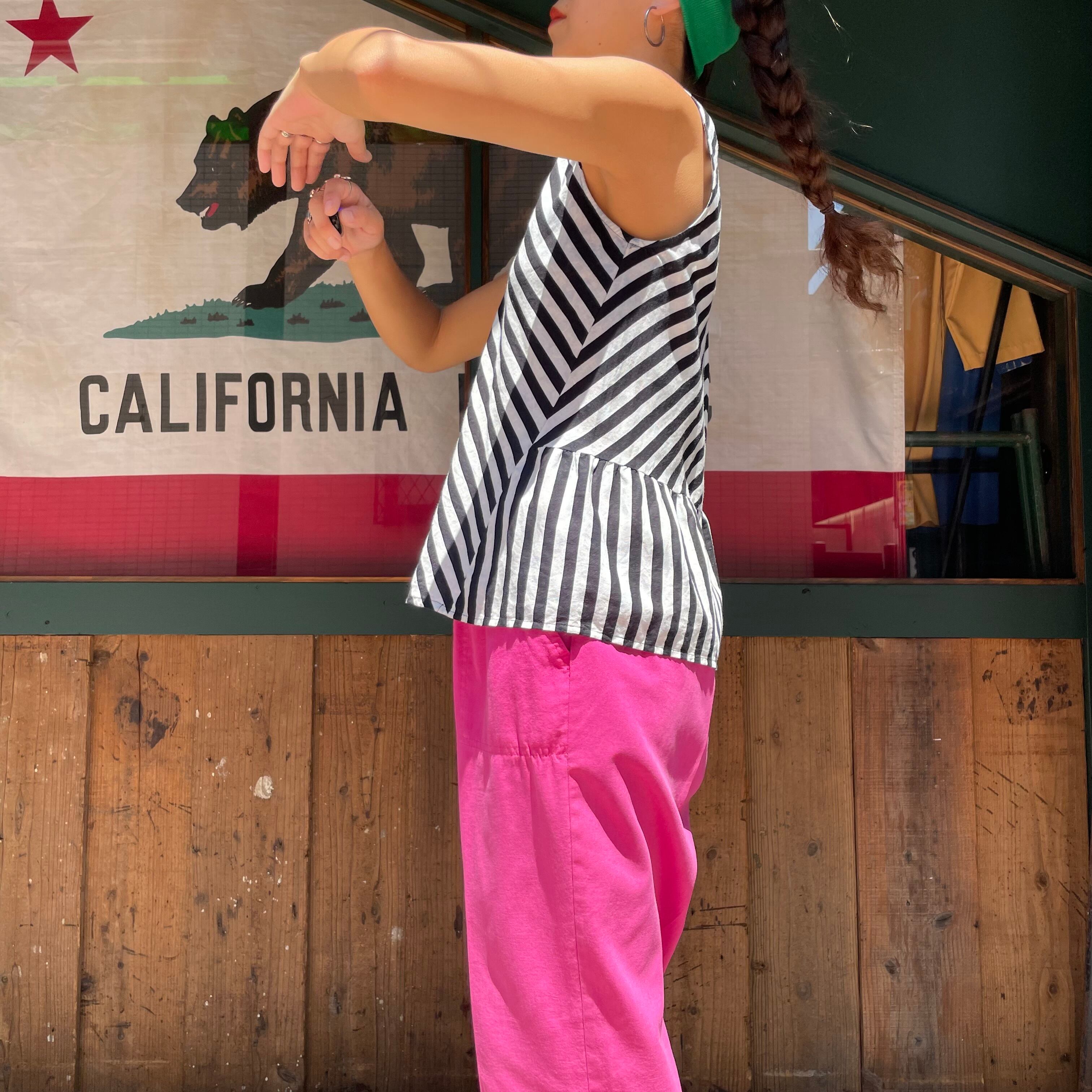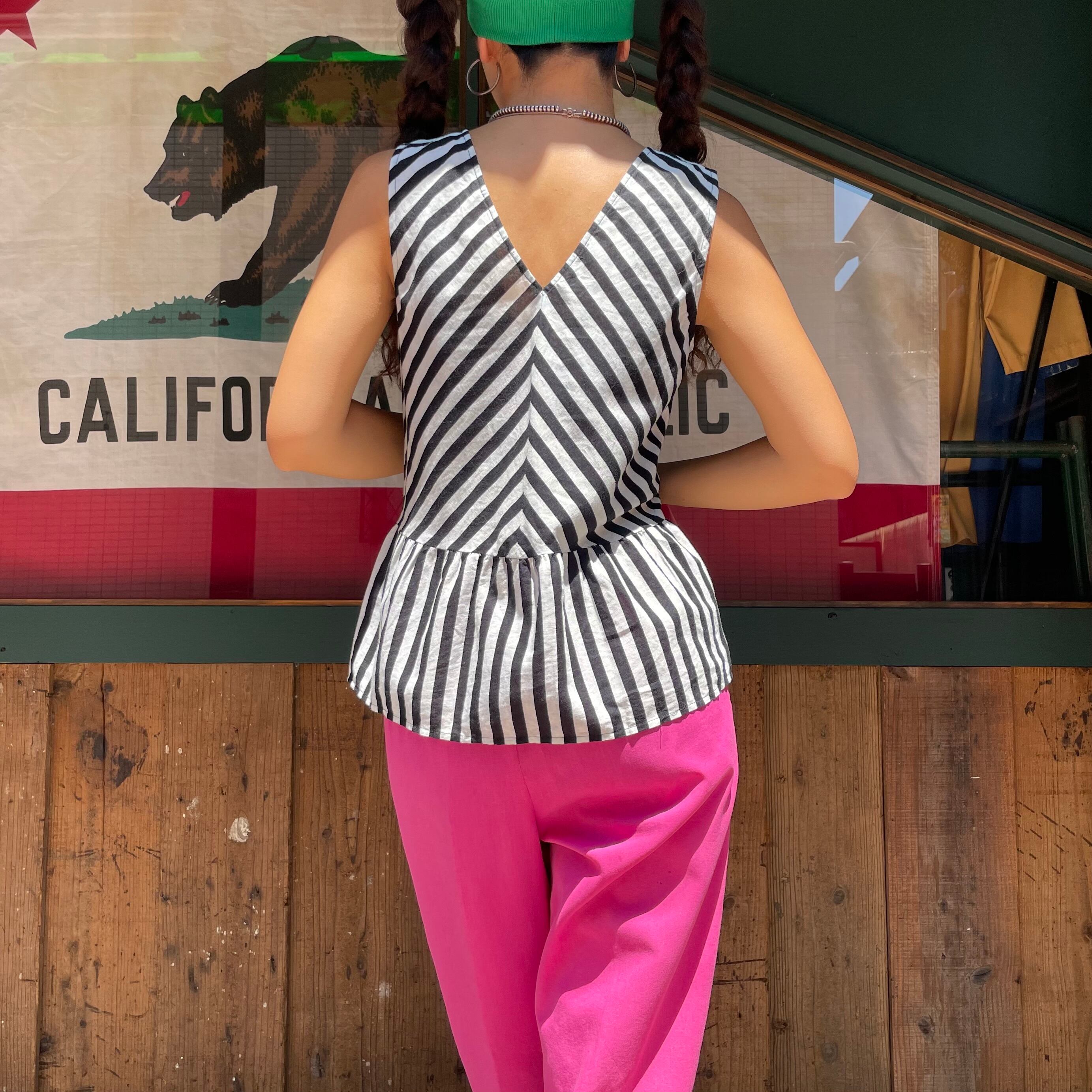 ストライプと切り替えでクレイジーなパターンになっていてかわいいノースリーブのトップスです。