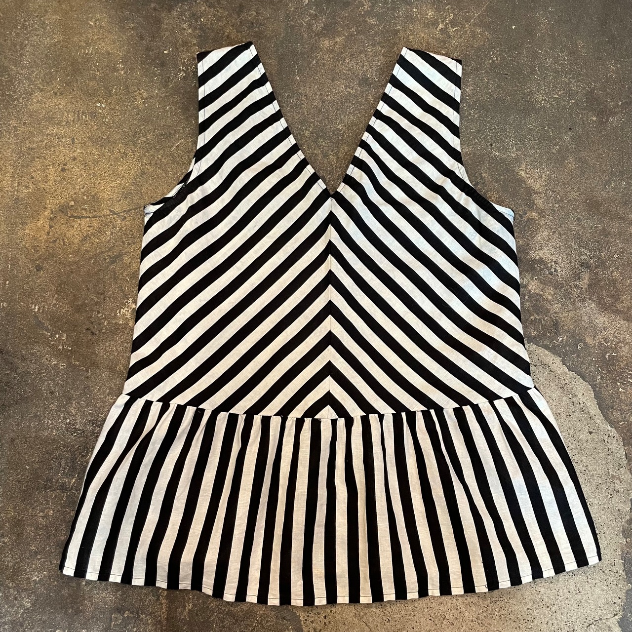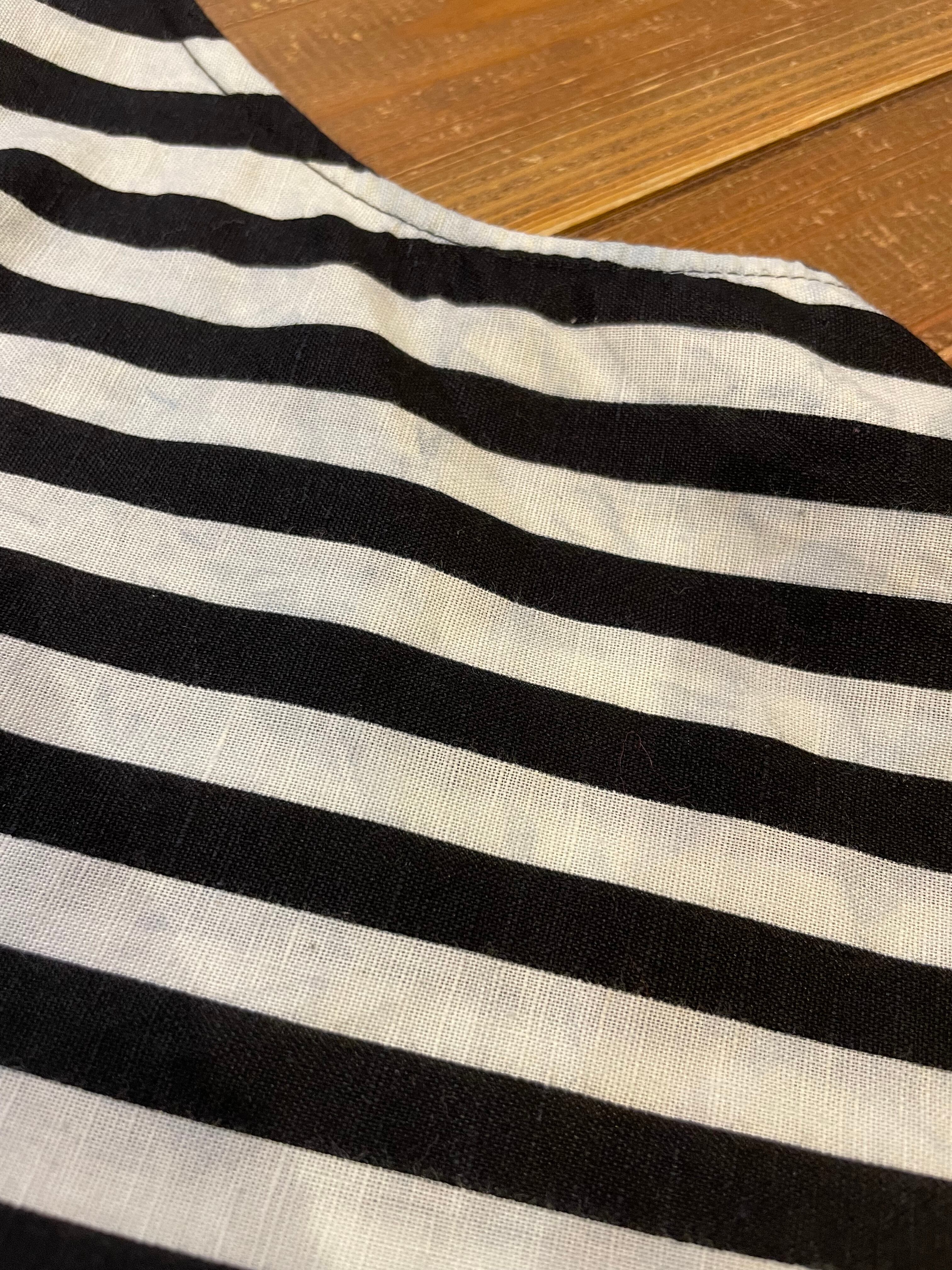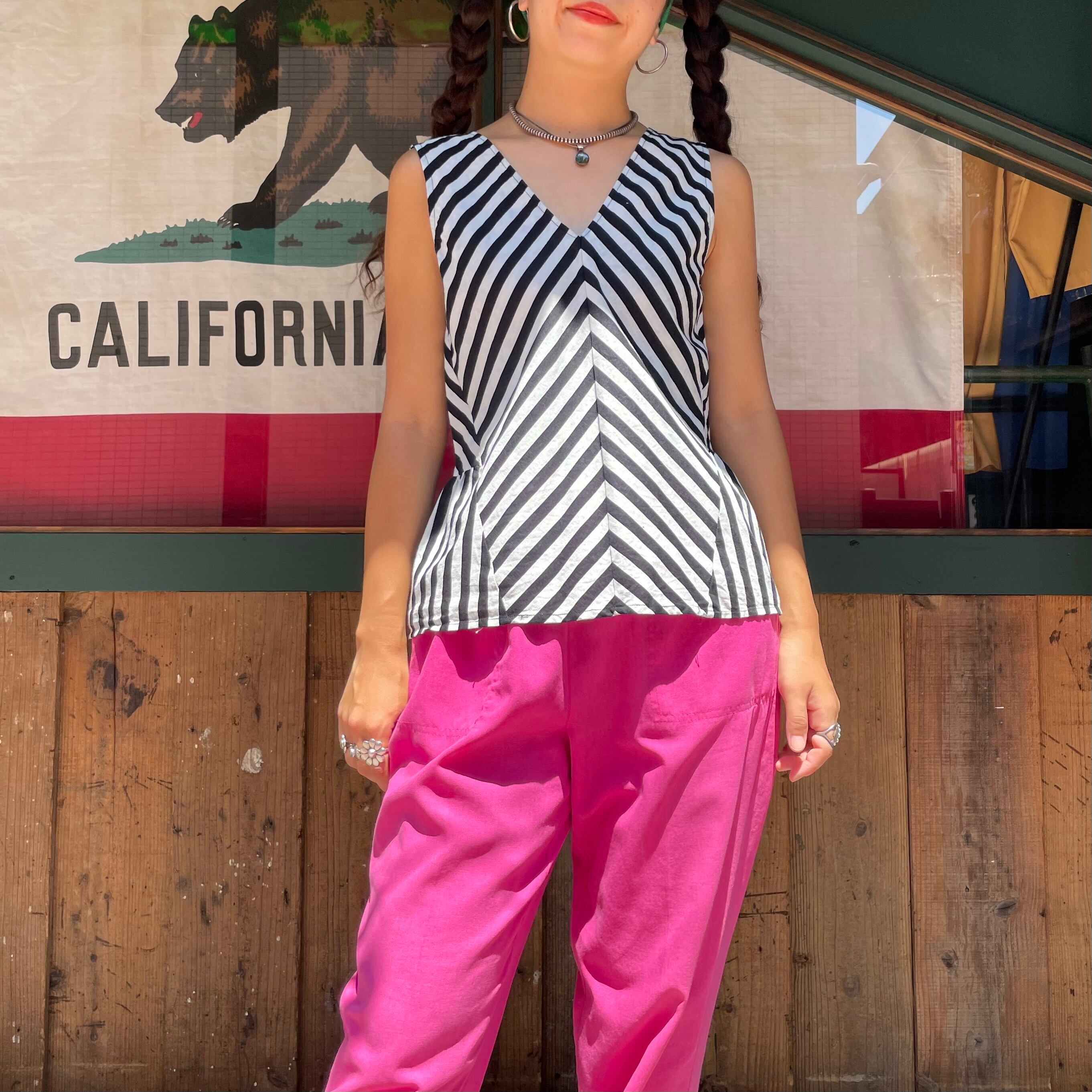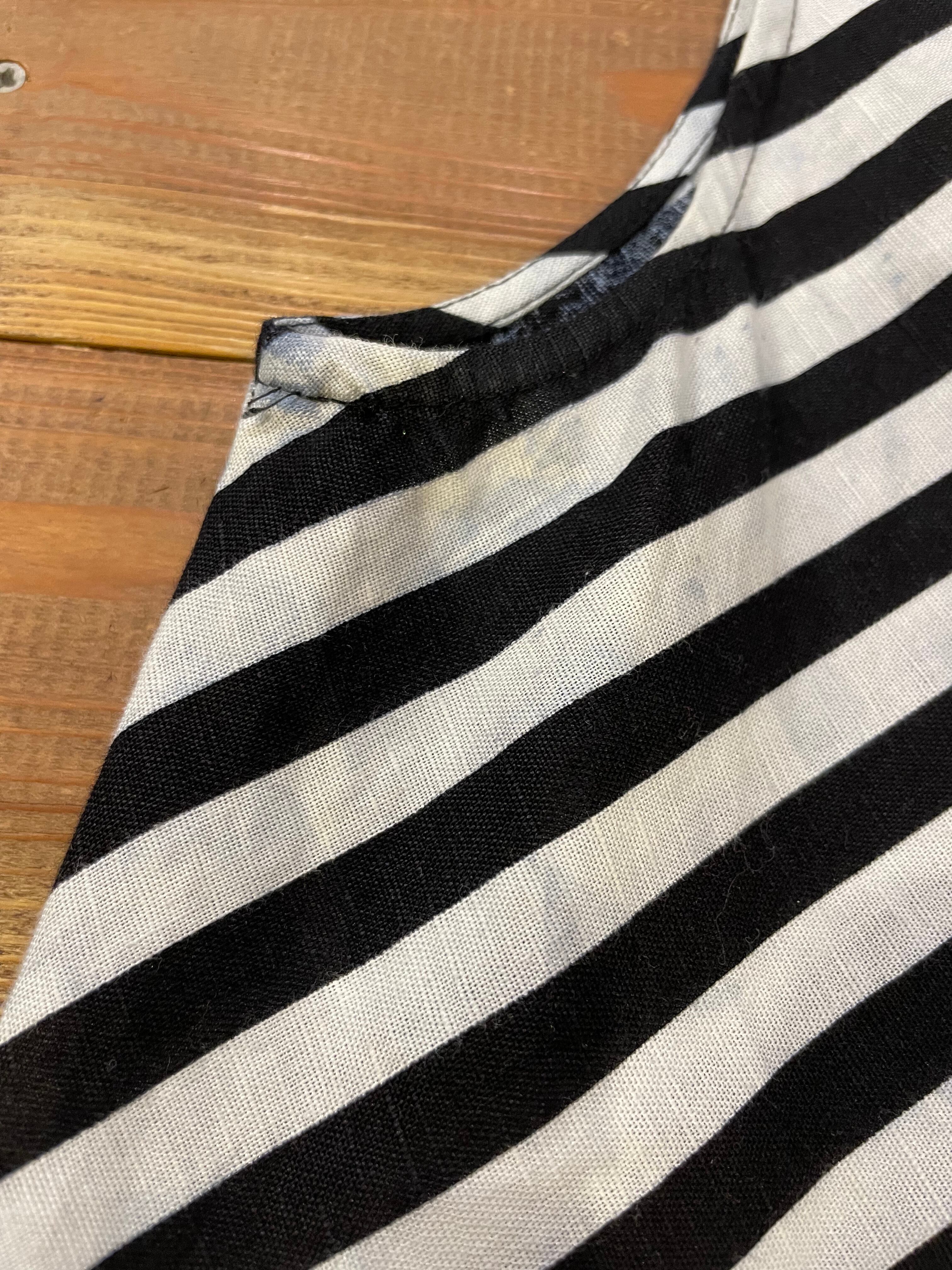ストライプと切り替えでクレイジーなパターンになっていてかわいいノースリーブのトップスです。