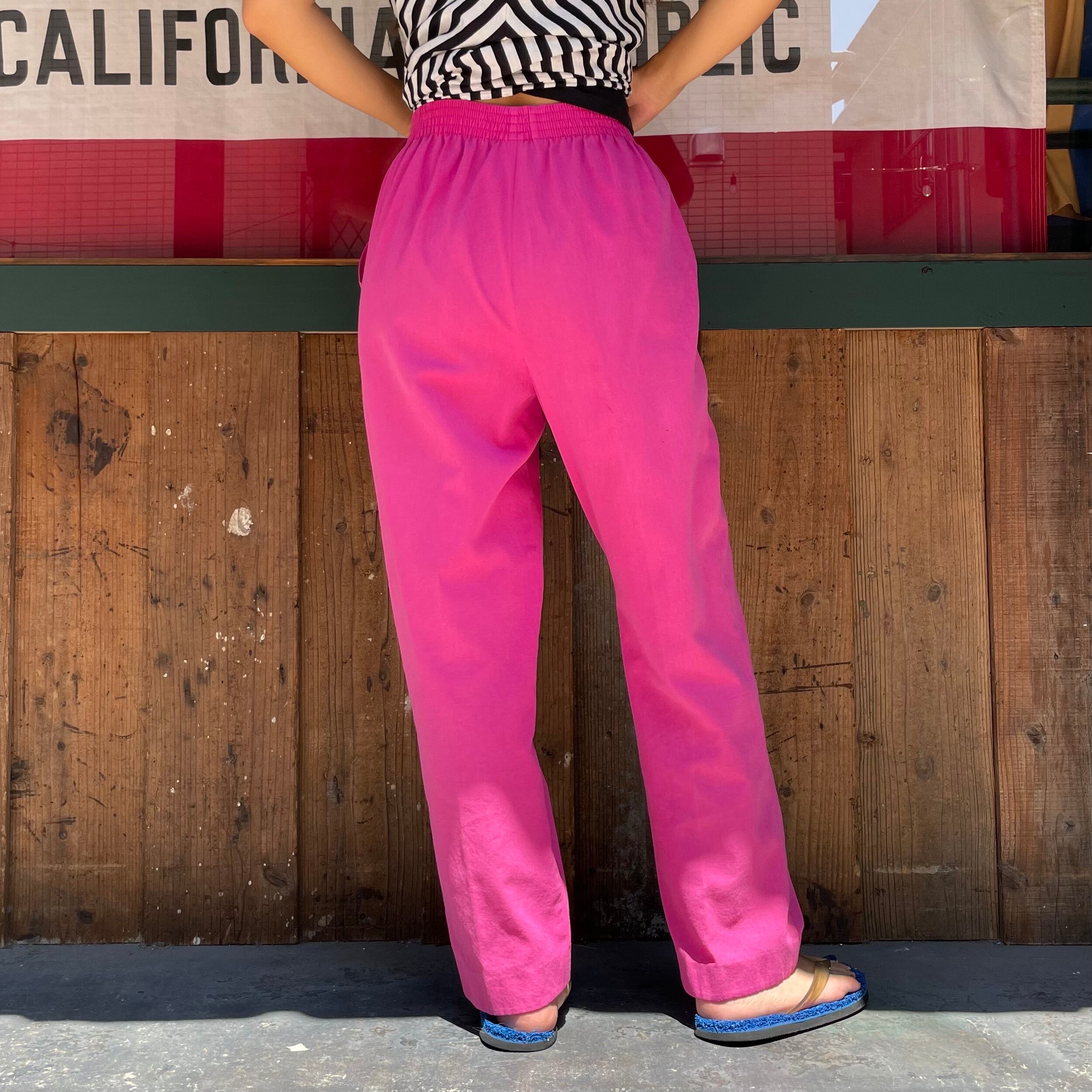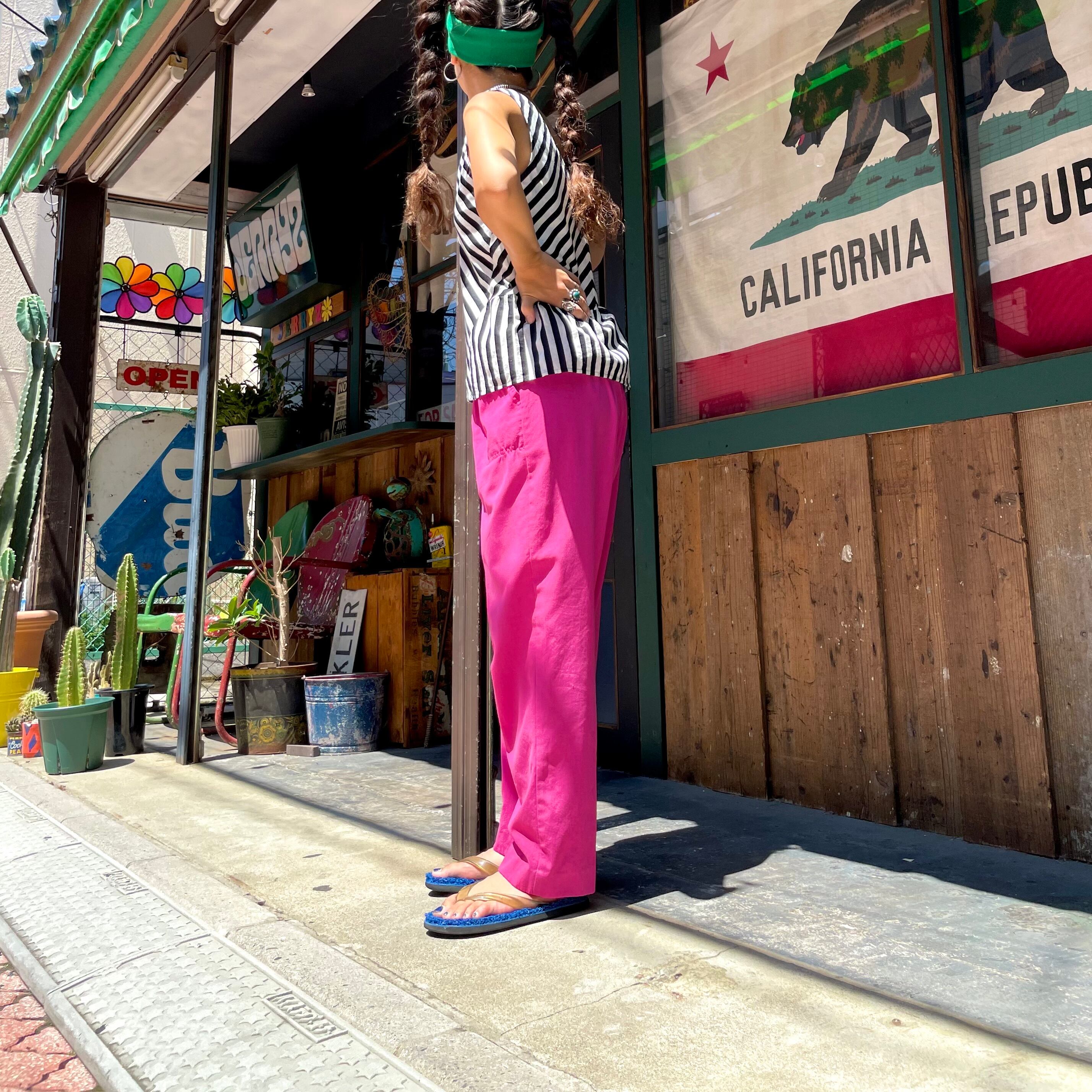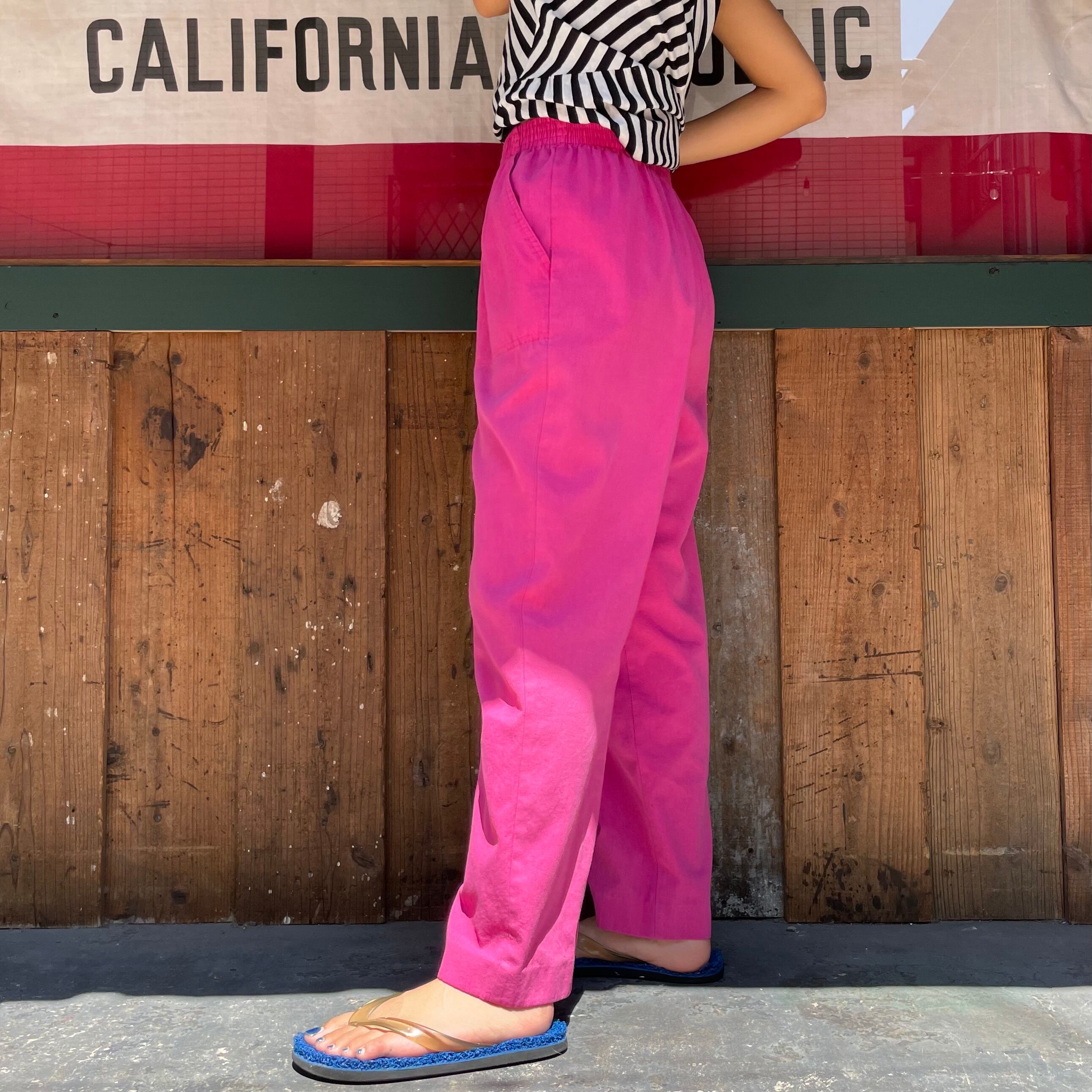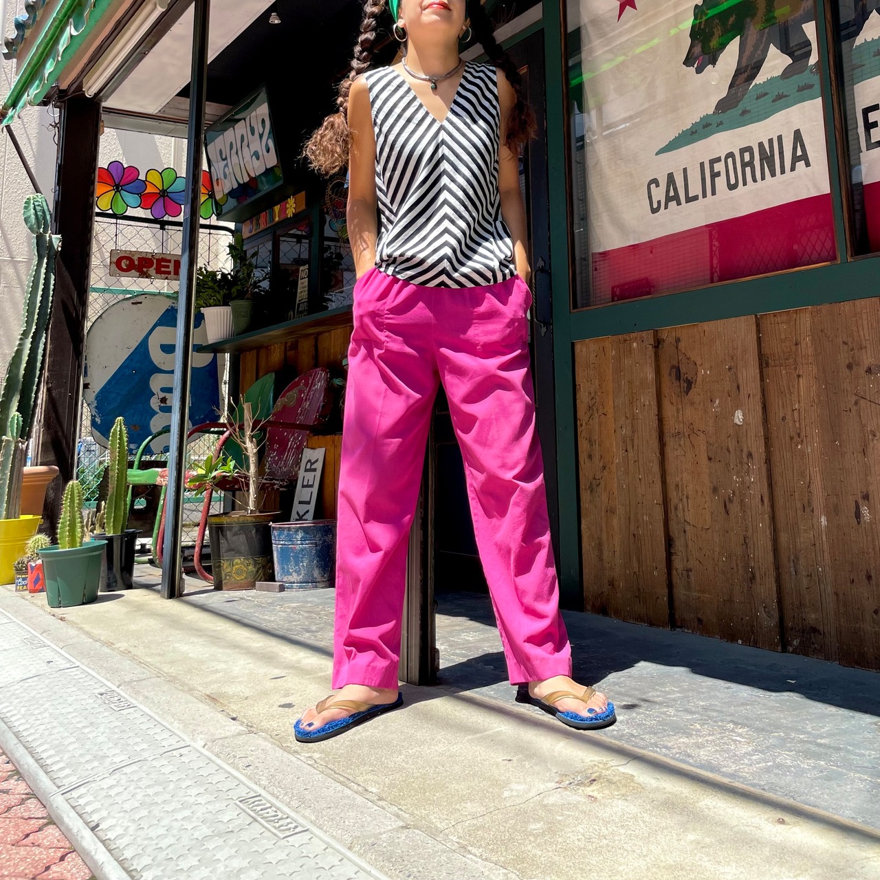 ピンクの明るい色味がかわいいイージーパンツです。ウエストゴムで楽ちんですしポケットもしっかりあり、シルエットも緩くてお尻をカバーしてくれる感じが履きやすいと思います!