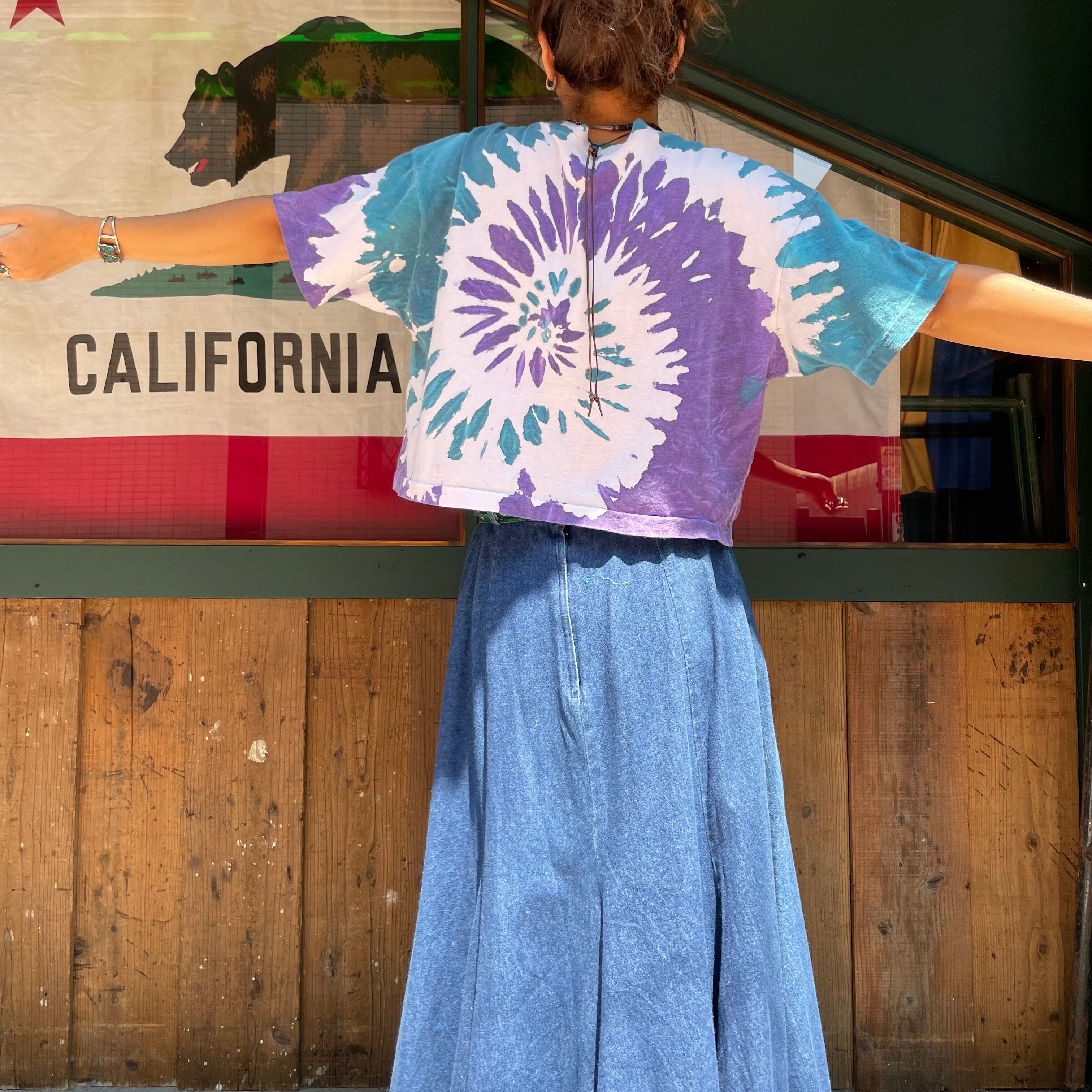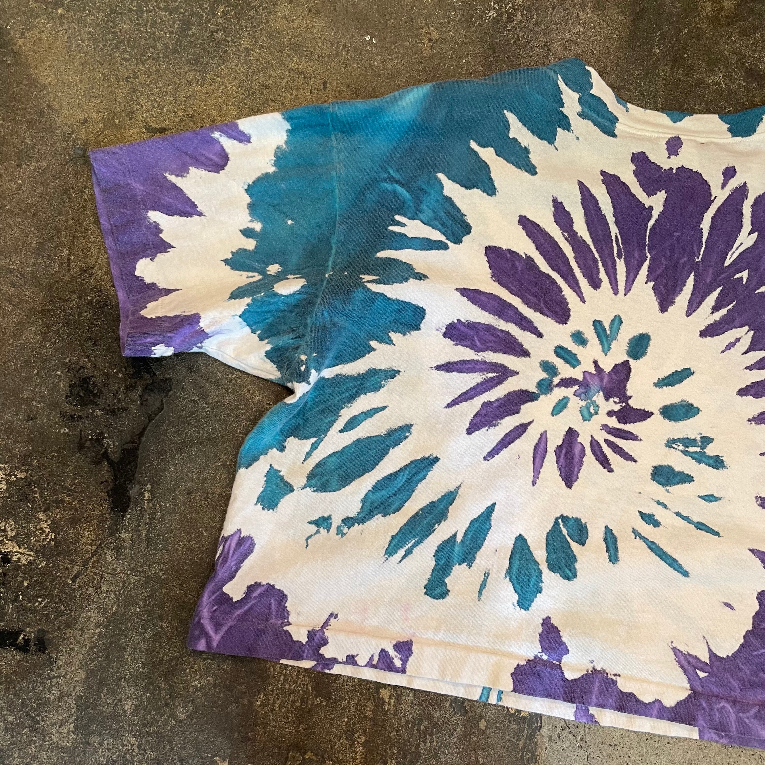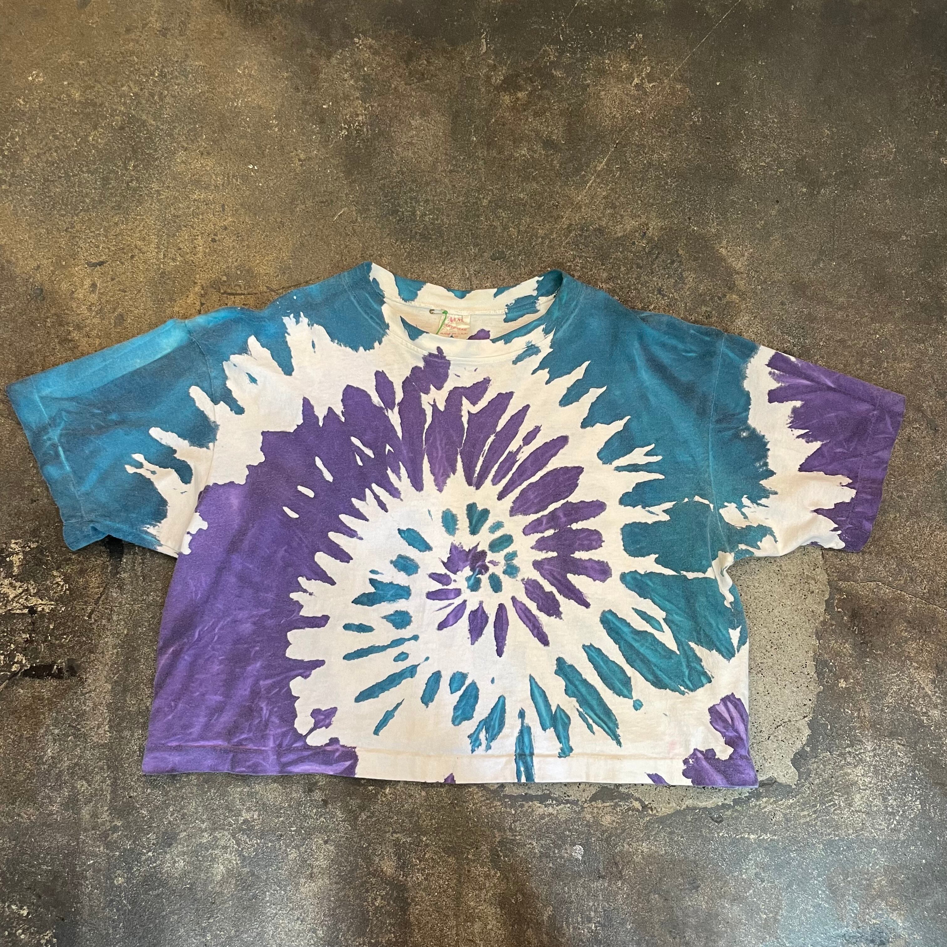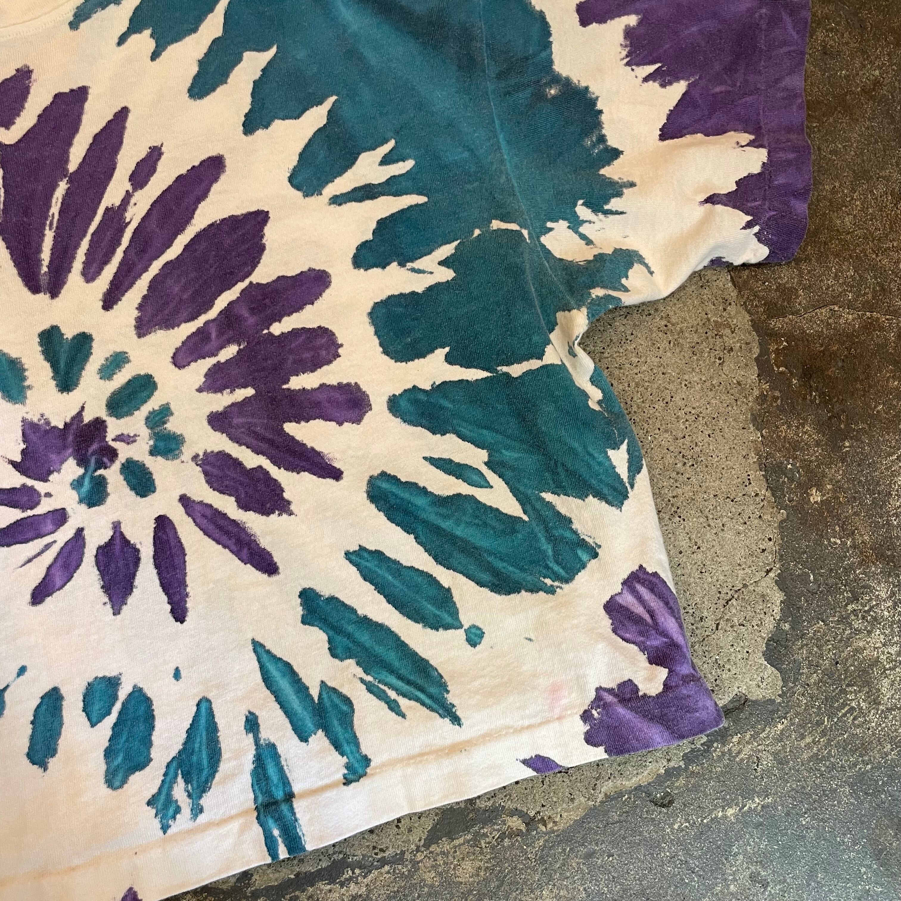 ショート丈がかわいいタイダイ染めのTシャツです。タイダイといってもムラサキと緑の2色だけでシンプルなところも魅力ですね。