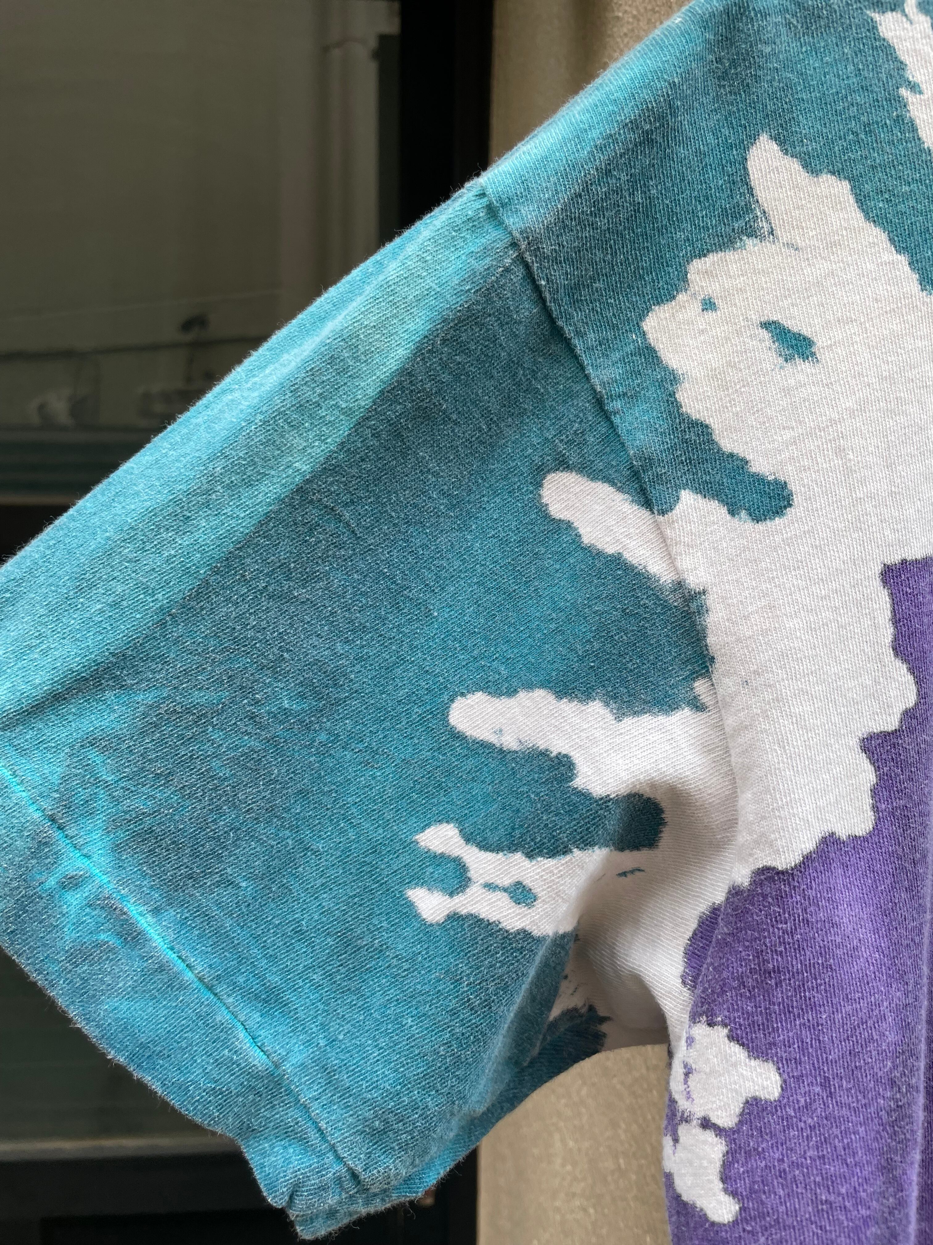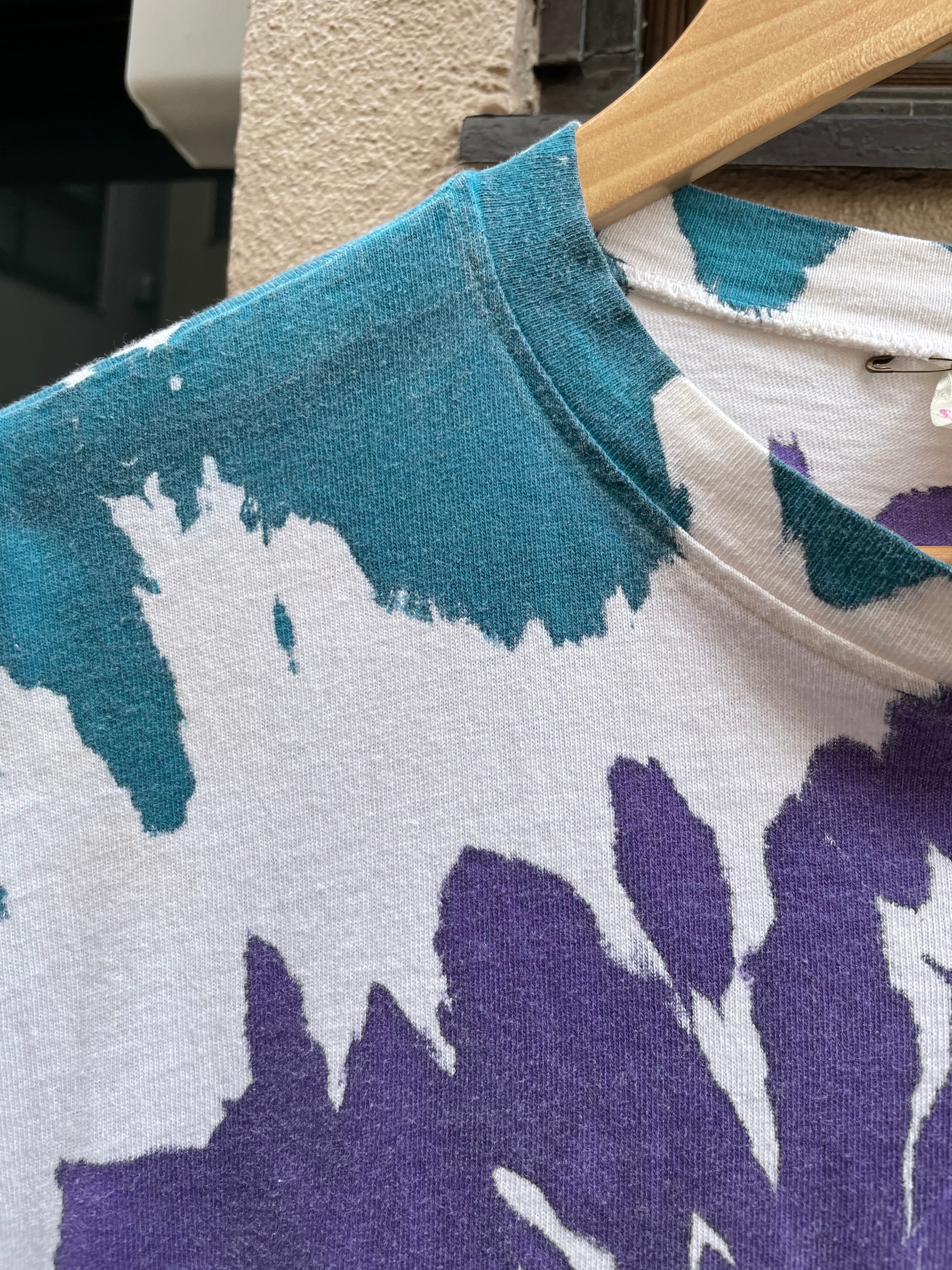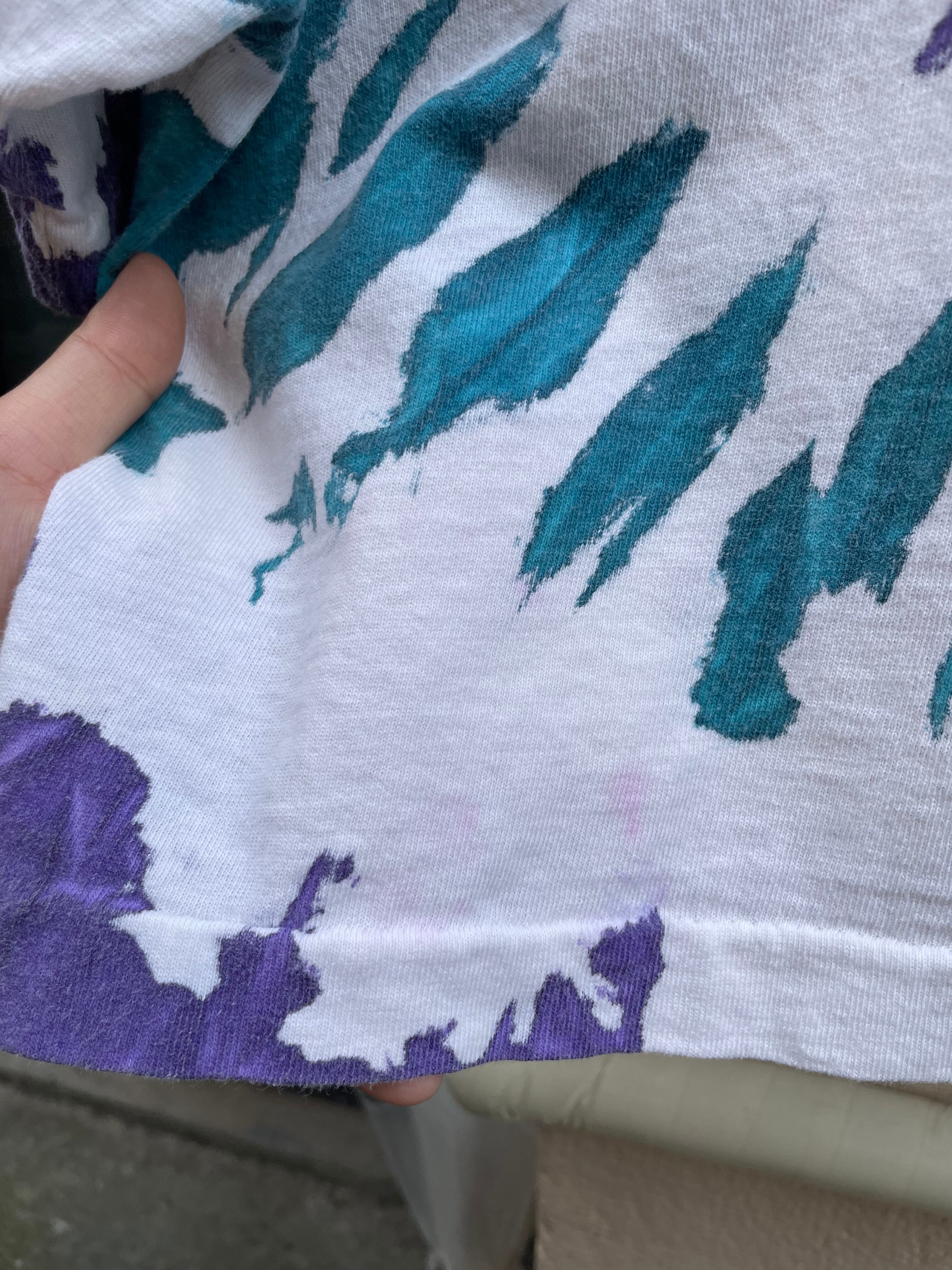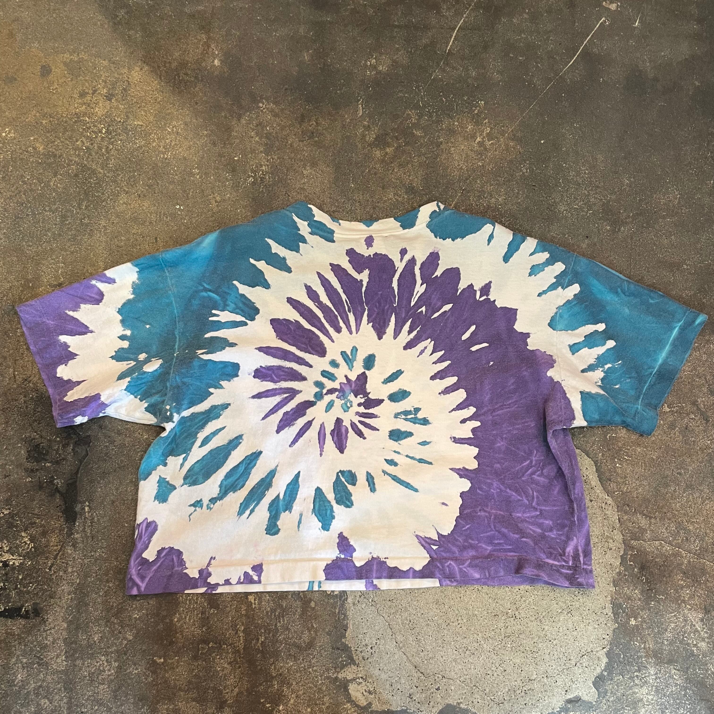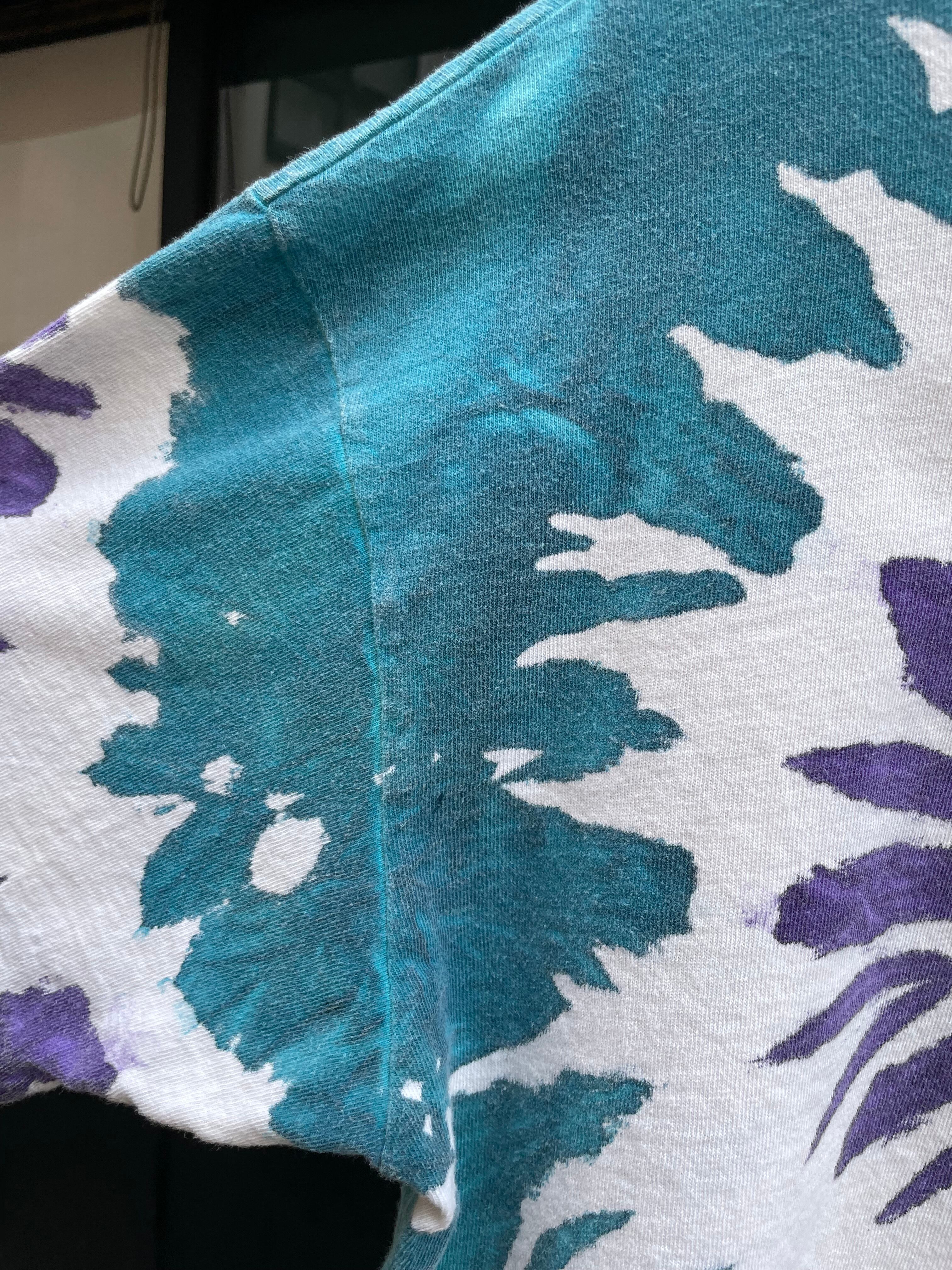ショート丈がかわいいタイダイ染めのTシャツです。タイダイといってもムラサキと緑の2色だけでシンプルなところも魅力ですね。
