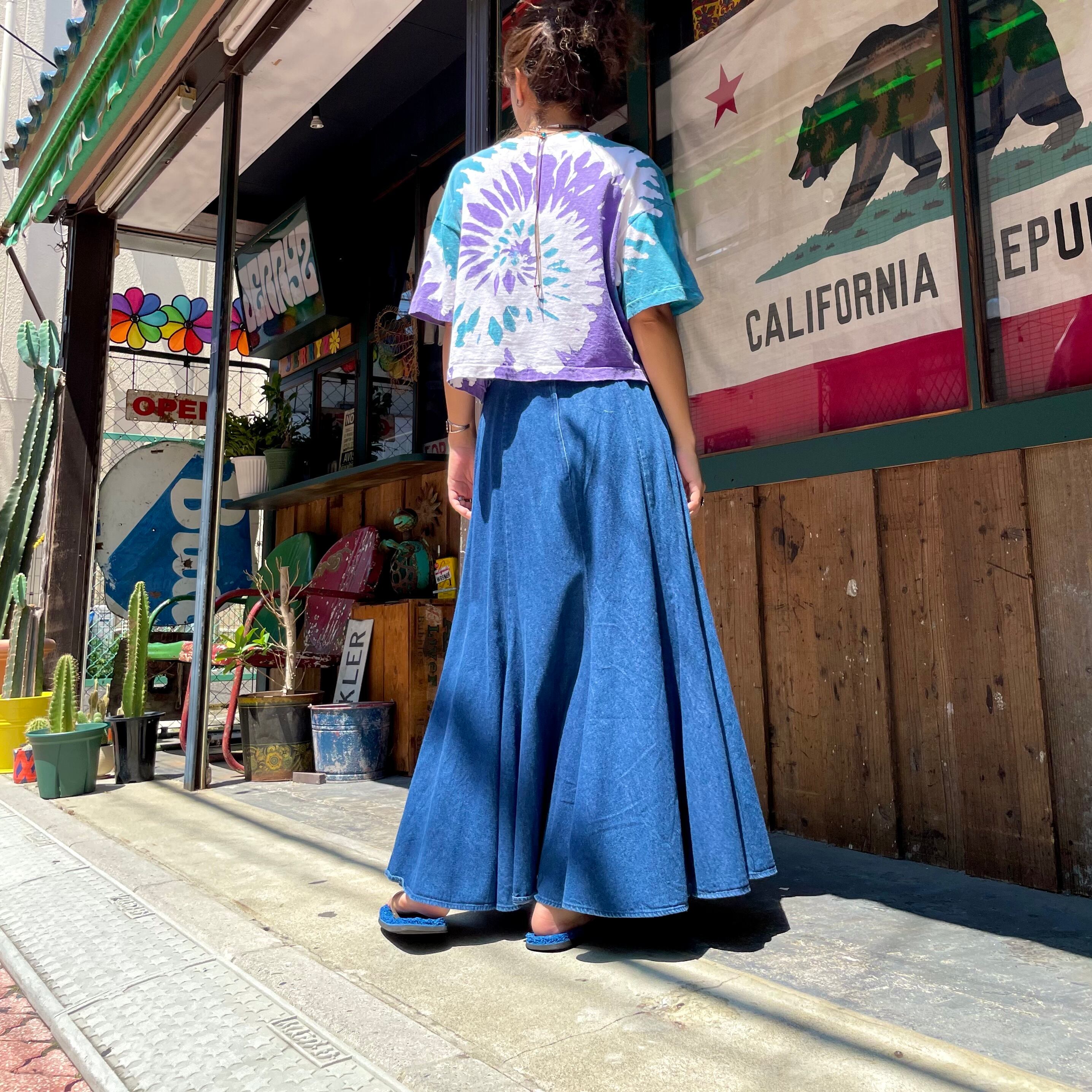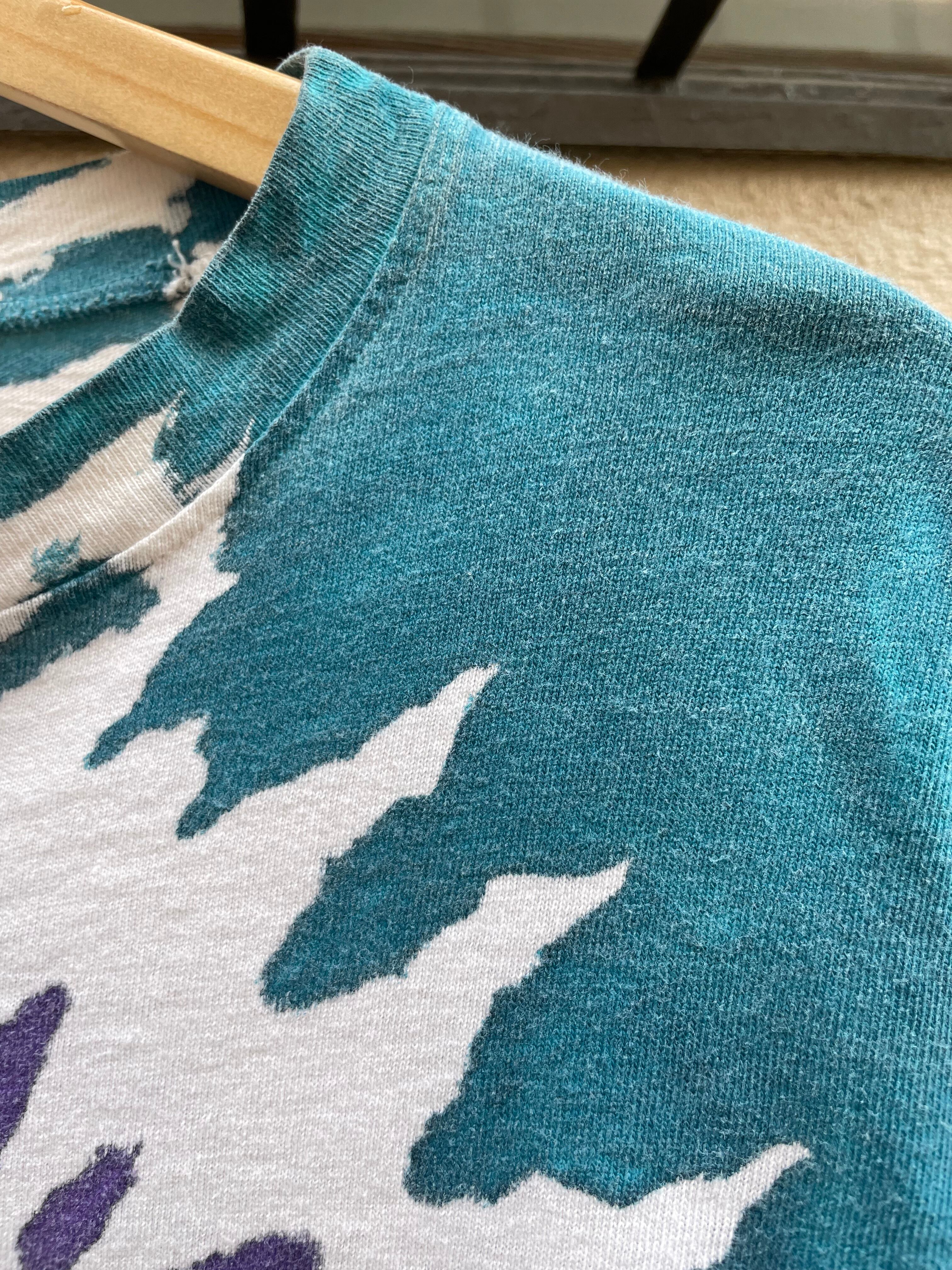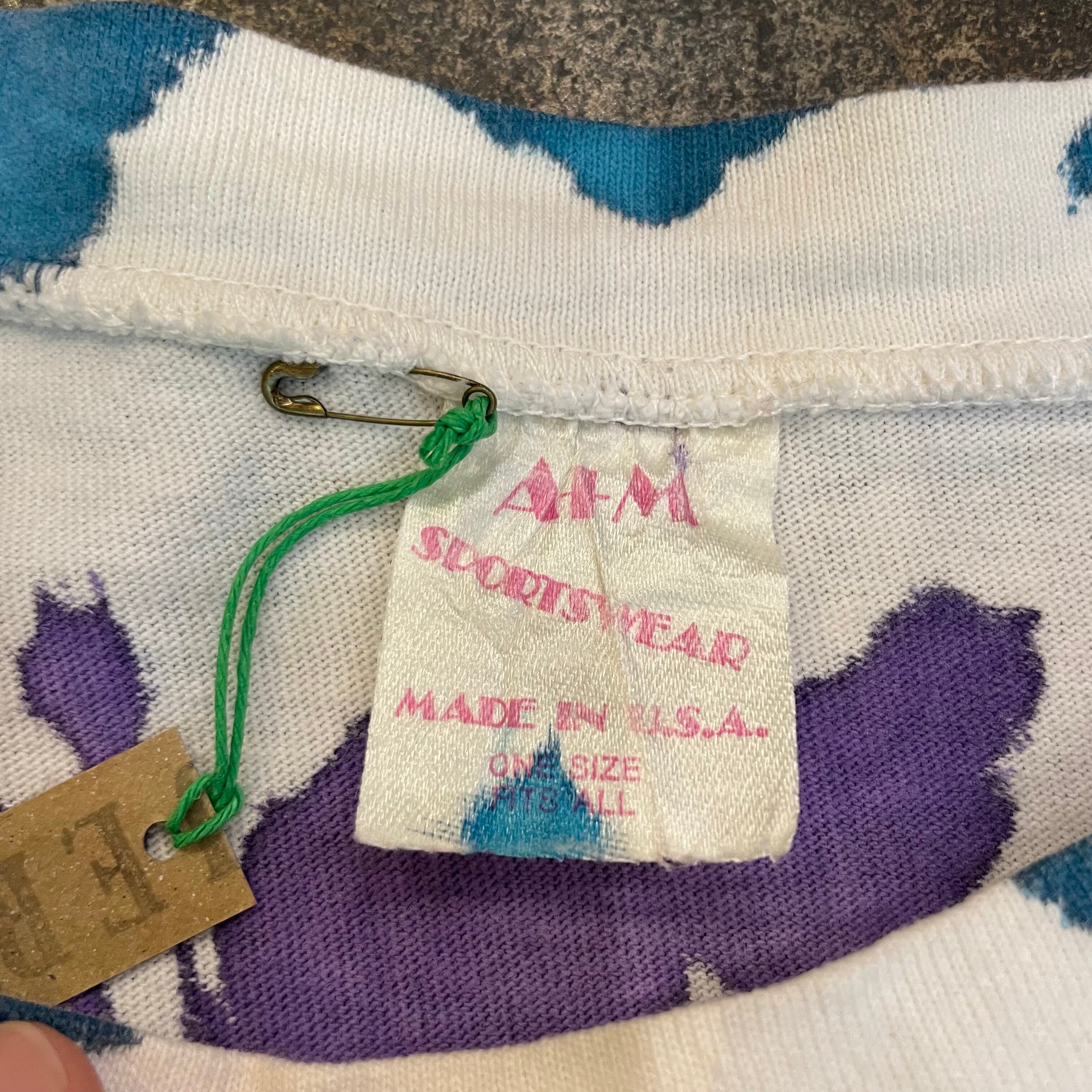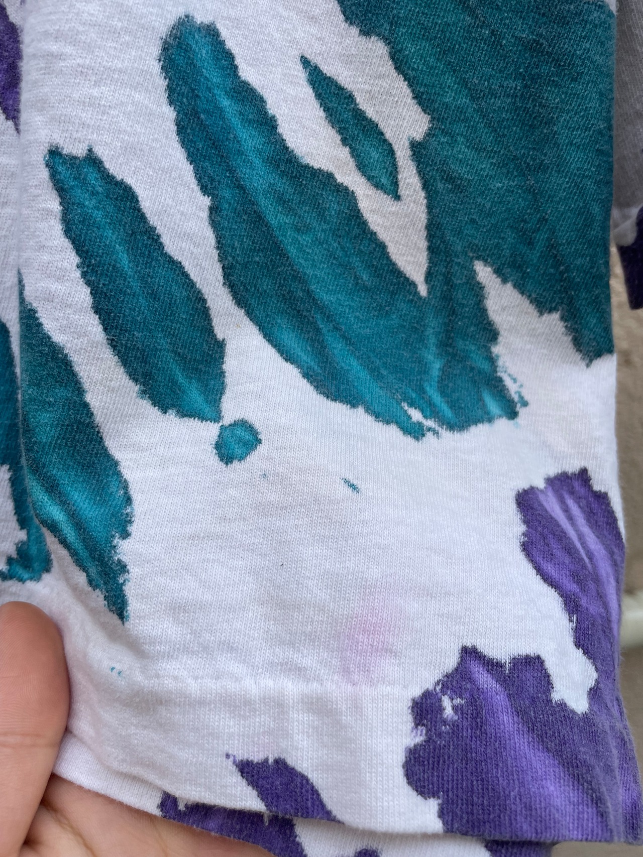ショート丈がかわいいタイダイ染めのTシャツです。タイダイといってもムラサキと緑の2色だけでシンプルなところも魅力ですね。