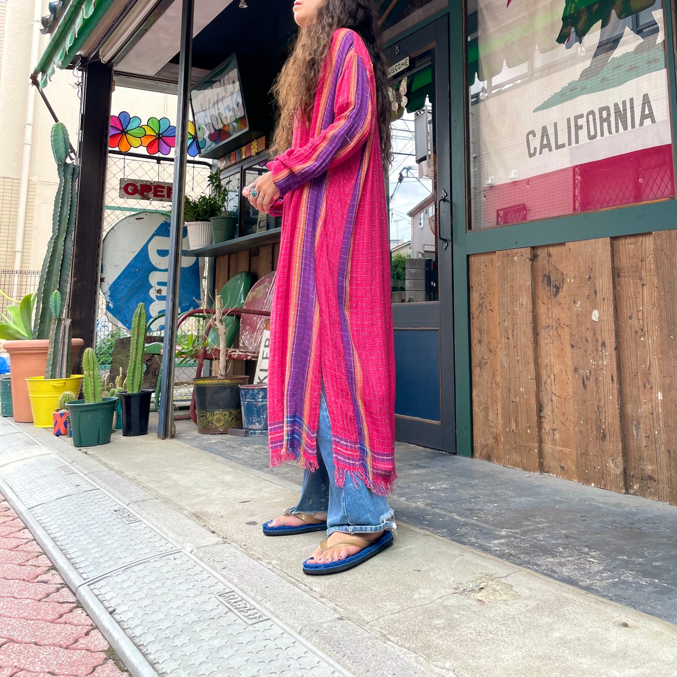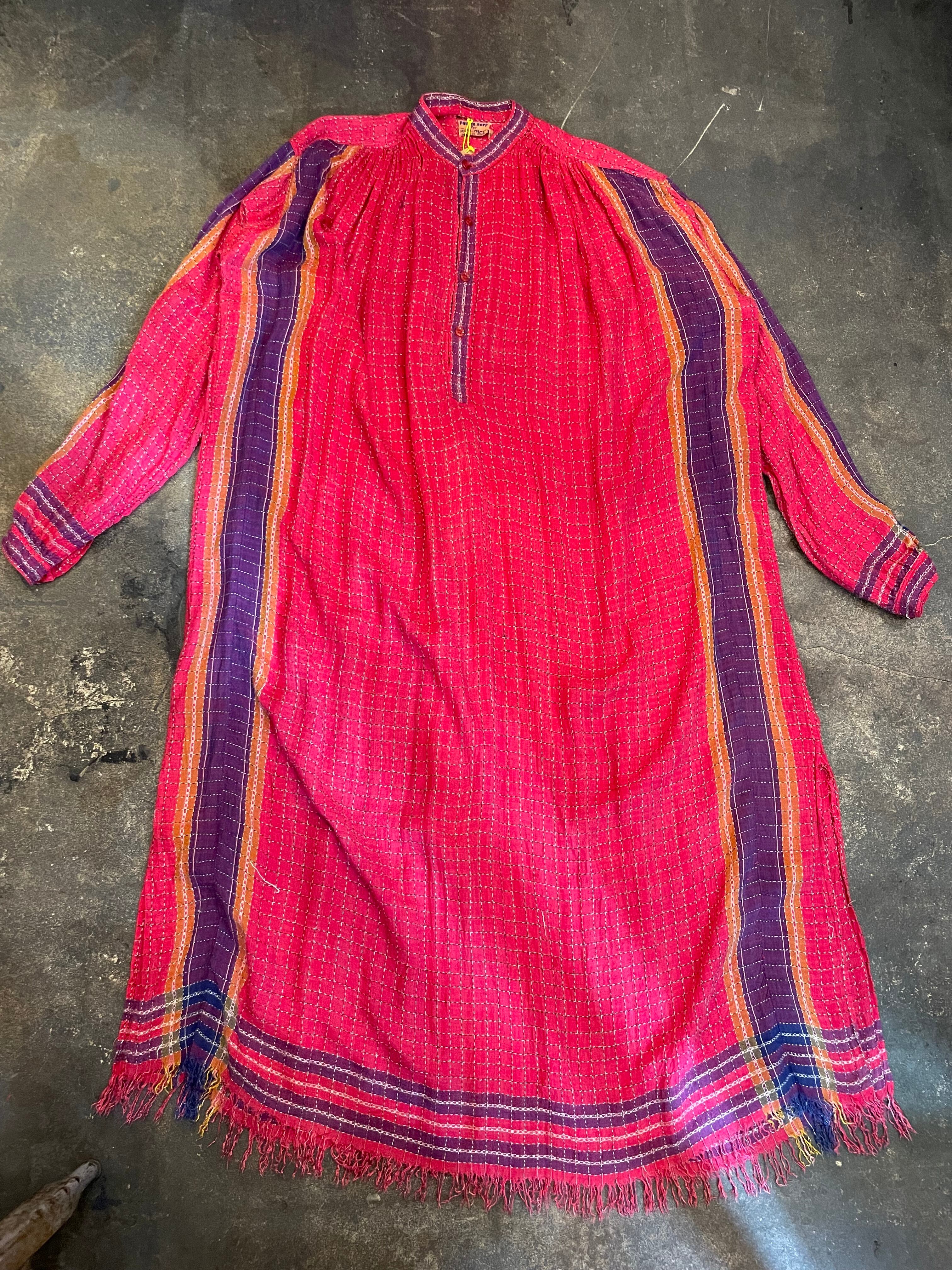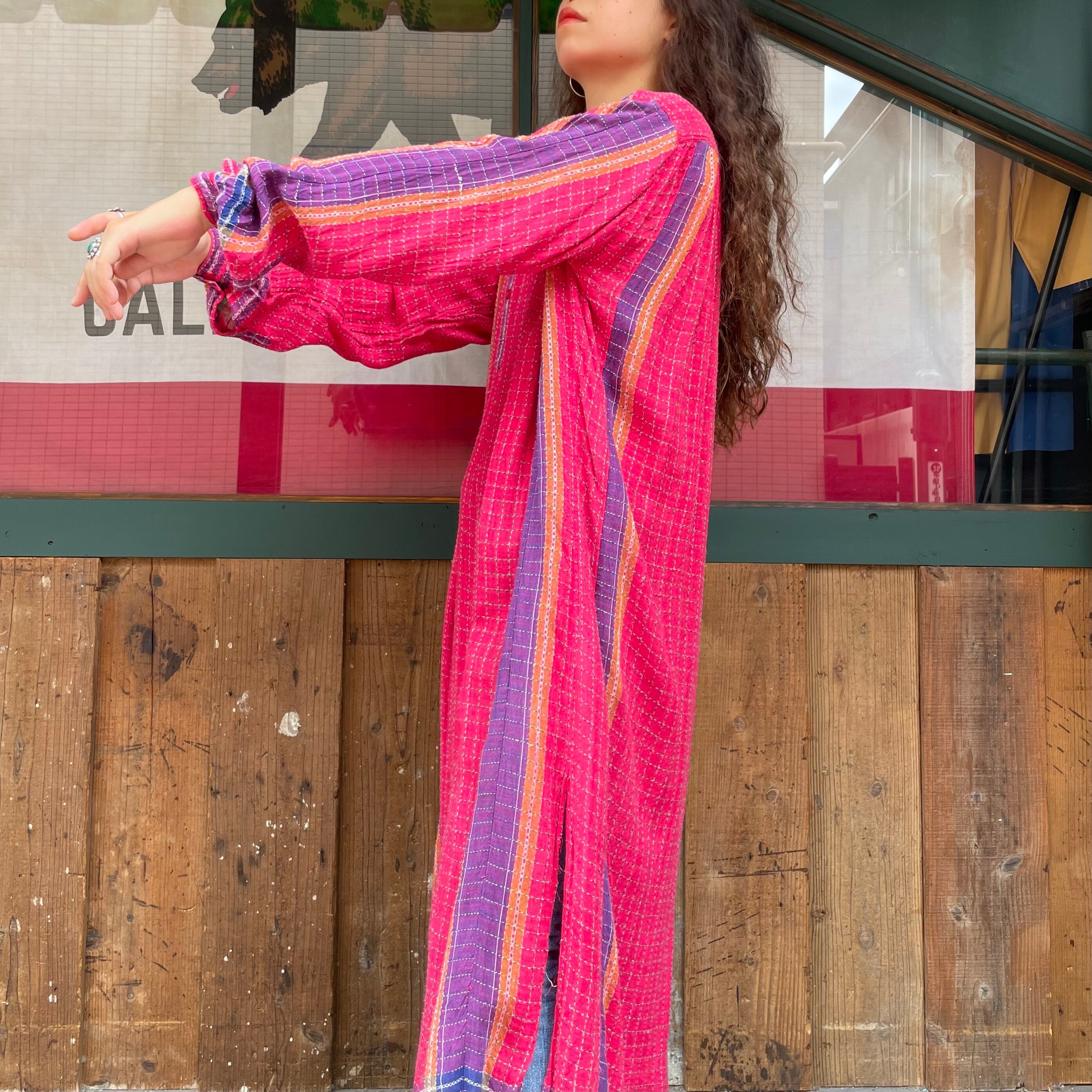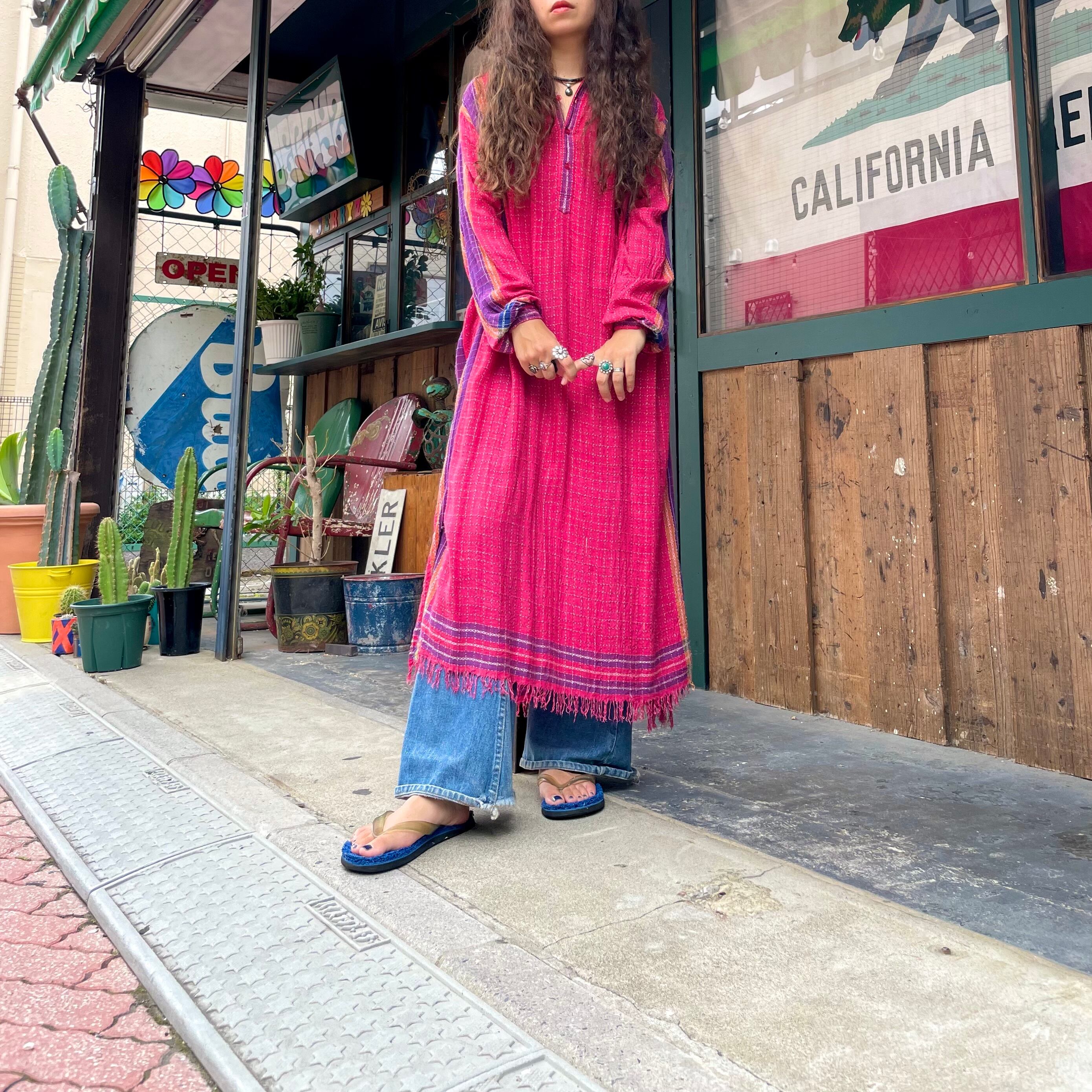 ヘンリーネックですノーカラー 、ゆったりシルエットで裾はフリンジになっていてかわいい60〜70年代ごろのインド製のワンピースです。