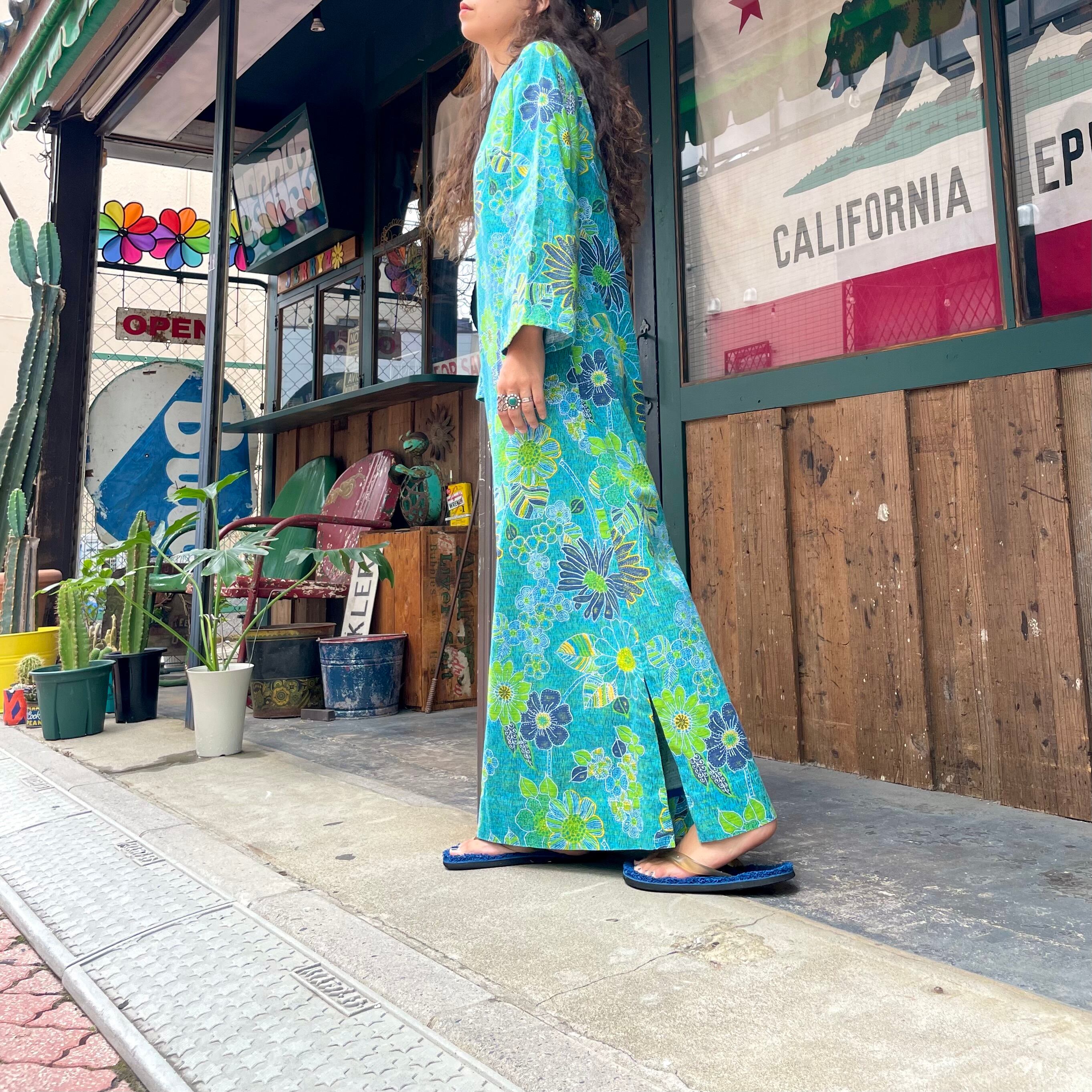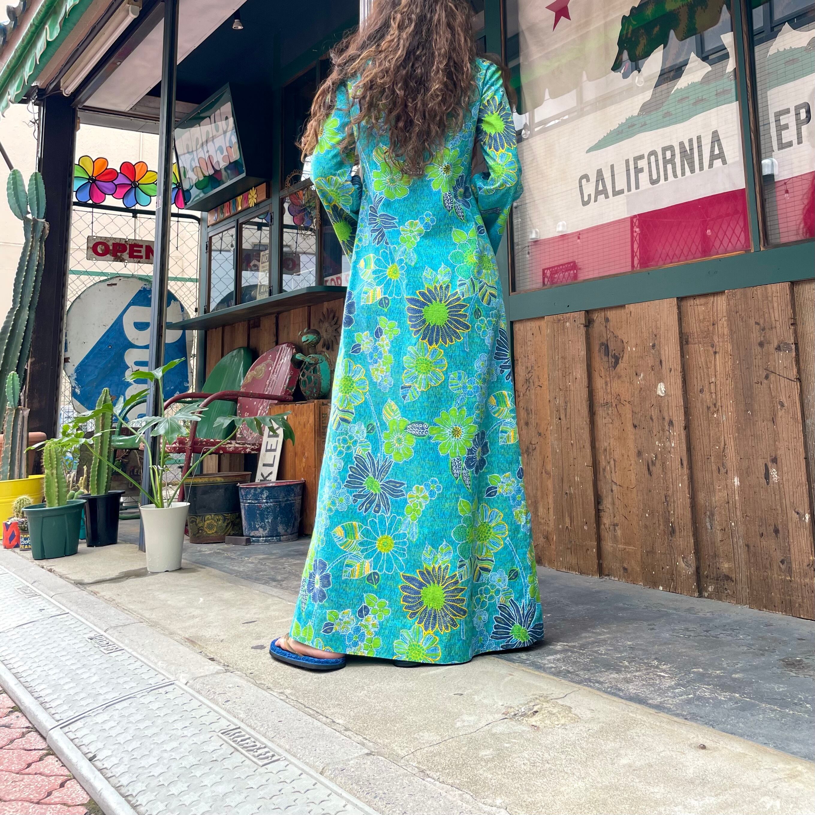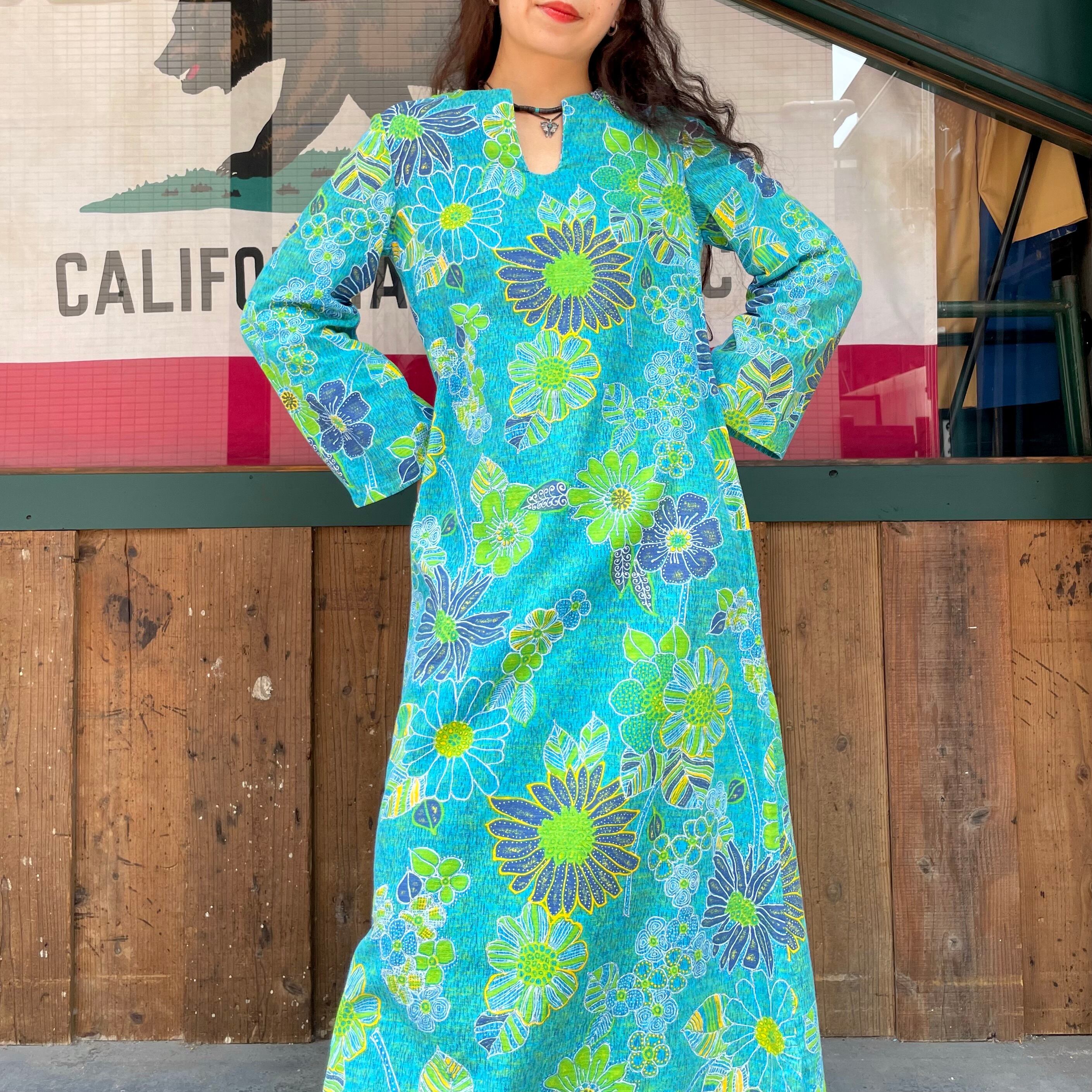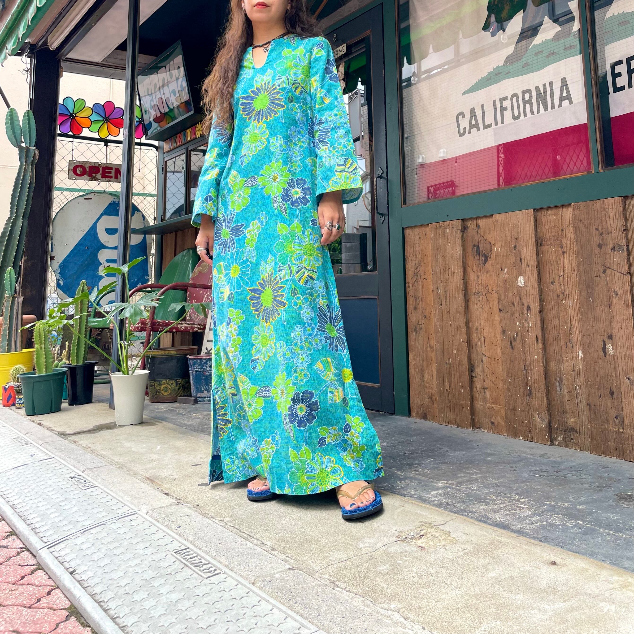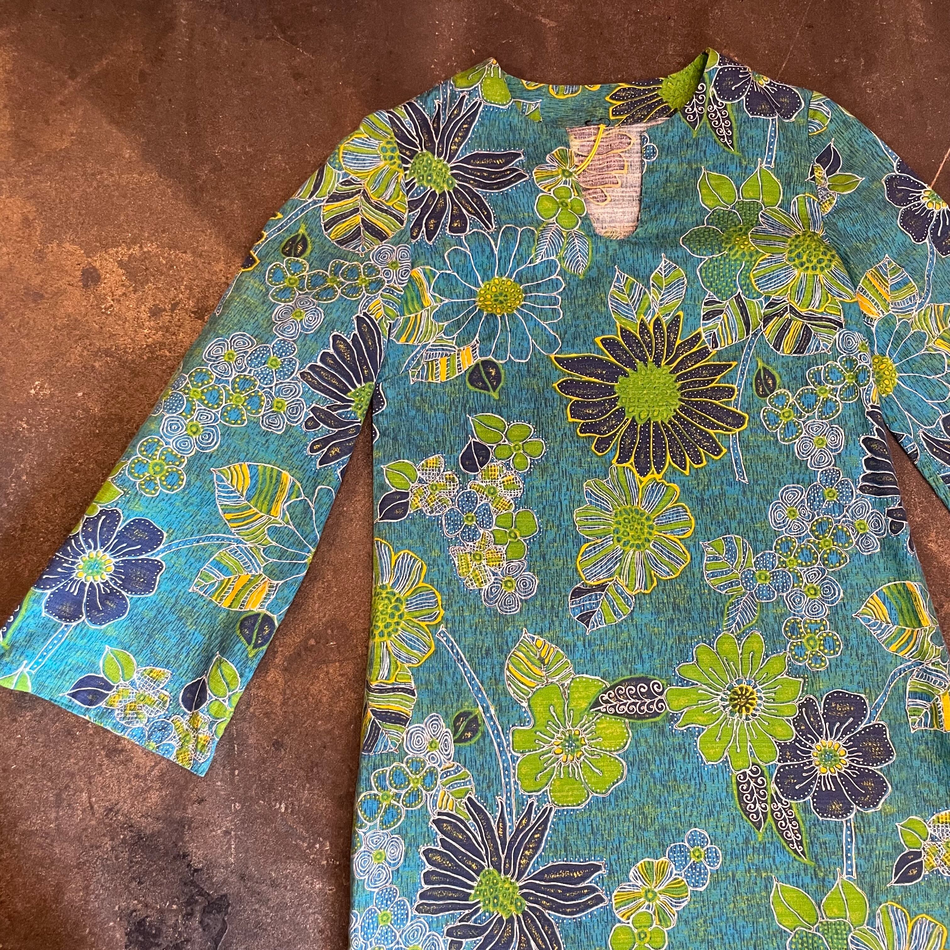さわやかなカラーリングの花柄がとてもかわいい70年代頃のワンピースです。