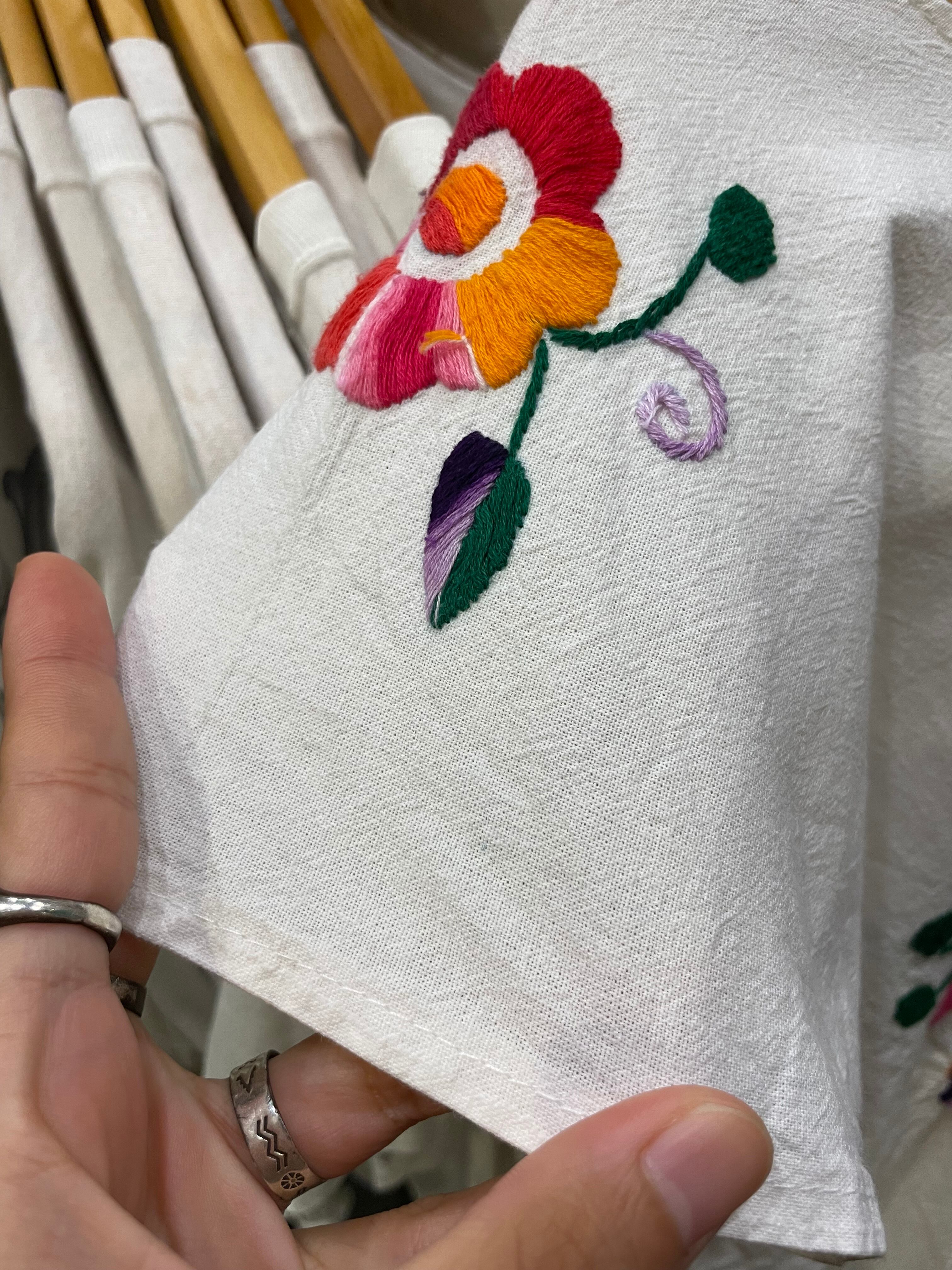 白地にカラフルな刺繍がハッピーでとてもかわいいですし、派手すぎないのでさりげなく着ることもできそうですね。サーマルや白いロングスカートを重ねたり、カラーパンツやタートルネックと合わせてもかわいいと思います。