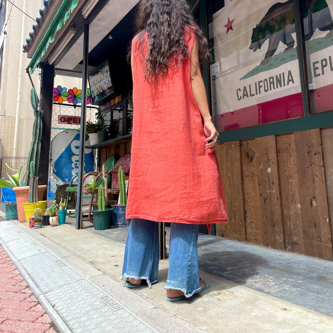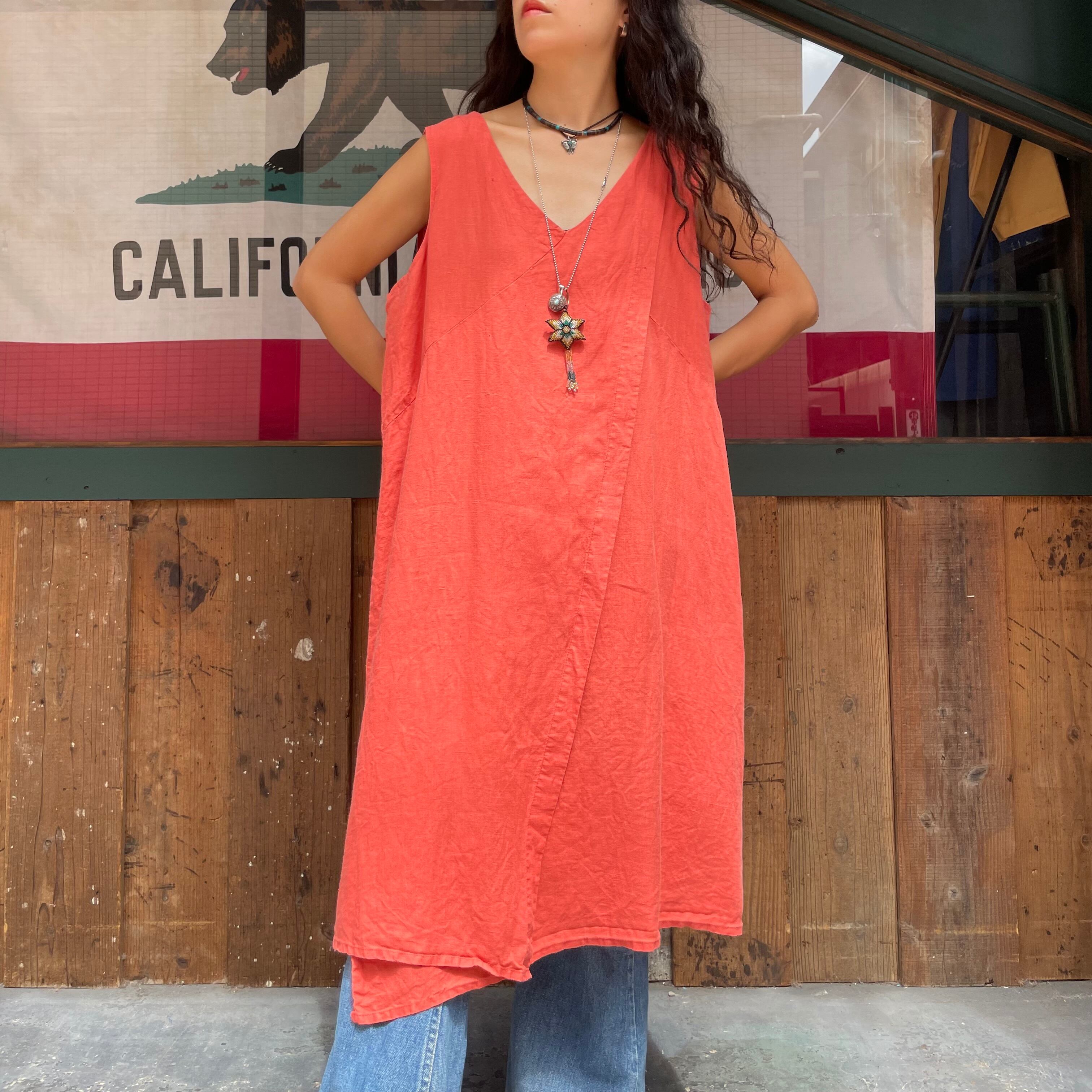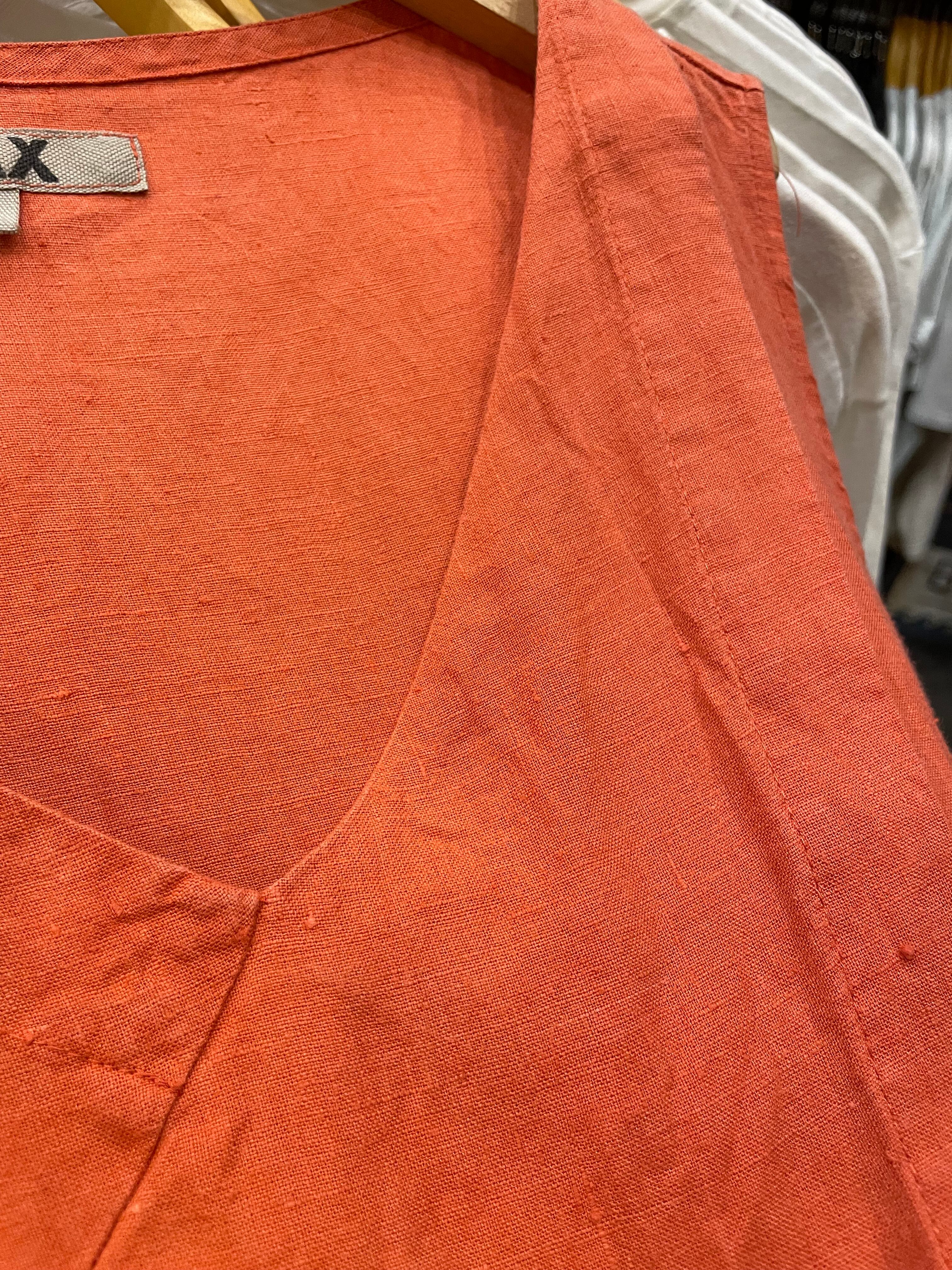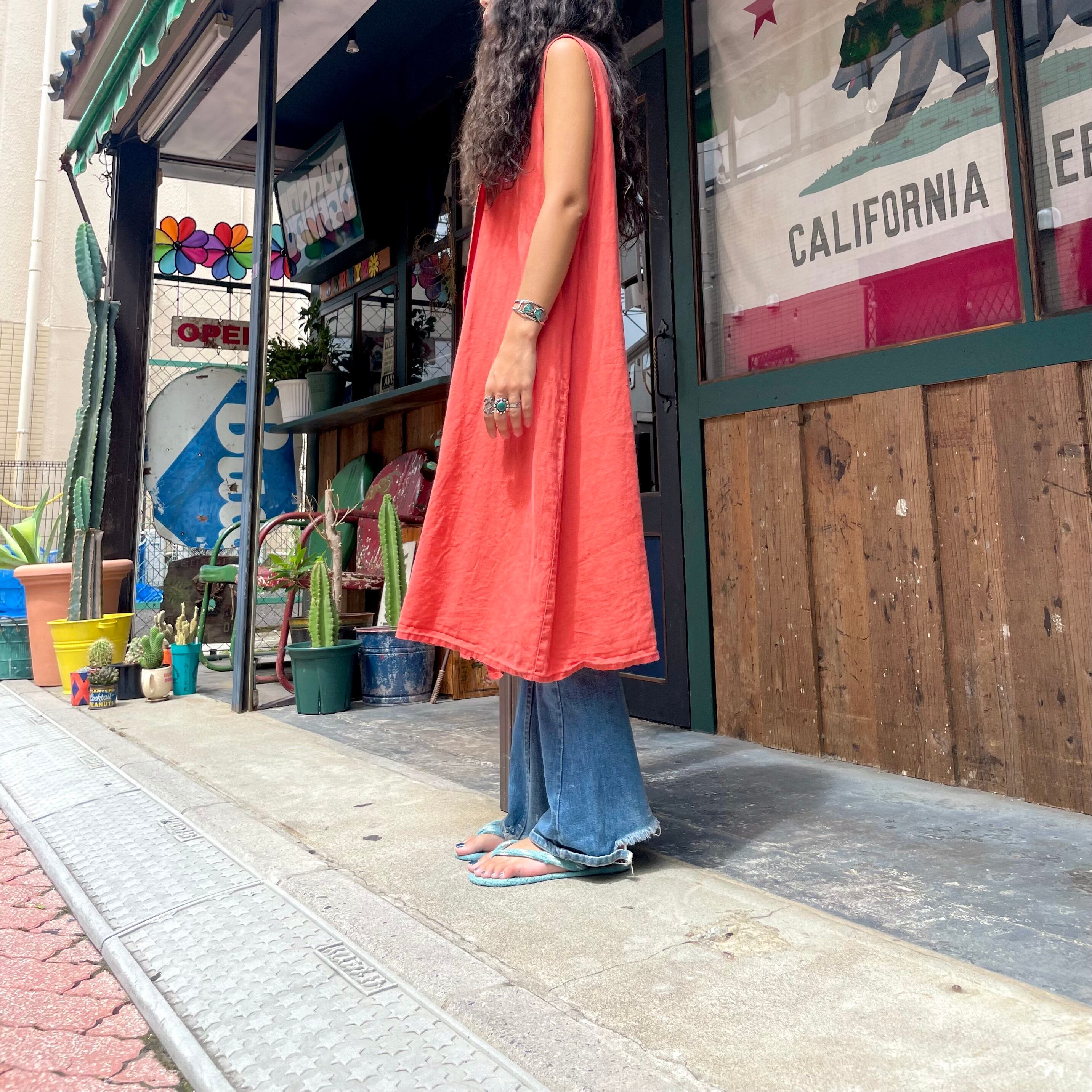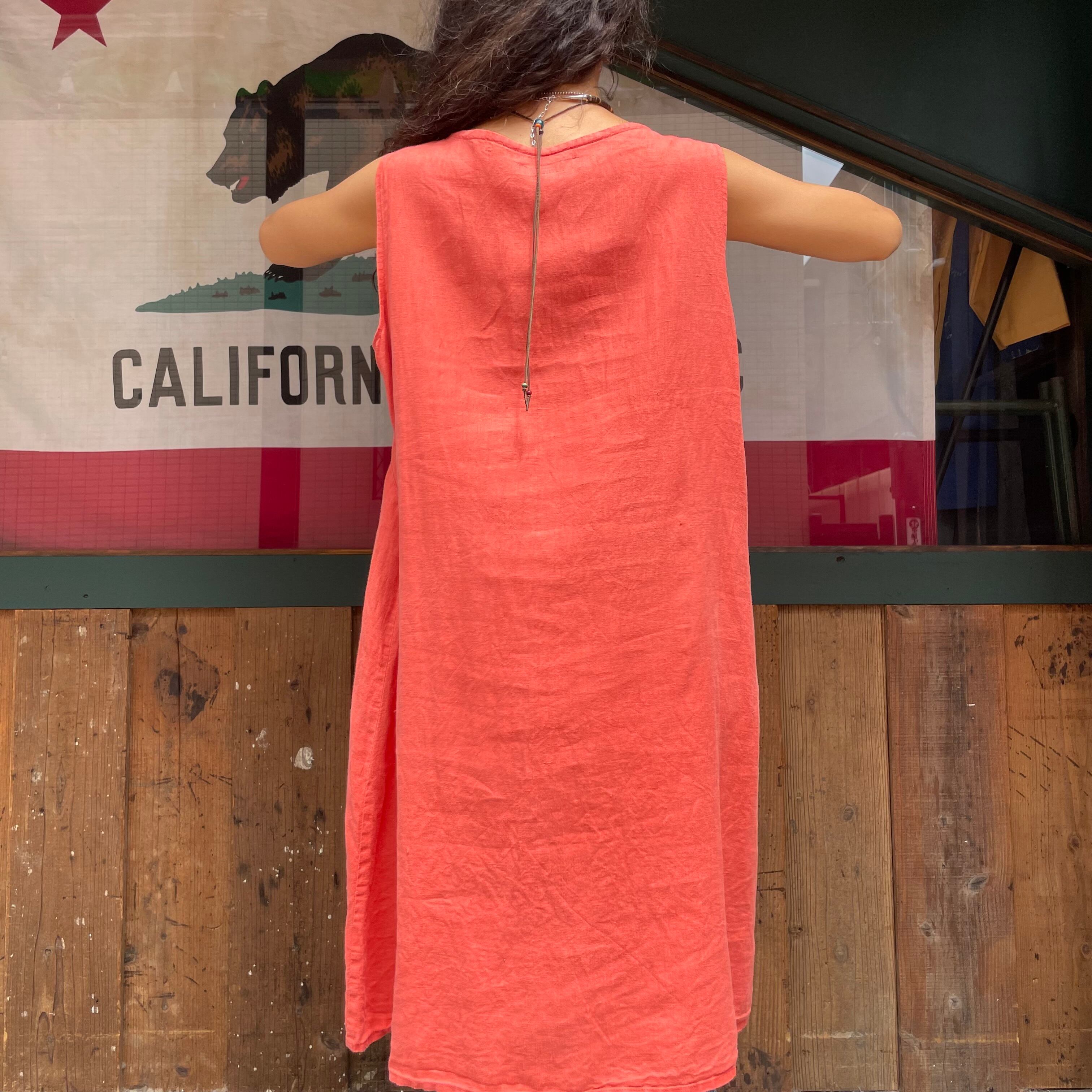 柔らかいオレンジが素敵なノースリーブワンピースです。リネン素材はやはり上品ですし年齢関係なく着て頂けそうなデザインで飽きずに着回せそうですね。