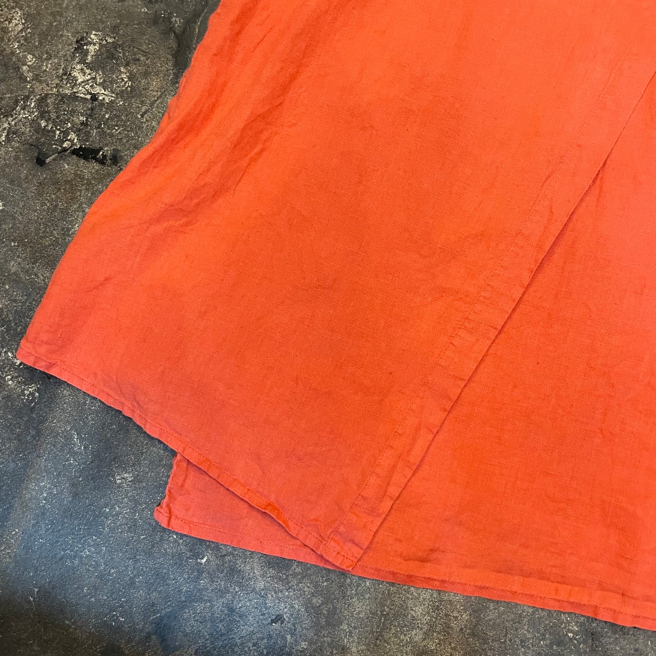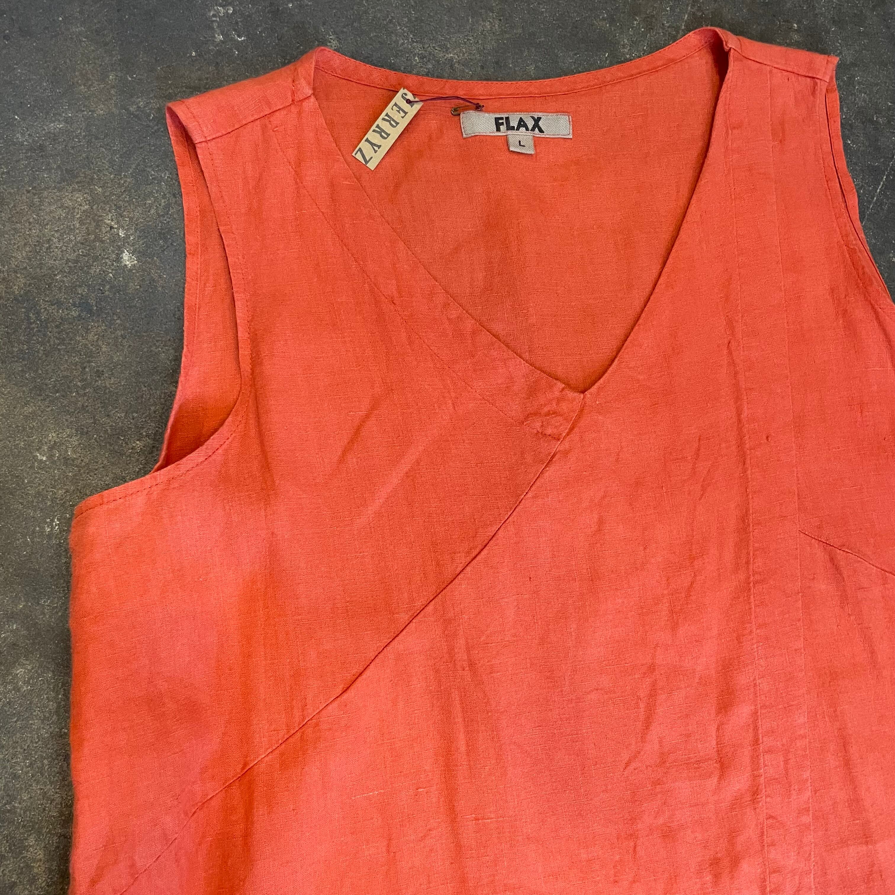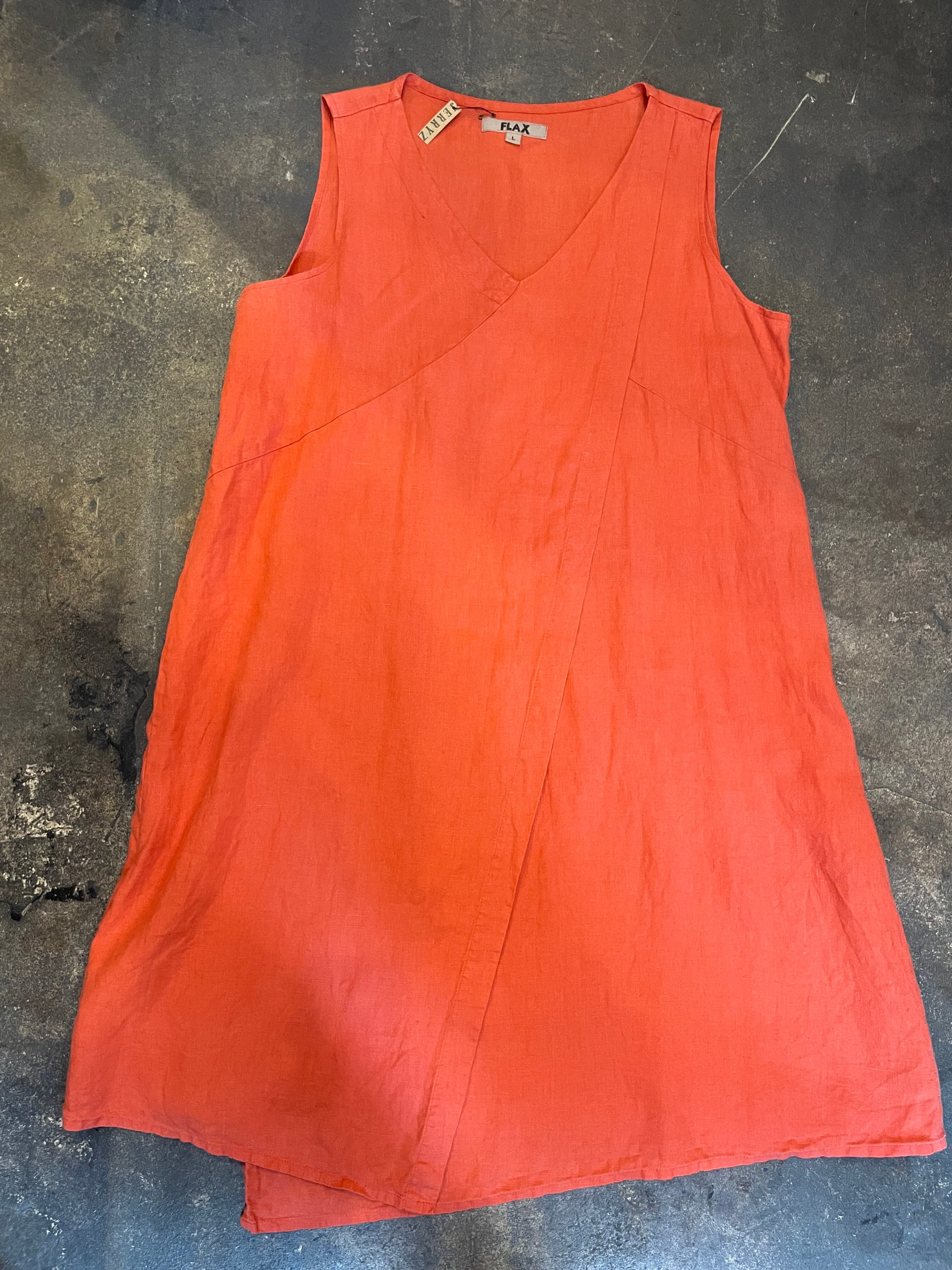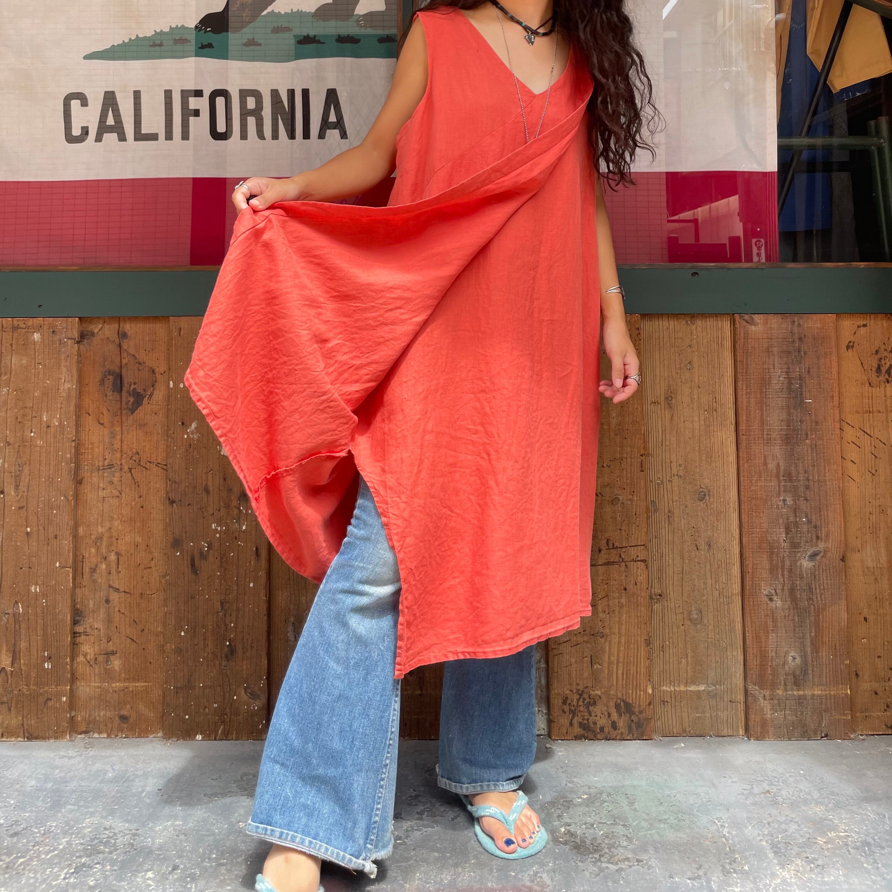 柔らかいオレンジが素敵なノースリーブワンピースです。リネン素材はやはり上品ですし年齢関係なく着て頂けそうなデザインで飽きずに着回せそうですね。