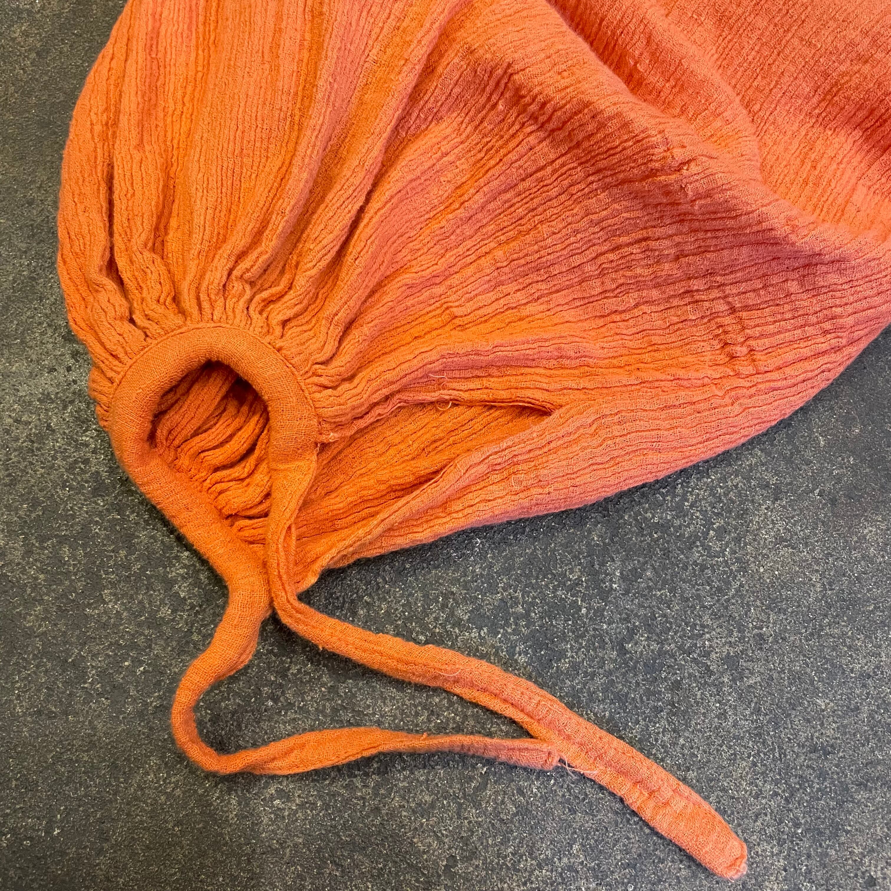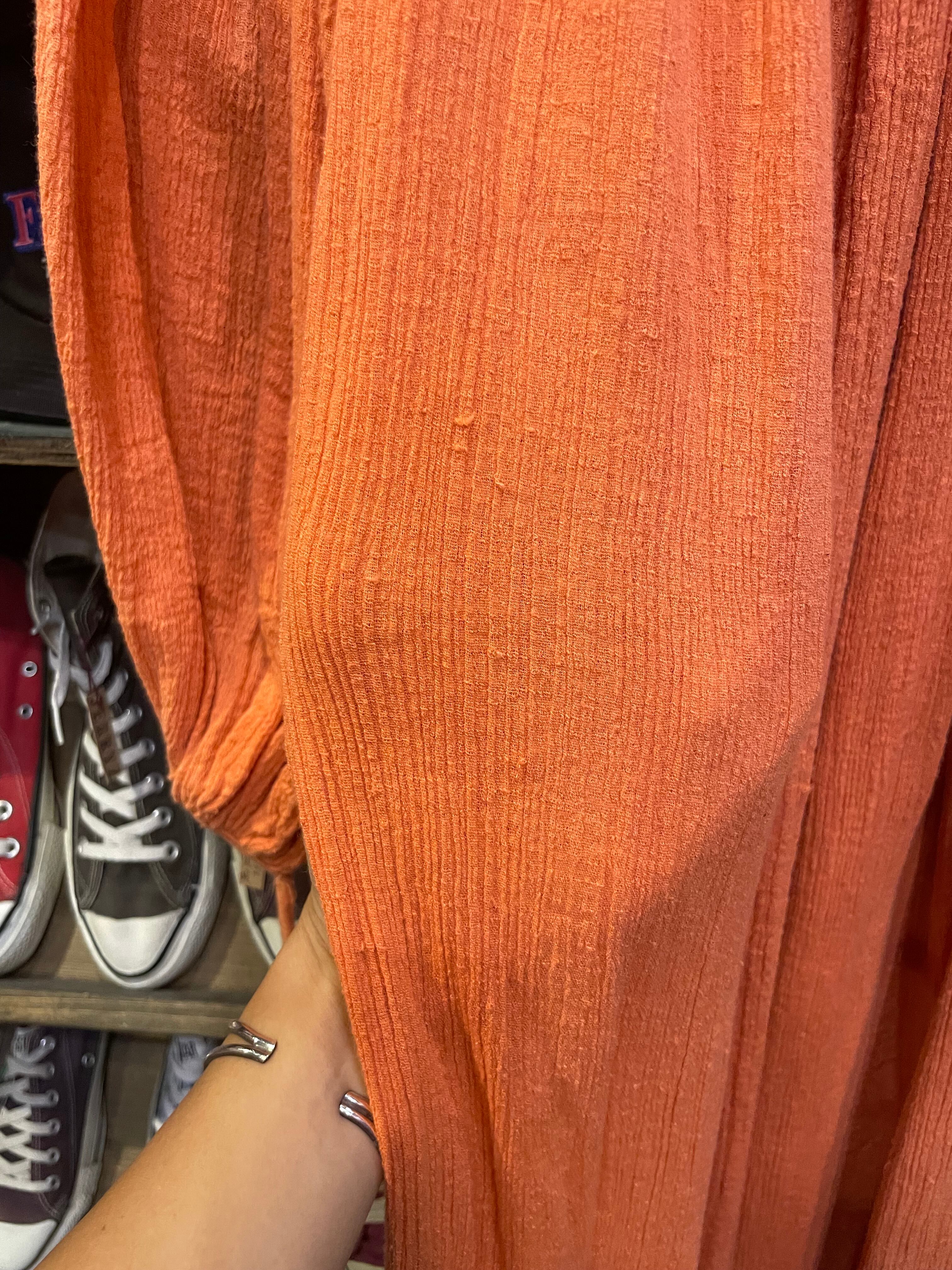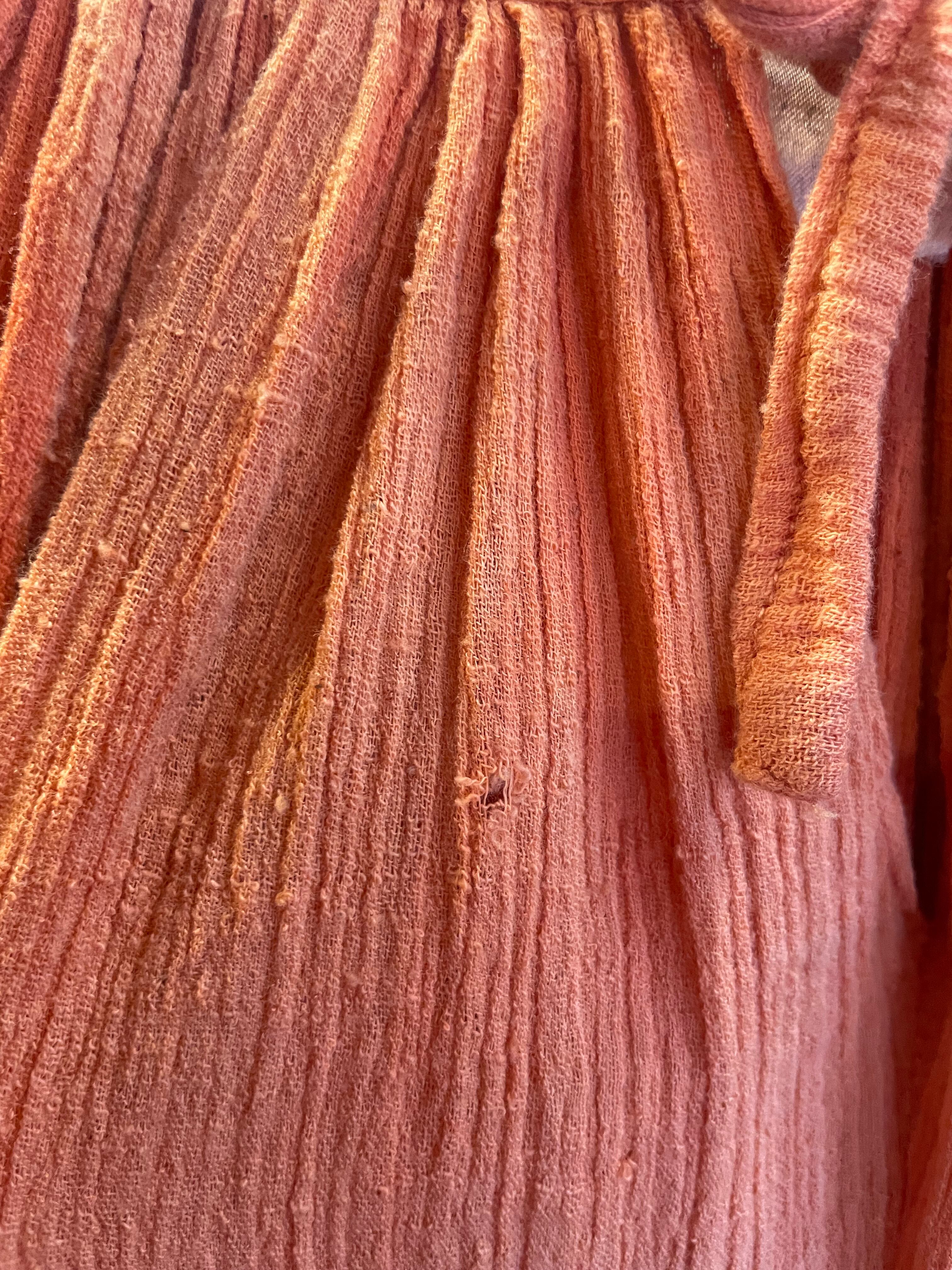 パキスタン製のざらっとした薄手のコットンガーゼをたっぷり贅沢に使用されており、風通しが良く肌触りも気持ち良いですし大人で雰囲気のある1着だと思います。