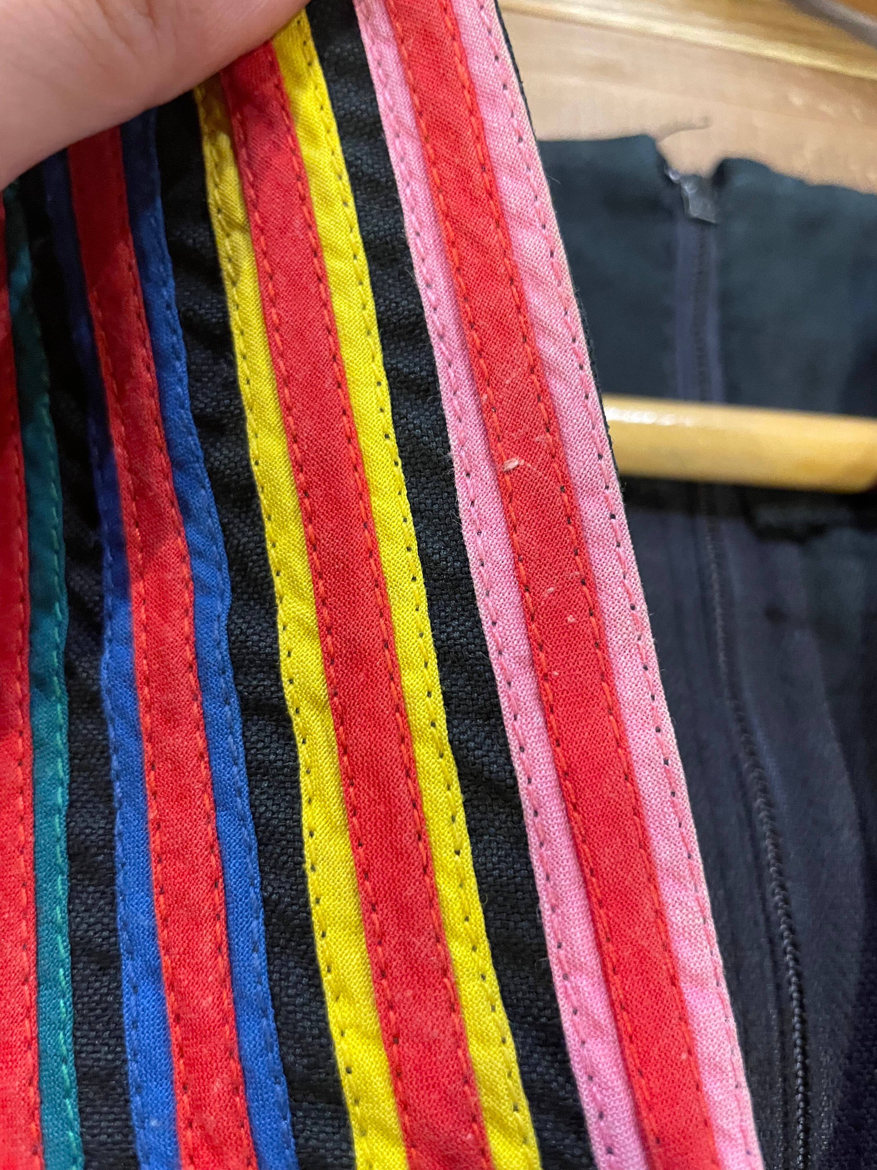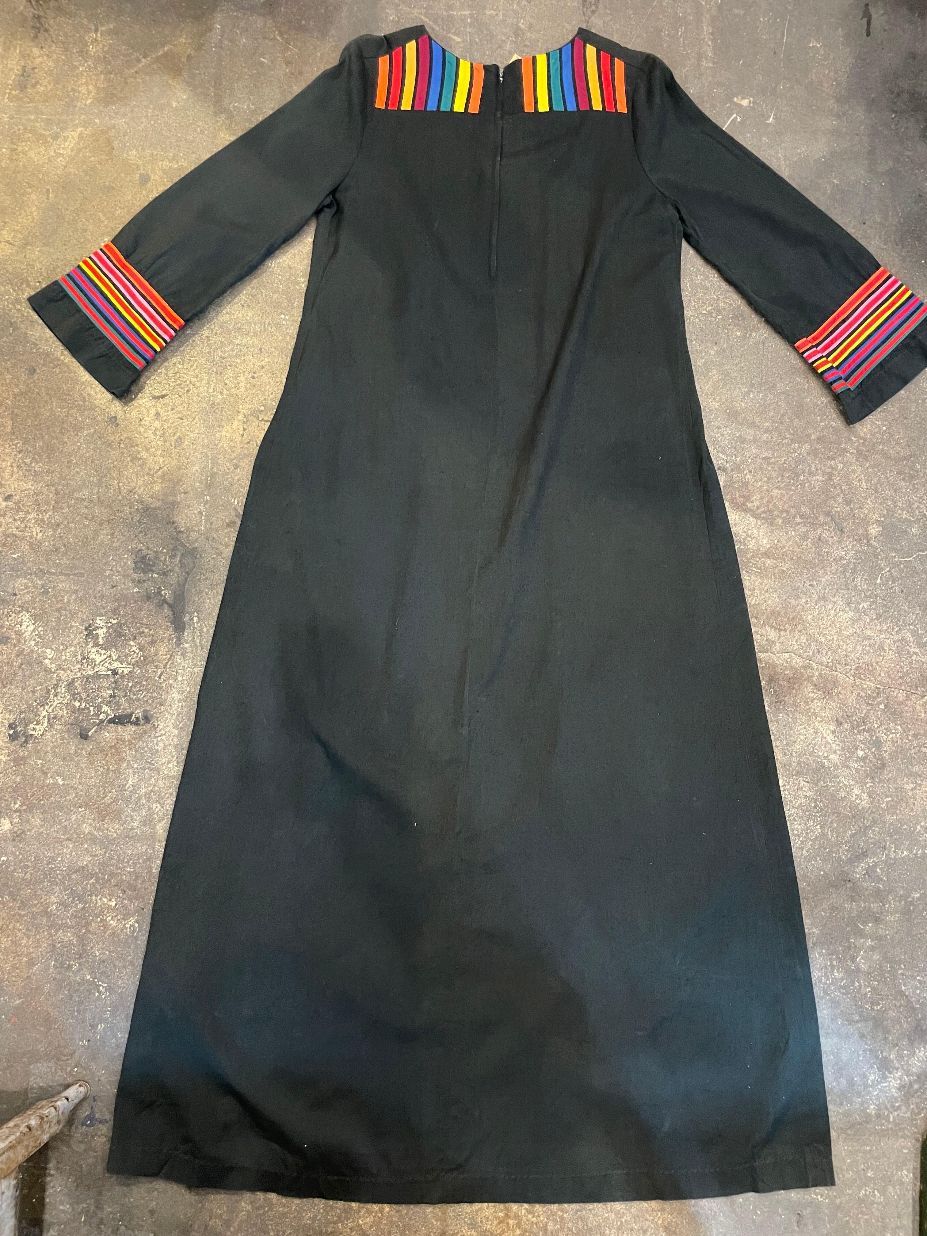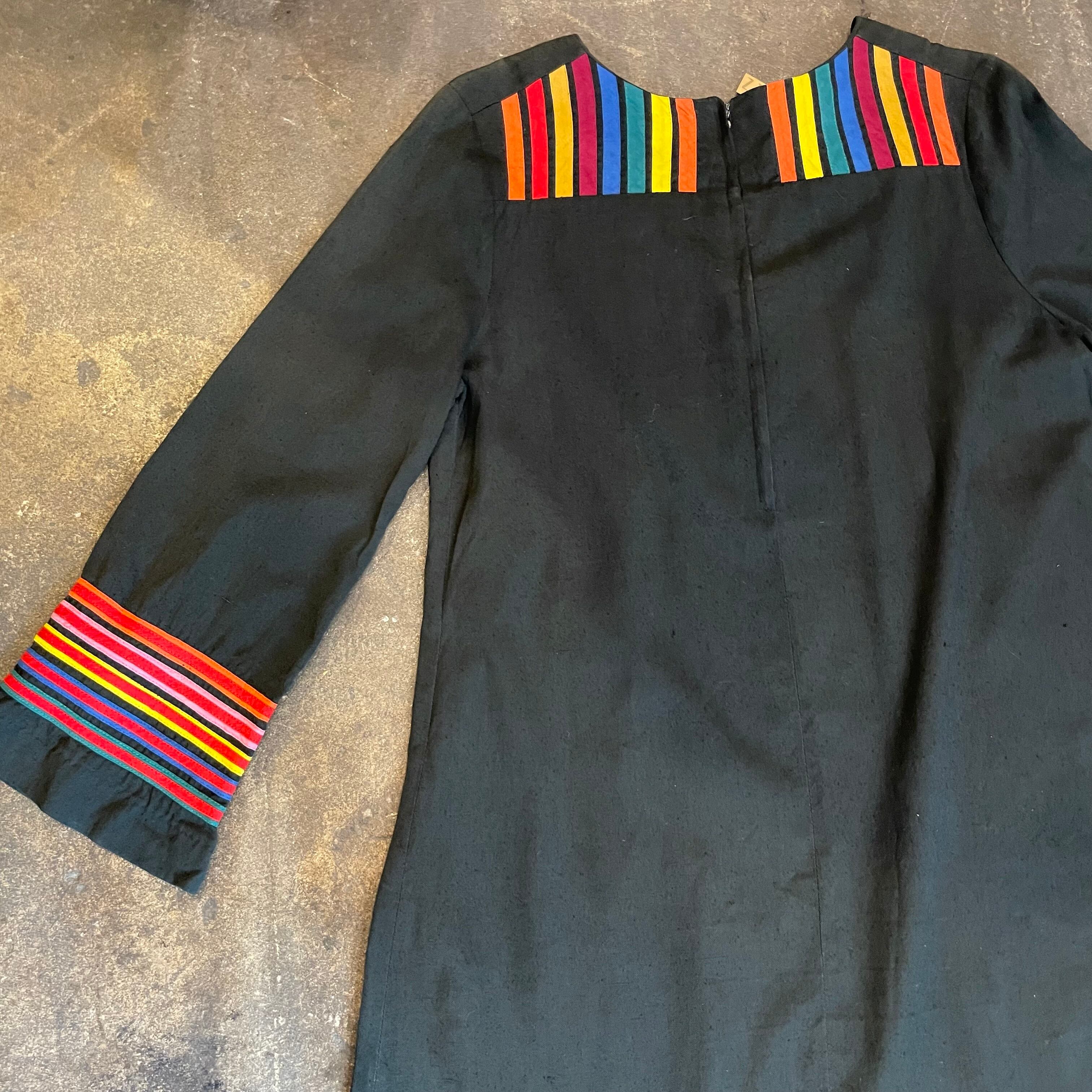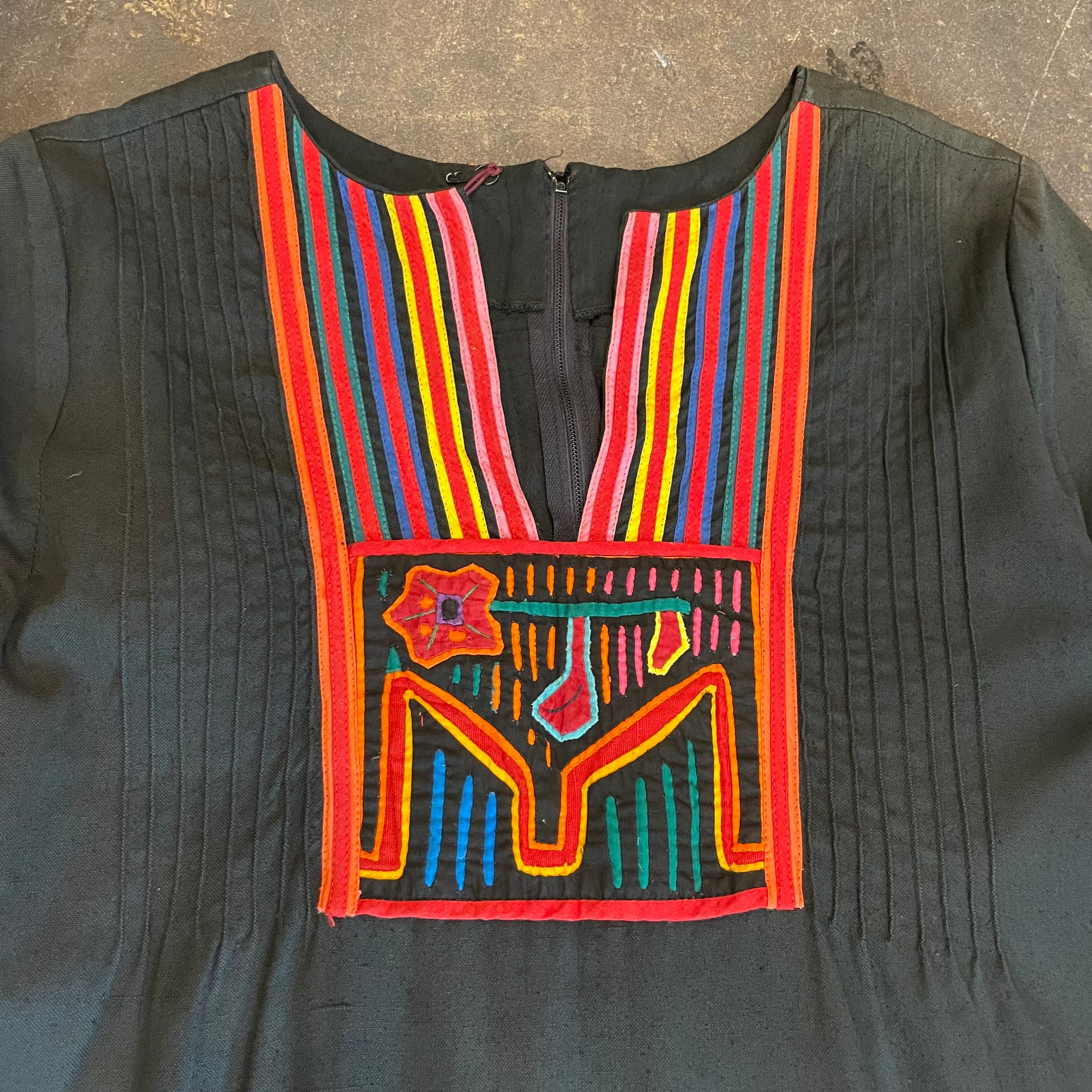 黒ベースにカラフルラインのパッチワーク、胸元のお花とMのような形のパッチワークが歪で下手ウマでとてもかわいい70年代のワンピースです。