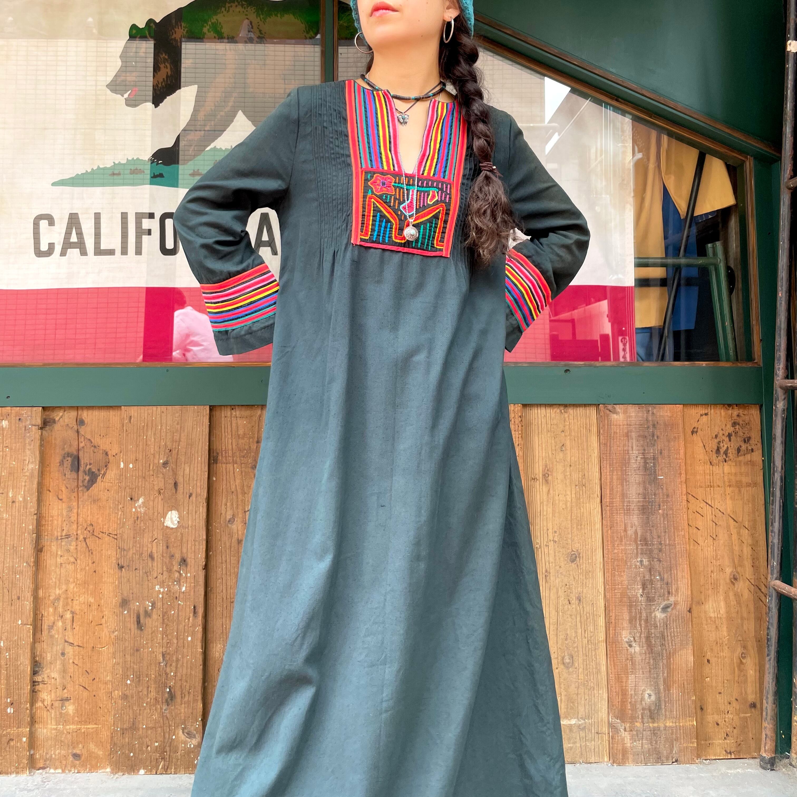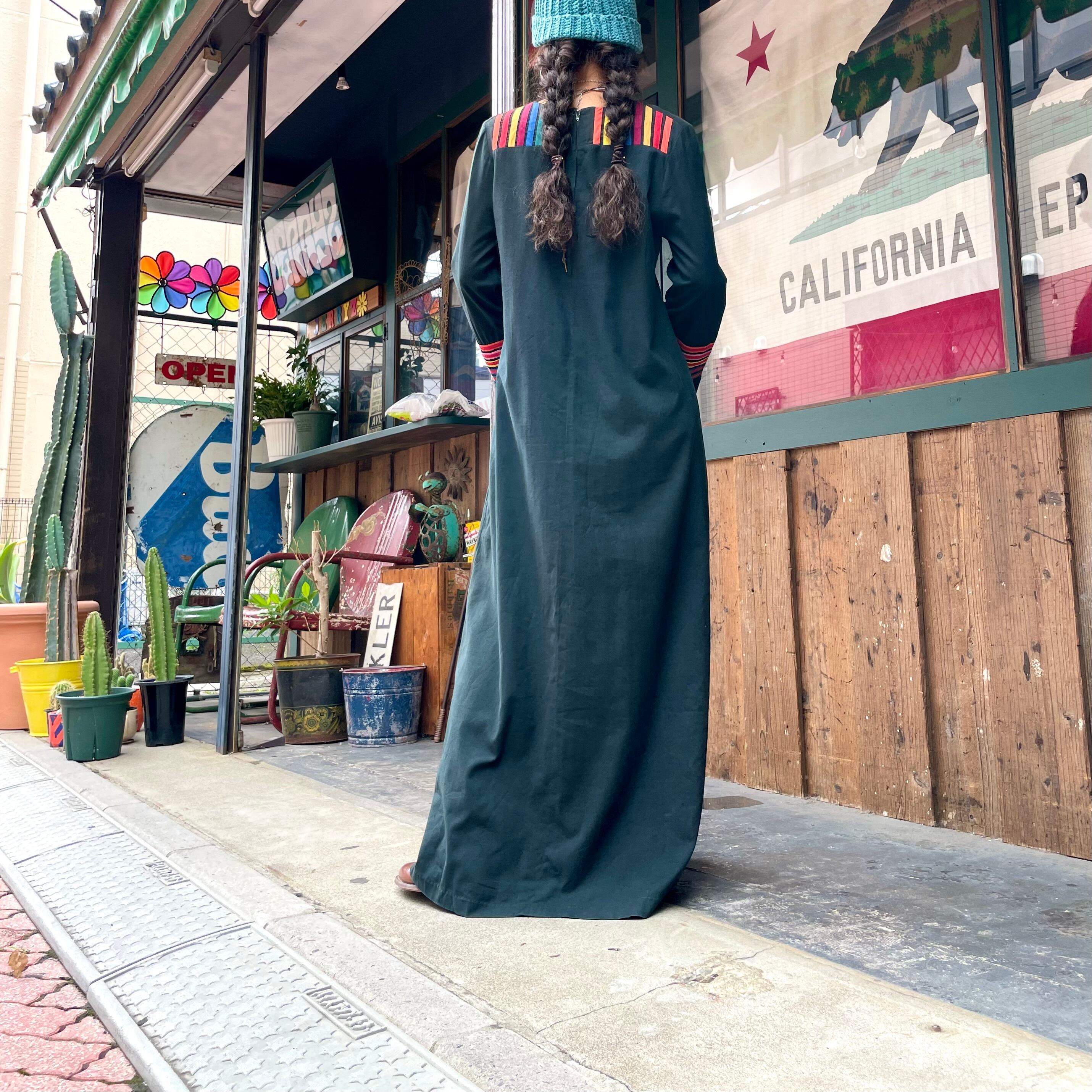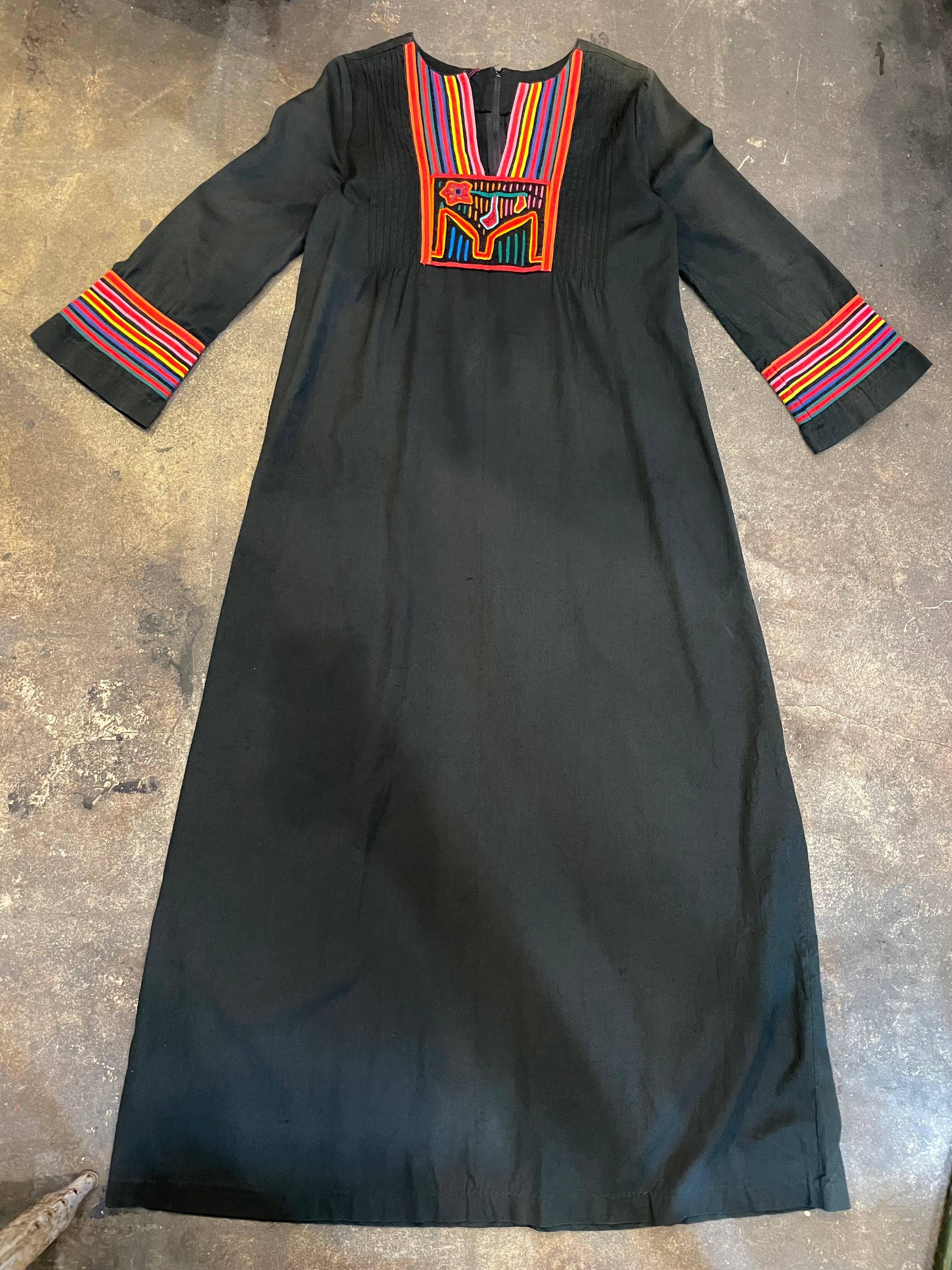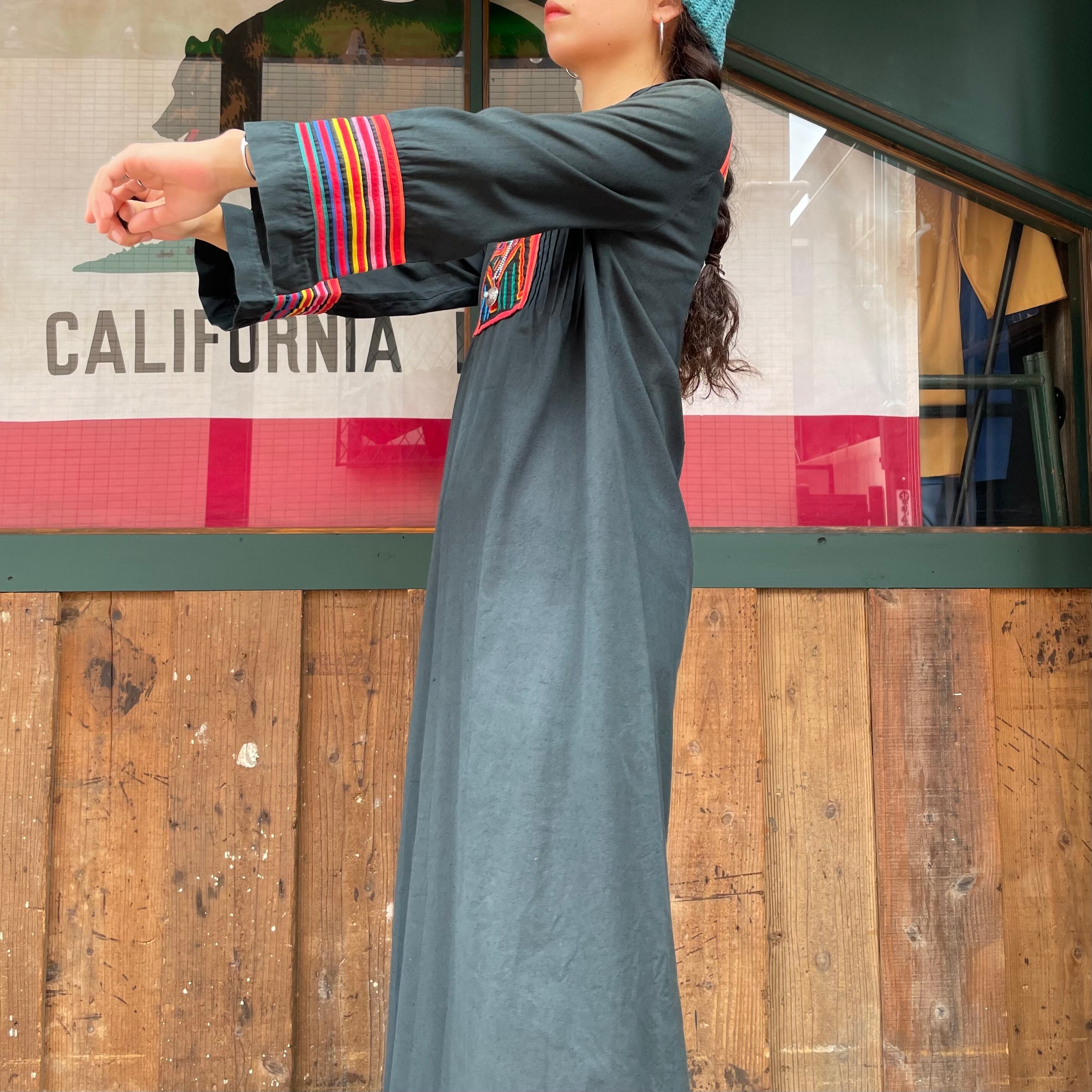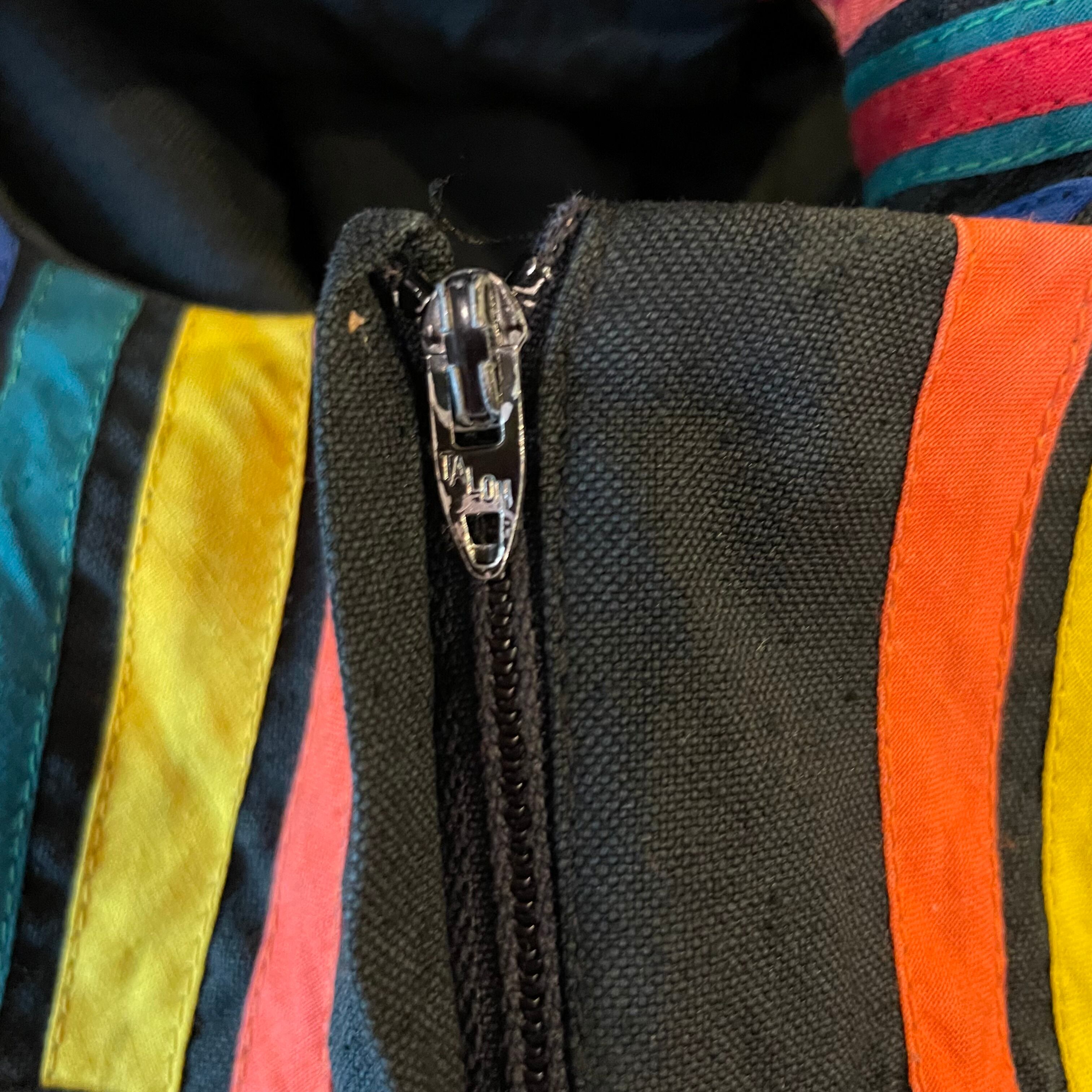 黒ベースにカラフルラインのパッチワーク、胸元のお花とMのような形のパッチワークが歪で下手ウマでとてもかわいい70年代のワンピースです。