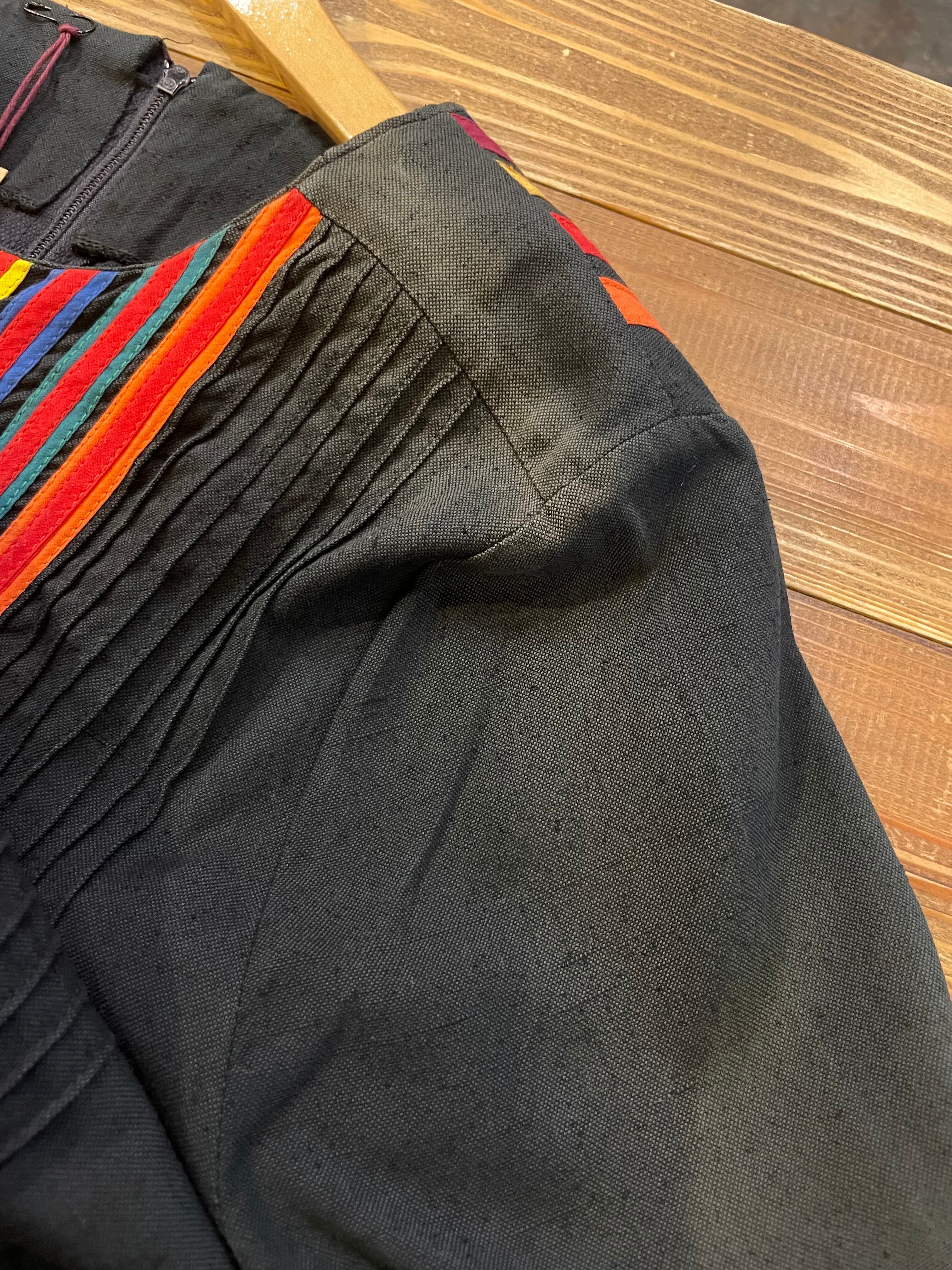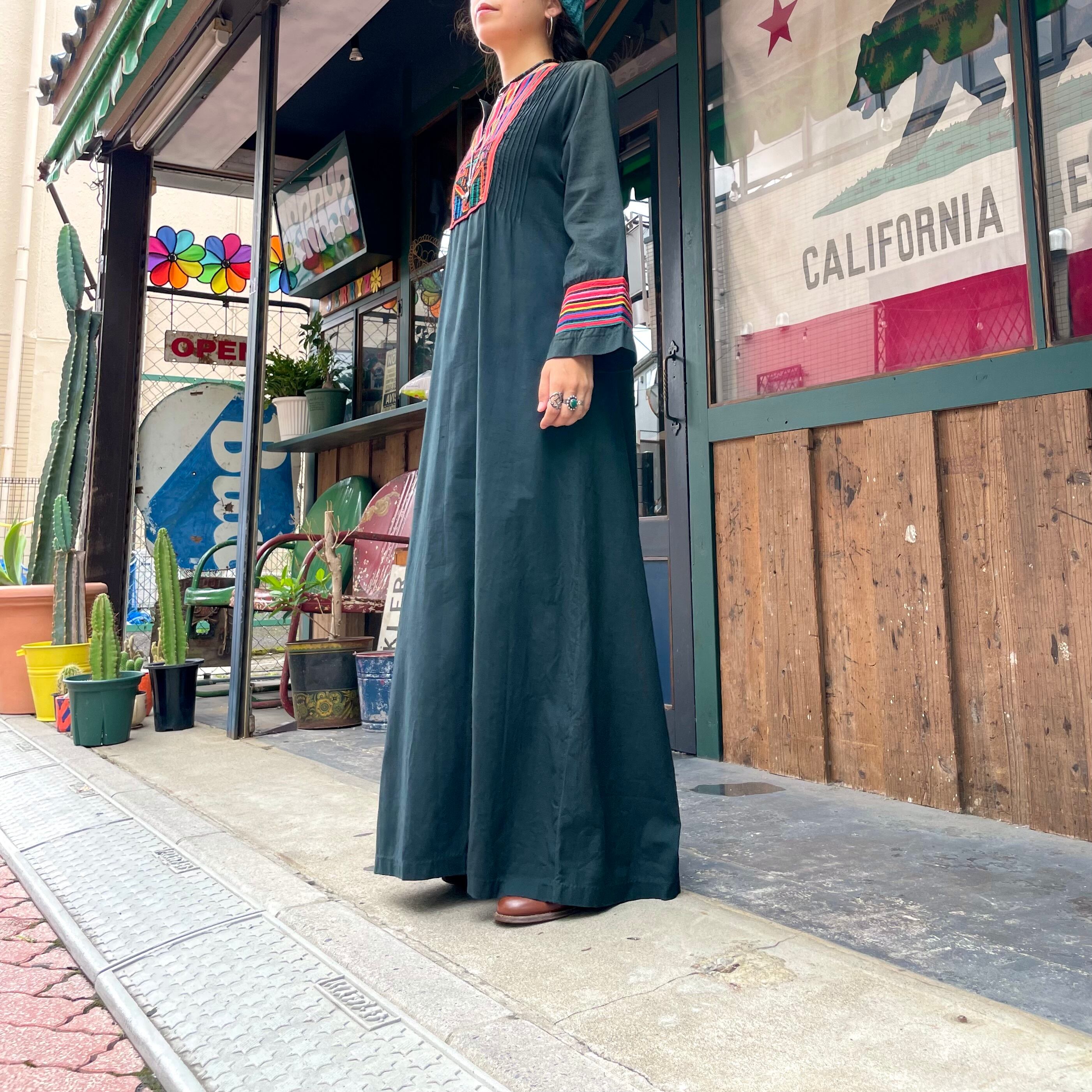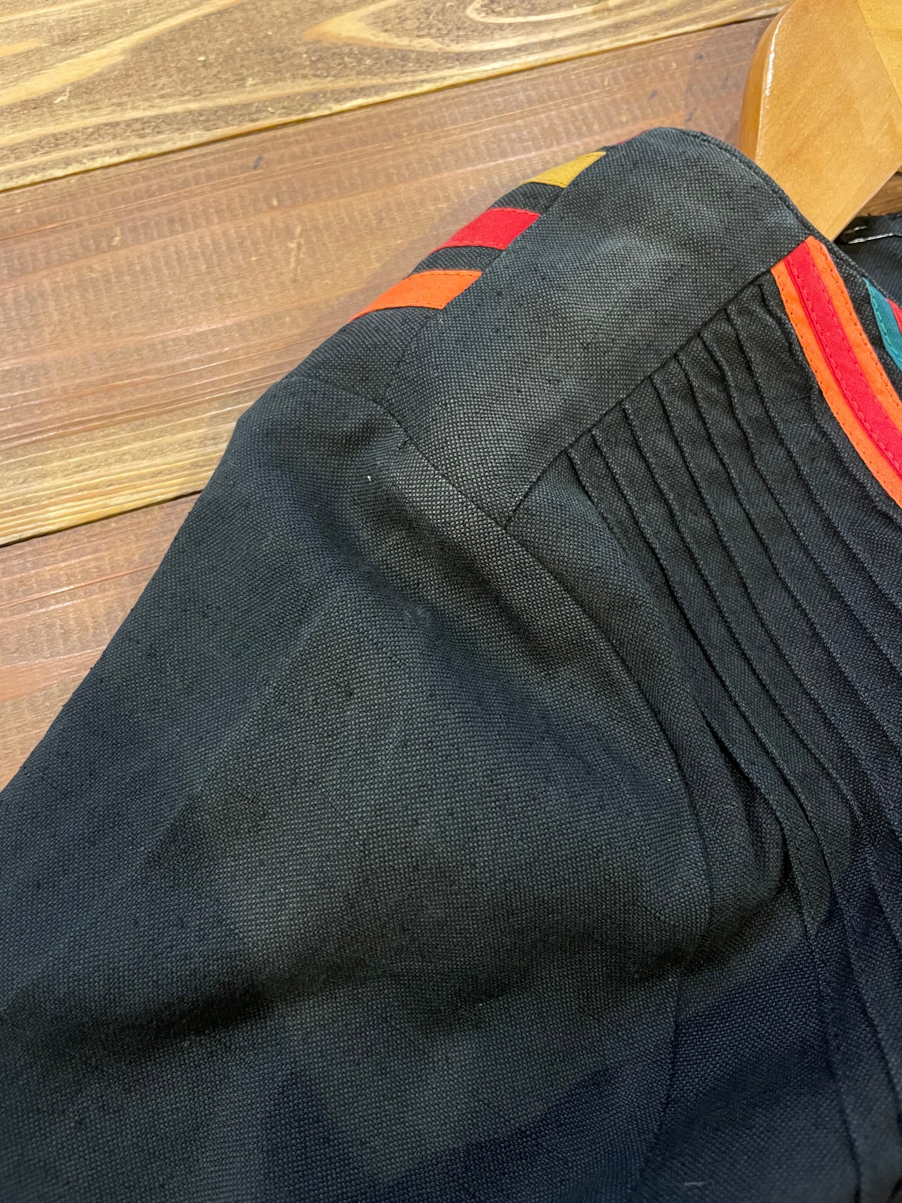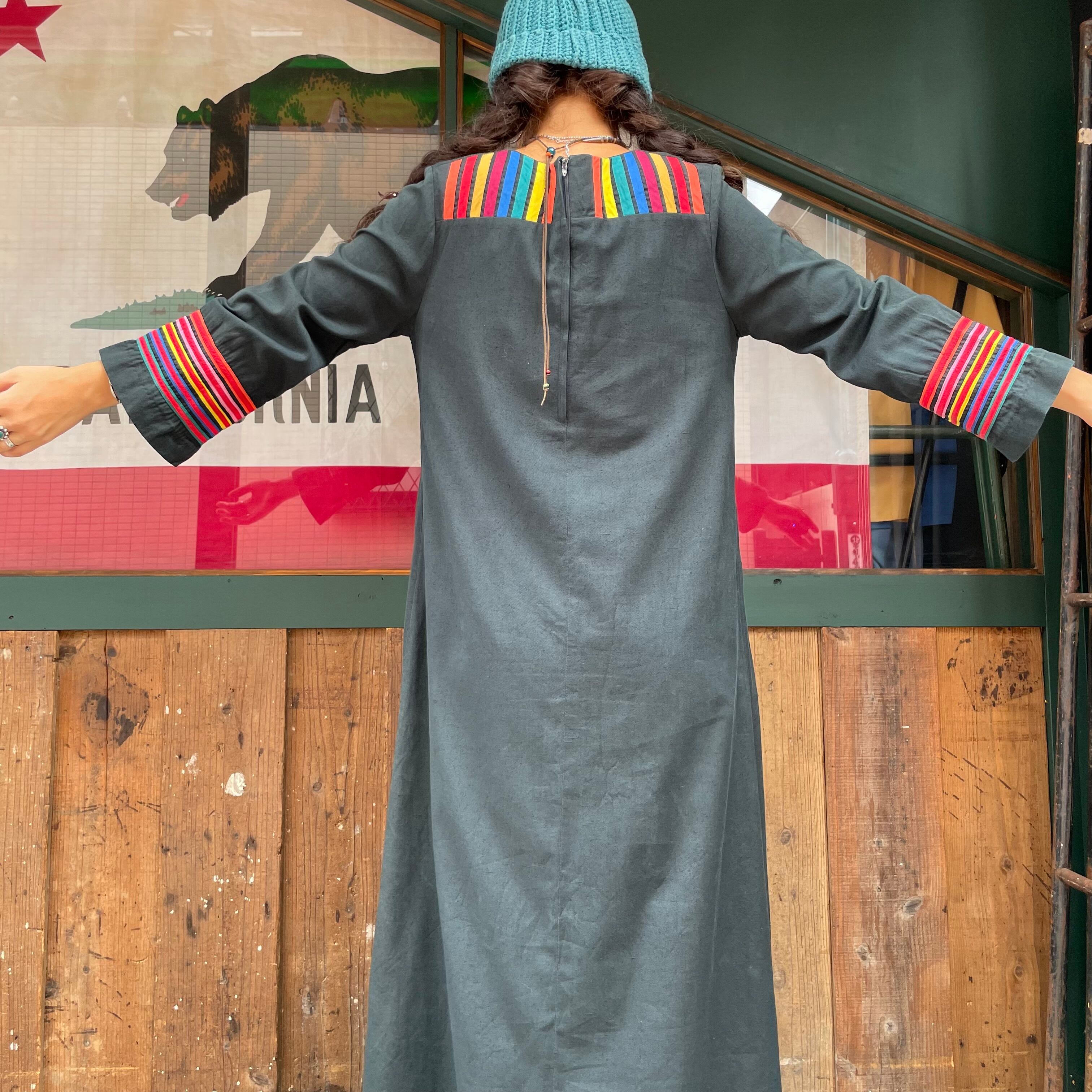黒ベースにカラフルラインのパッチワーク、胸元のお花とMのような形のパッチワークが歪で下手ウマでとてもかわいい70年代のワンピースです。