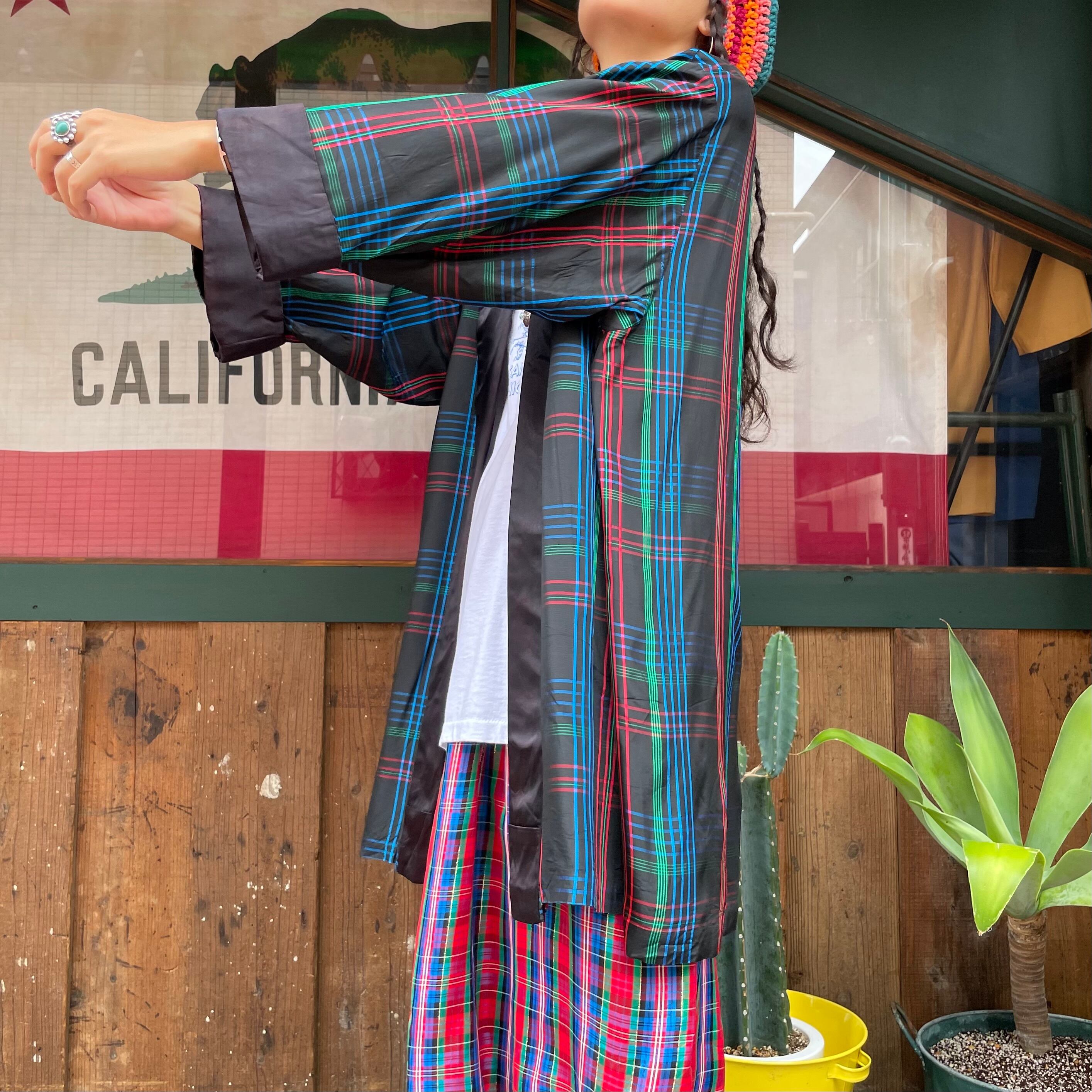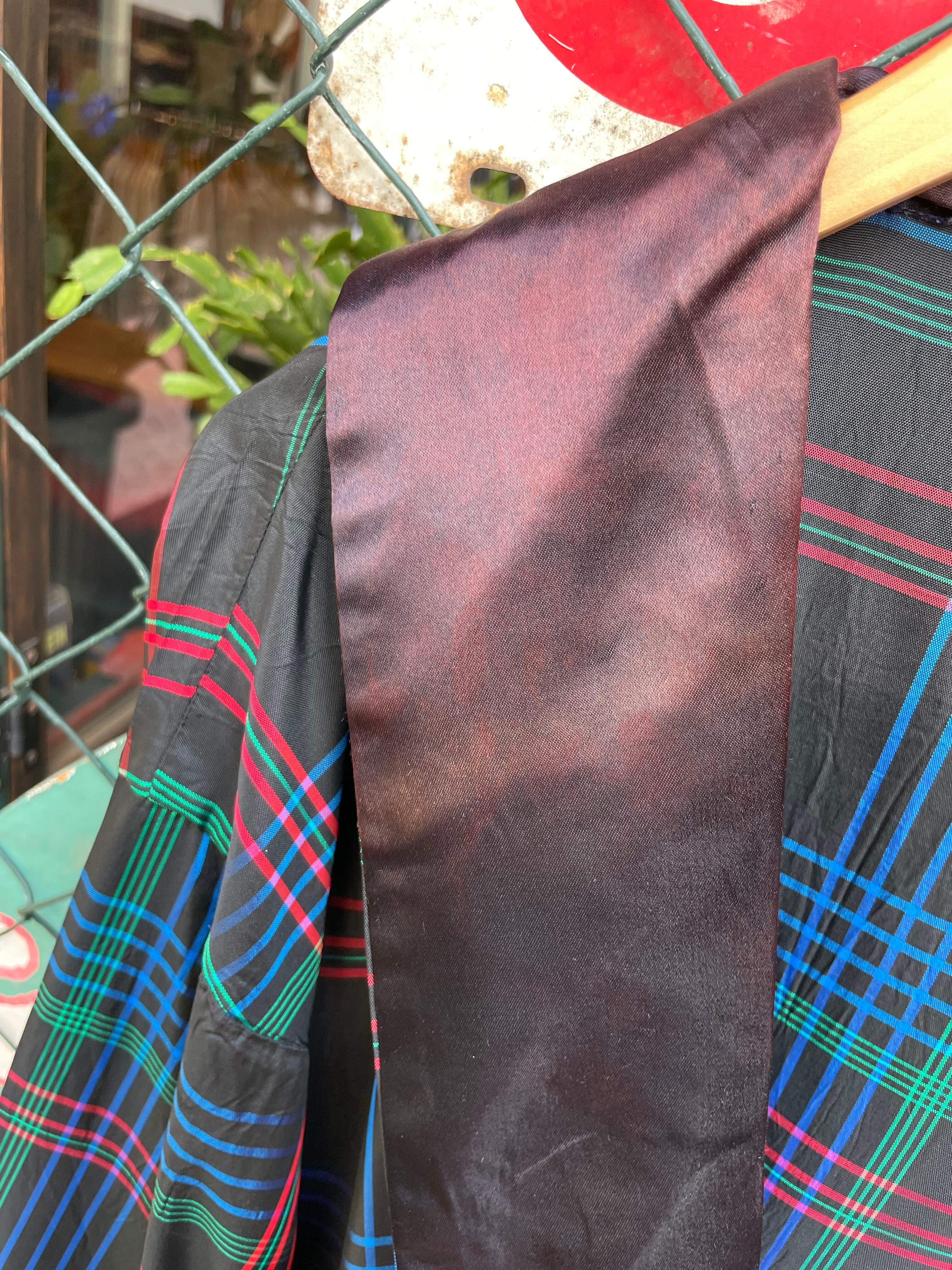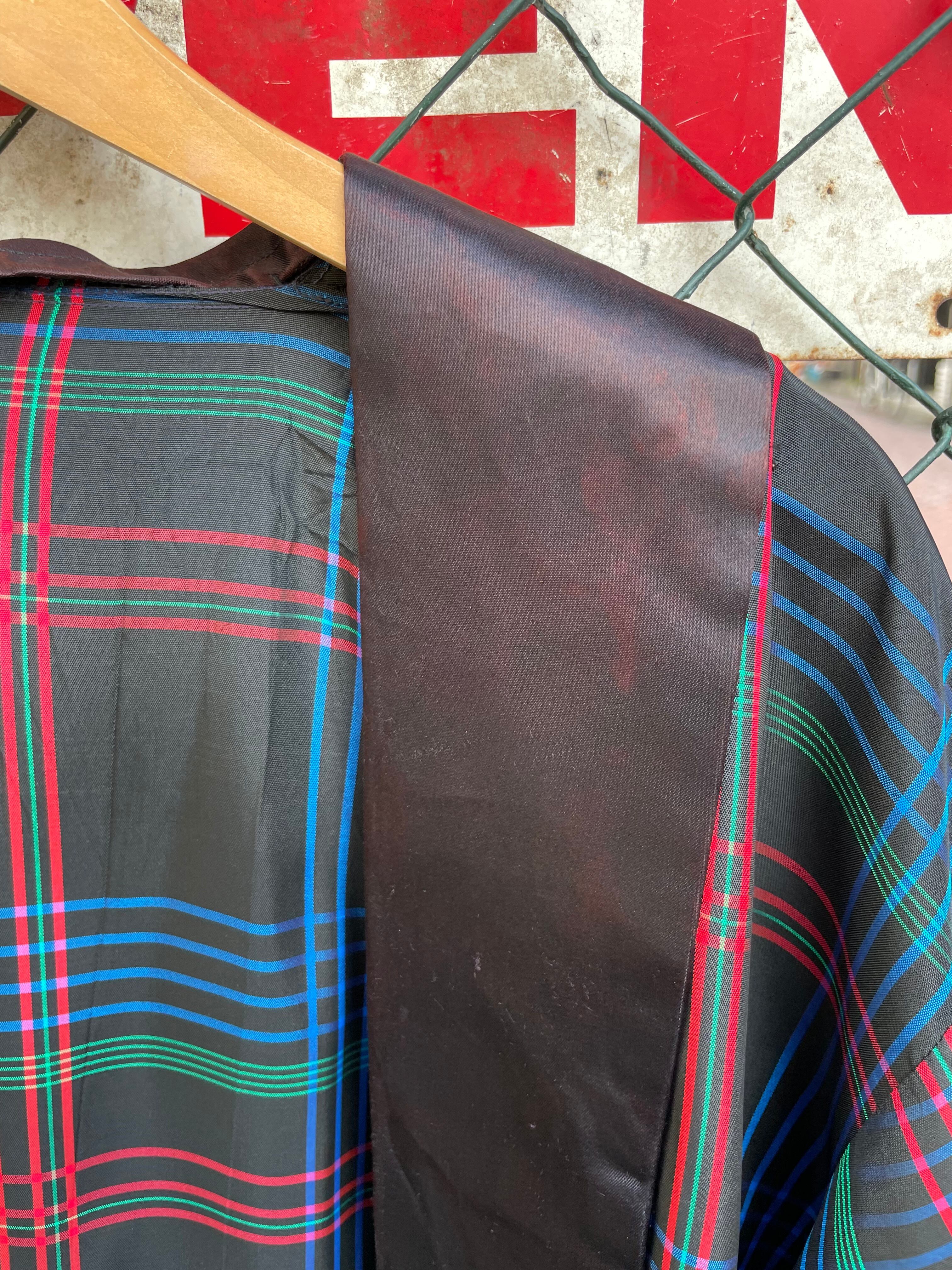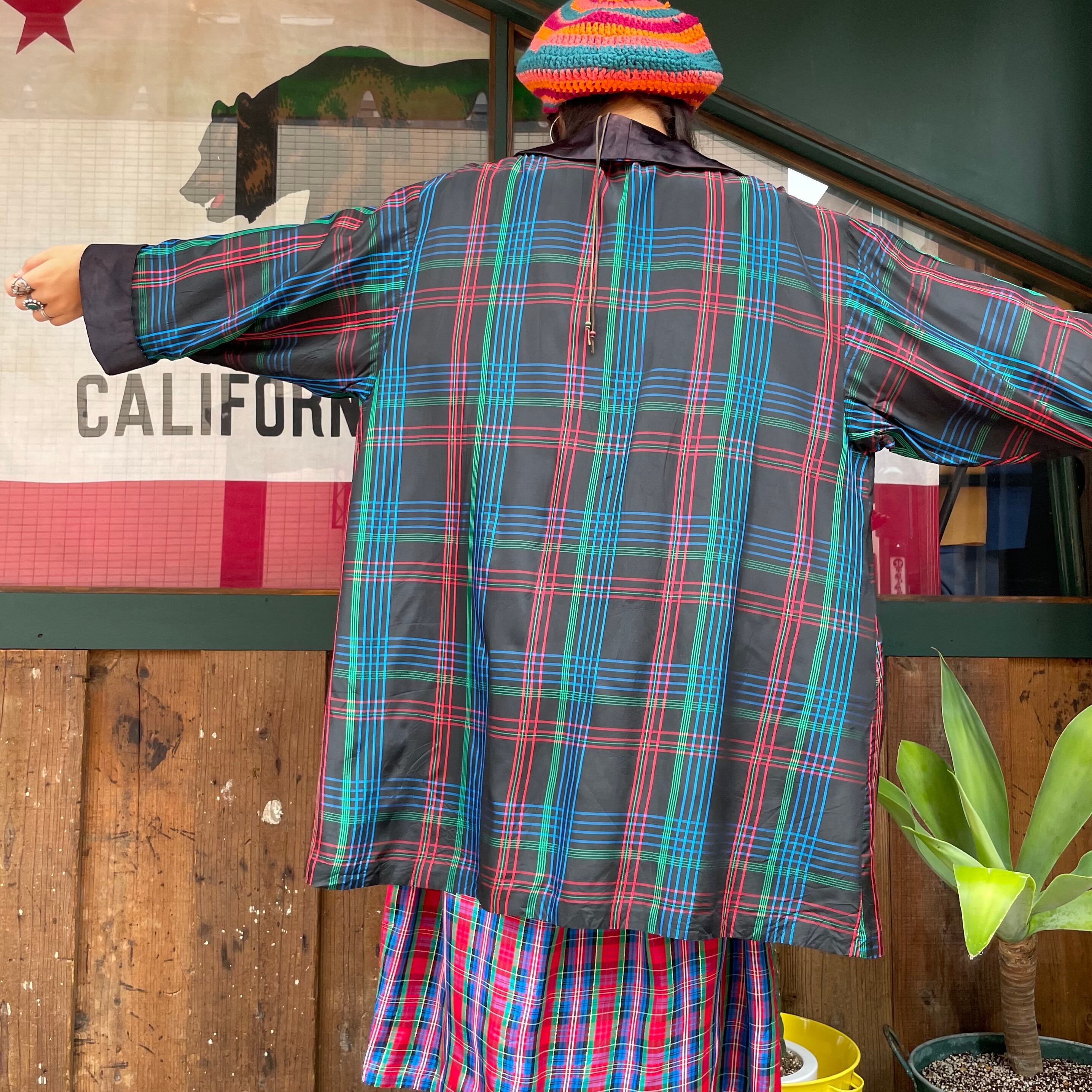 黒ベースのチェック柄がかわいい、70年代頃のガウンです。カサカサした軽い素材で気軽に羽織ってかわいい一枚です。