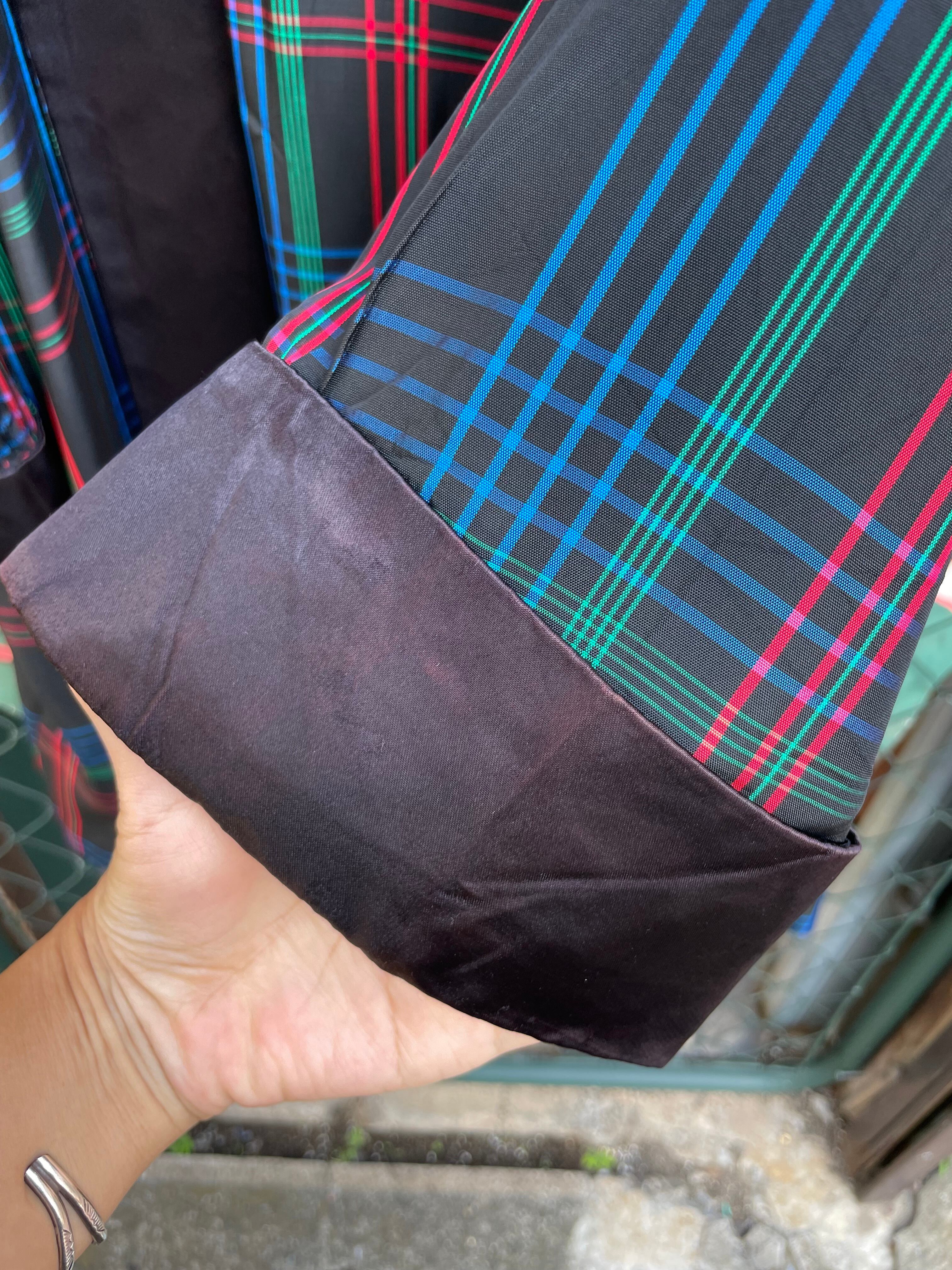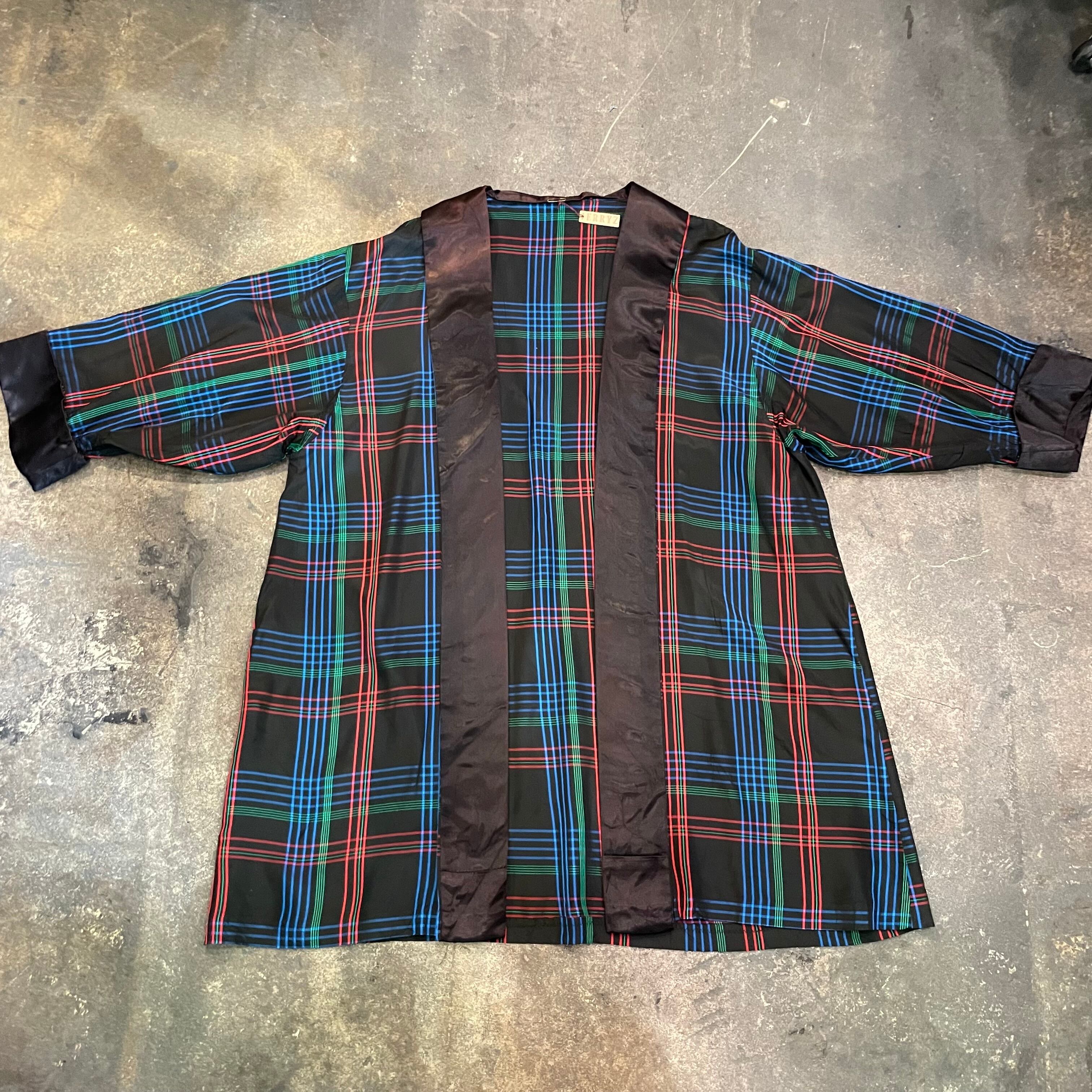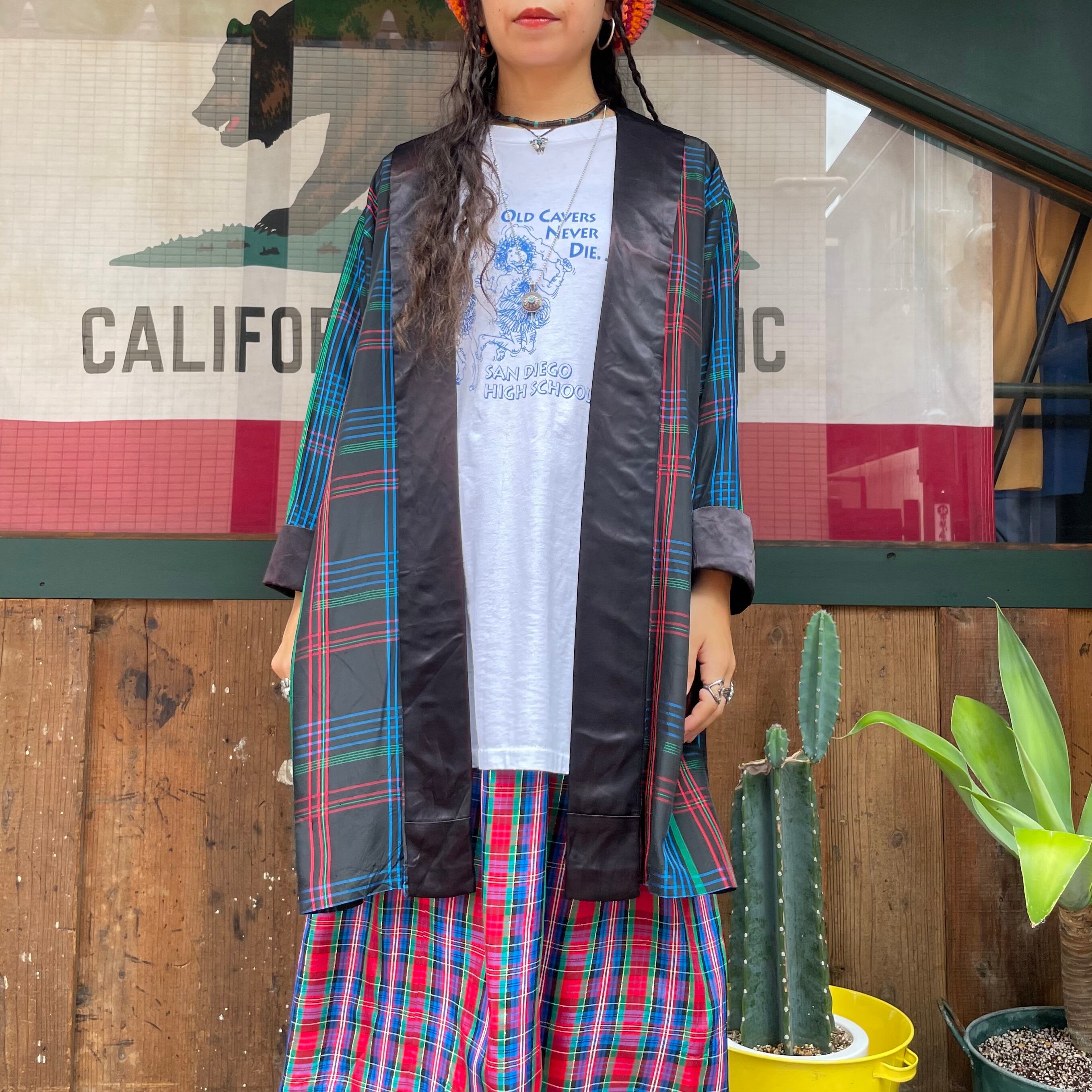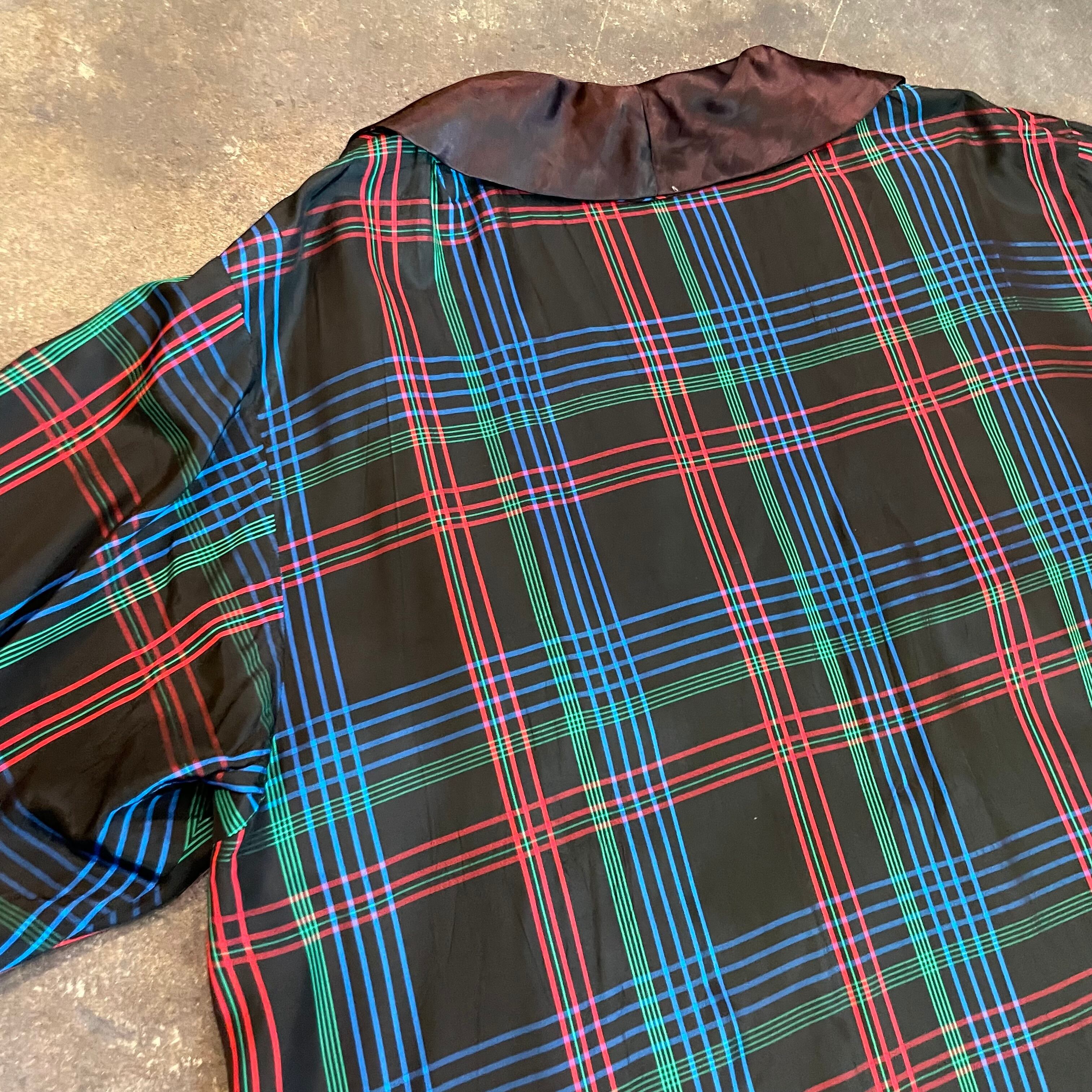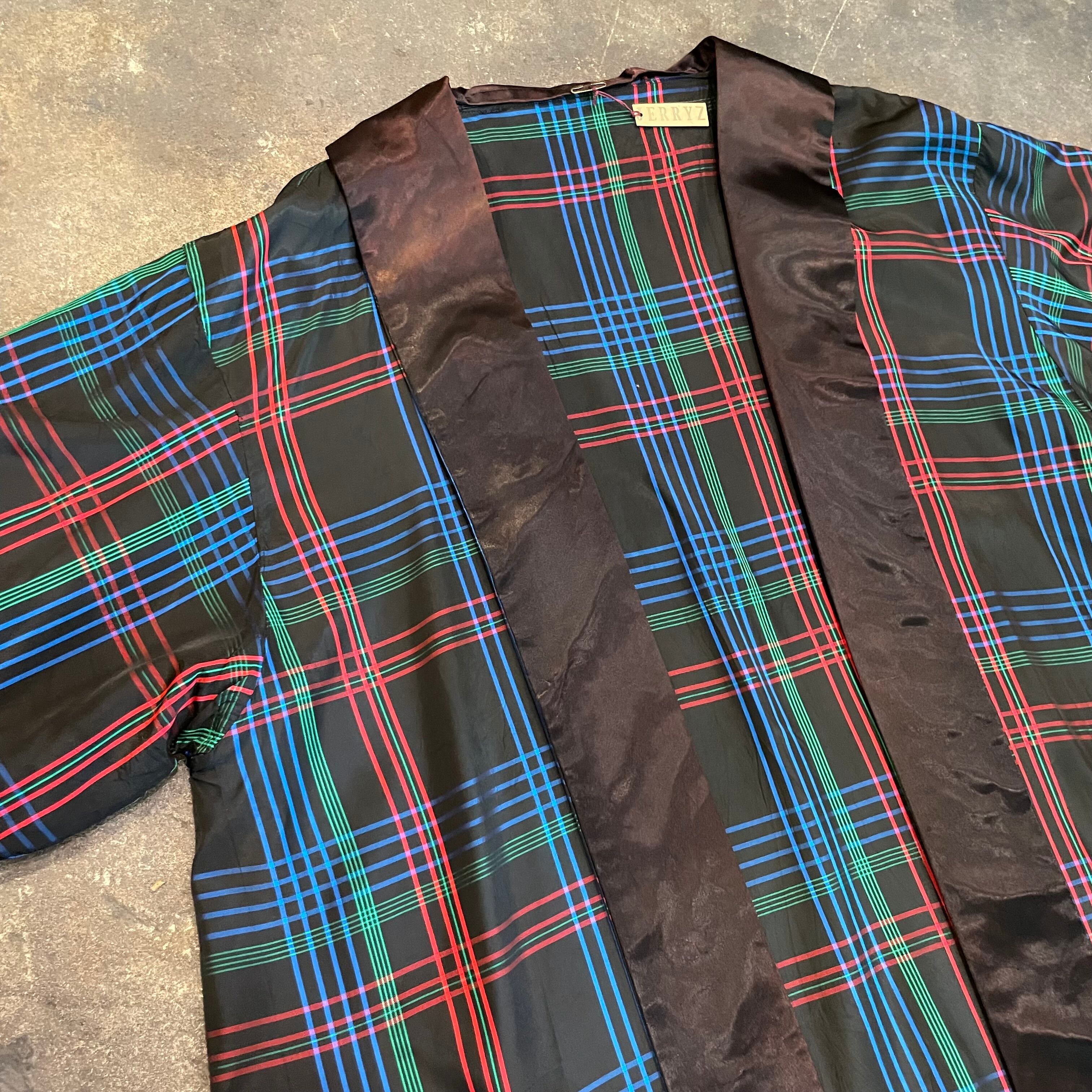黒ベースのチェック柄がかわいい、70年代頃のガウンです。カサカサした軽い素材で気軽に羽織ってかわいい一枚です。
