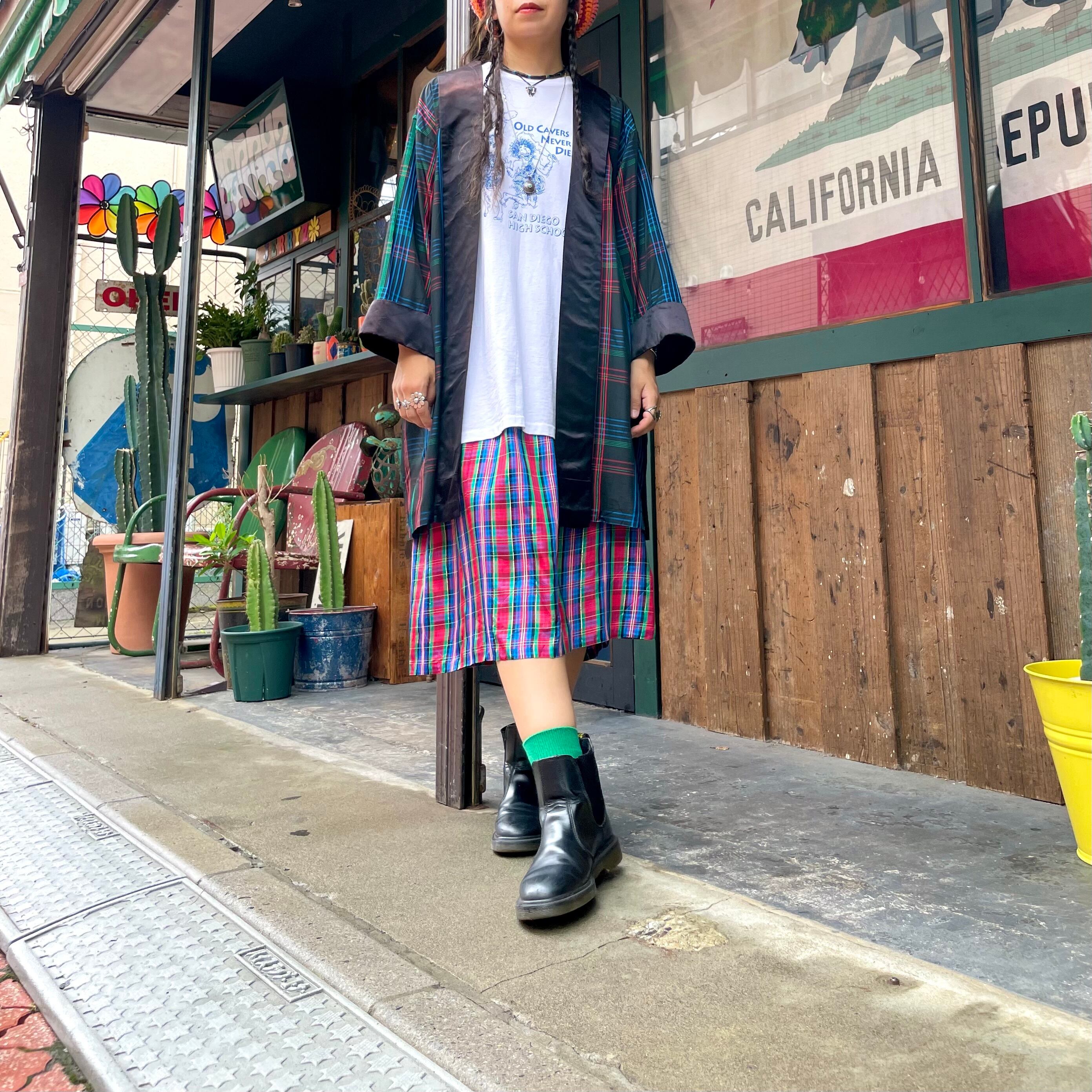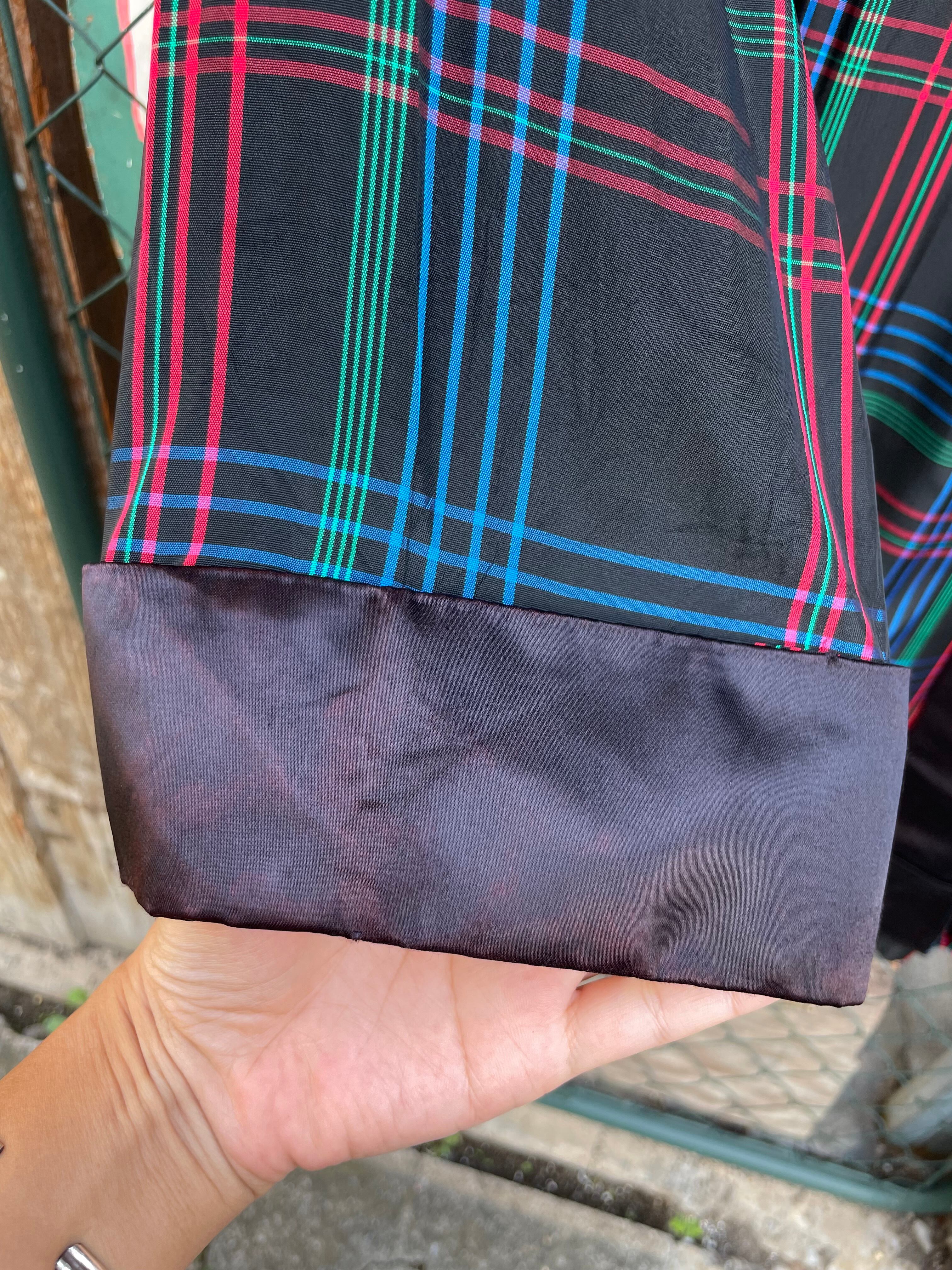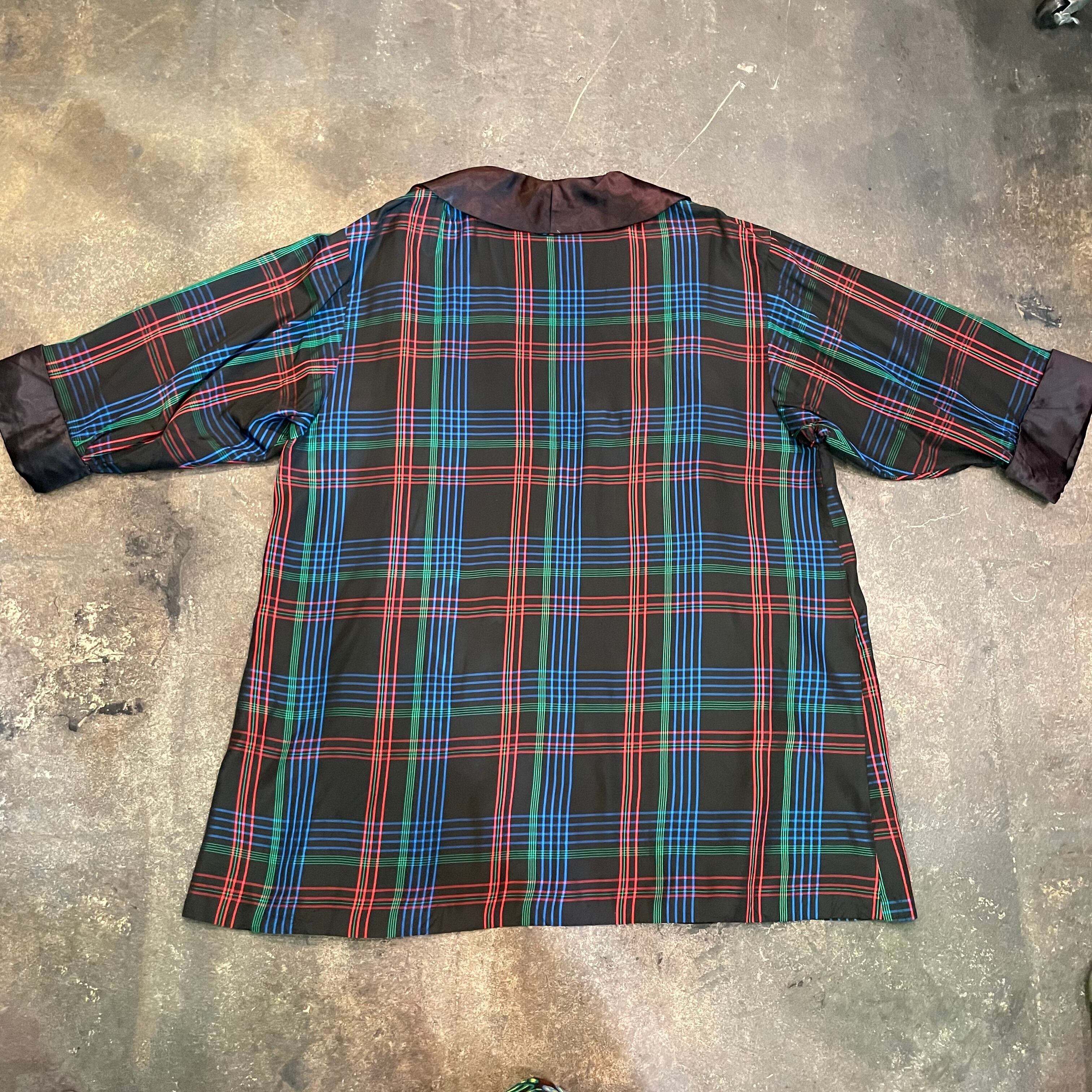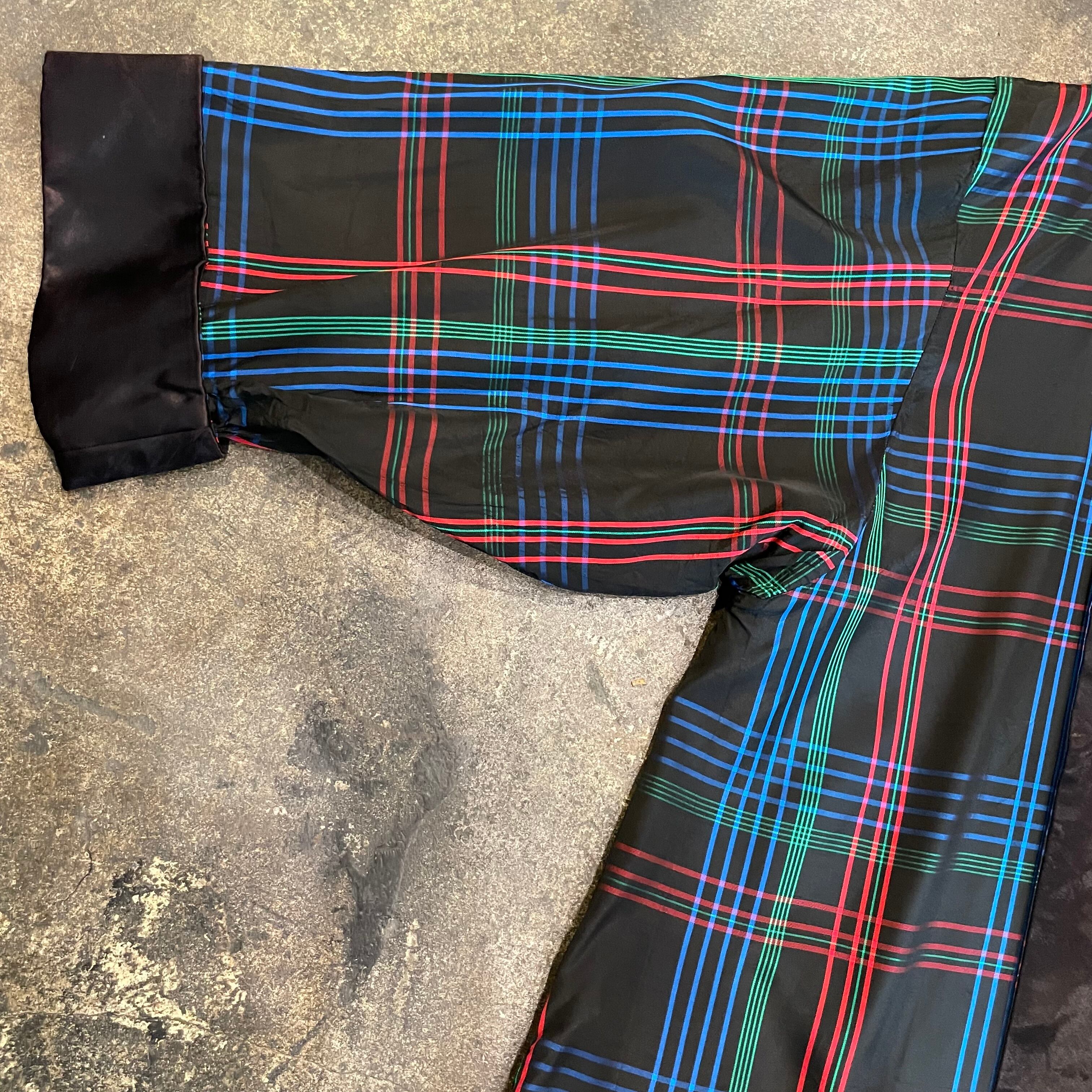 黒ベースのチェック柄がかわいい、70年代頃のガウンです。カサカサした軽い素材で気軽に羽織ってかわいい一枚です。