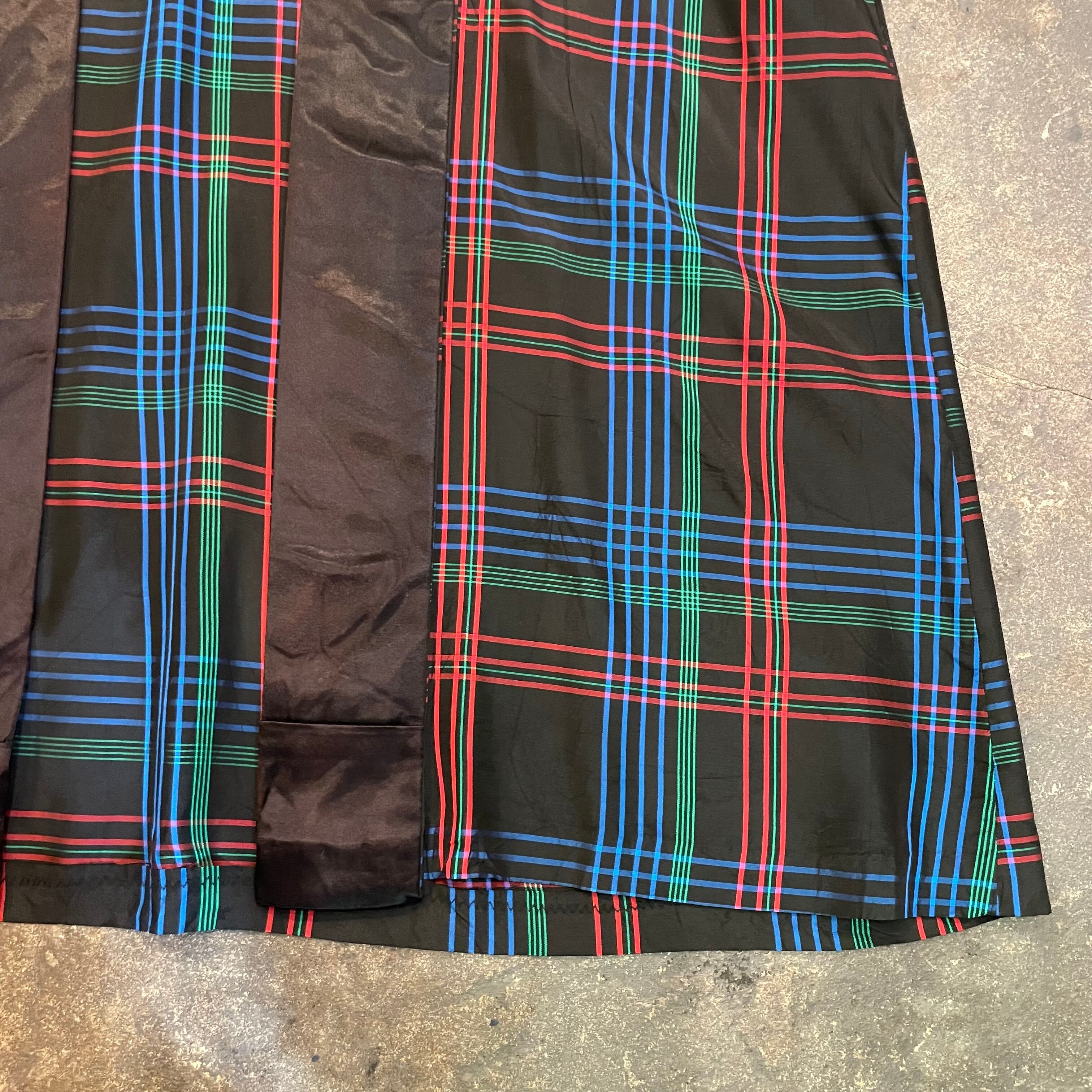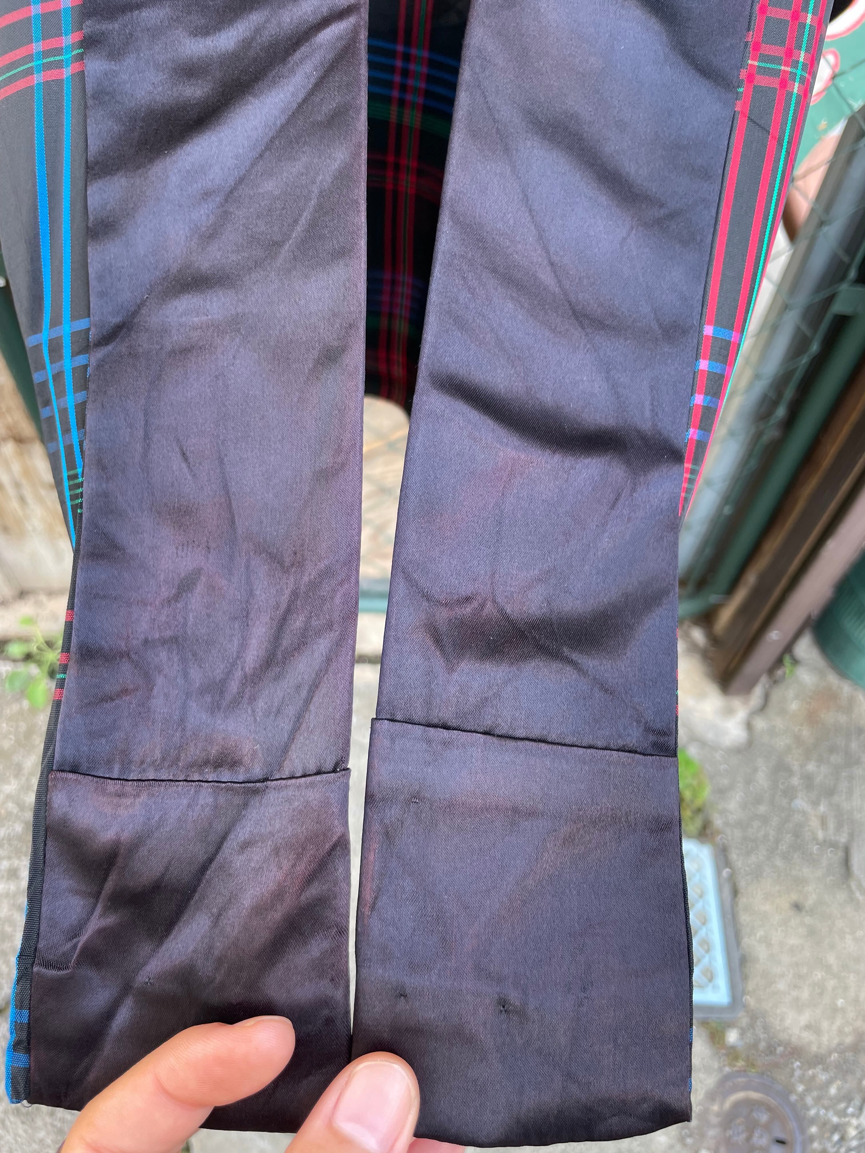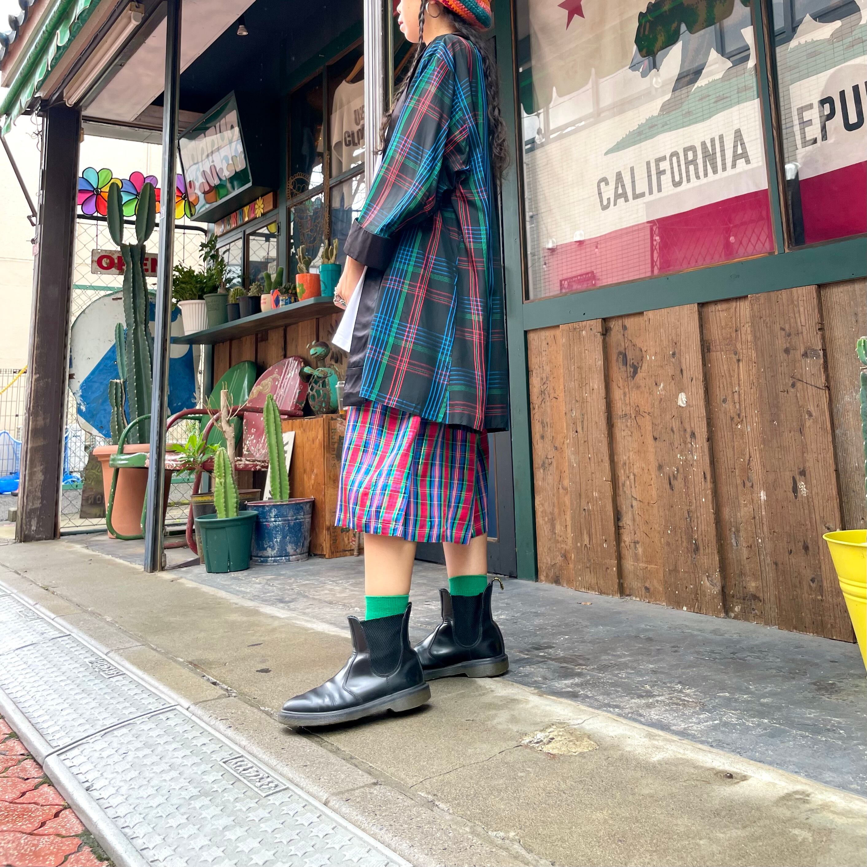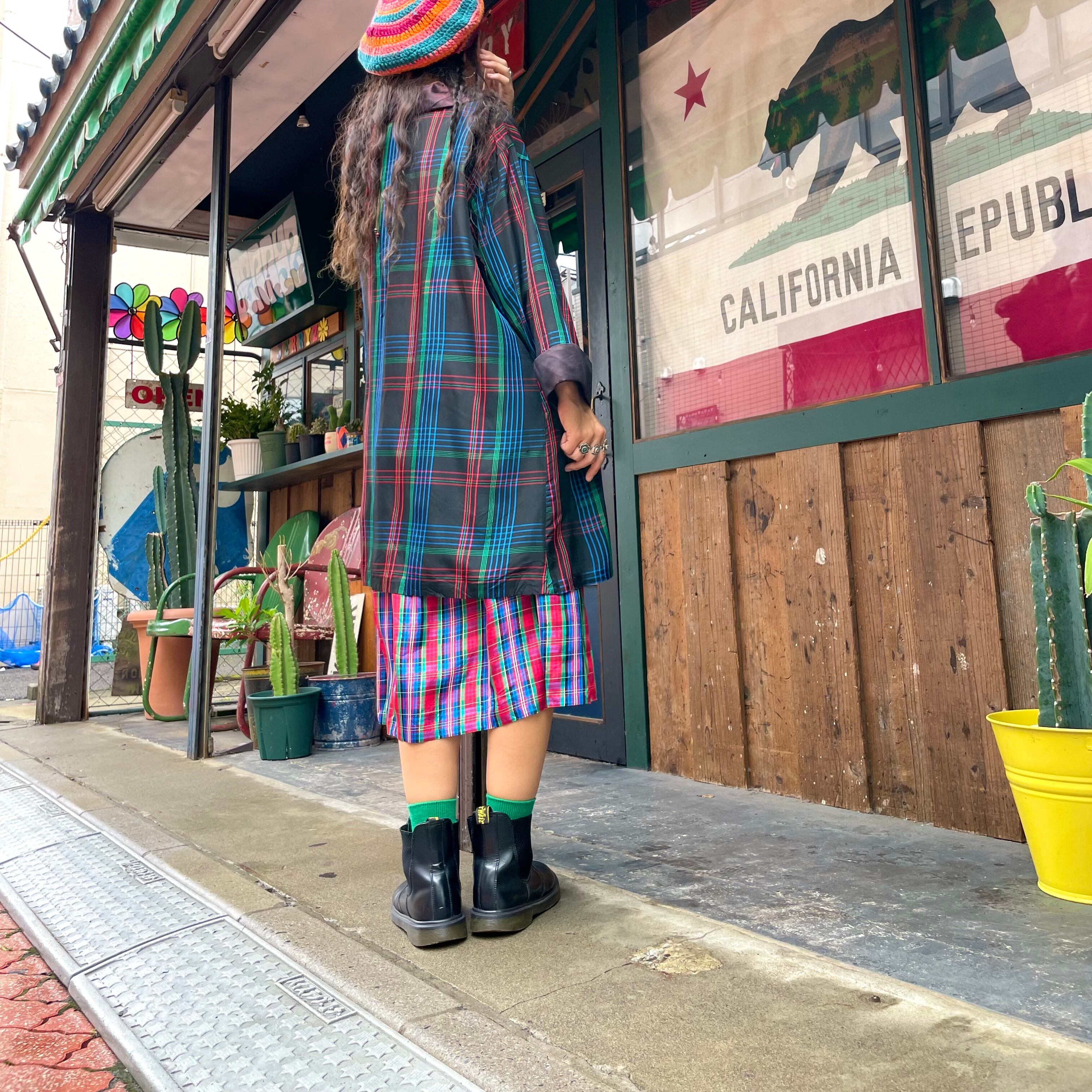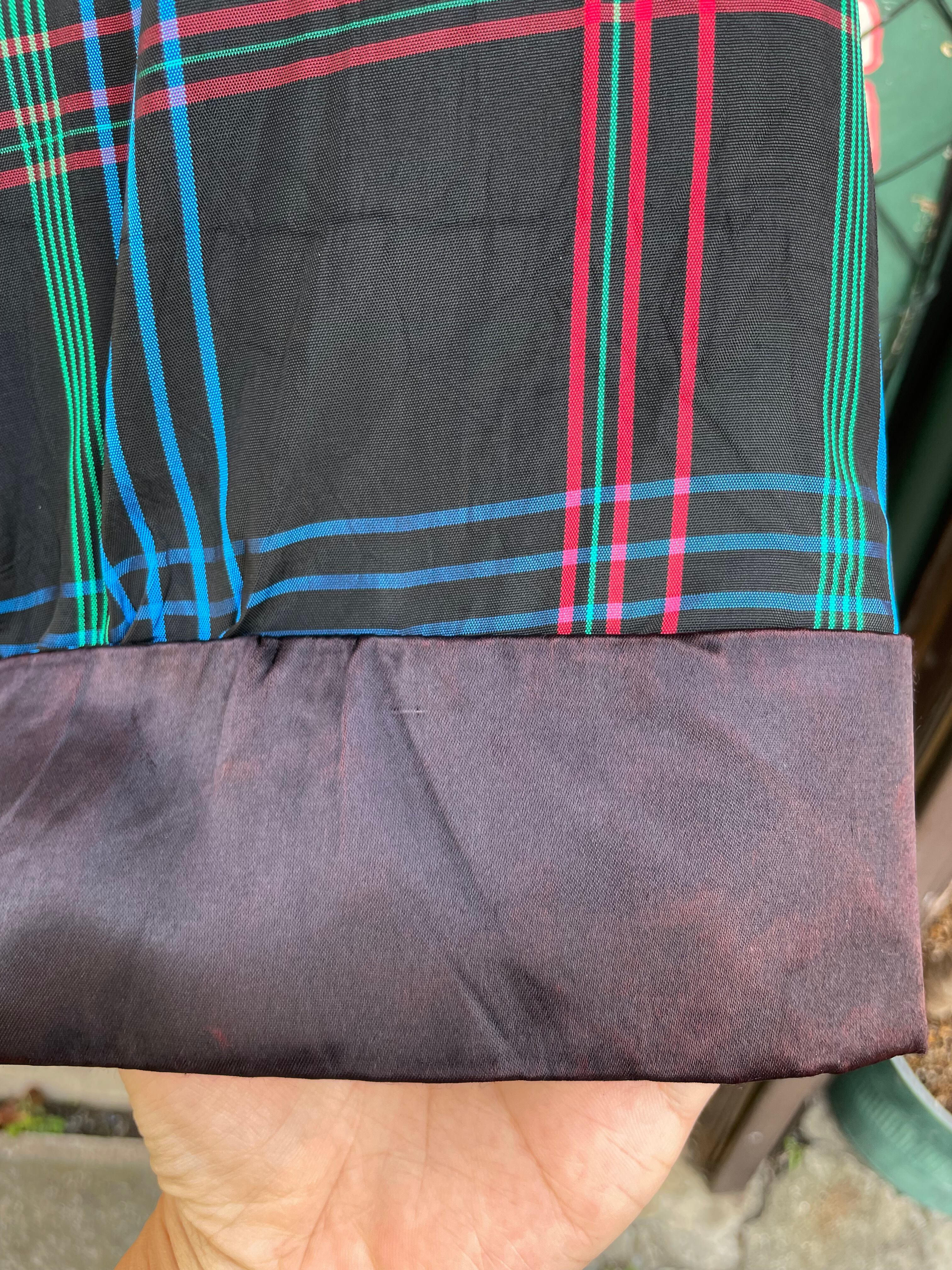 黒ベースのチェック柄がかわいい、70年代頃のガウンです。カサカサした軽い素材で気軽に羽織ってかわいい一枚です。