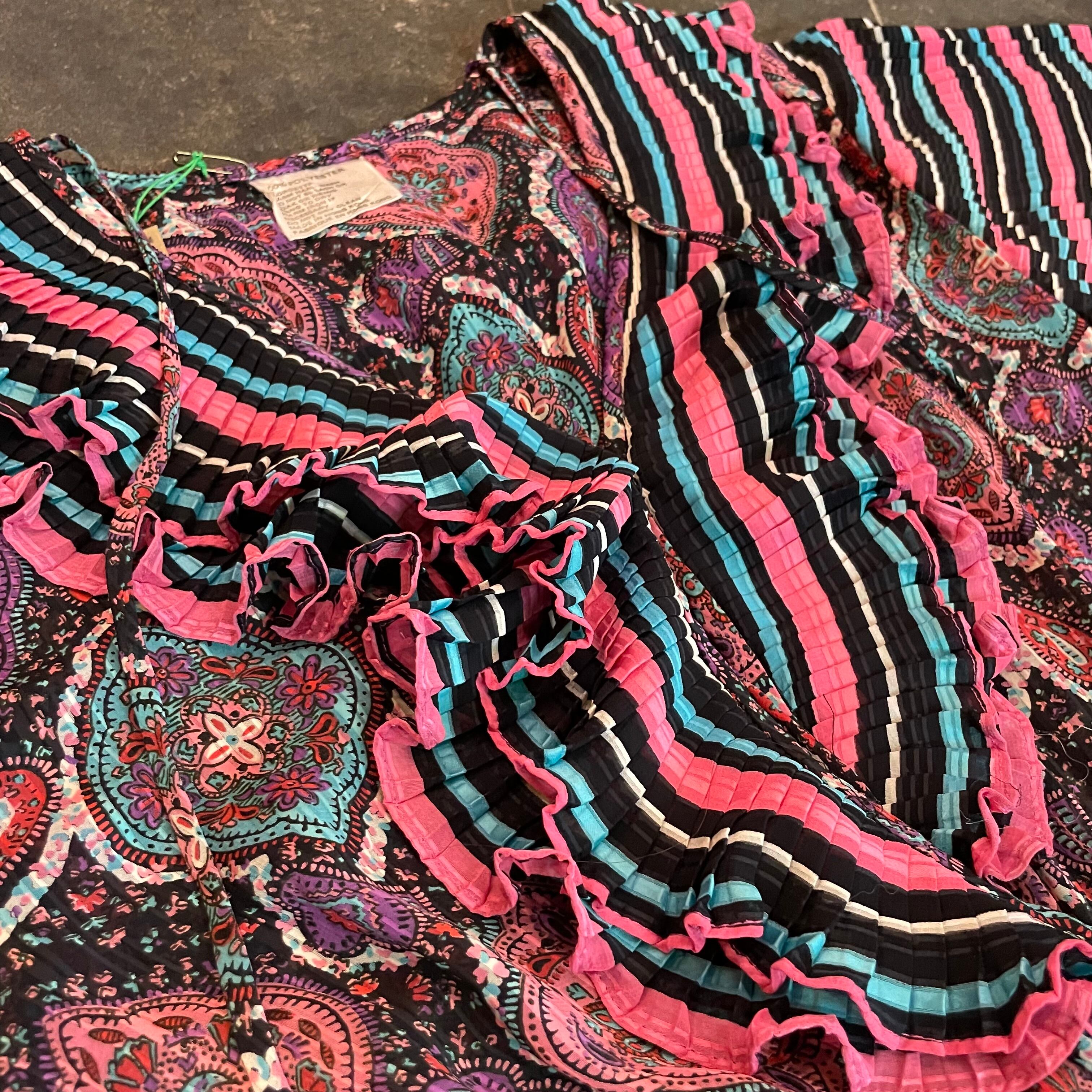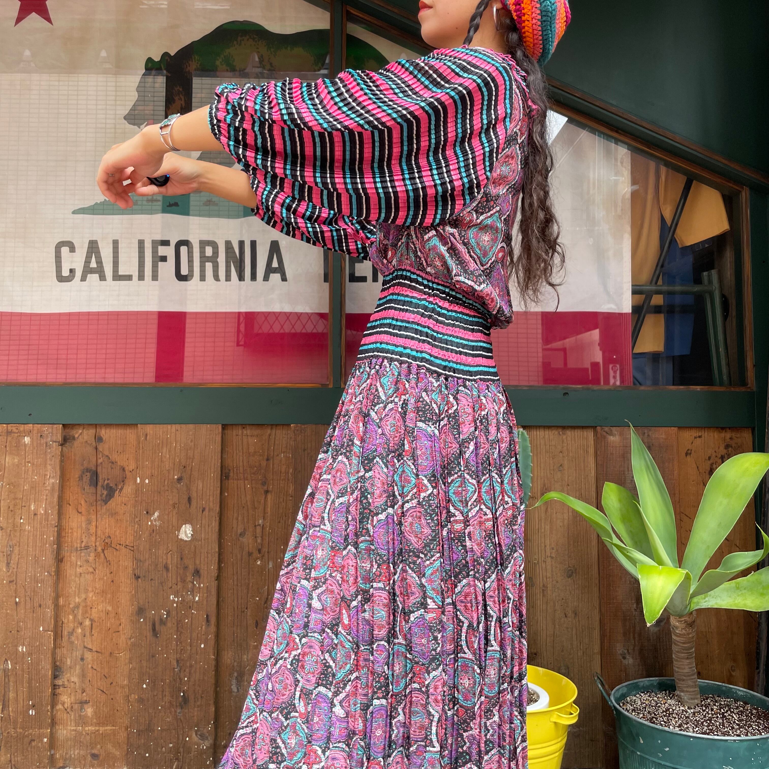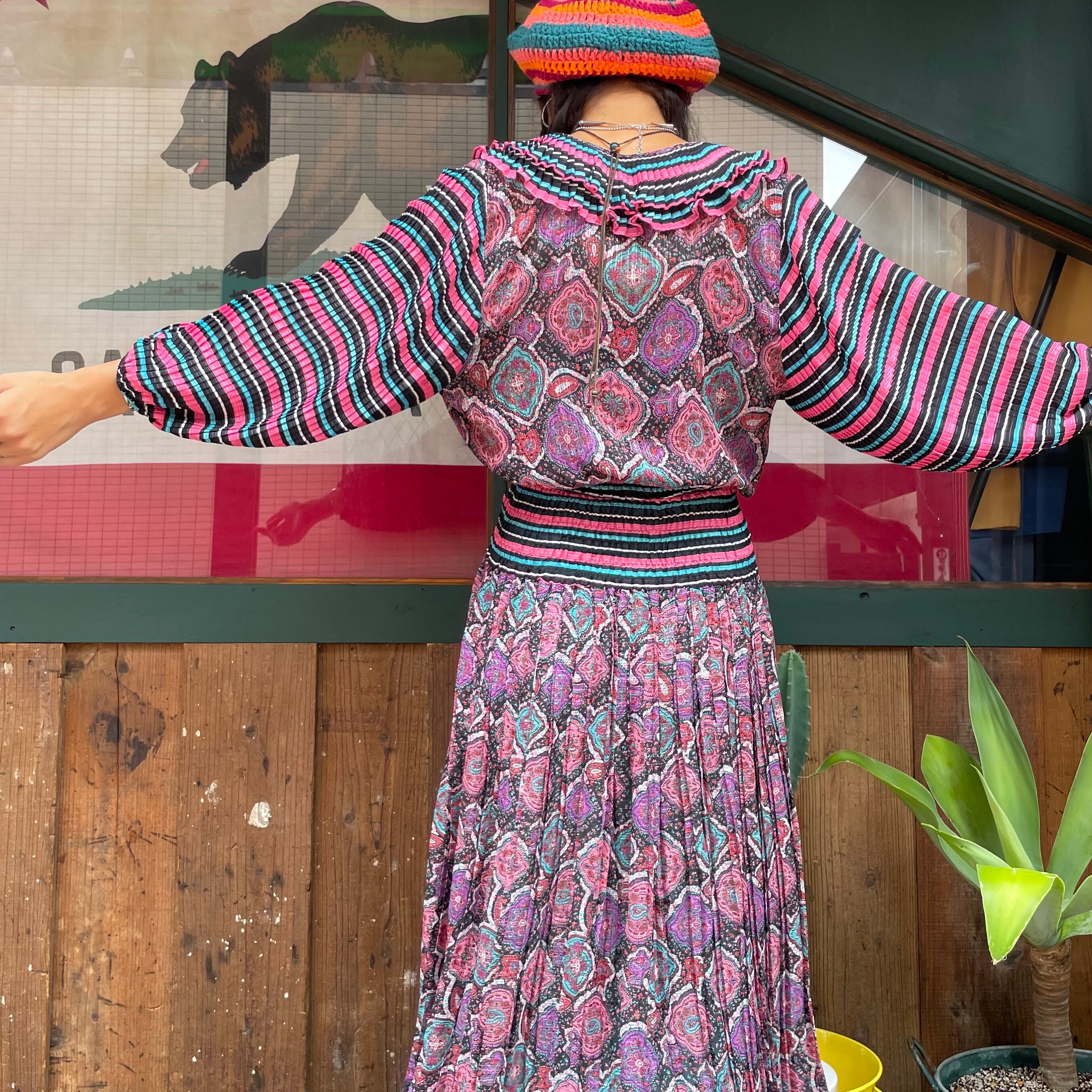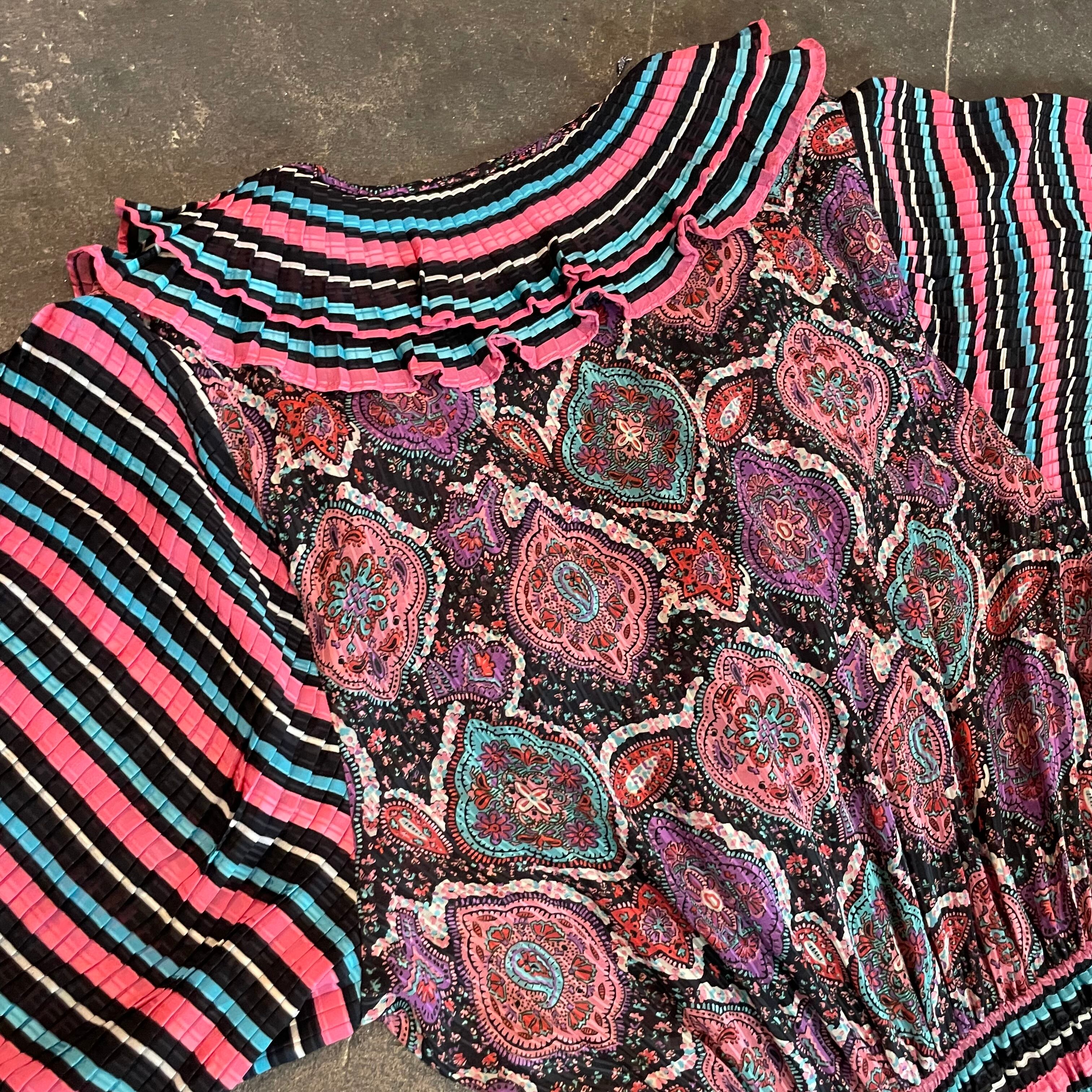 黒ベースのボーダーと黒ベースのペイズリーっぽい雰囲気の柄合わせ、細かいプリーツもとても素敵なDiane Freisのワンピースです。