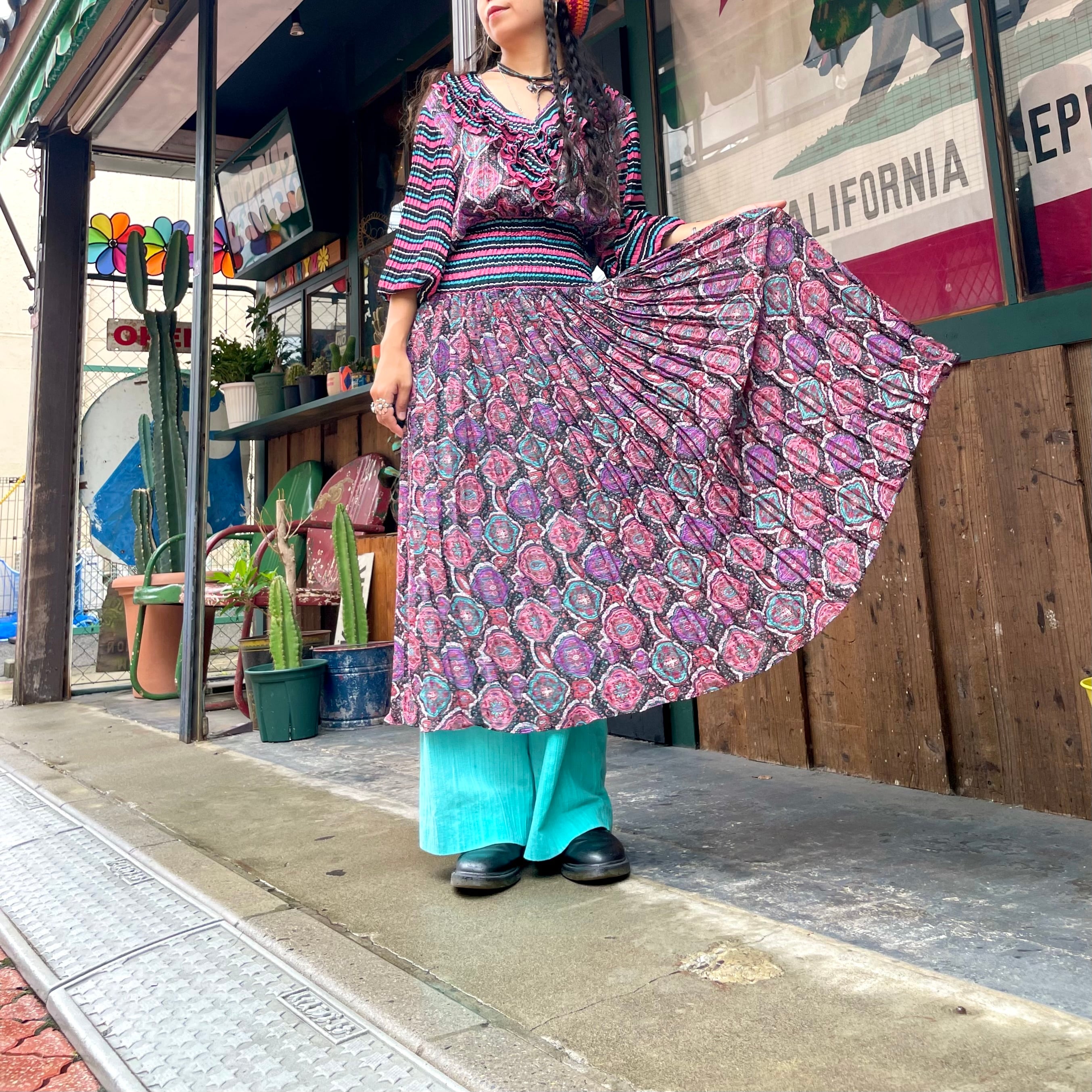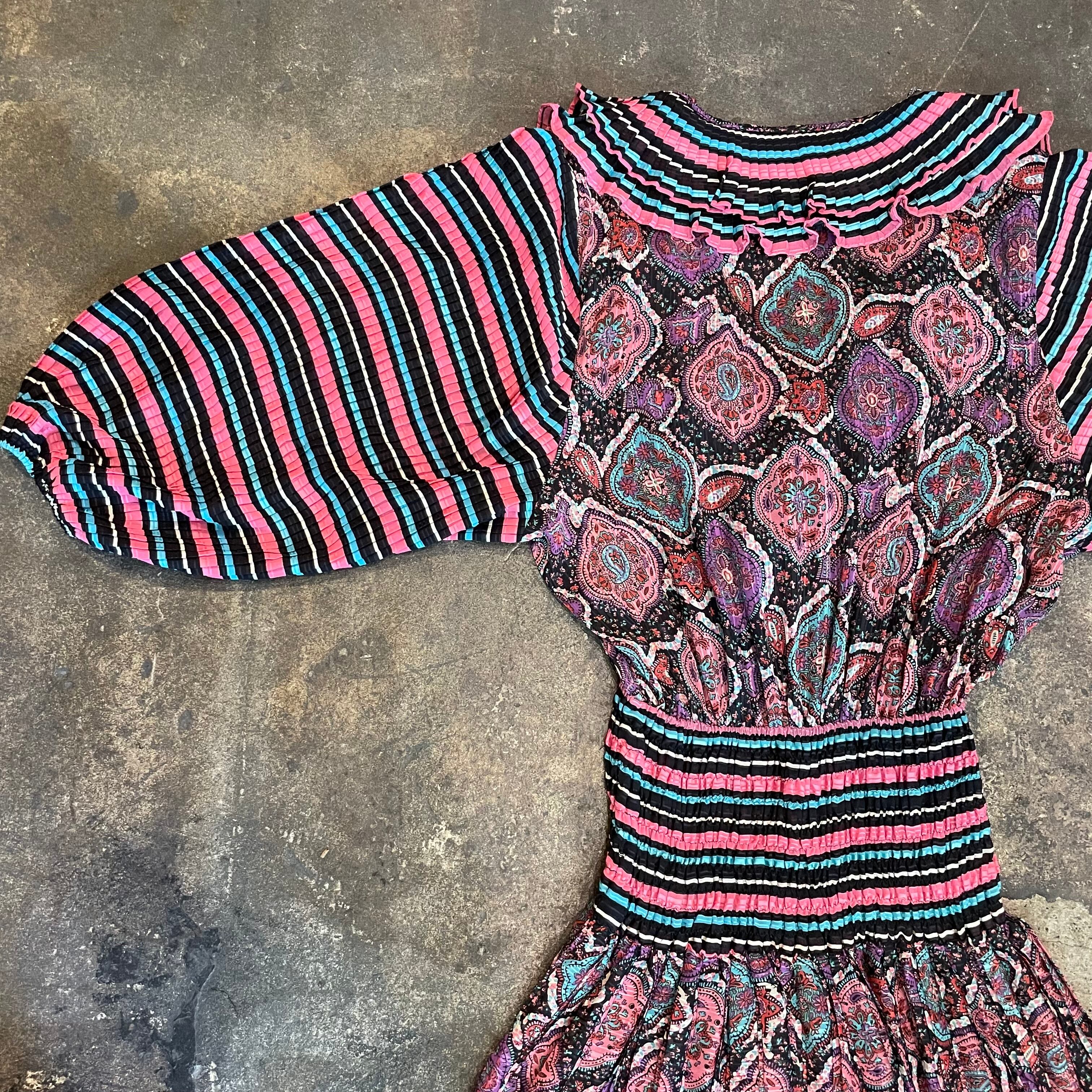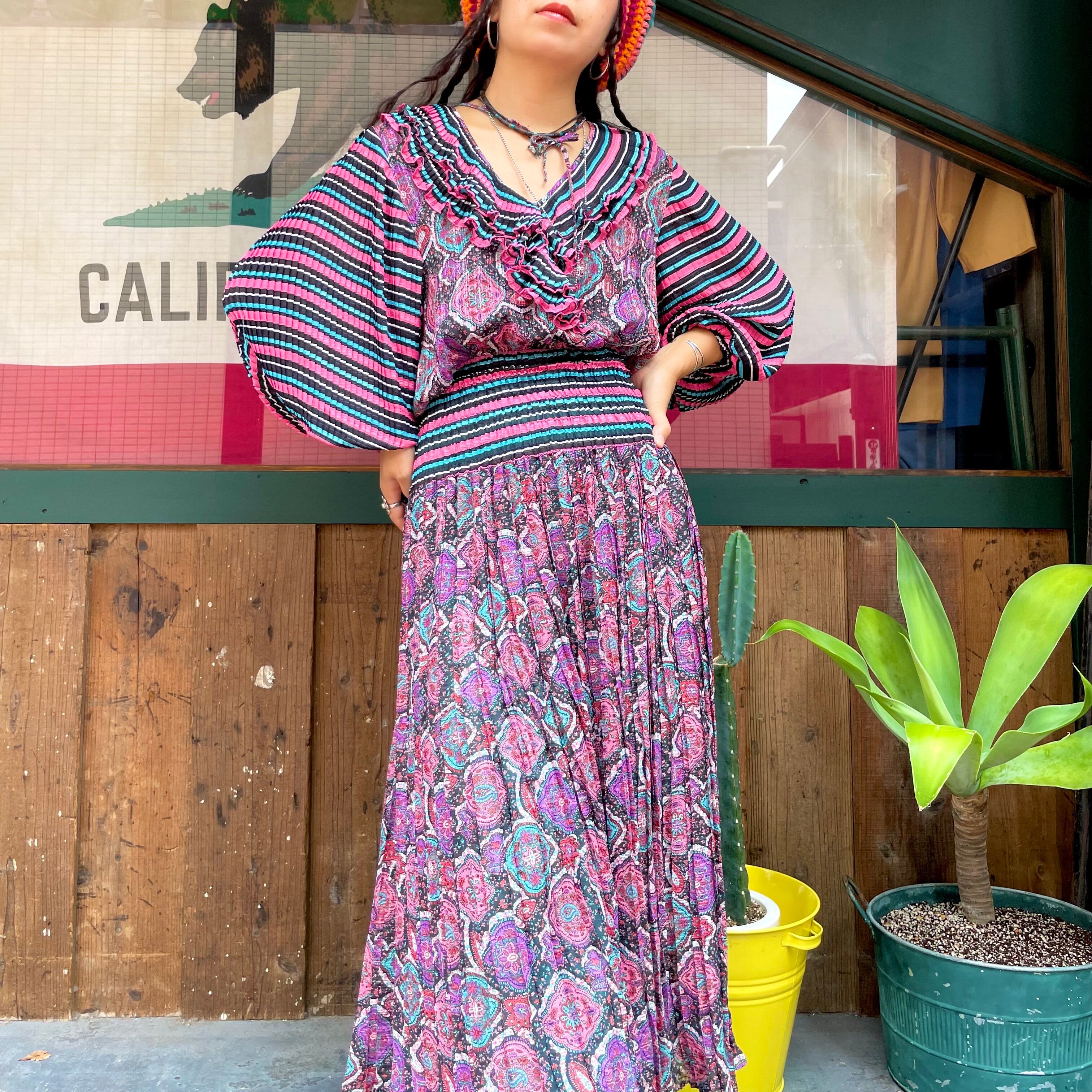 黒ベースのボーダーと黒ベースのペイズリーっぽい雰囲気の柄合わせ、細かいプリーツもとても素敵なDiane Freisのワンピースです。
