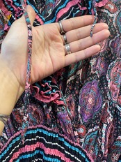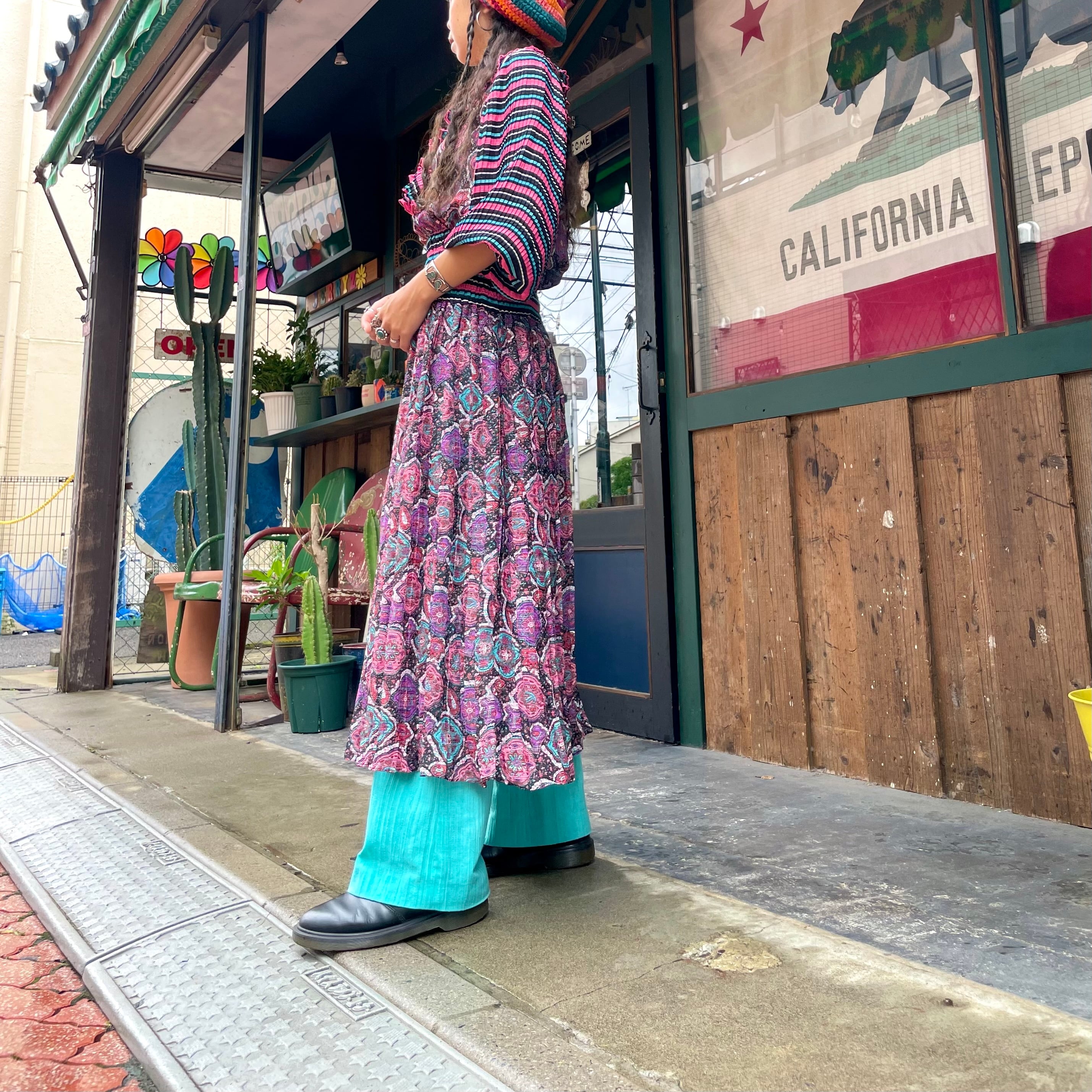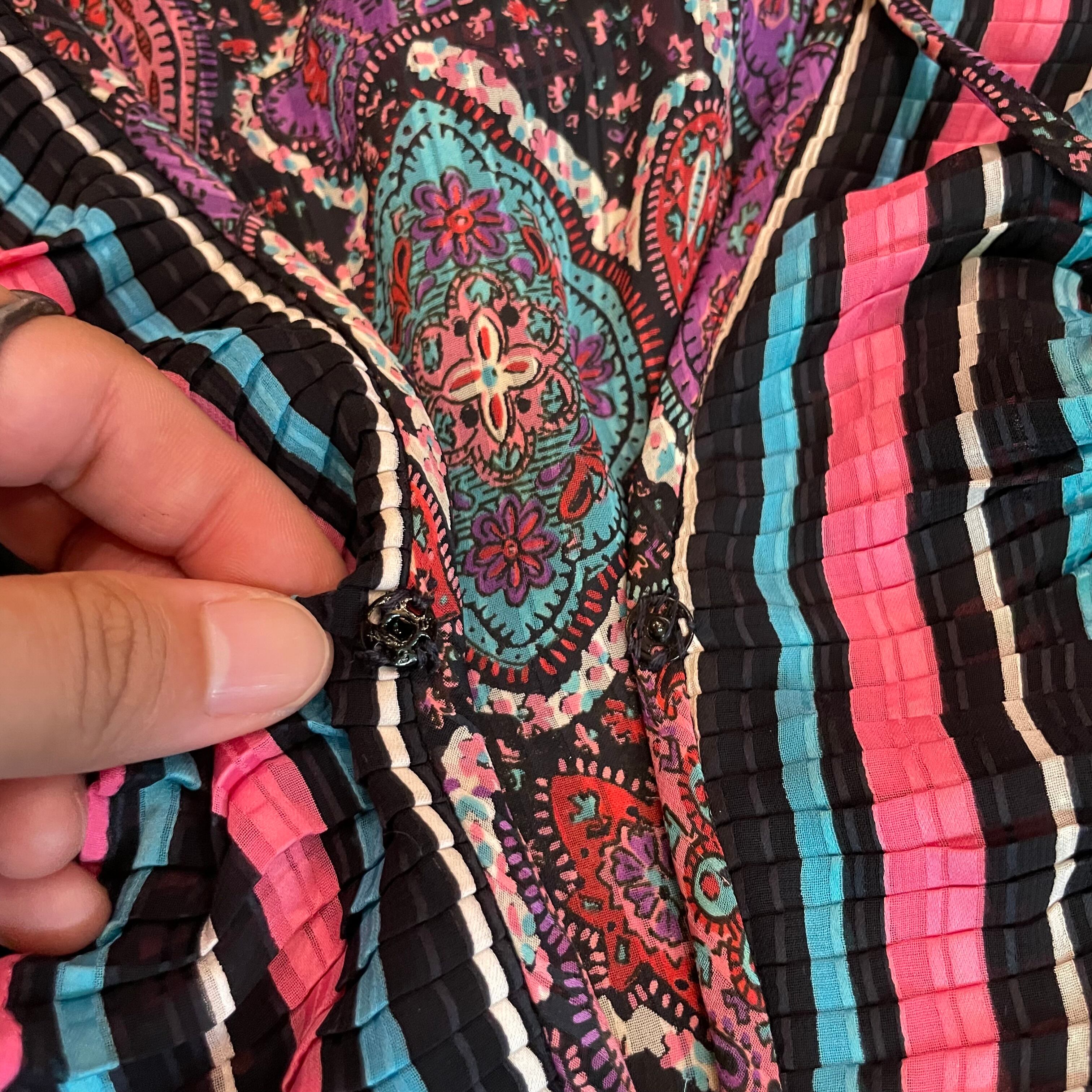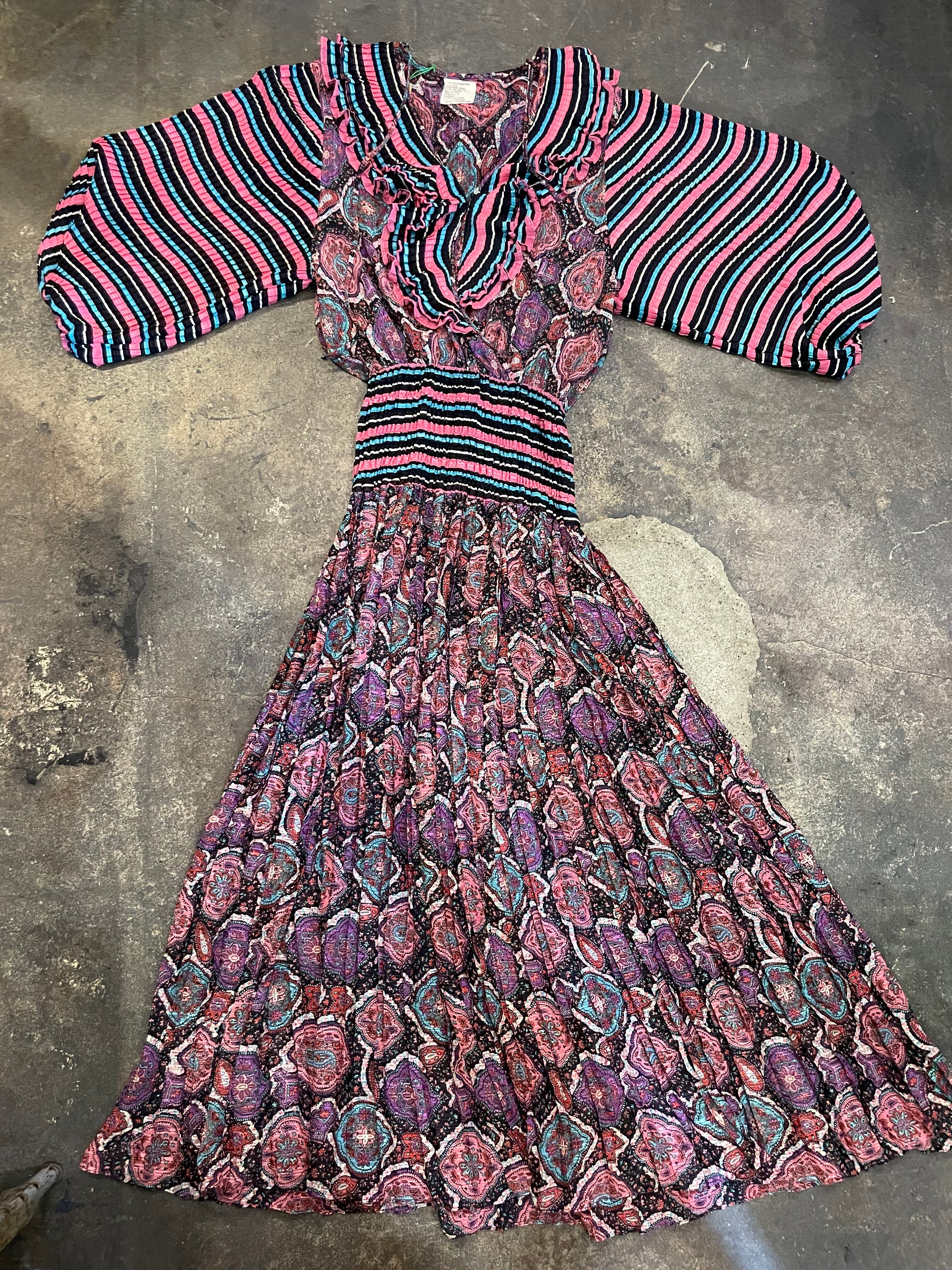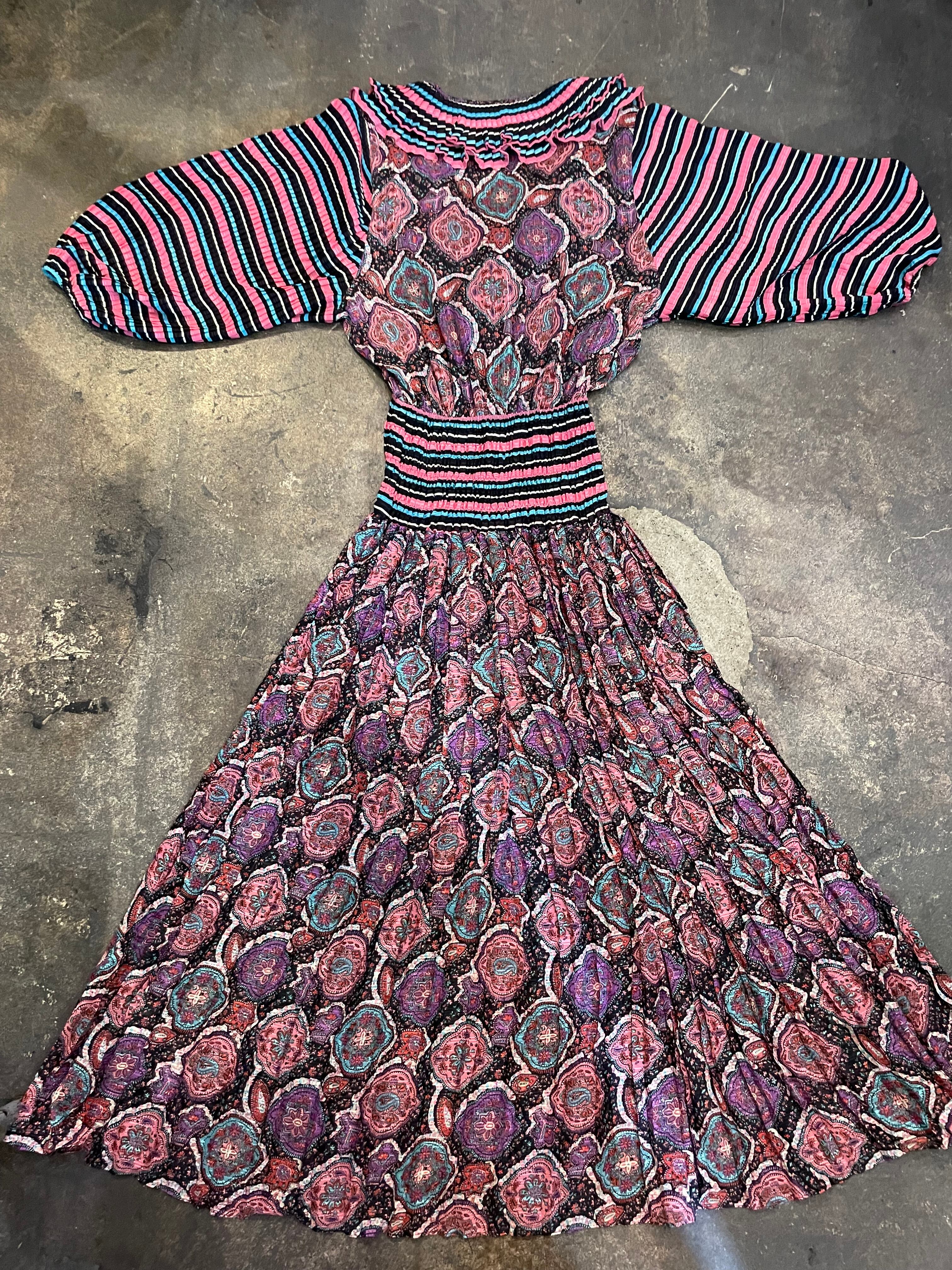 黒ベースのボーダーと黒ベースのペイズリーっぽい雰囲気の柄合わせ、細かいプリーツもとても素敵なDiane Freisのワンピースです。