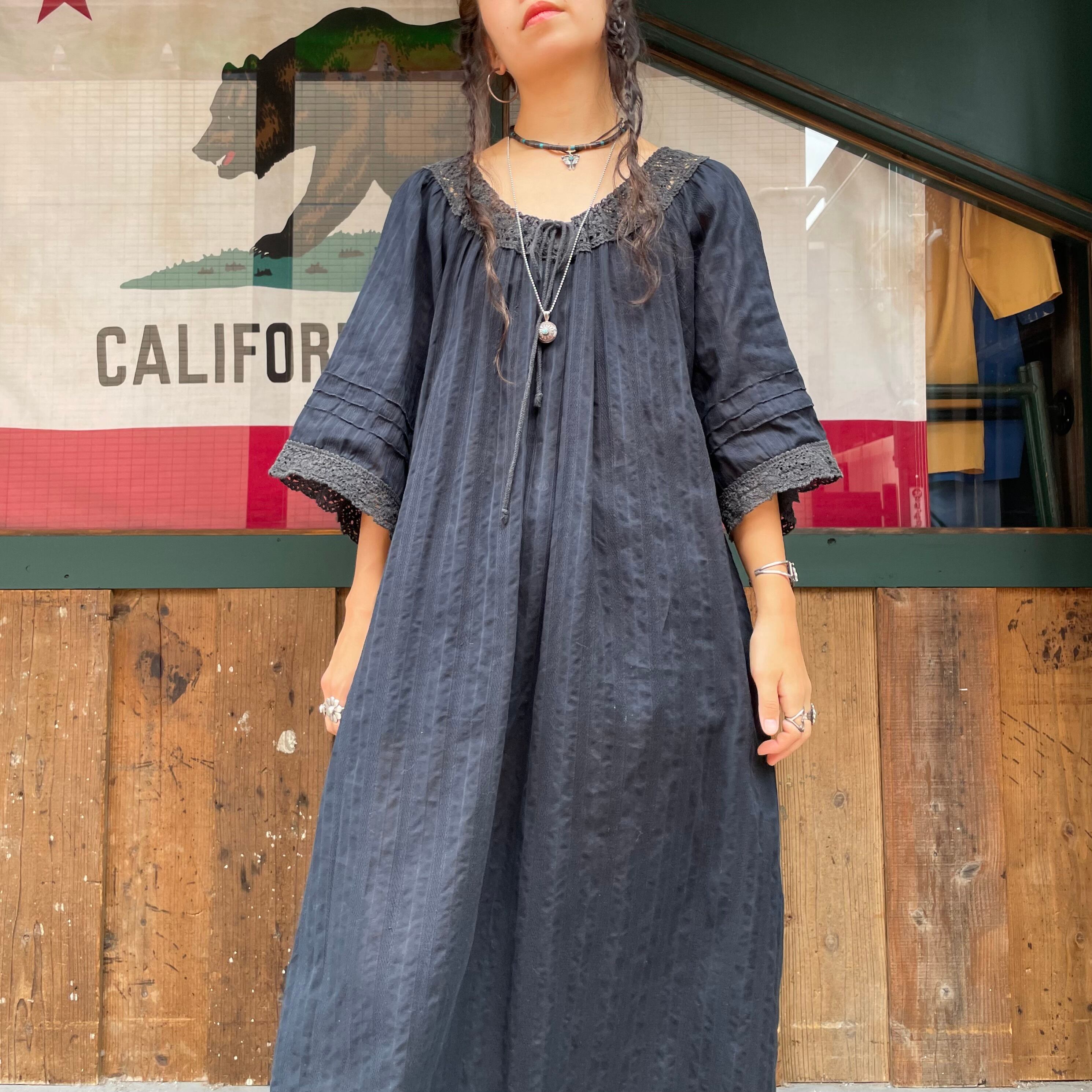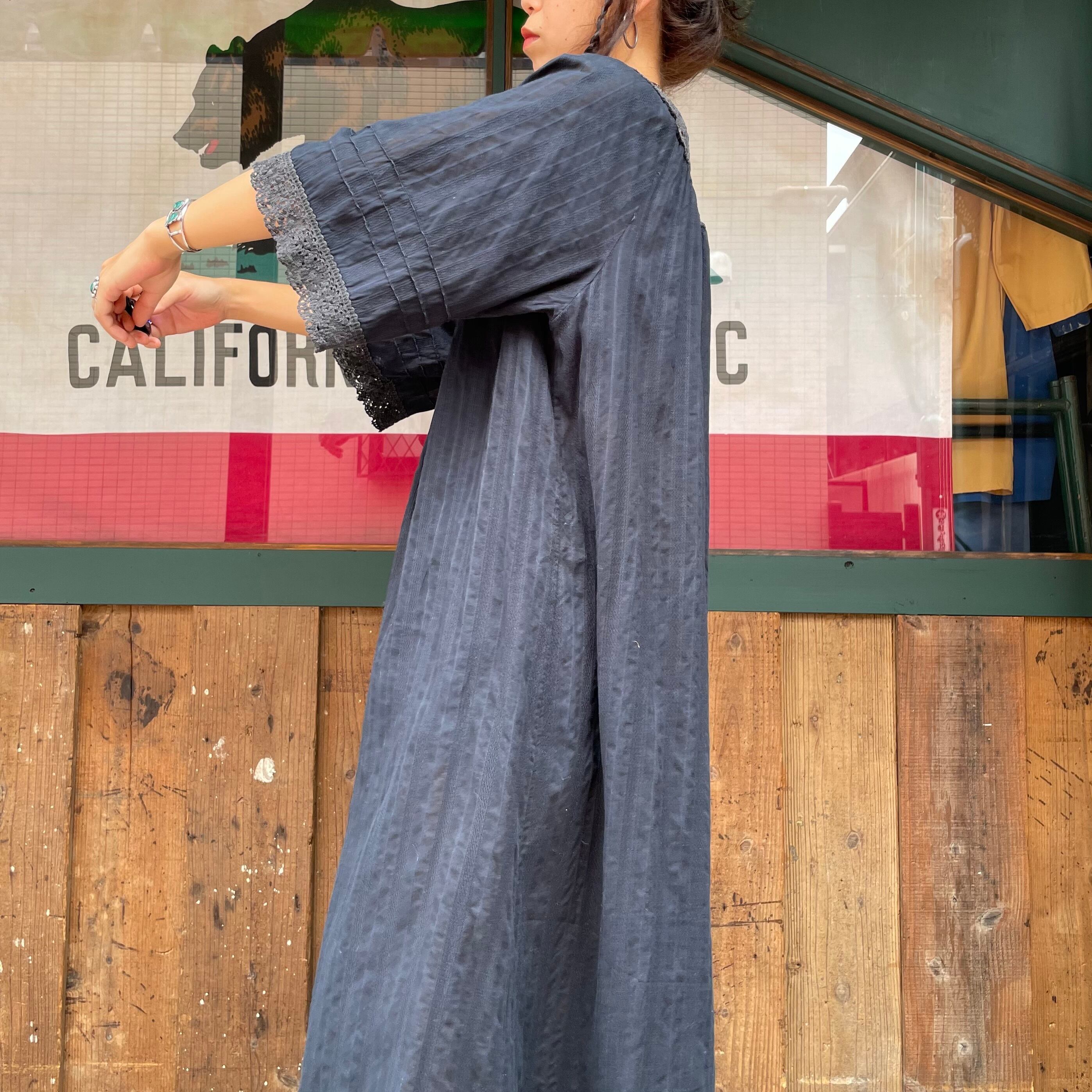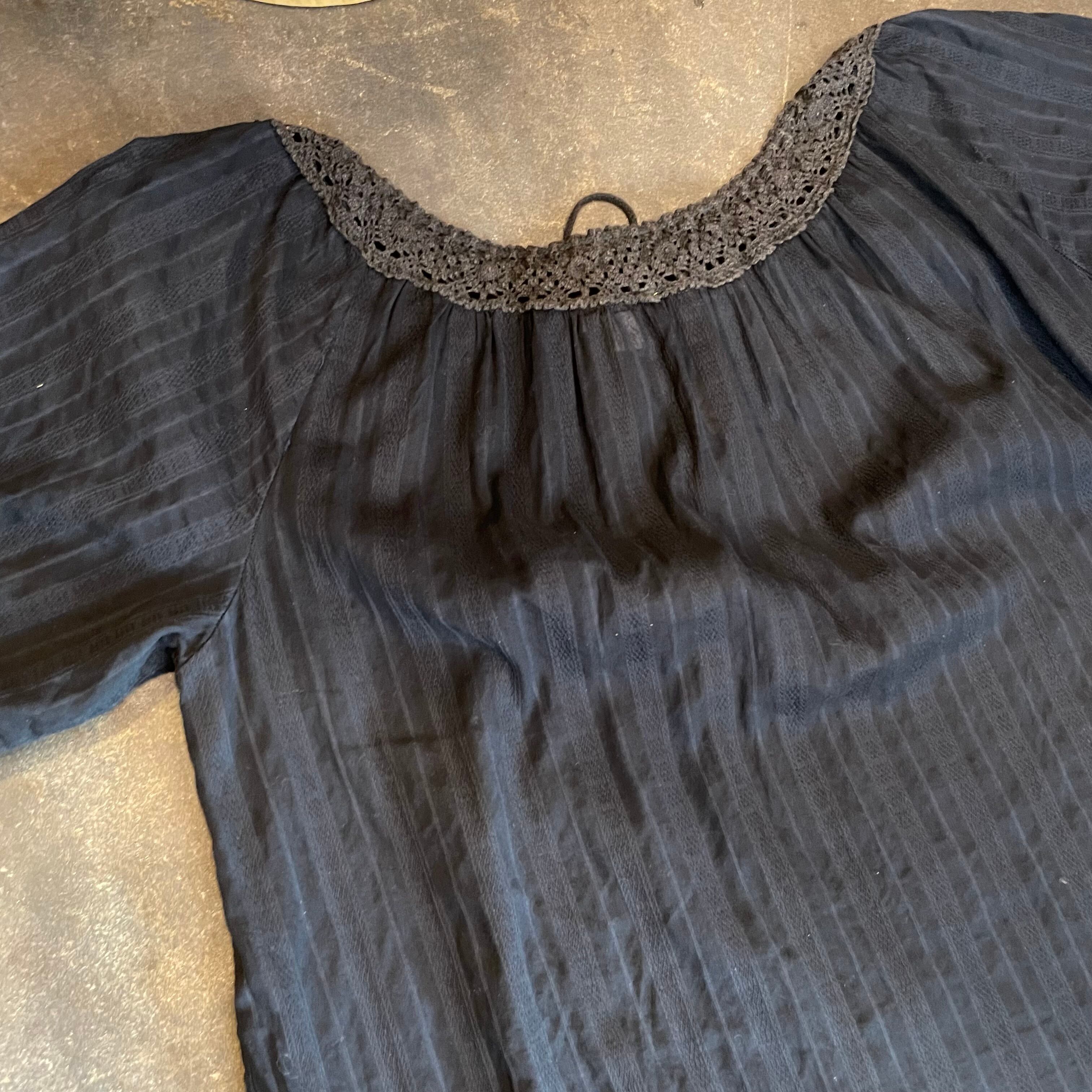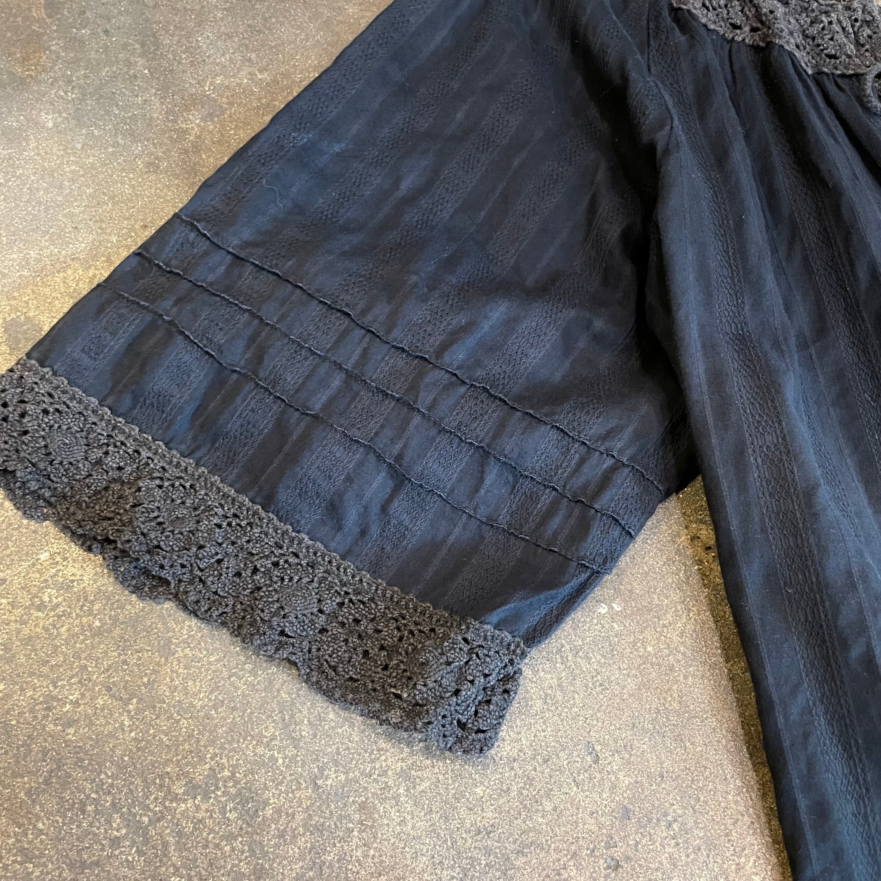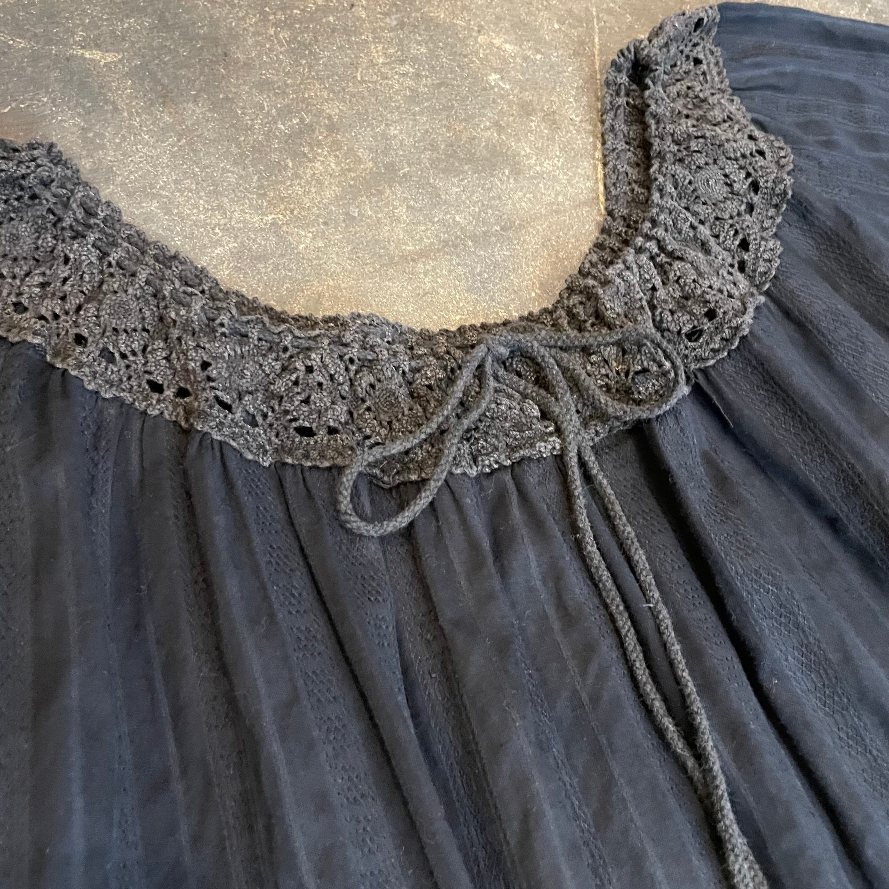 真っ黒ですが、織りや透け感などがかわいい生地が上品なワンピースです。襟ぐりと袖口はコットンレースが付いており、色褪せている感じがとても雰囲気があってかわいいです。