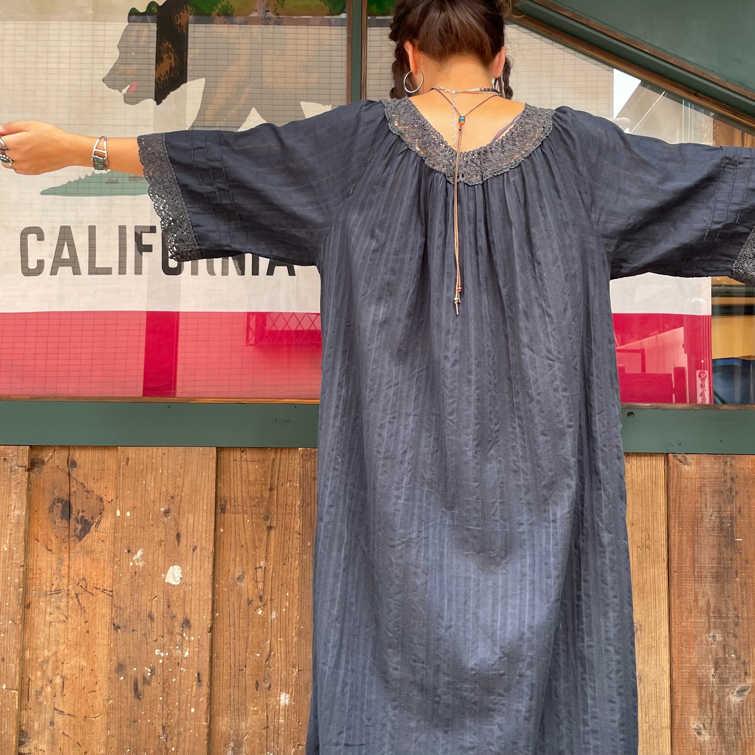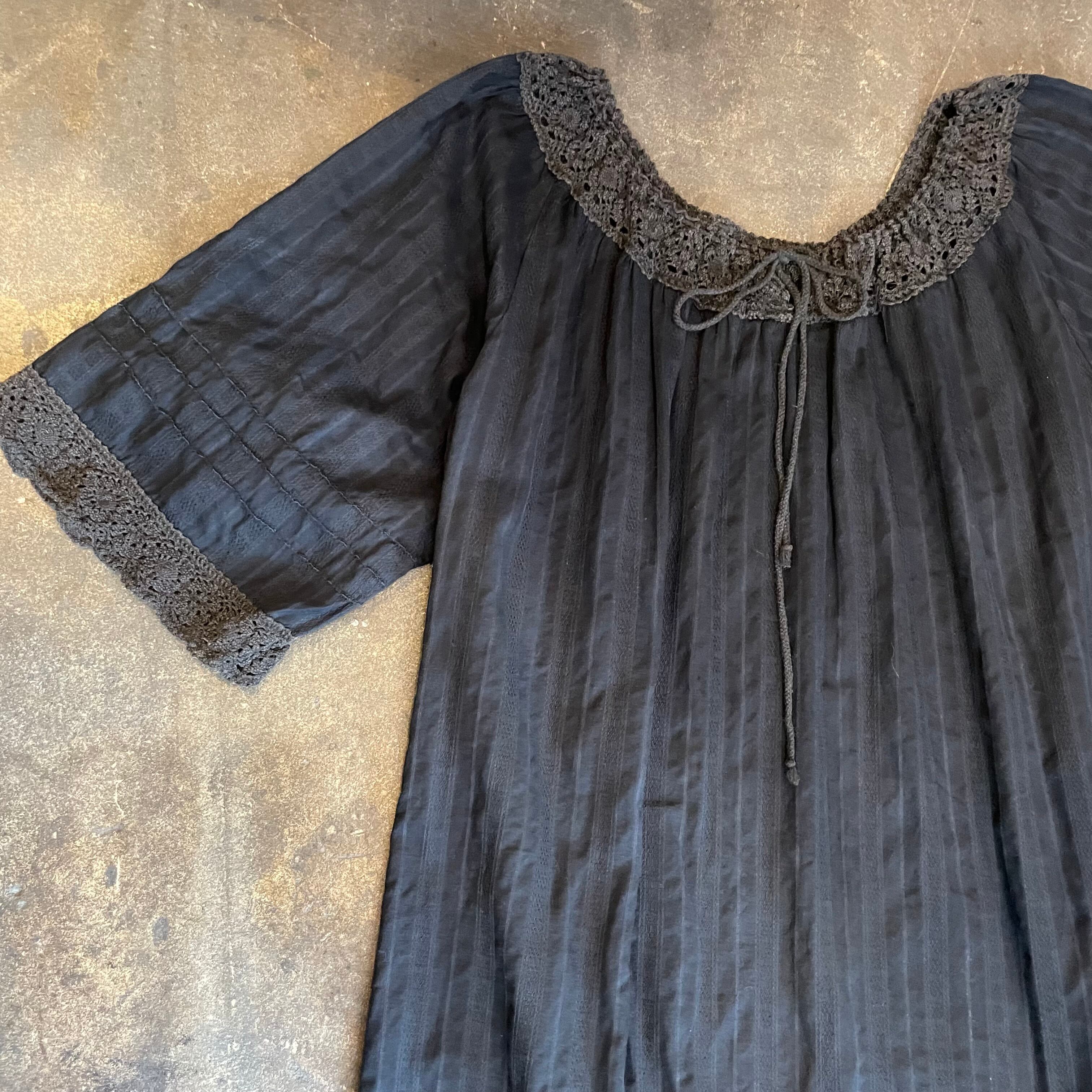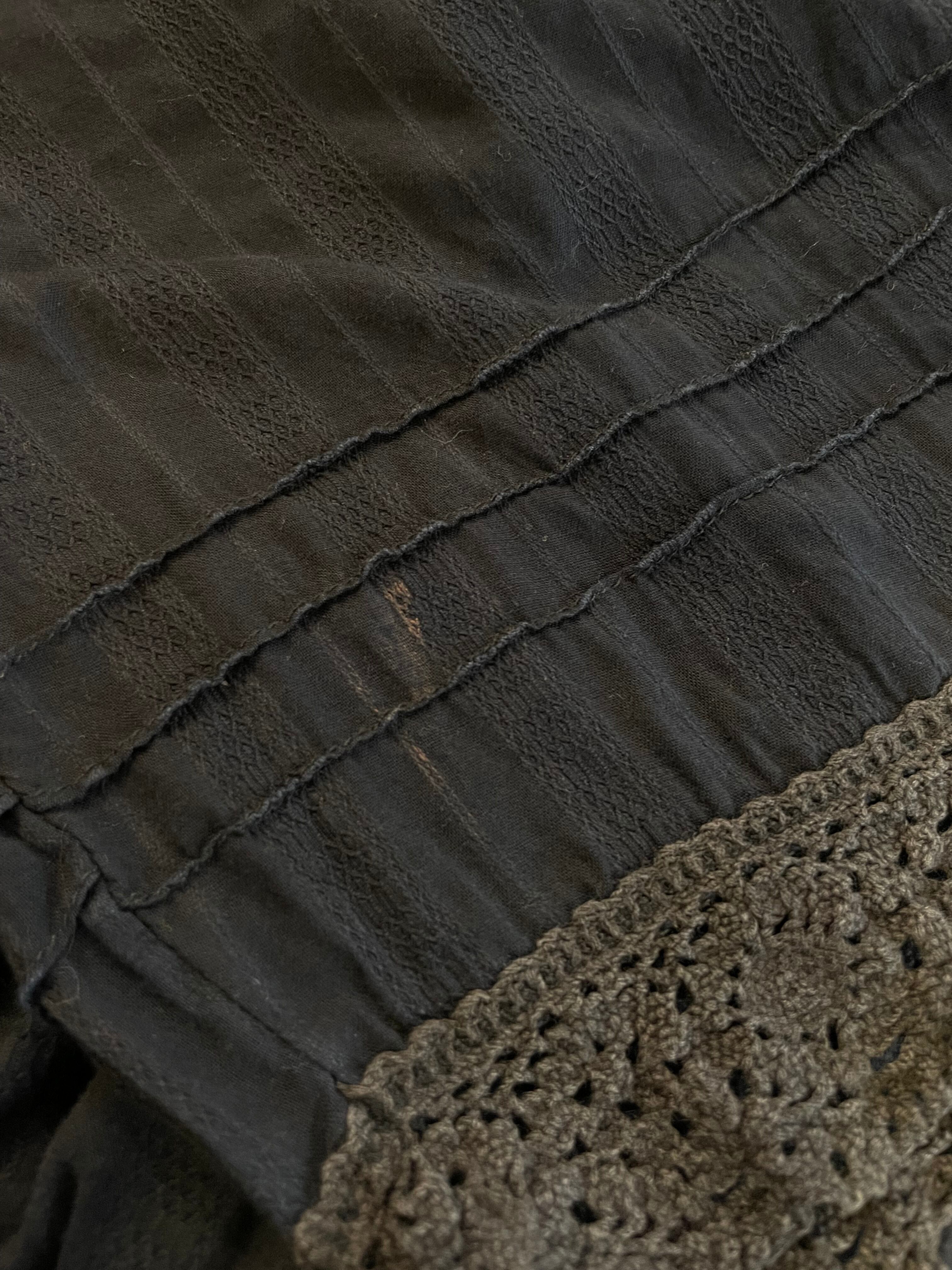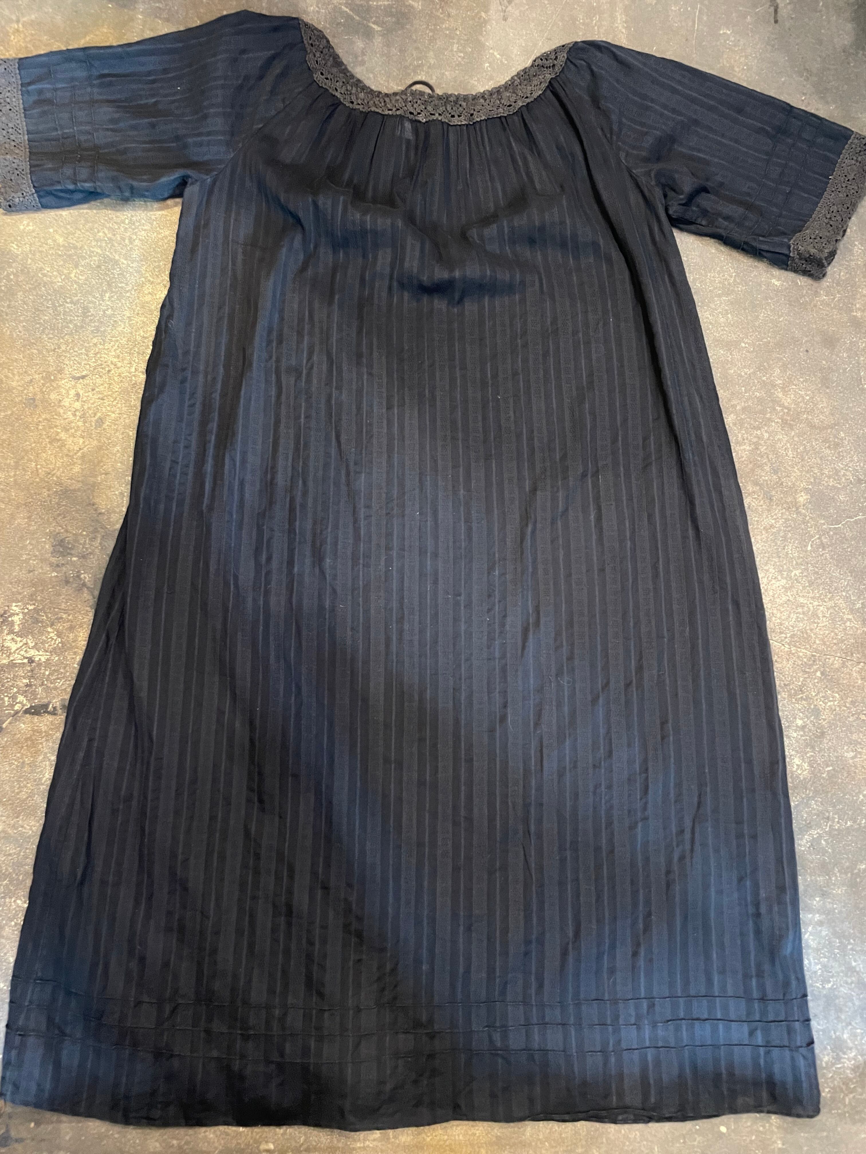 真っ黒ですが、織りや透け感などがかわいい生地が上品なワンピースです。襟ぐりと袖口はコットンレースが付いており、色褪せている感じがとても雰囲気があってかわいいです。