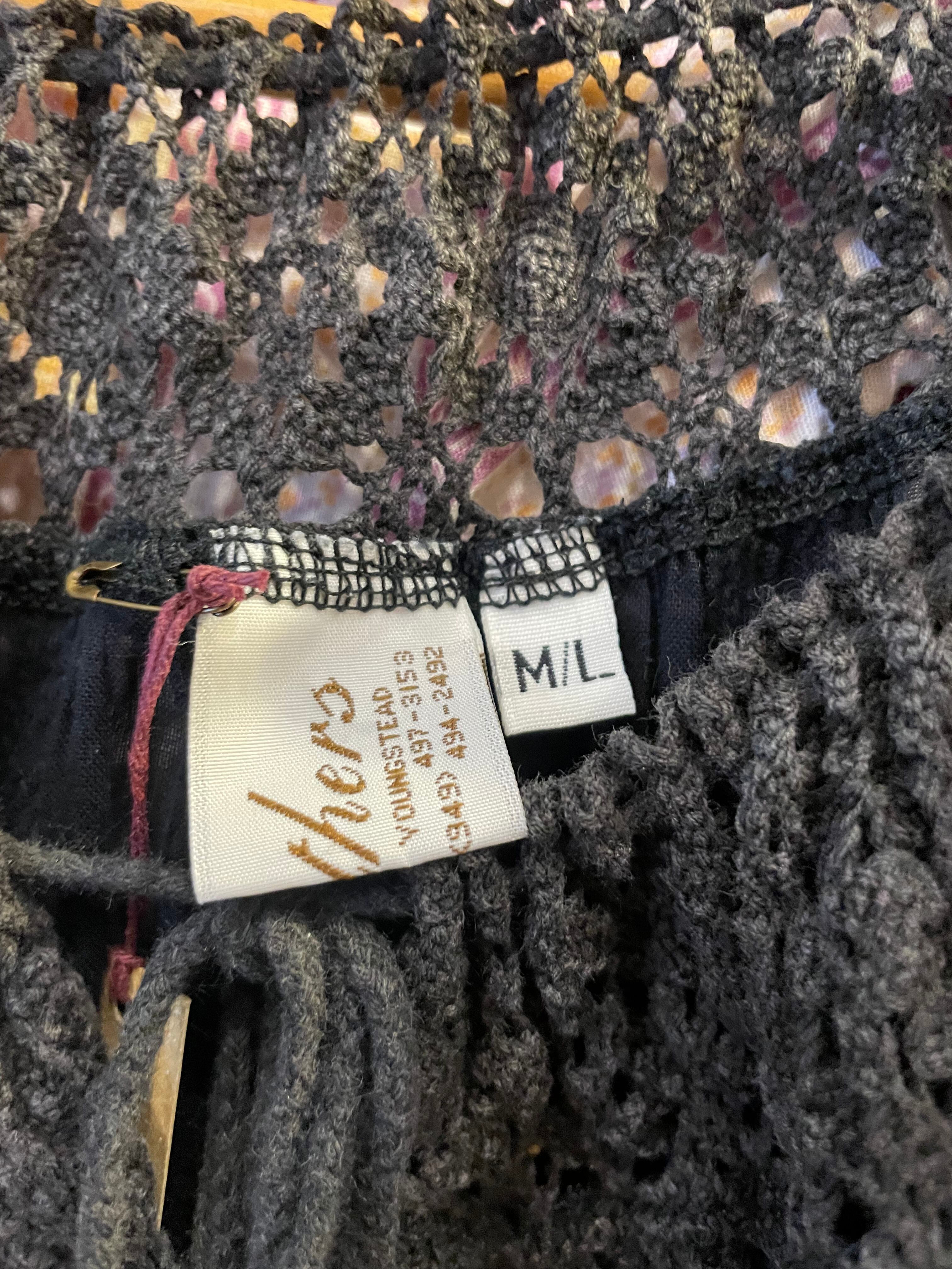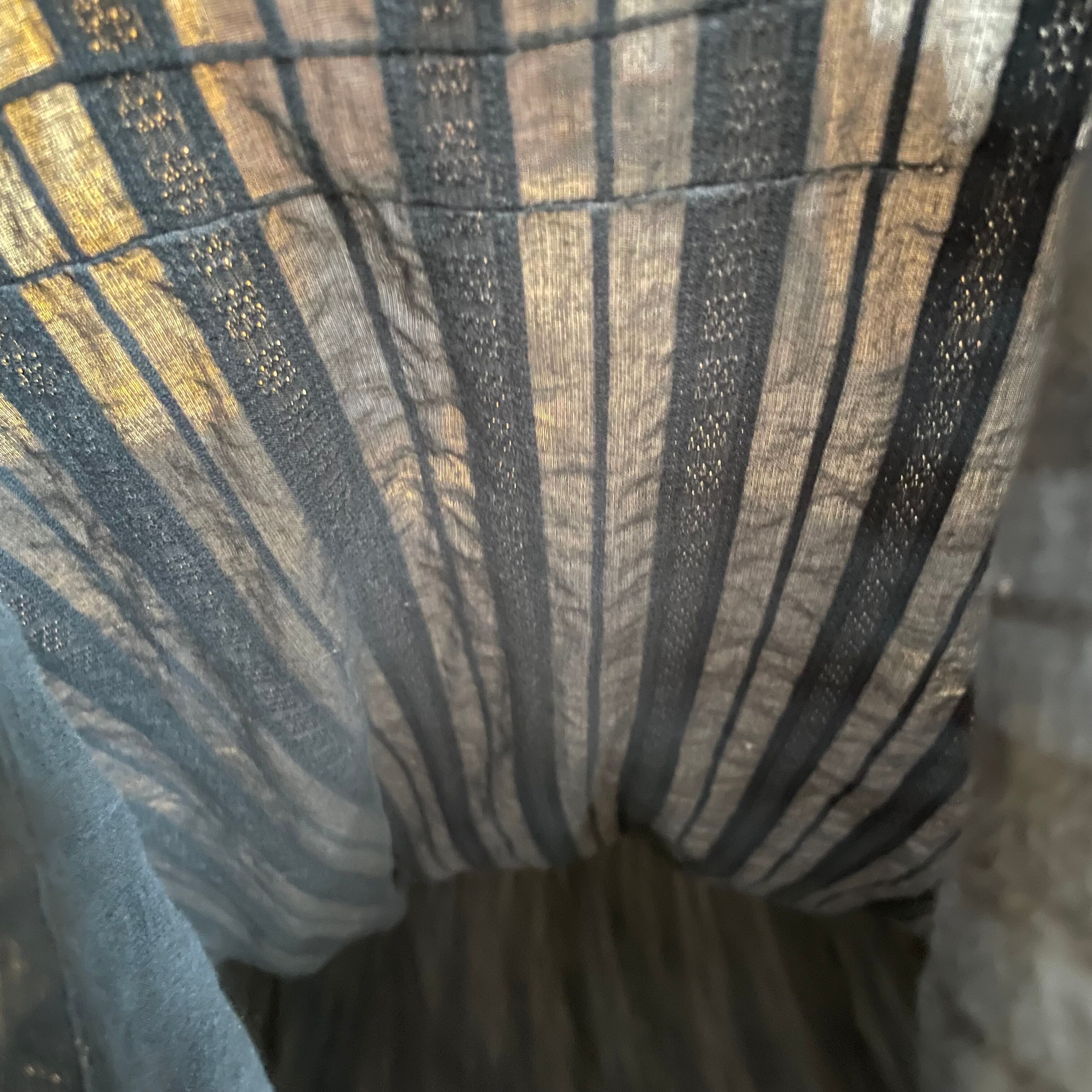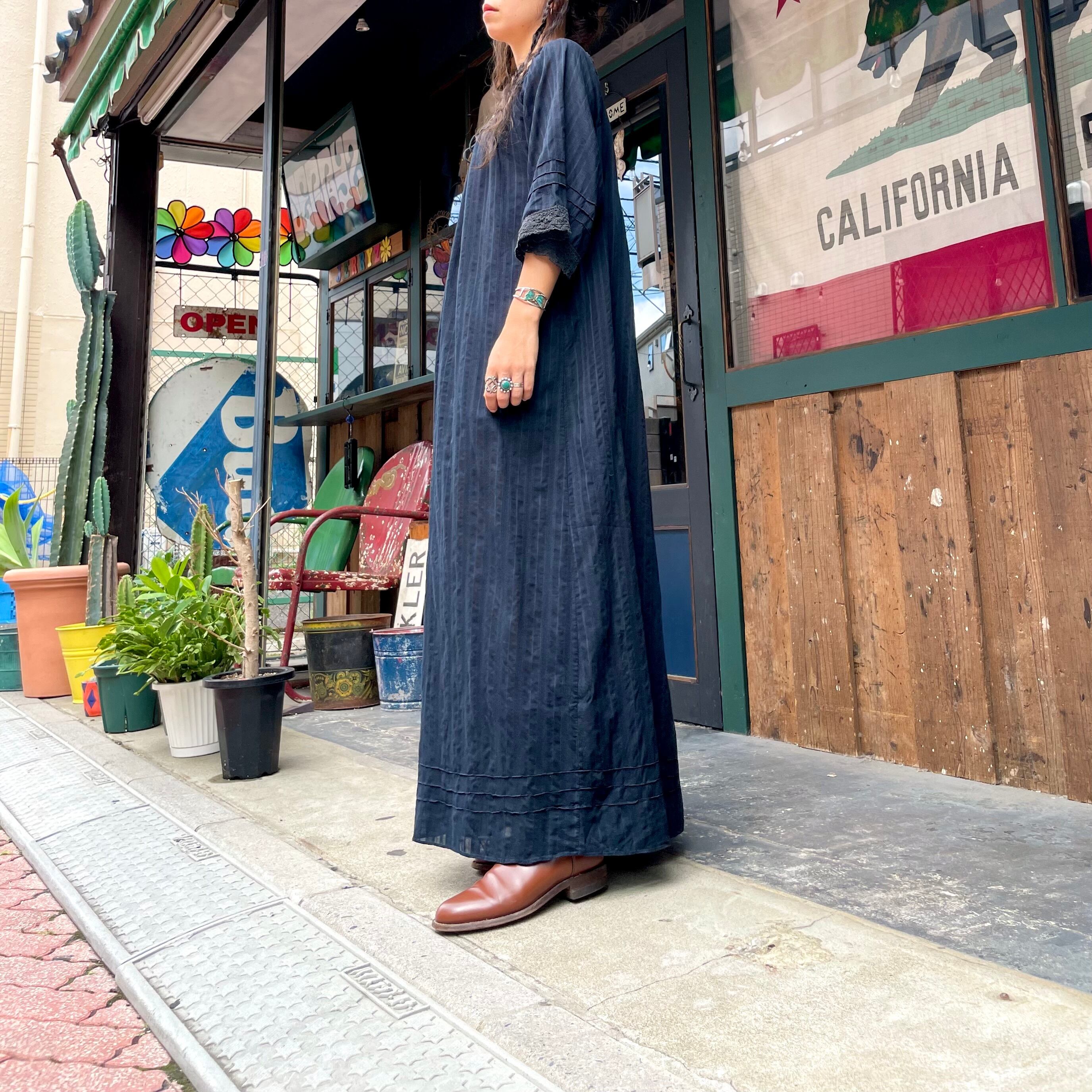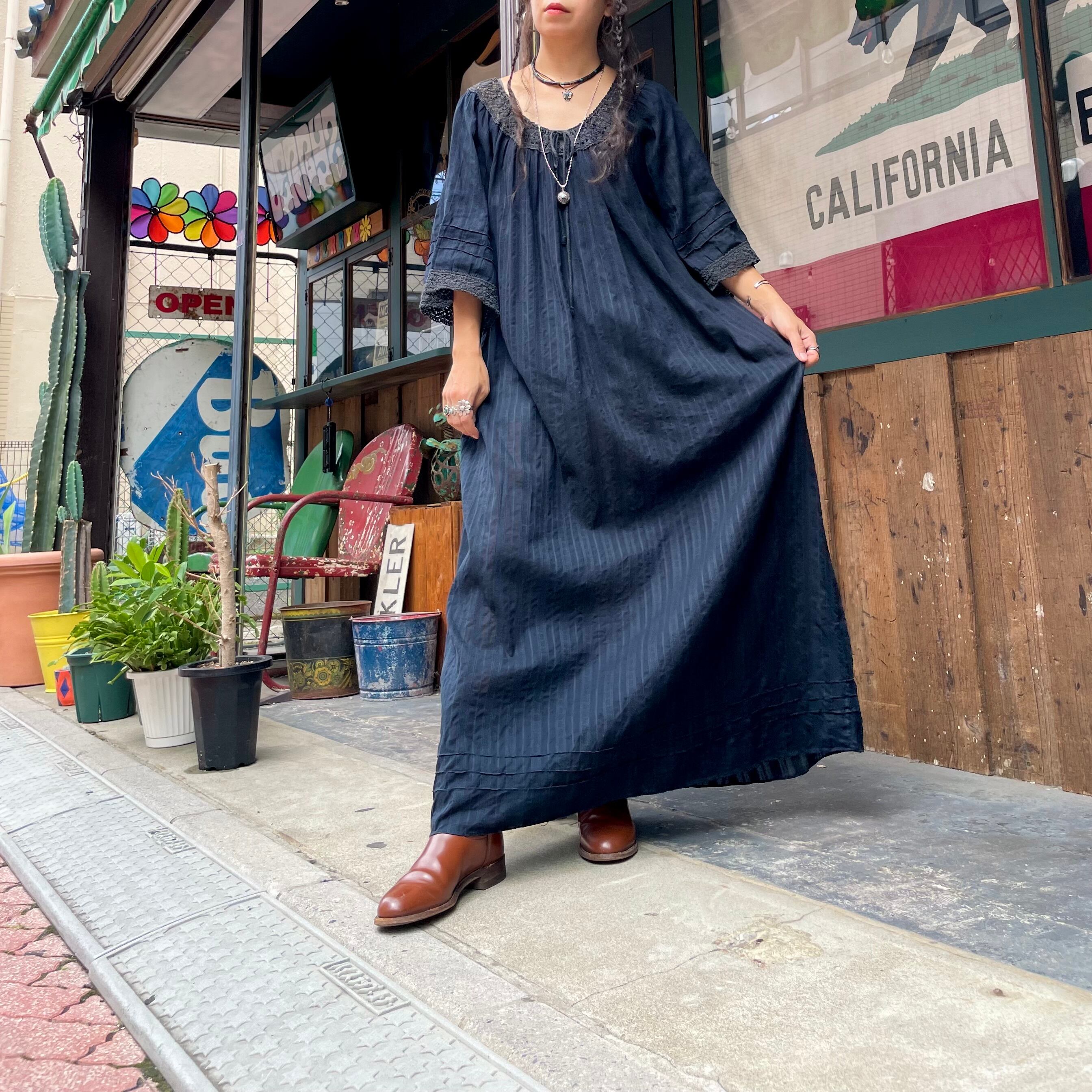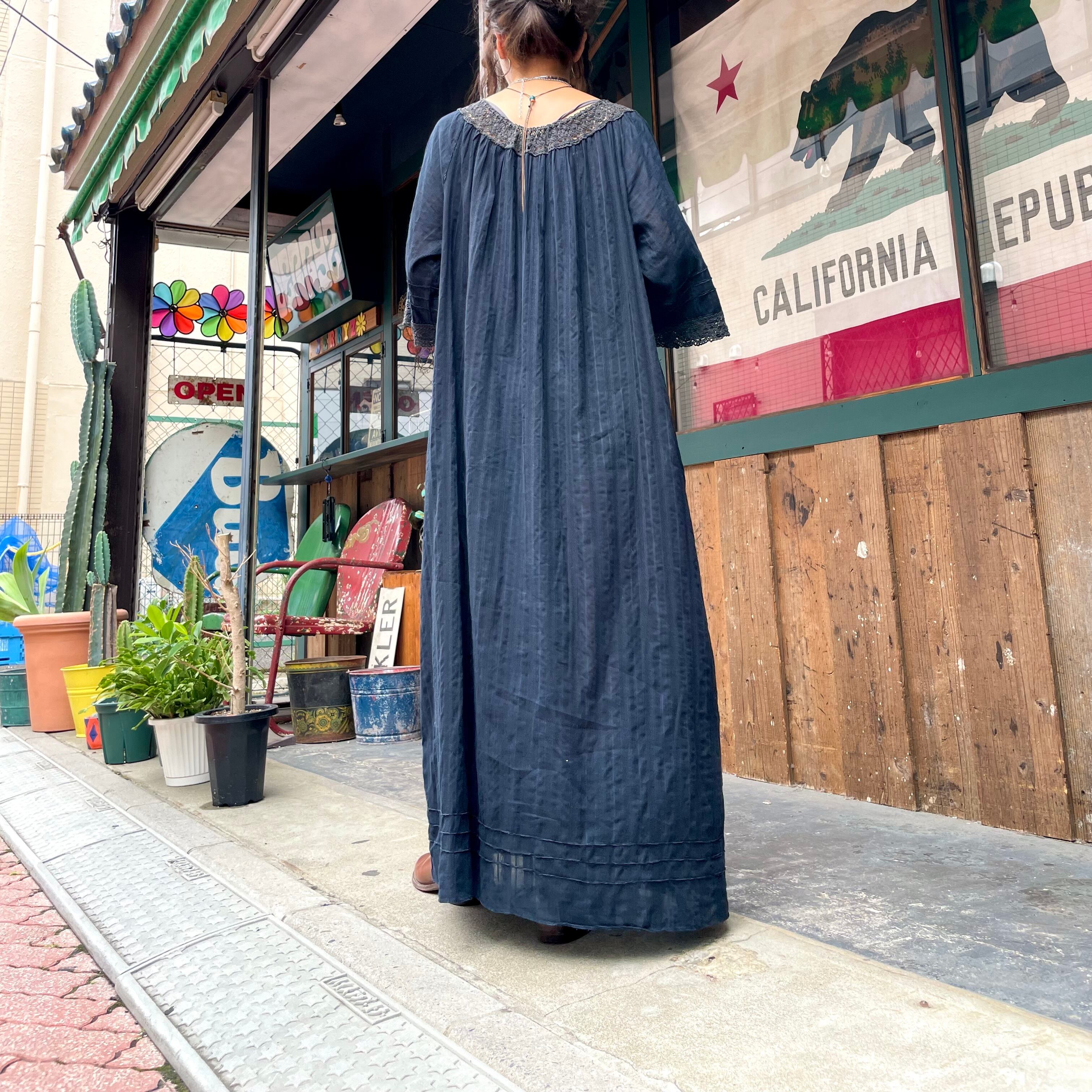 真っ黒ですが、織りや透け感などがかわいい生地が上品なワンピースです。襟ぐりと袖口はコットンレースが付いており、色褪せている感じがとても雰囲気があってかわいいです。