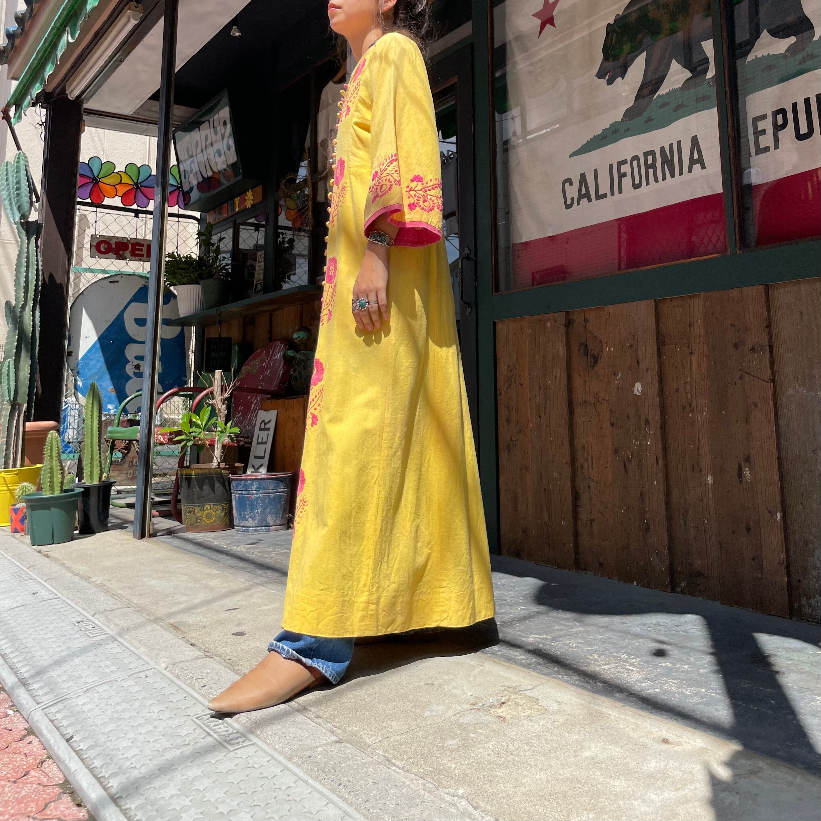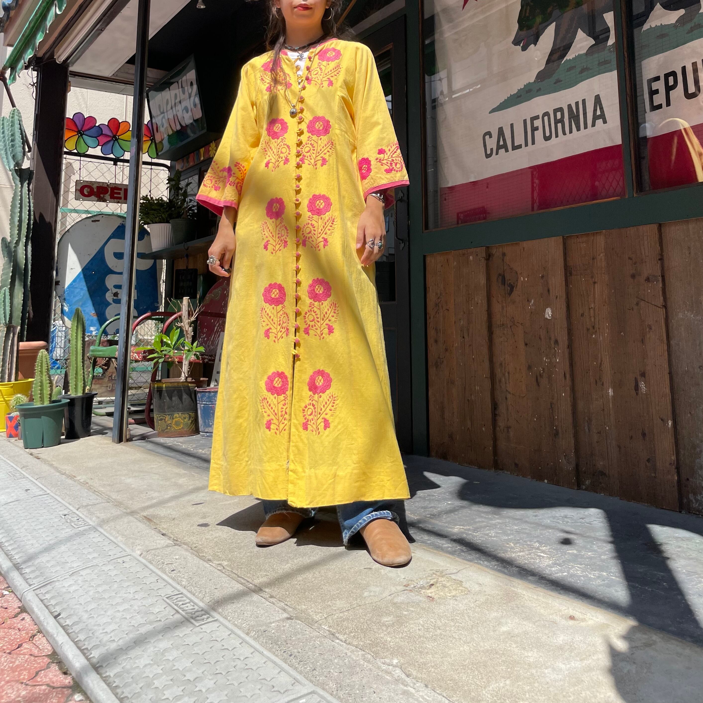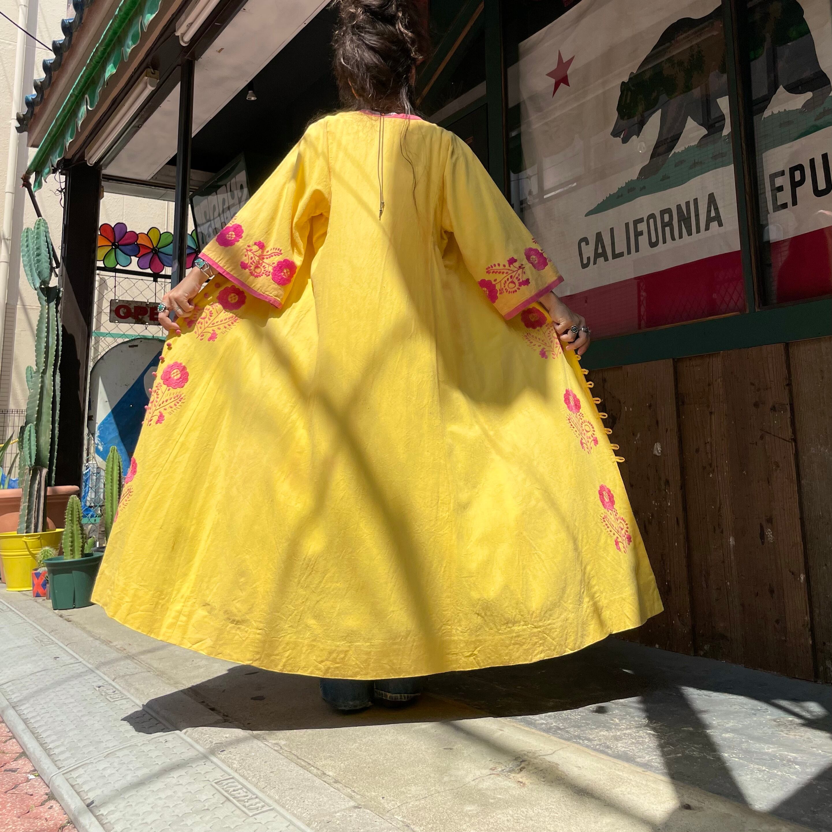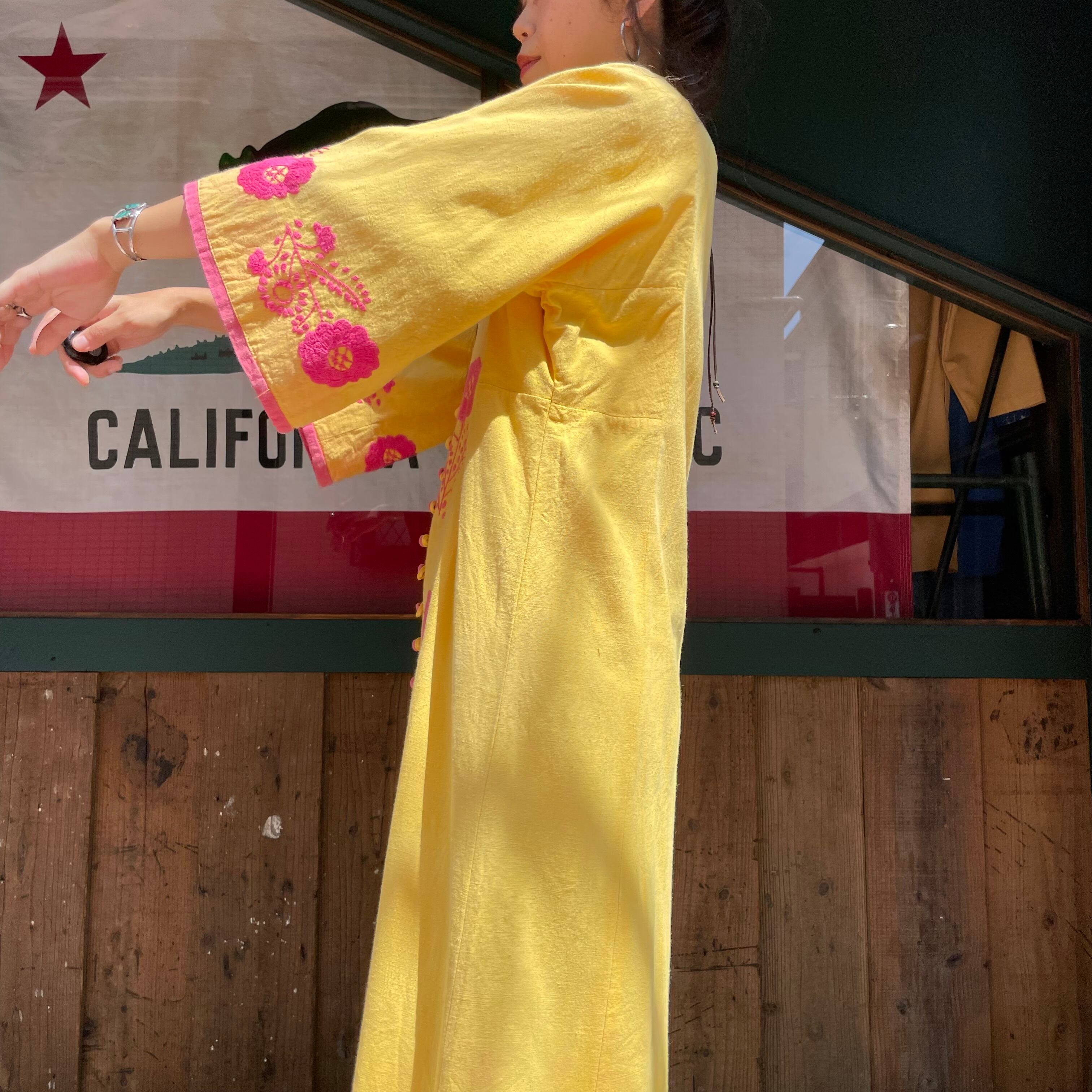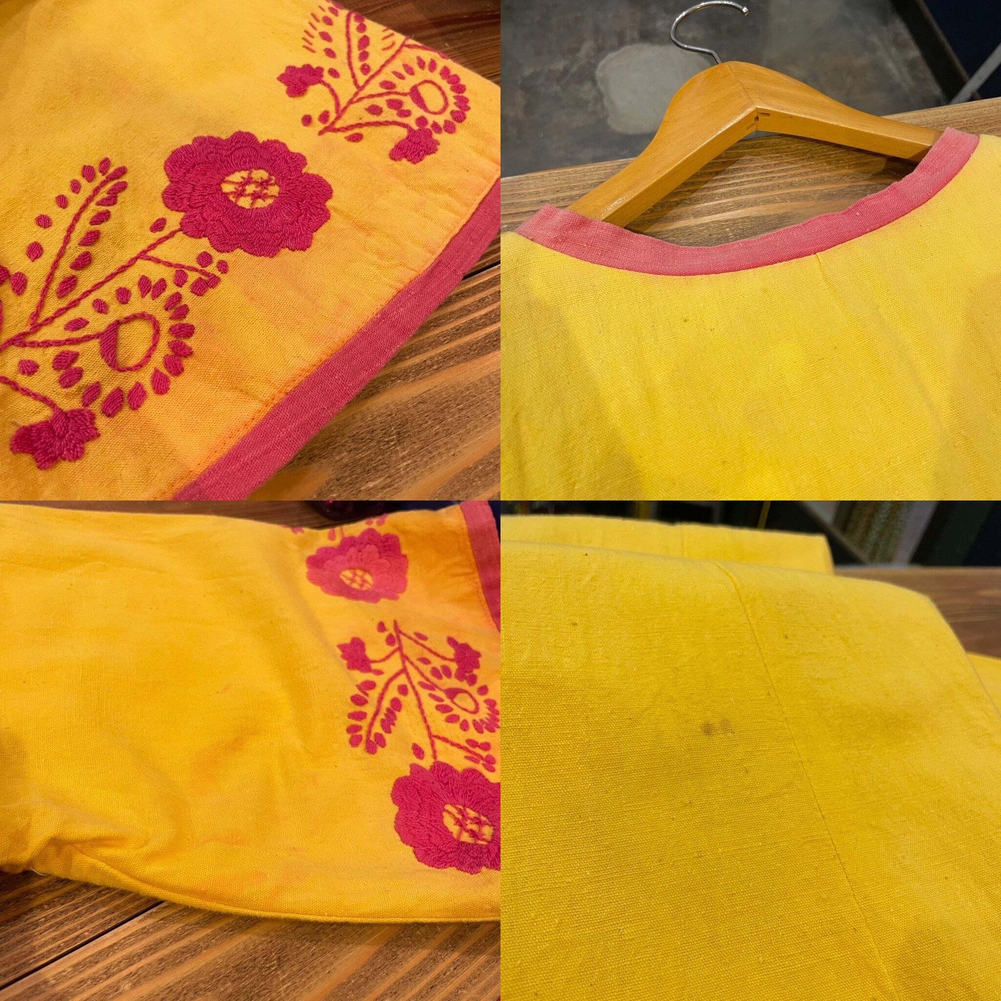 優しい黄色に優しいピンク色の手刺繍がとてもかわいいワンピースです。