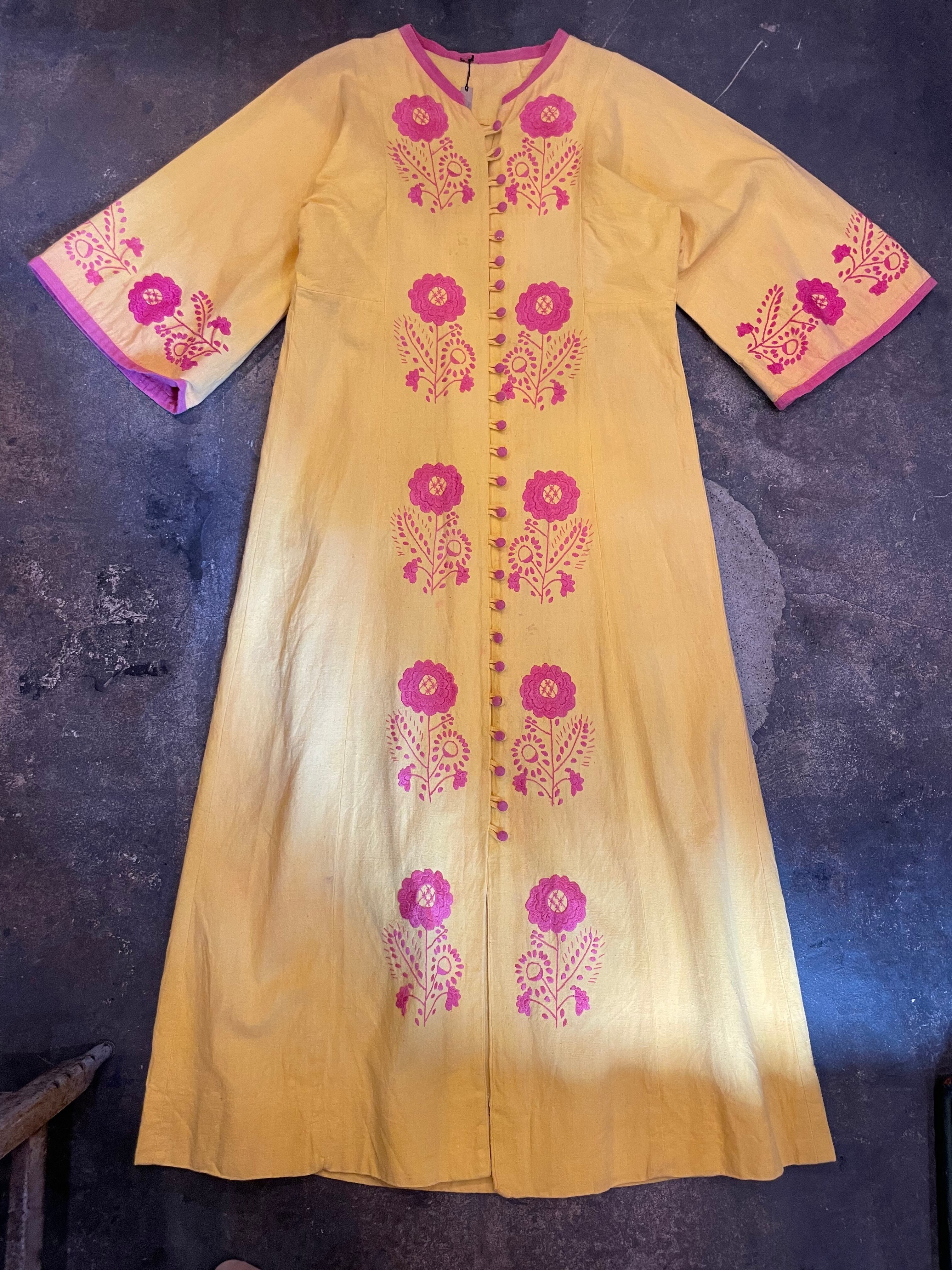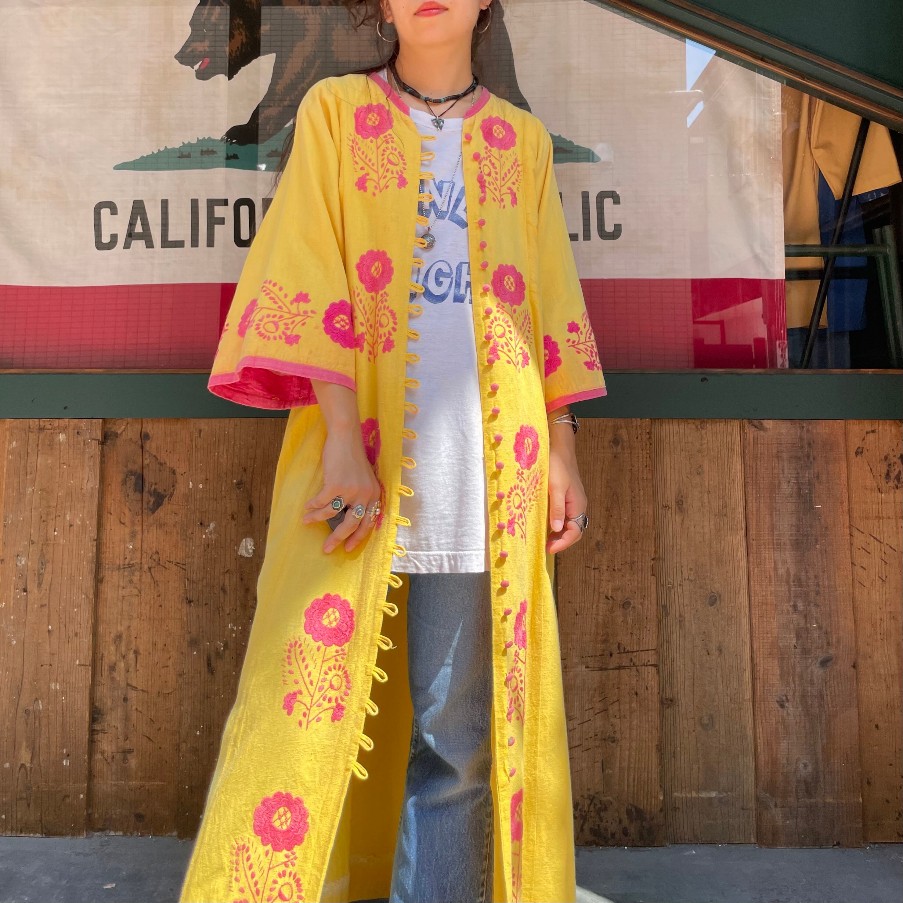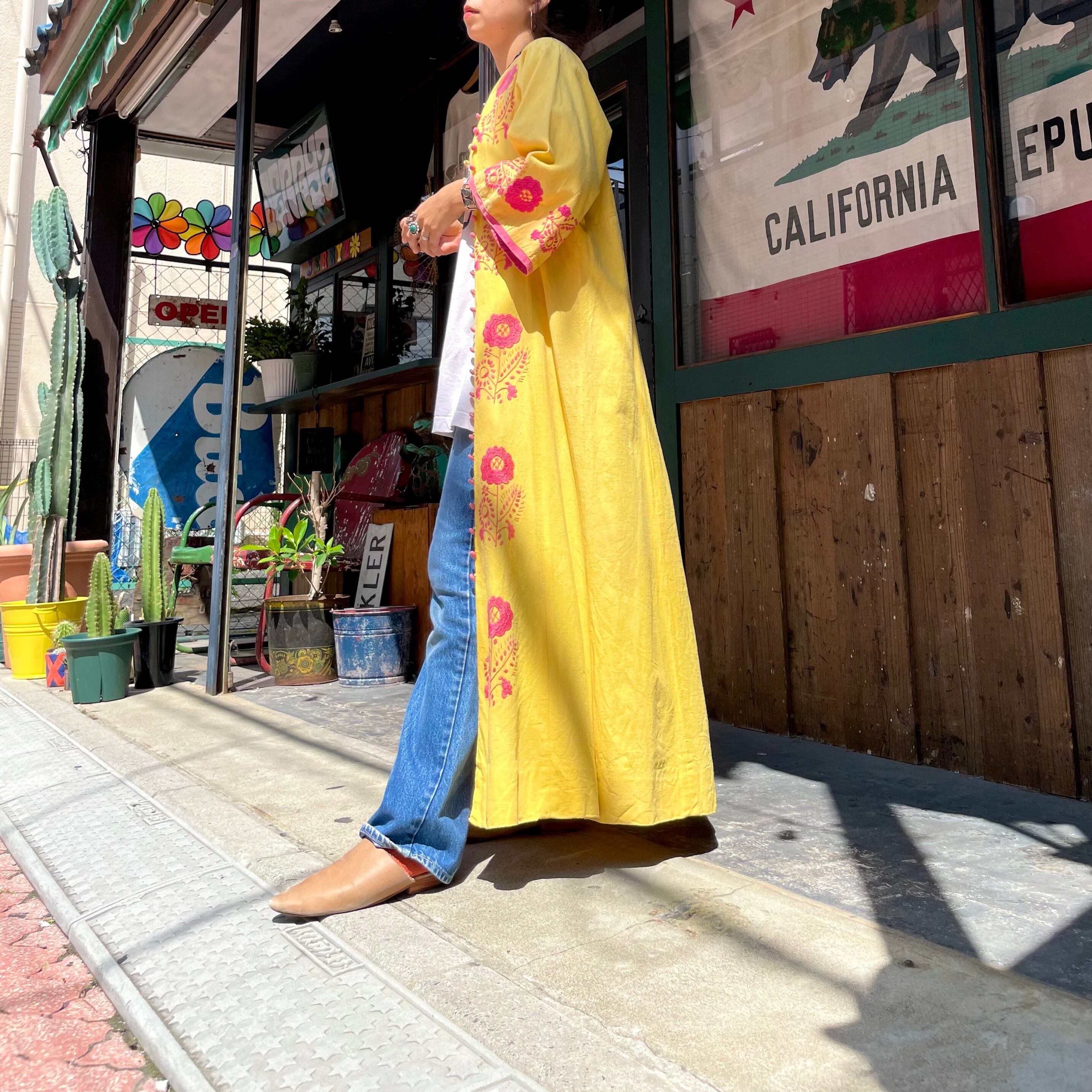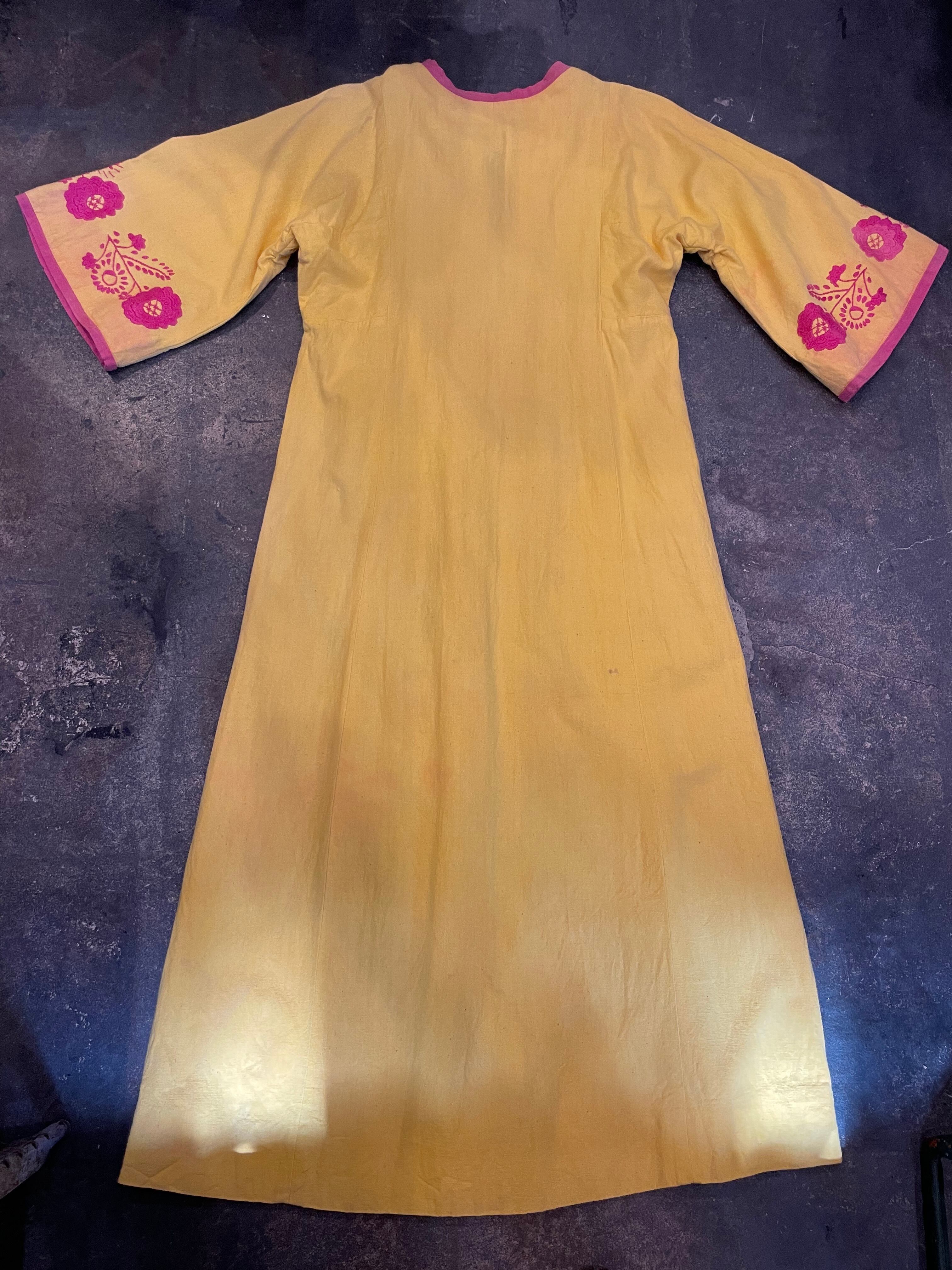 優しい黄色に優しいピンク色の手刺繍がとてもかわいいワンピースです。