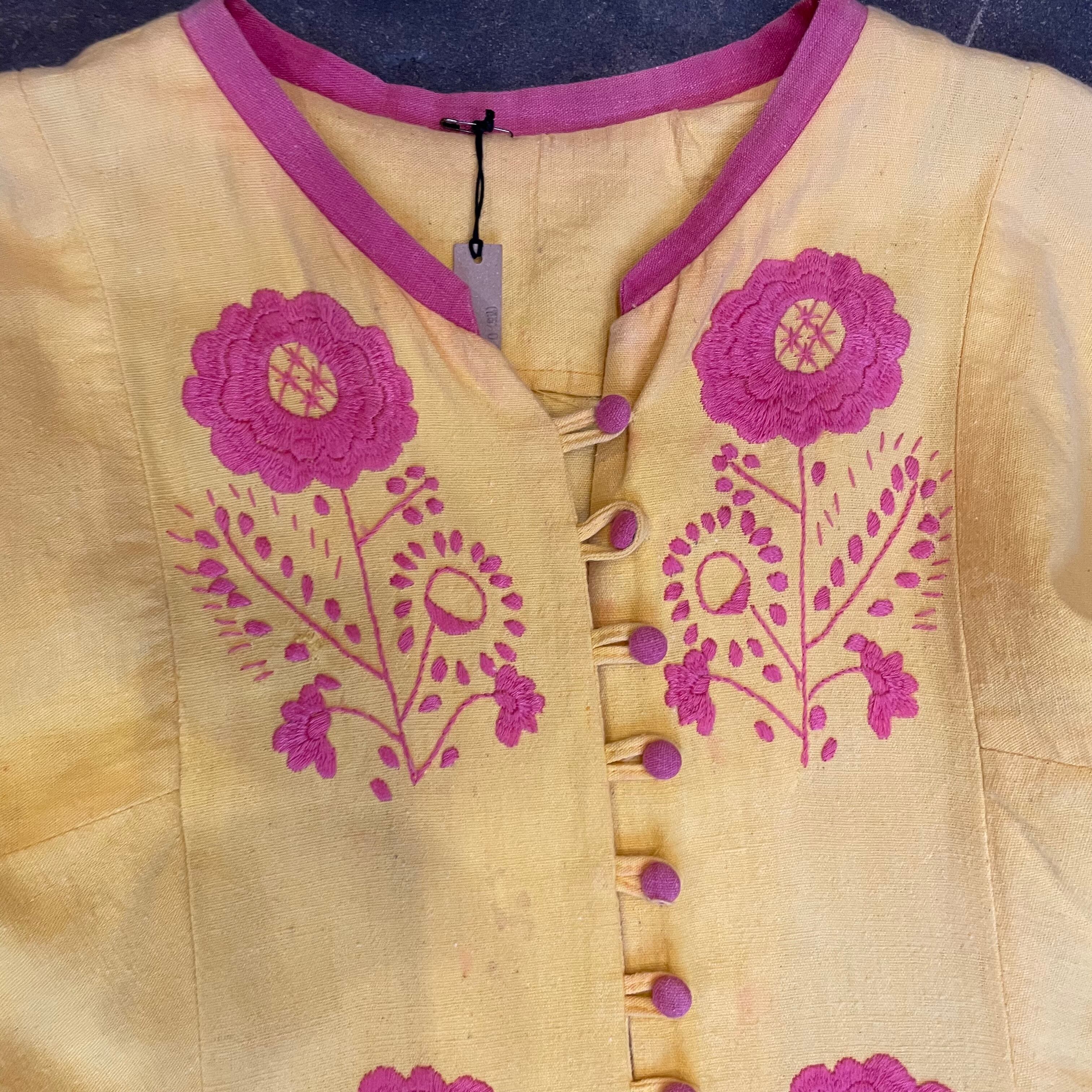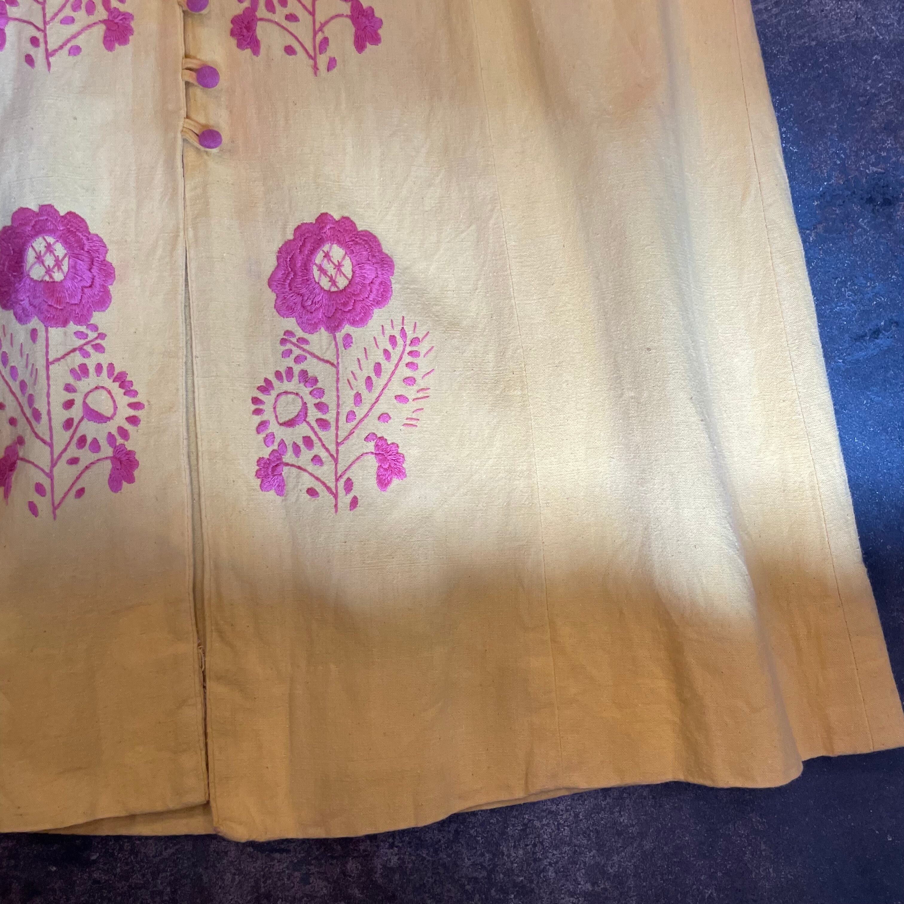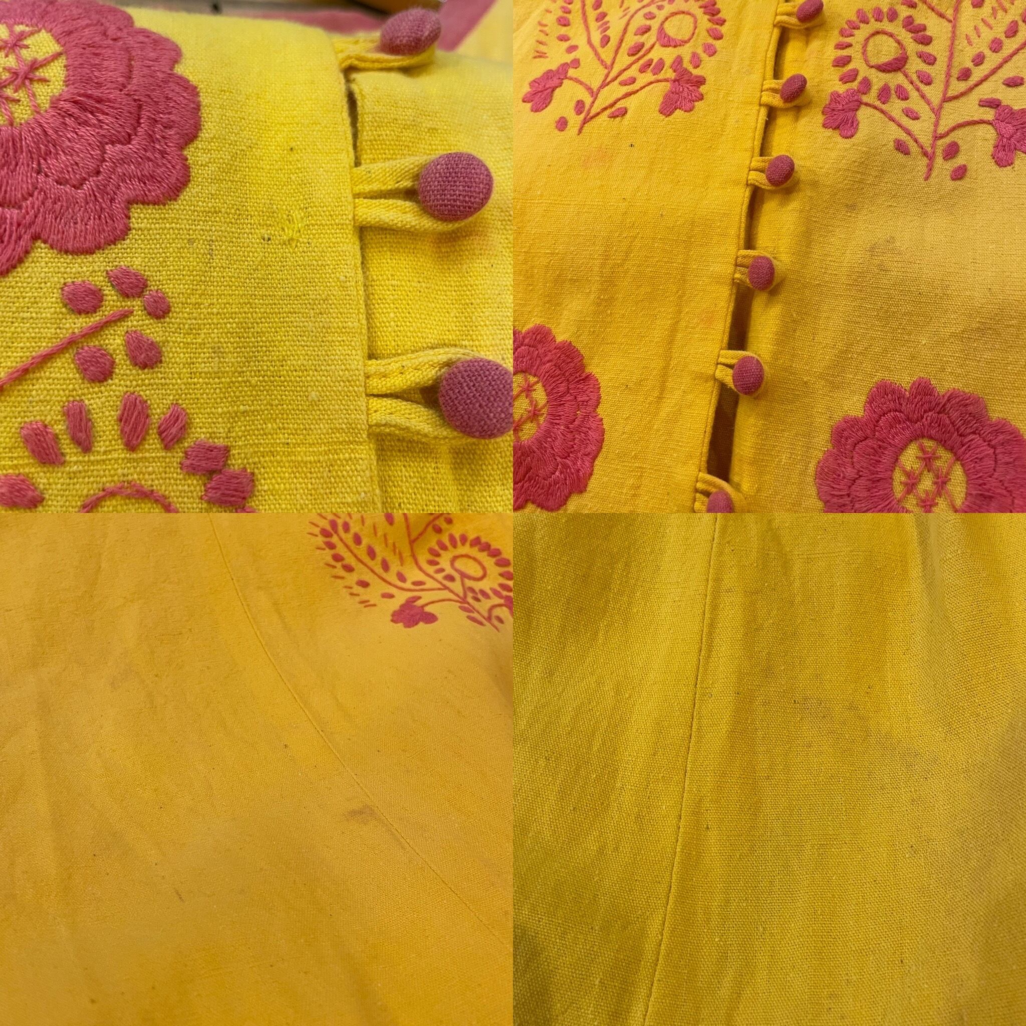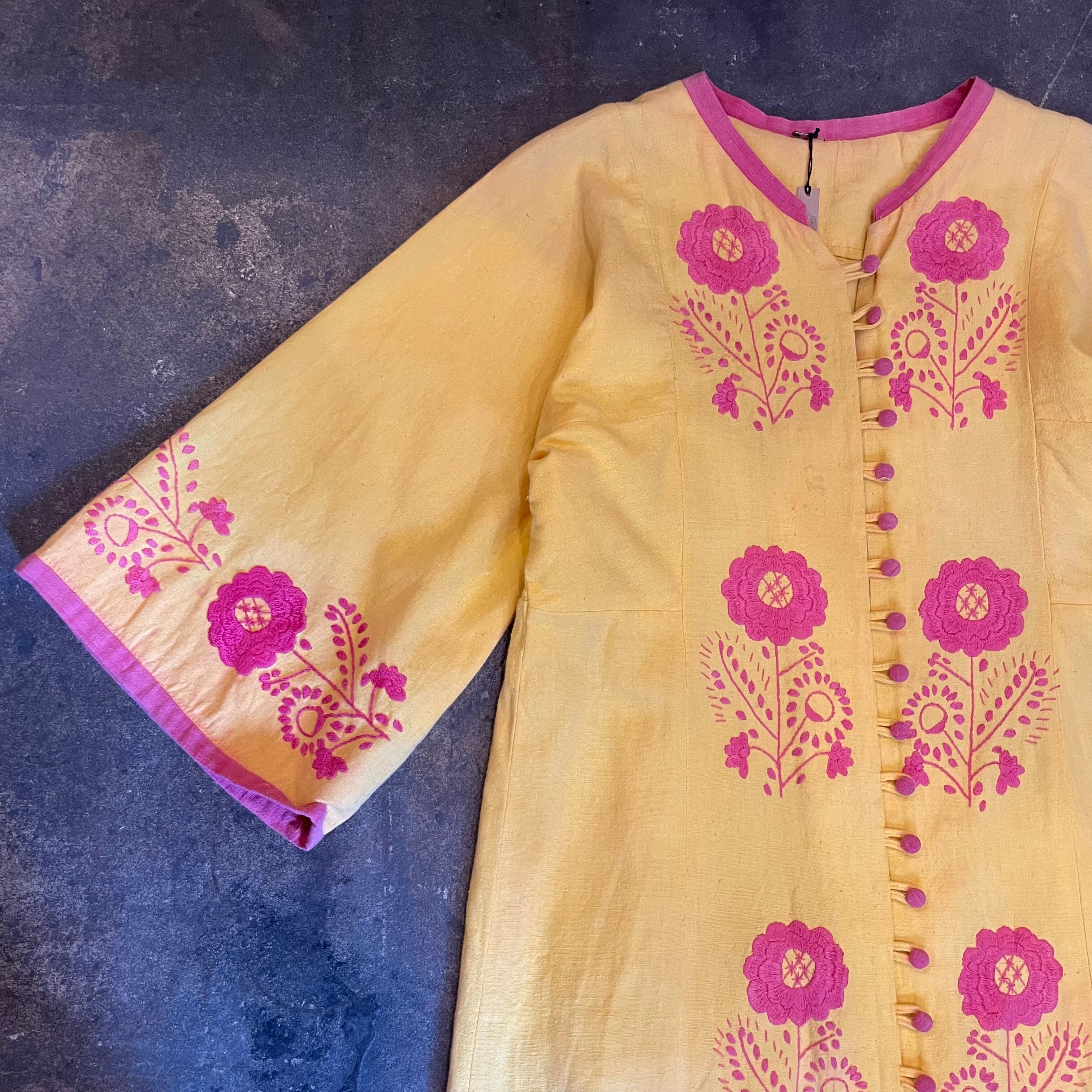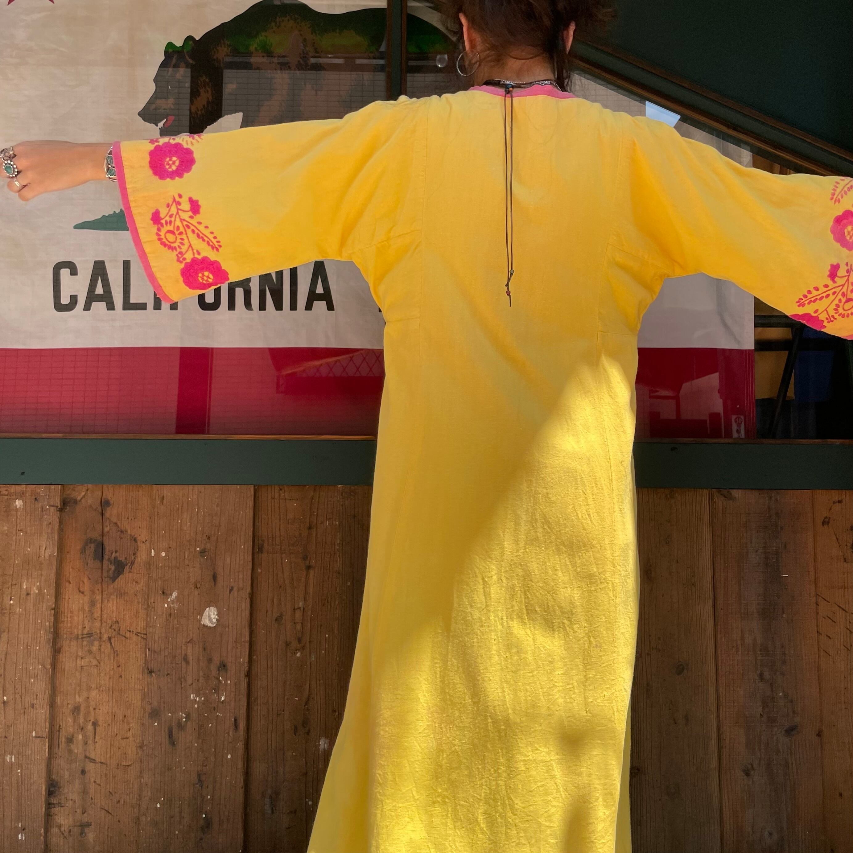 優しい黄色に優しいピンク色の手刺繍がとてもかわいいワンピースです。