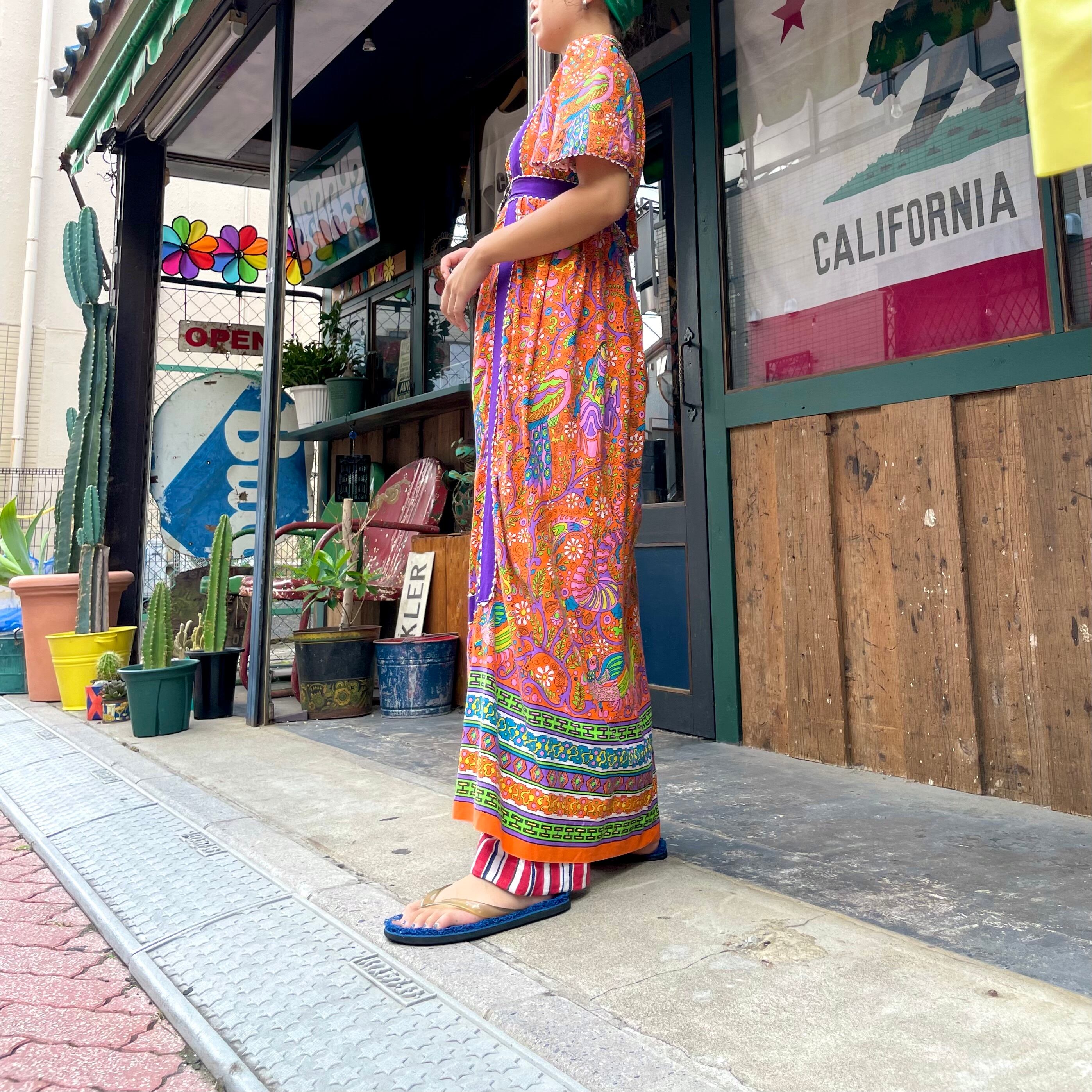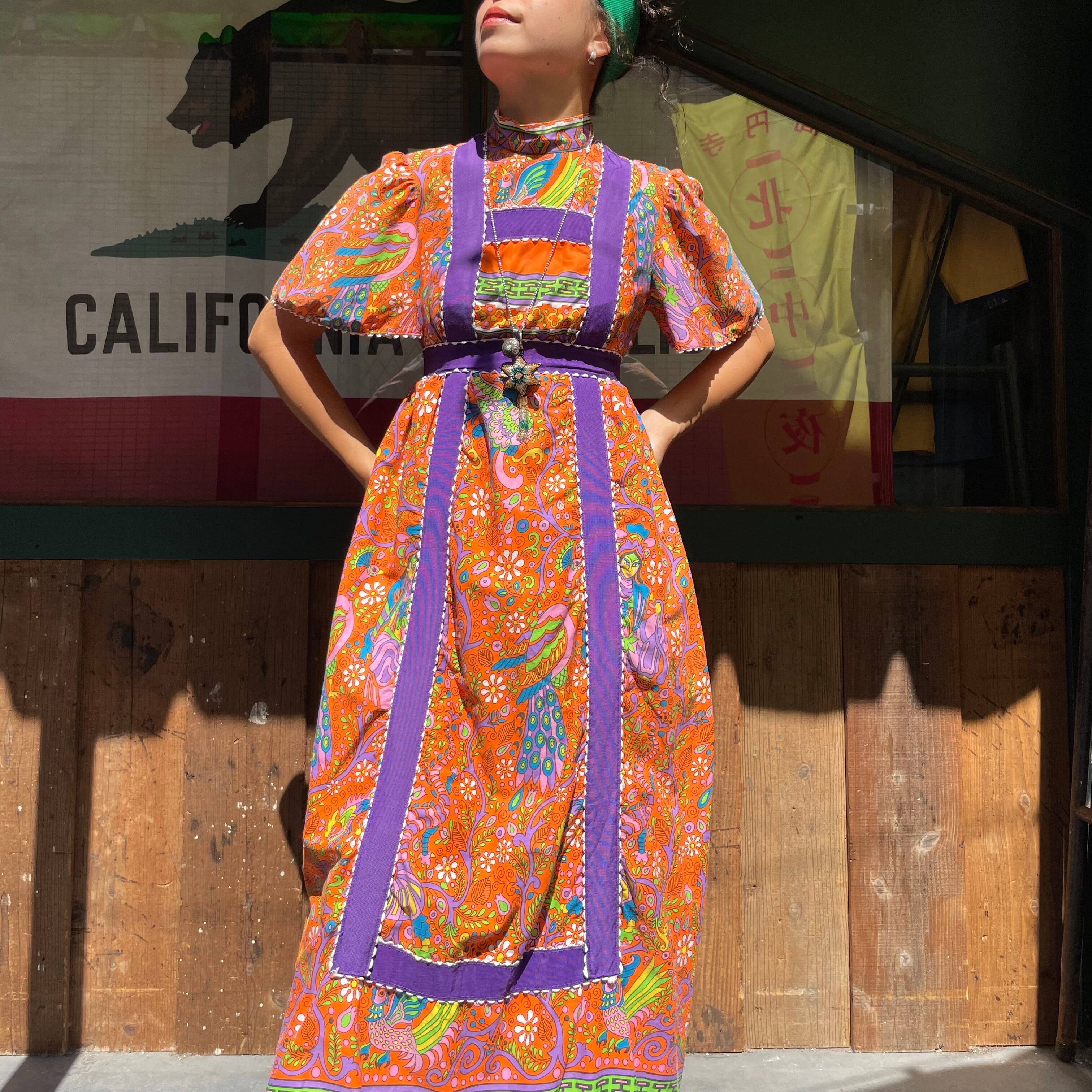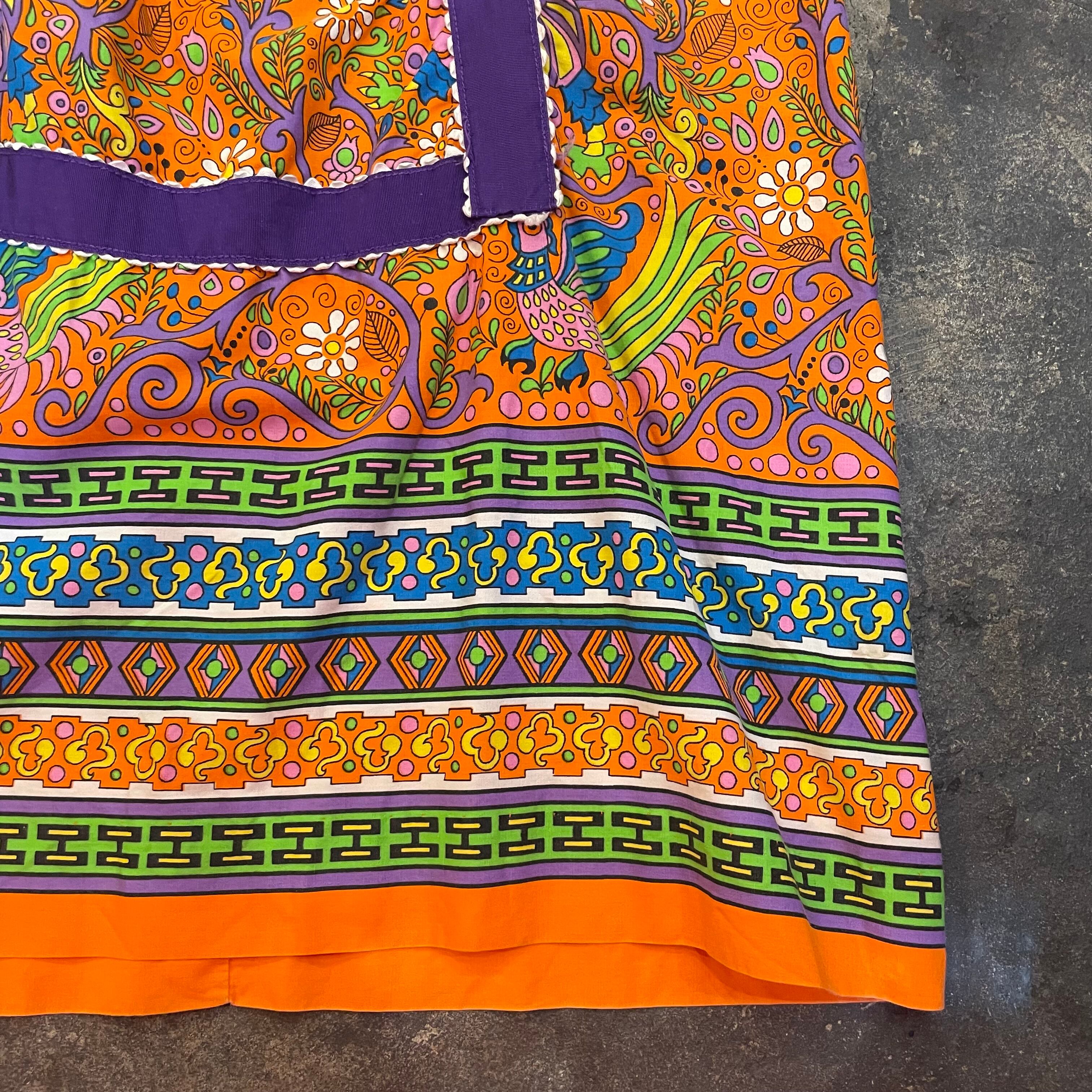 オレンジベースに紫の太めのテープが印象的でポップな色使いがかわいい70年代頃のワンピースです。