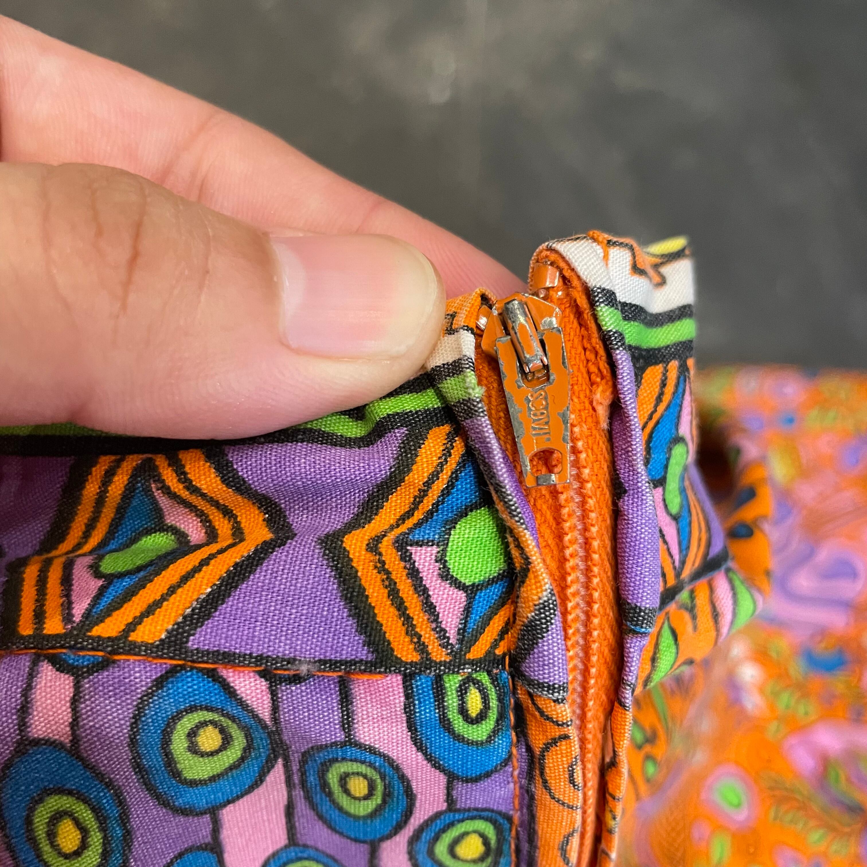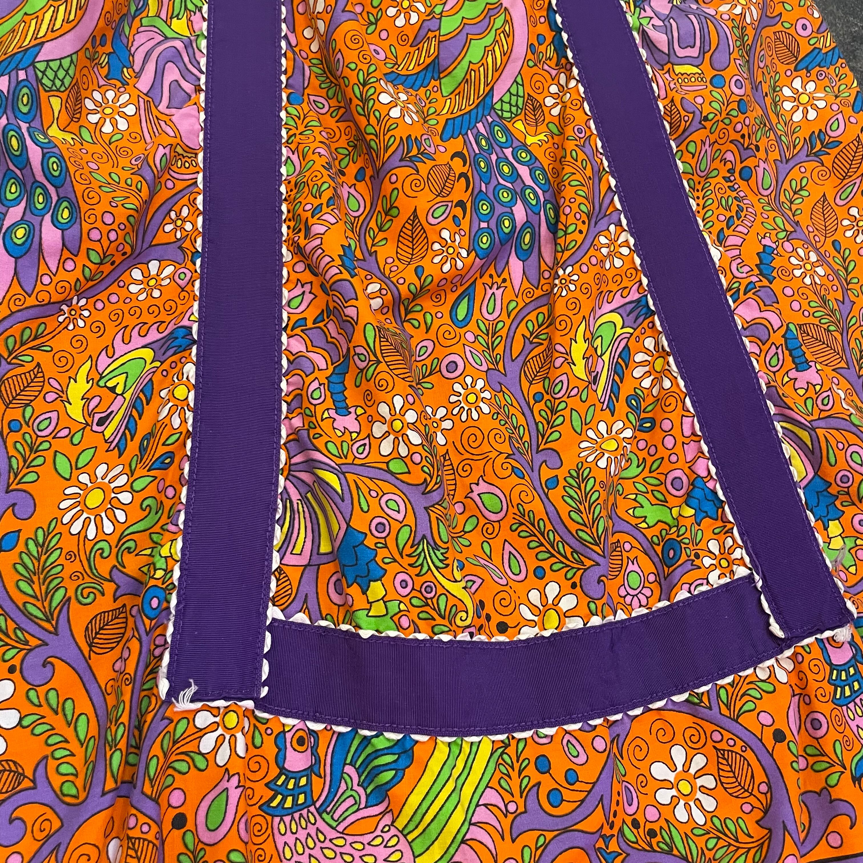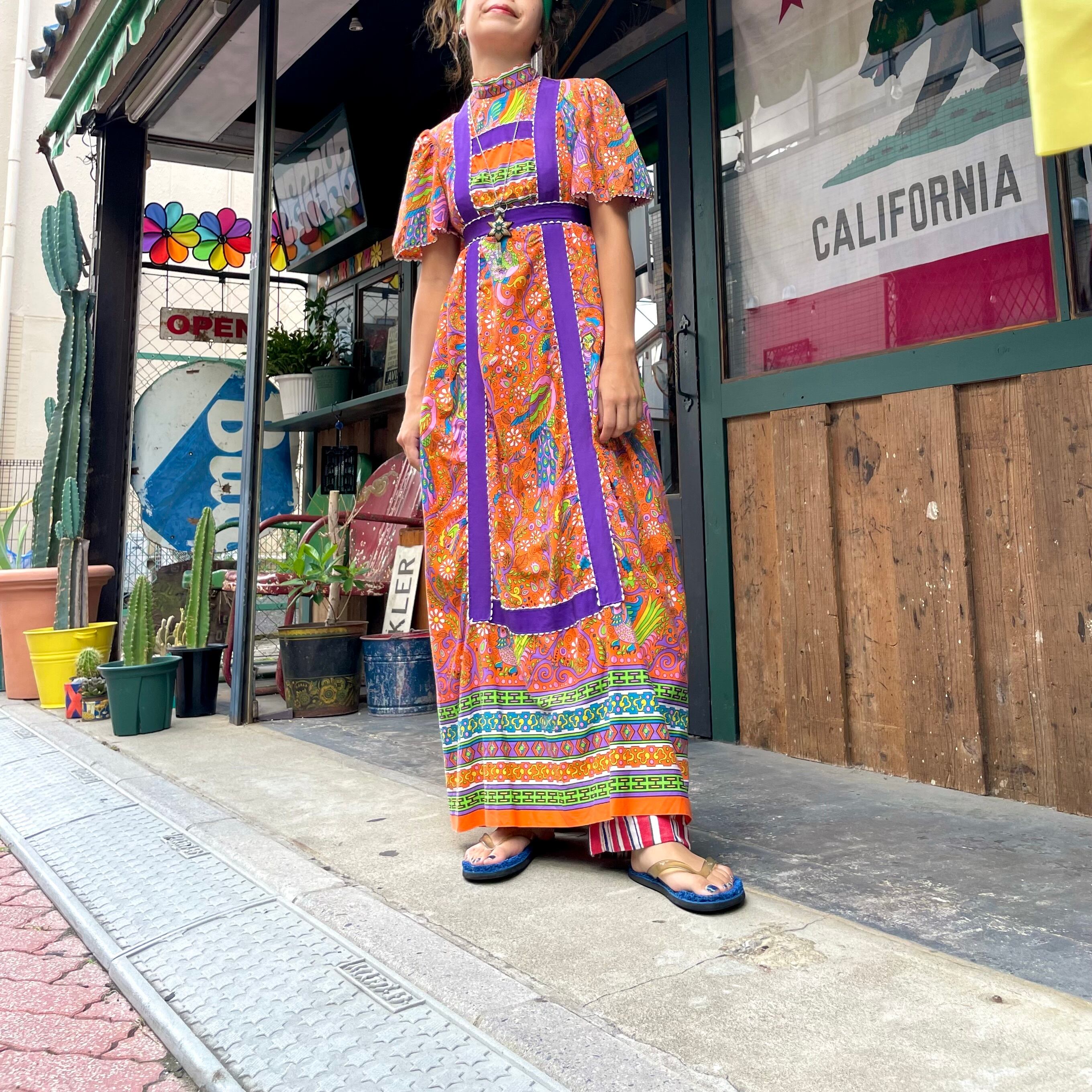 オレンジベースに紫の太めのテープが印象的でポップな色使いがかわいい70年代頃のワンピースです。