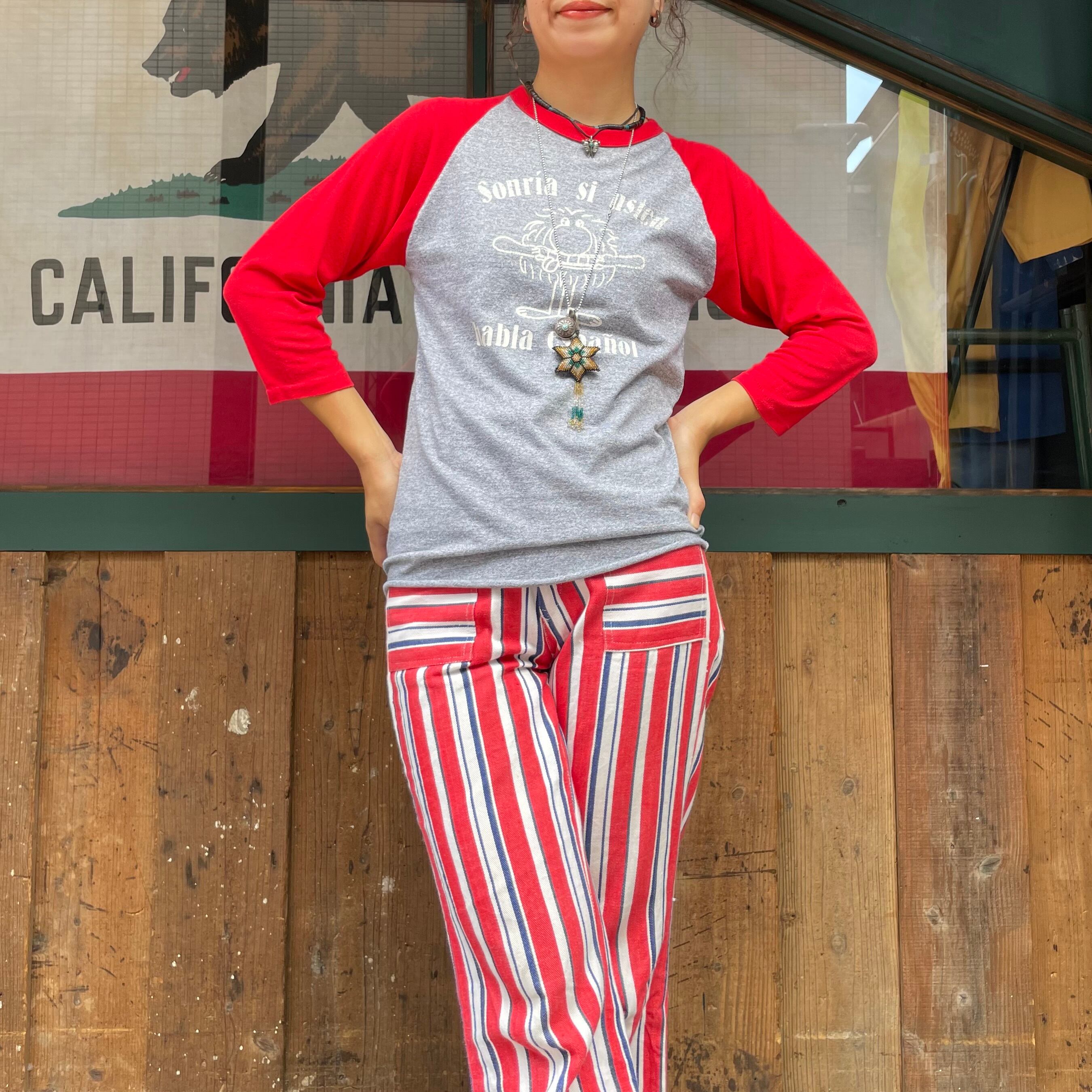 いーってしているモンスターのイラストがポップですし、スペイン語の書体もかわいいと思います!コンパクト過ぎず大き過ぎず、いろんなスタイルに合わせやすいサイズ感も良い感じですし、赤い袖がコーディネートのポイントになるのでシャツワンピースのインナーやノースリーブのワンピースの中に着てもかわいいと思いますし、ロングスカートにインして着ても良いですね。
