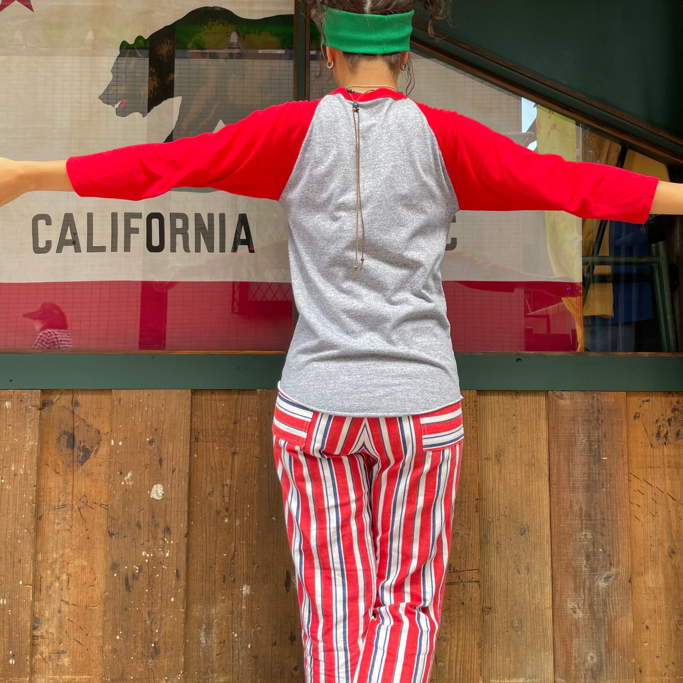 赤×グレーに白のプリントでアメカジ感がかわいいラグランTシャツです。
